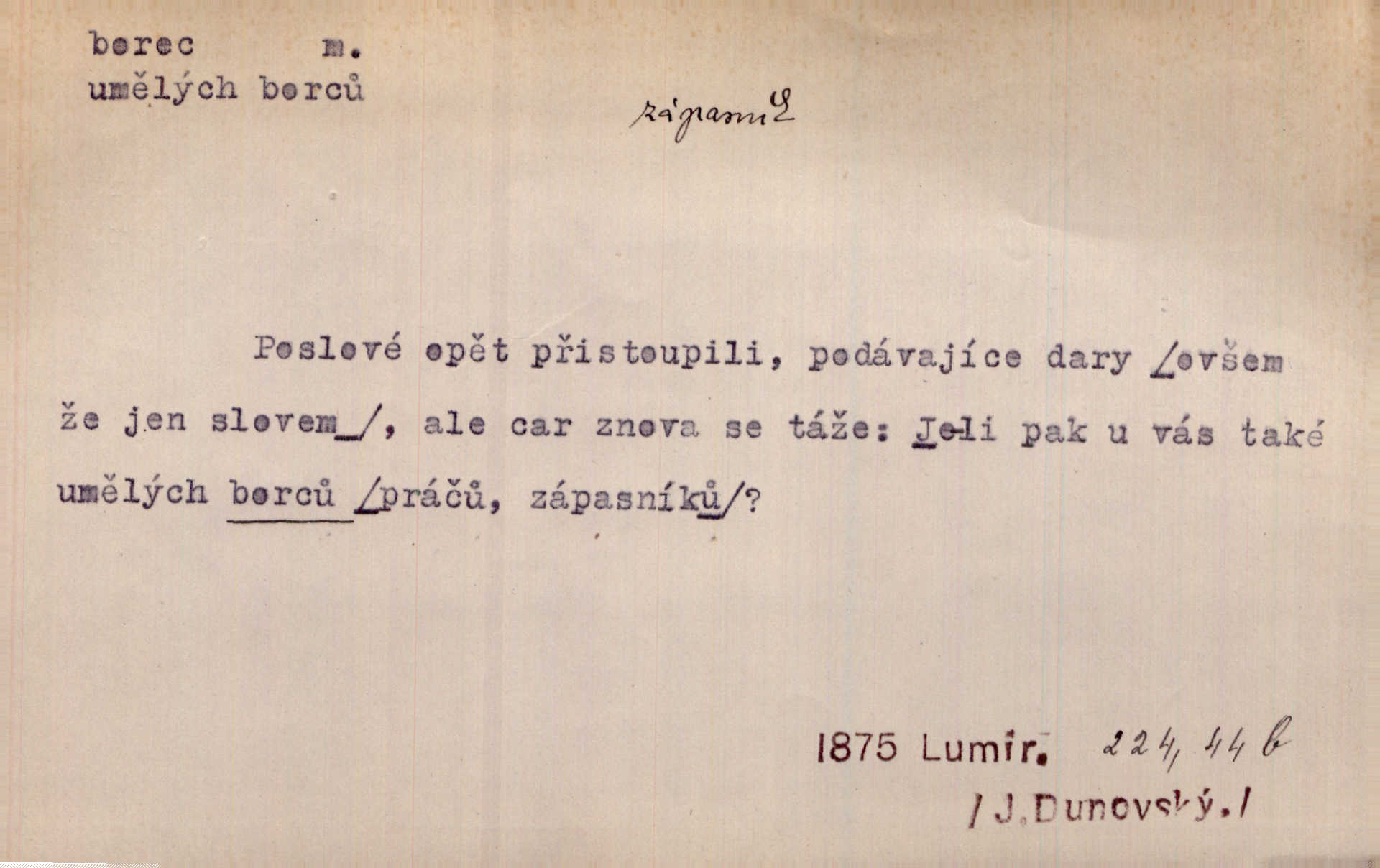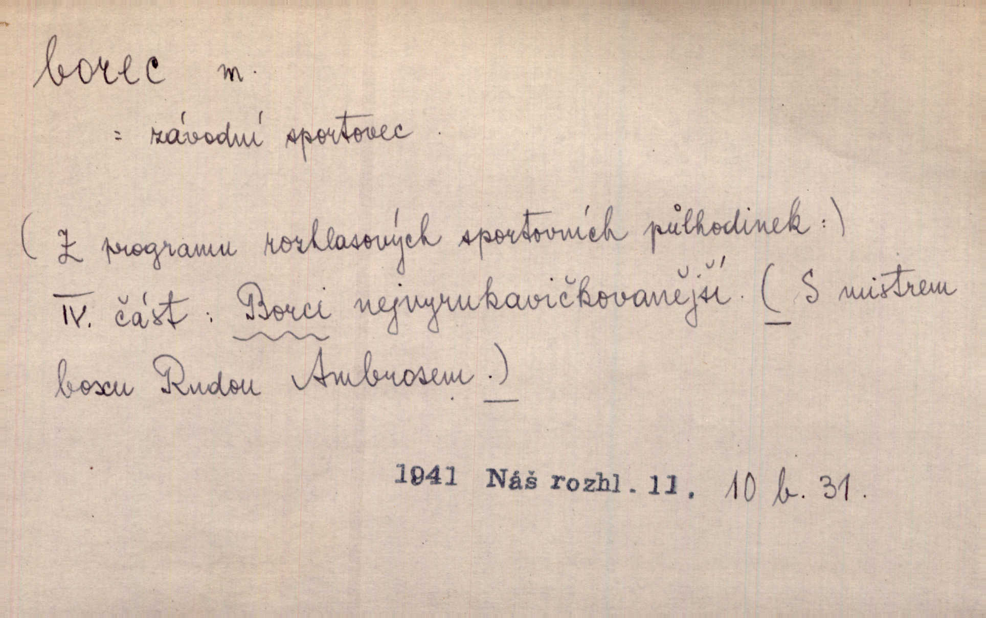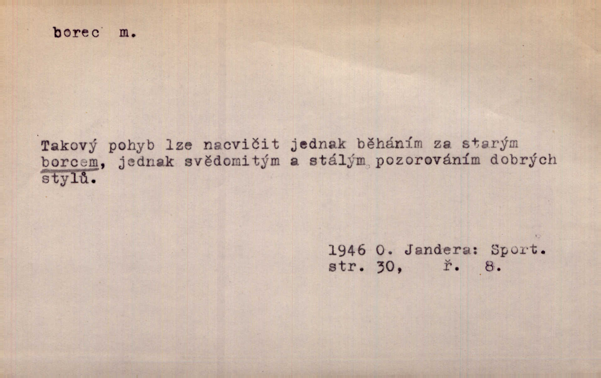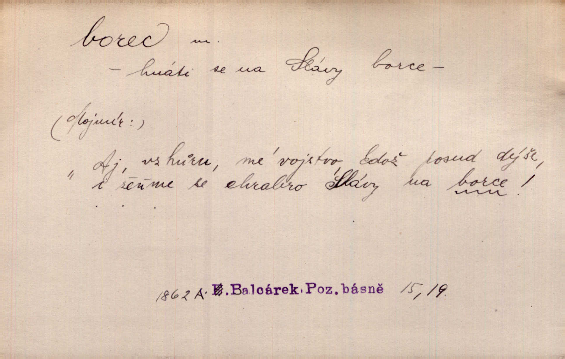 - borec, -rce m. zápasník, pěstitel tělocviku. Tak na světě bývá, že teprve druzí se pevnou nohou postaví, kde první borec padl. Staš. Celé snažení „borců“ jest, aby jeden druhého do žeber pod paží udeřil pěstních zápasníků. Havl.