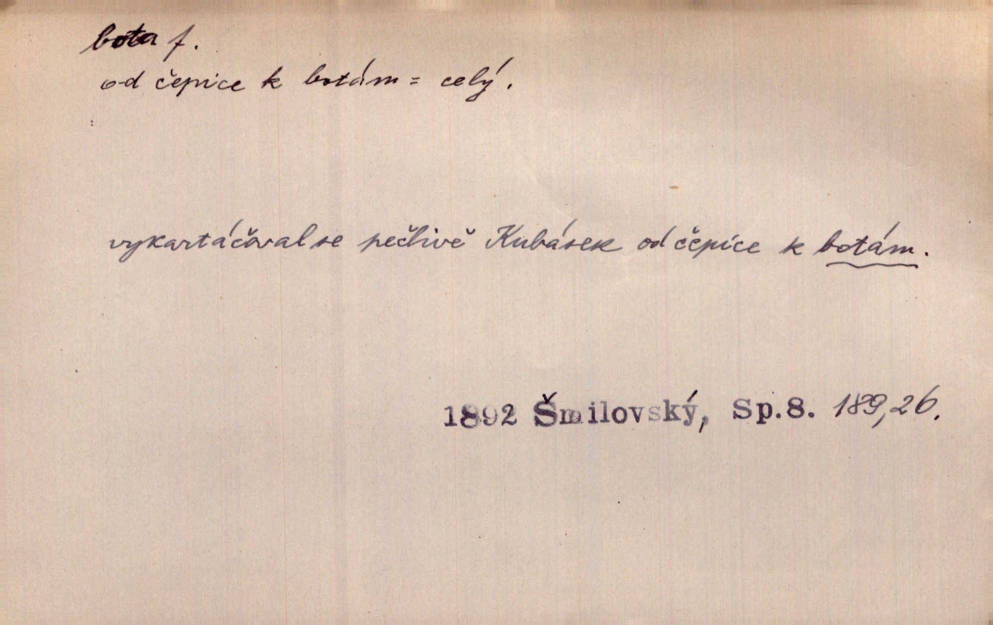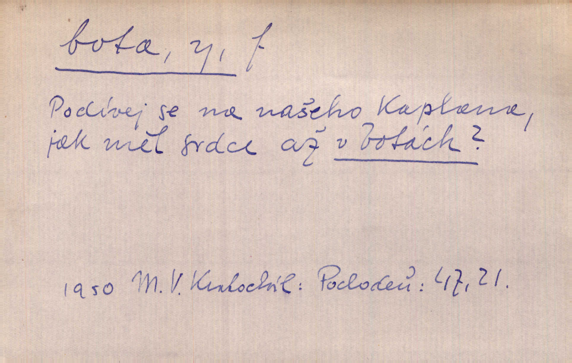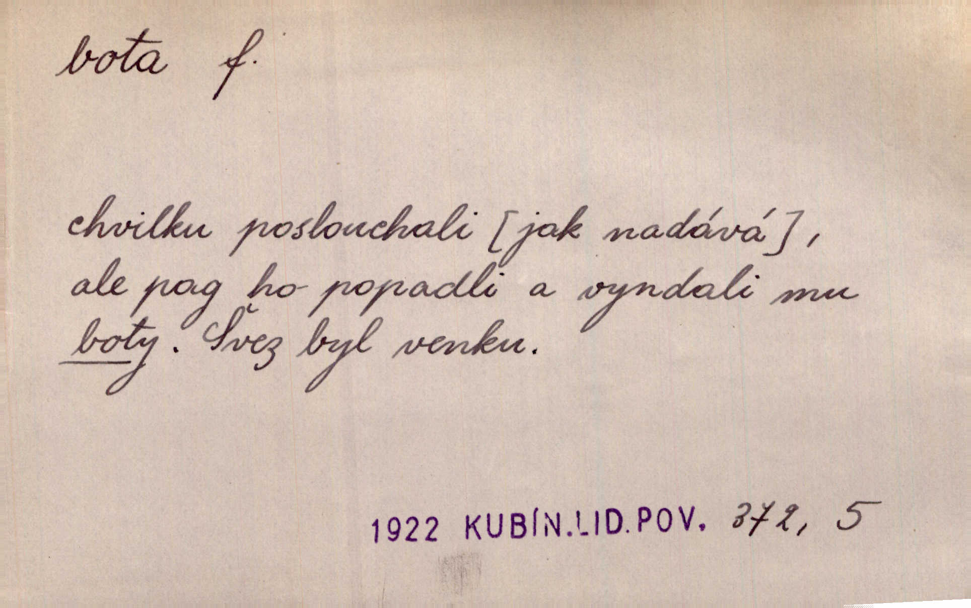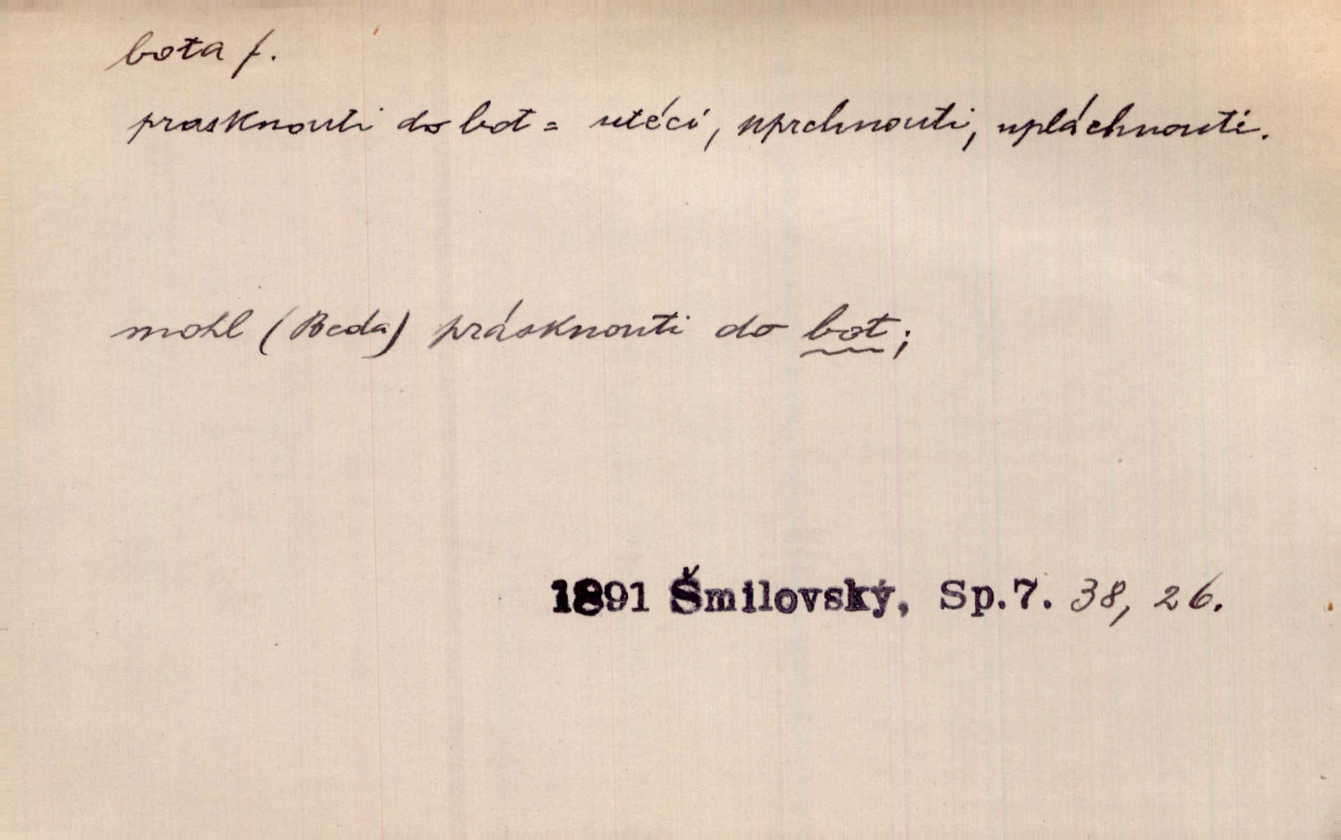 - bota, -y f. kožená obuv. Jen když já mám zdravé nohy, k tomu dobré boty. Čel. Boty (si) obouvati, zouvati, přezouvati. Boty podraziti, podrážeti. Nakuřoval pěnovku pak po dvacet let, až byla černá jako bota. Ner. Hloupé je to jako farářovy boty a otíralo by se to o medicinu. Šal. „Frantíku, botu si nedáš?“ pobízel přes stůl kontrolor nádoba na pivo v podobě boty. Šlej. Kuchyňka vážně rozehnal boty po zmrzlých hroudách dal se do rychlé chůze. A. Mrš. Tak jste pak boty v kole netrhal netancoval mnoho. Jir. Maicnerovi věřili, že v botách nevleze do vody neudělá nic neprozřetelného, nedá se napálit. Herb. V Páchlíčkovi hrklo a srdce mu spadlo do boty pozbyl odvahy. Čap. Ch. Hale huž tě teky do svých bot obouli převedli tě na svou stranu. Něm. „Neseděly mu [nakladateli] pevně ty boty, abych řekl obrazně nebyl dobrý nakladatel. Herrm. Nyní je ten Mates, kterému čouhá sláma z bot, panem kancelářským na němž je znáti selský původ. Herb. Sláma mi z každé boty kouká. Rais. Není-li ochoten shoditi k vůli tobě selskou halenu a vyhodit z bot slámu, neber si ho zanechati sedlačiny. Staš. My každý cítíme, že nás bota tlačí a kde nás tlačí máme obtíže. Mas. Každý nejlépe ví, kde ho bota skřípá. Svět. Byly nám kolikrát boty moc ouzké bylo nám zle. Šim. Pan Jirát žil a veselil se stále jako dříve, jako by ani necítil, že se mu boty ouží hrozí mu pohroma. Šim. Pokročiti sedmimílovými (mílovými) botami, míti mílové boty a p. pokračovati velmi rychle. Prásknouti do bot hum. utéci. Teče mu voda do bot je mu zle. Lid. vyndati někomu boty vyhoditi někoho, propustiti ze služby. Což pak ti u Markyty vyndali boty? vypověděli tě z práce. Herrm. Lid. znát někoho jako své boty dokonale. Totě do boty litý Němec, ten Meklenburák kovaný Němec. Jir. D španělské boty druh mučidel. Do krajzlů a španělských bot kacíře zlé svírá. Vrch. D označuje věc n. osobu, jejíž hodnotu snižujeme. Poznal, že je to [písnička] stará bota, naražená na nové kopyto. Hol. Nikdo neříkej, že ta báseň nemá obsahu, neboť bys říkal velikou botu hloupost, nesmysl. Šal. Což nepromluvíte, strýče? Jste opravdu ta bota, za kterou jste vyhlášen daleko široko? bázlivec a p. Klost. D Fys. trubice nad ssací troubou u pumpy na zdviž.