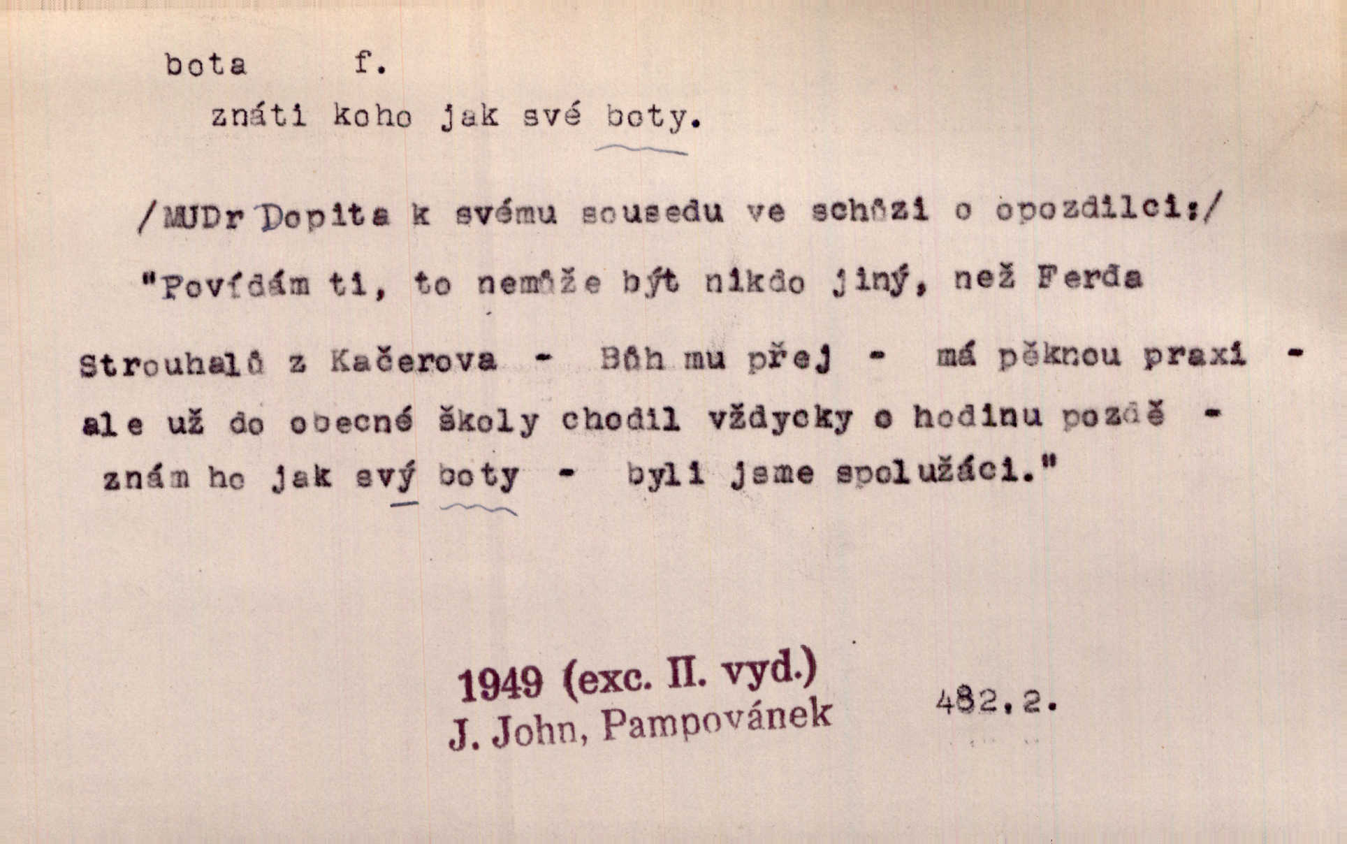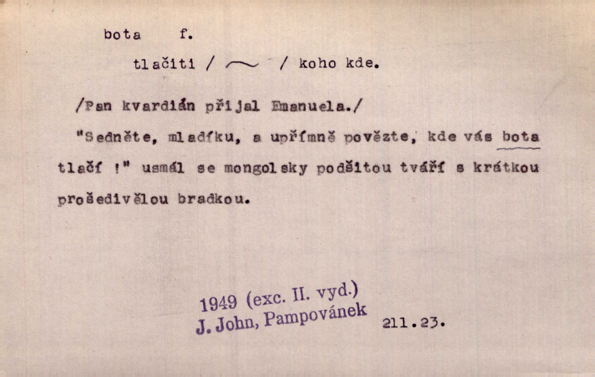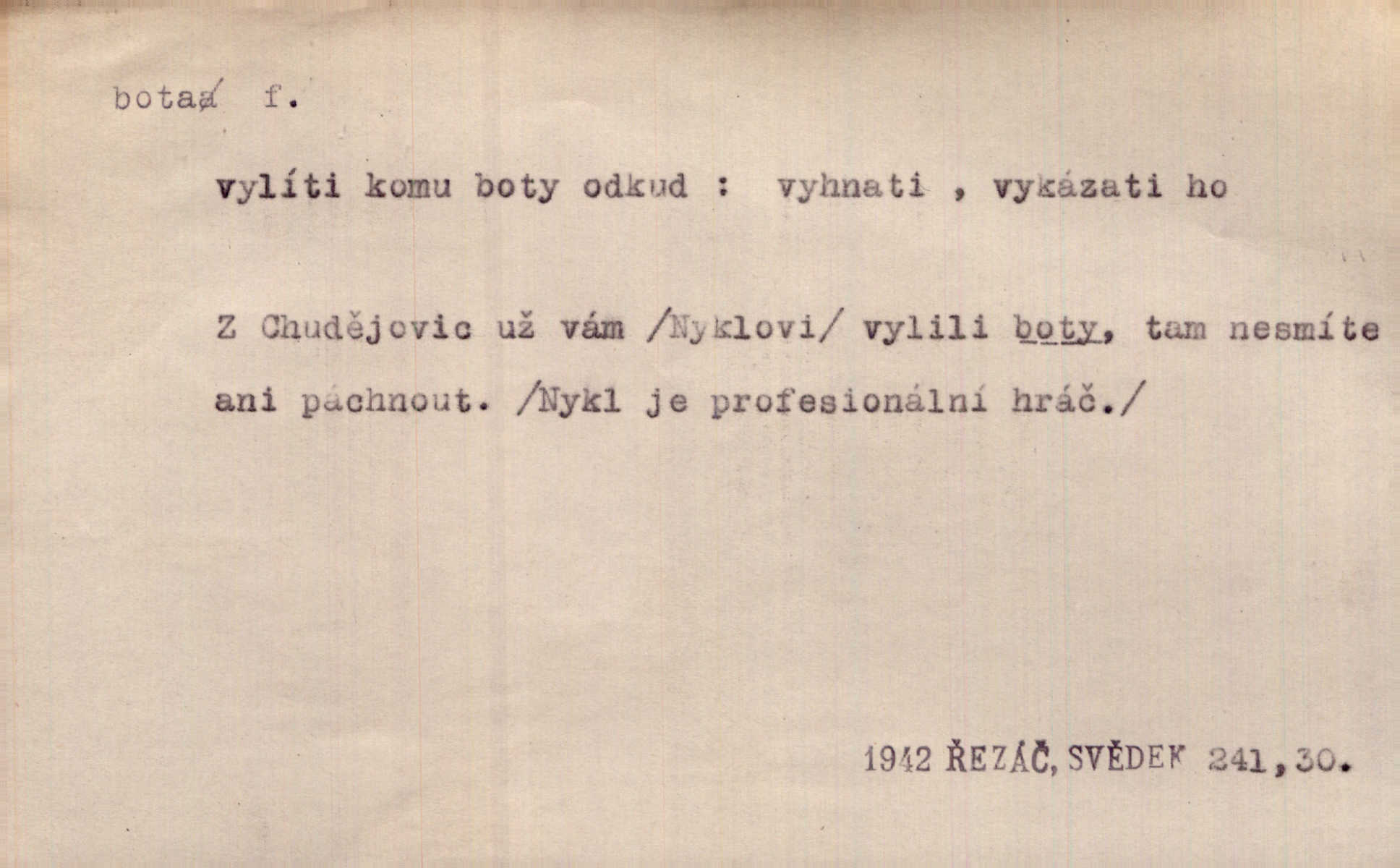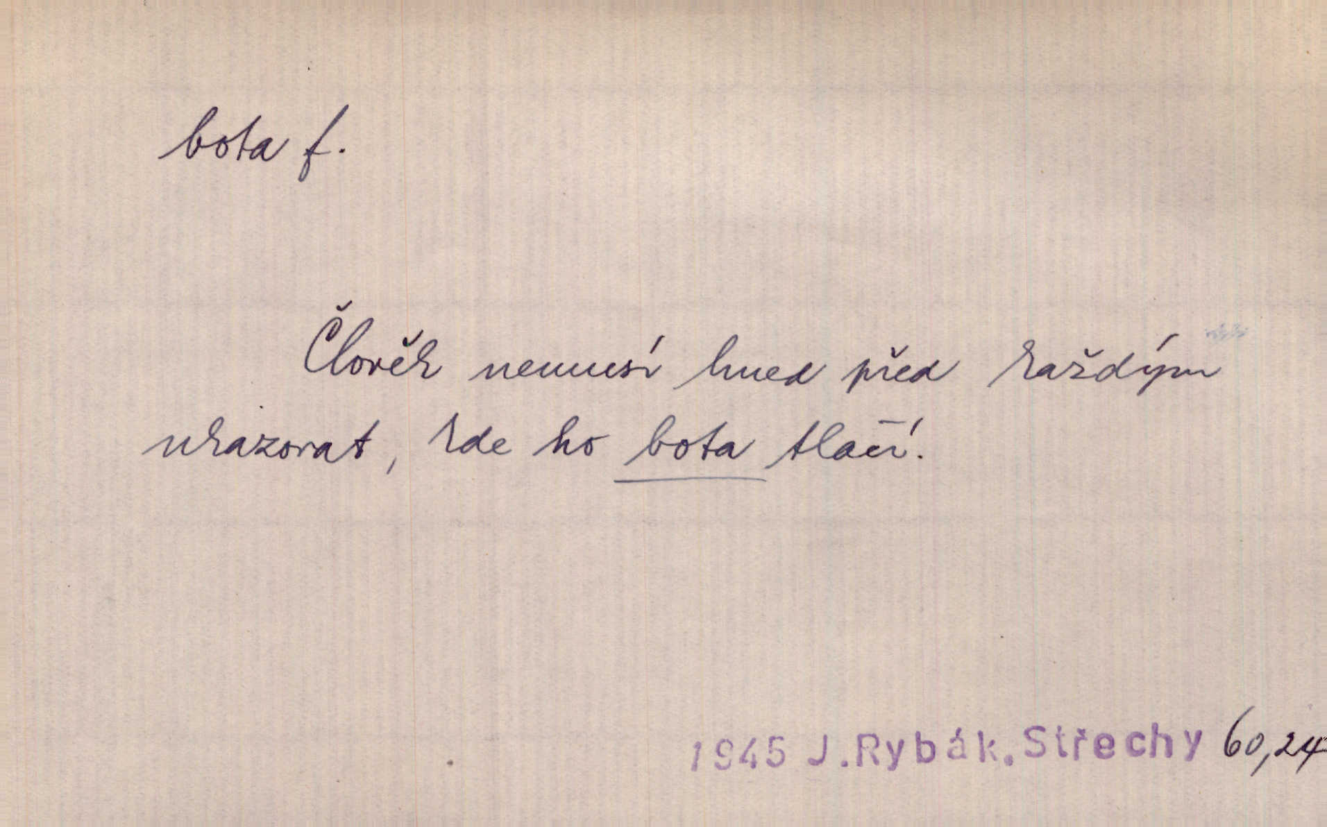- bota, -y f. kožená obuv. Jen když já mám zdravé nohy, k tomu dobré boty. Čel. Boty (si) obouvati, zouvati, přezouvati. Boty podraziti, podrážeti. Nakuřoval pěnovku pak po dvacet let, až byla černá jako bota. Ner. Hloupé je to jako farářovy boty a otíralo by se to o medicinu. Šal. „Frantíku, botu si nedáš?“ pobízel přes stůl kontrolor nádoba na pivo v podobě boty. Šlej. Kuchyňka vážně rozehnal boty po zmrzlých hroudách dal se do rychlé chůze. A. Mrš. Tak jste pak boty v kole netrhal netancoval mnoho. Jir. Maicnerovi věřili, že v botách nevleze do vody neudělá nic neprozřetelného, nedá se napálit. Herb. V Páchlíčkovi hrklo a srdce mu spadlo do boty pozbyl odvahy. Čap. Ch. Hale huž tě teky do svých bot obouli převedli tě na svou stranu. Něm. „Neseděly mu [nakladateli] pevně ty boty, abych řekl obrazně nebyl dobrý nakladatel. Herrm. Nyní je ten Mates, kterému čouhá sláma z bot, panem kancelářským na němž je znáti selský původ. Herb. Sláma mi z každé boty kouká. Rais. Není-li ochoten shoditi k vůli tobě selskou halenu a vyhodit z bot slámu, neber si ho zanechati sedlačiny. Staš. My každý cítíme, že nás bota tlačí a kde nás tlačí máme obtíže. Mas. Každý nejlépe ví, kde ho bota skřípá. Svět. Byly nám kolikrát boty moc ouzké bylo nám zle. Šim. Pan Jirát žil a veselil se stále jako dříve, jako by ani necítil, že se mu boty ouží hrozí mu pohroma. Šim. Pokročiti sedmimílovými (mílovými) botami, míti mílové boty a p. pokračovati velmi rychle. Prásknouti do bot hum. utéci. Teče mu voda do bot je mu zle. Lid. vyndati někomu boty vyhoditi někoho, propustiti ze služby. Což pak ti u Markyty vyndali boty? vypověděli tě z práce. Herrm. Lid. znát někoho jako své boty dokonale. Totě do boty litý Němec, ten Meklenburák kovaný Němec. Jir. D španělské boty druh mučidel. Do krajzlů a španělských bot kacíře zlé svírá. Vrch. D označuje věc n. osobu, jejíž hodnotu snižujeme. Poznal, že je to [písnička] stará bota, naražená na nové kopyto. Hol. Nikdo neříkej, že ta báseň nemá obsahu, neboť bys říkal velikou botu hloupost, nesmysl. Šal. Což nepromluvíte, strýče? Jste opravdu ta bota, za kterou jste vyhlášen daleko široko? bázlivec a p. Klost. D Fys. trubice nad ssací troubou u pumpy na zdviž.