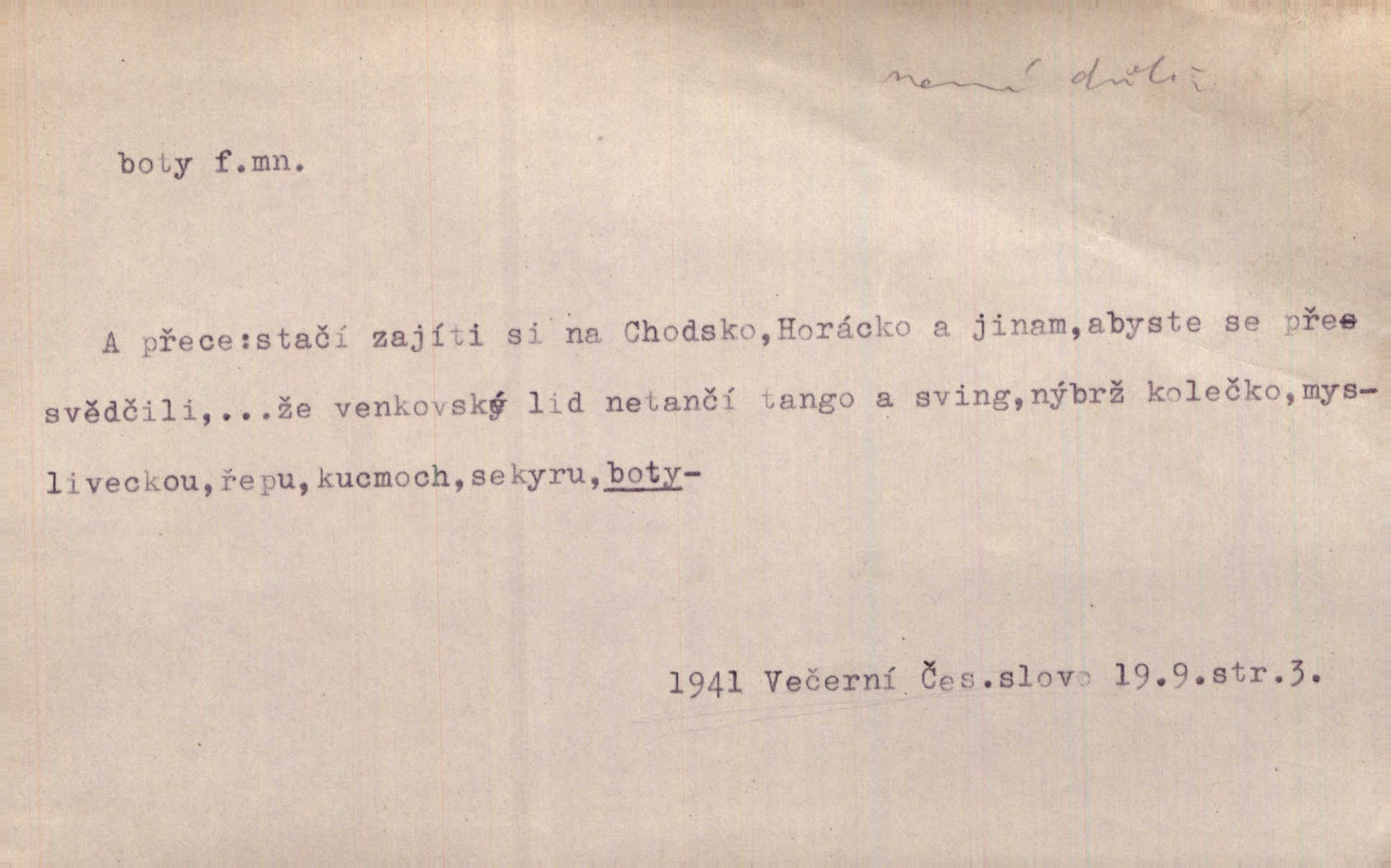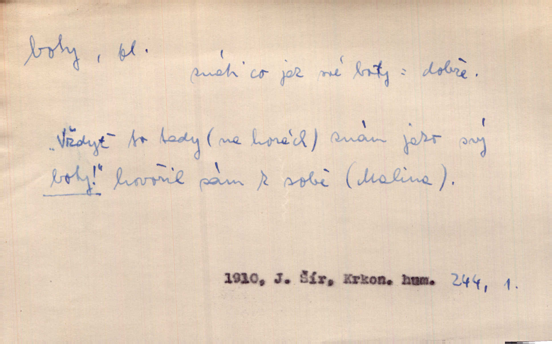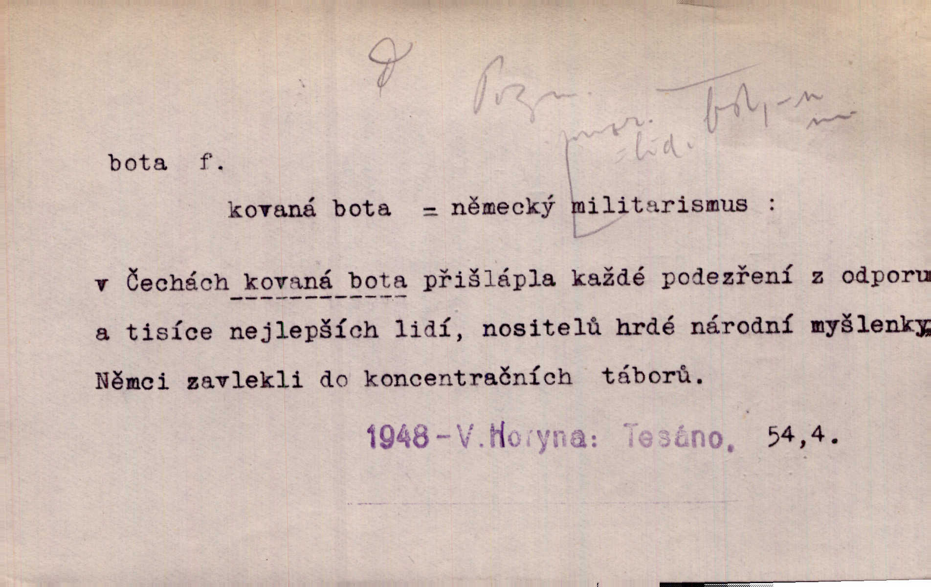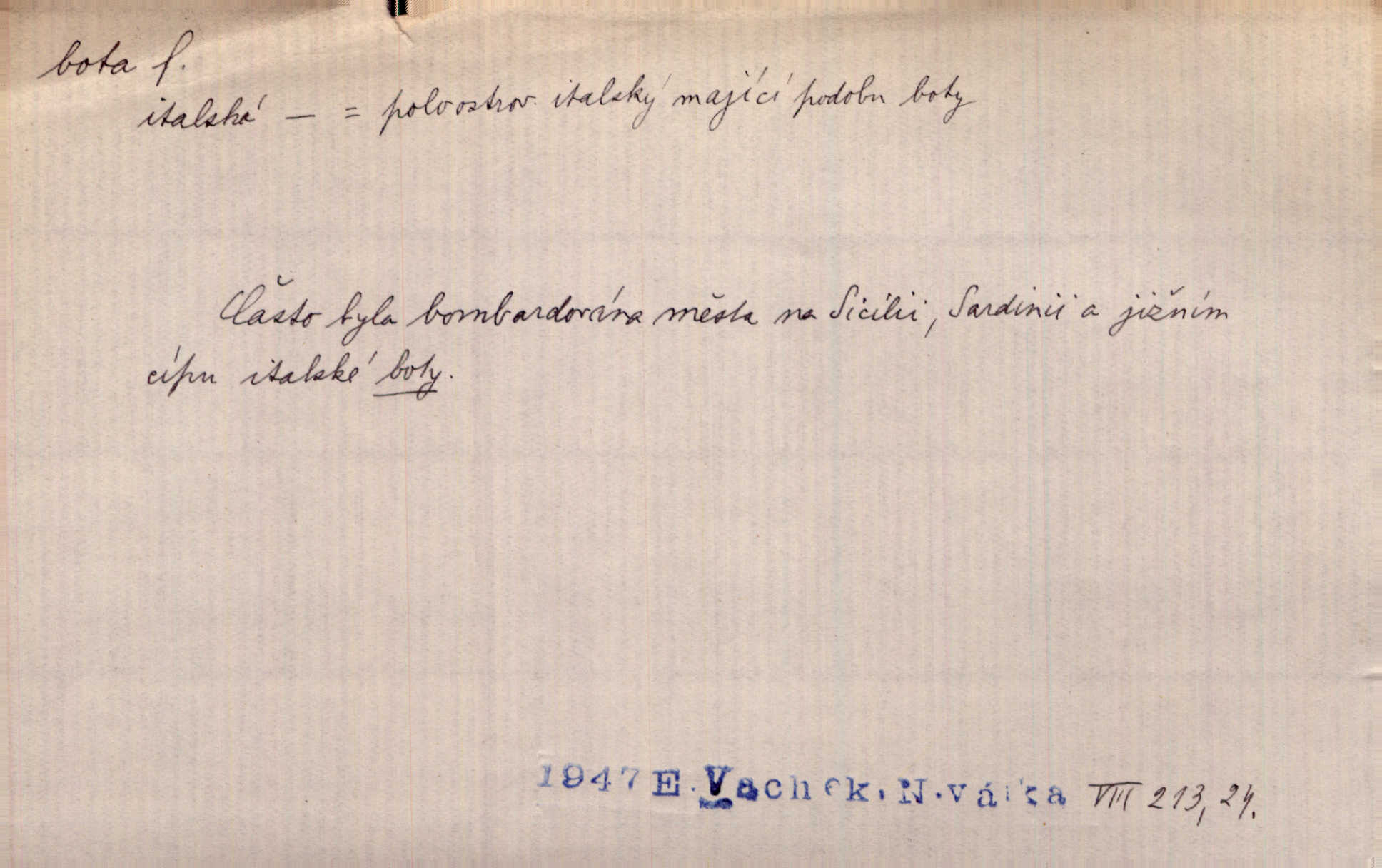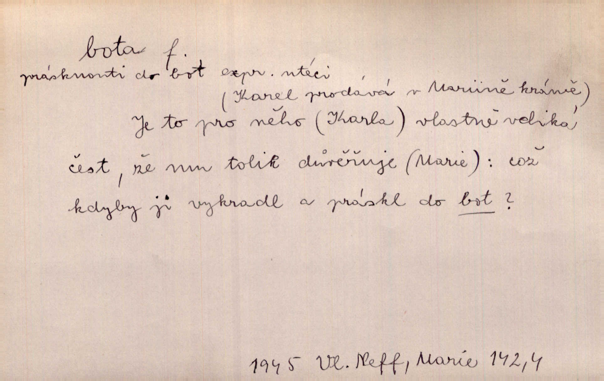 - bota, -y f. kožená obuv. Jen když já mám zdravé nohy, k tomu dobré boty. Čel. Boty (si) obouvati, zouvati, přezouvati. Boty podraziti, podrážeti. Nakuřoval pěnovku pak po dvacet let, až byla černá jako bota. Ner. Hloupé je to jako farářovy boty a otíralo by se to o medicinu. Šal. „Frantíku, botu si nedáš?“ pobízel přes stůl kontrolor nádoba na pivo v podobě boty. Šlej. Kuchyňka vážně rozehnal boty po zmrzlých hroudách dal se do rychlé chůze. A. Mrš. Tak jste pak boty v kole netrhal netancoval mnoho. Jir. Maicnerovi věřili, že v botách nevleze do vody neudělá nic neprozřetelného, nedá se napálit. Herb. V Páchlíčkovi hrklo a srdce mu spadlo do boty pozbyl odvahy. Čap. Ch. Hale huž tě teky do svých bot obouli převedli tě na svou stranu. Něm. „Neseděly mu [nakladateli] pevně ty boty, abych řekl obrazně nebyl dobrý nakladatel. Herrm. Nyní je ten Mates, kterému čouhá sláma z bot, panem kancelářským na němž je znáti selský původ. Herb. Sláma mi z každé boty kouká. Rais. Není-li ochoten shoditi k vůli tobě selskou halenu a vyhodit z bot slámu, neber si ho zanechati sedlačiny. Staš. My každý cítíme, že nás bota tlačí a kde nás tlačí máme obtíže. Mas. Každý nejlépe ví, kde ho bota skřípá. Svět. Byly nám kolikrát boty moc ouzké bylo nám zle. Šim. Pan Jirát žil a veselil se stále jako dříve, jako by ani necítil, že se mu boty ouží hrozí mu pohroma. Šim. Pokročiti sedmimílovými (mílovými) botami, míti mílové boty a p. pokračovati velmi rychle. Prásknouti do bot hum. utéci. Teče mu voda do bot je mu zle. Lid. vyndati někomu boty vyhoditi někoho, propustiti ze služby. Což pak ti u Markyty vyndali boty? vypověděli tě z práce. Herrm. Lid. znát někoho jako své boty dokonale. Totě do boty litý Němec, ten Meklenburák kovaný Němec. Jir. D španělské boty druh mučidel. Do krajzlů a španělských bot kacíře zlé svírá. Vrch. D označuje věc n. osobu, jejíž hodnotu snižujeme. Poznal, že je to [písnička] stará bota, naražená na nové kopyto. Hol. Nikdo neříkej, že ta báseň nemá obsahu, neboť bys říkal velikou botu hloupost, nesmysl. Šal. Což nepromluvíte, strýče? Jste opravdu ta bota, za kterou jste vyhlášen daleko široko? bázlivec a p. Klost. D Fys. trubice nad ssací troubou u pumpy na zdviž.