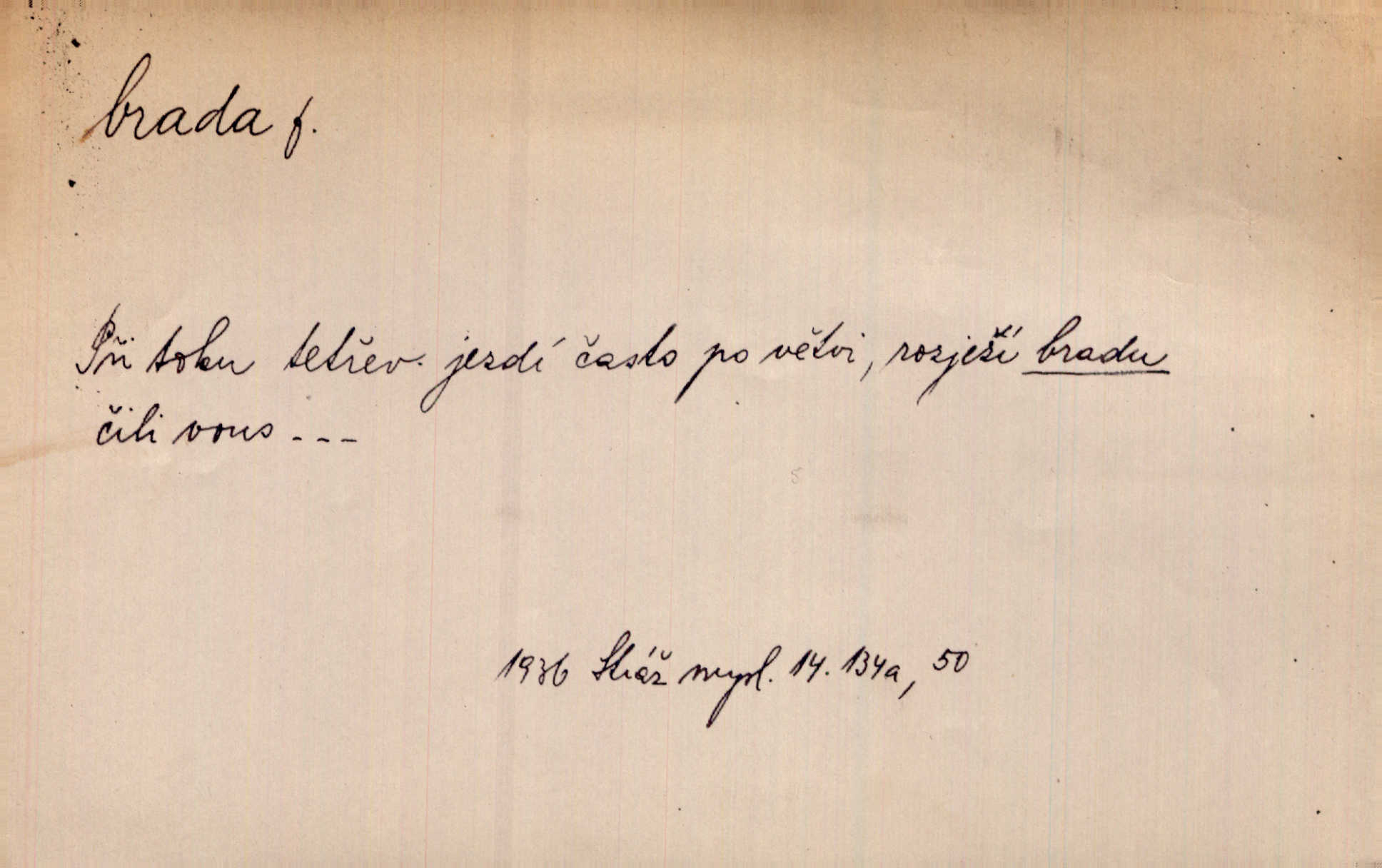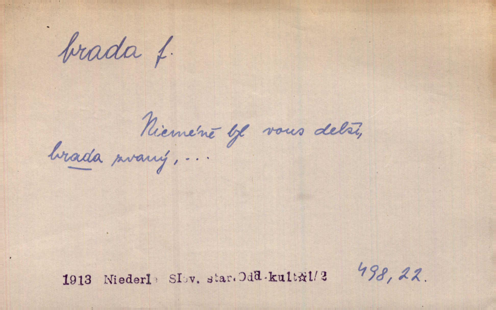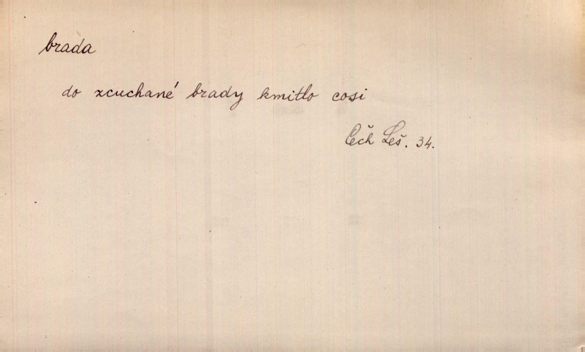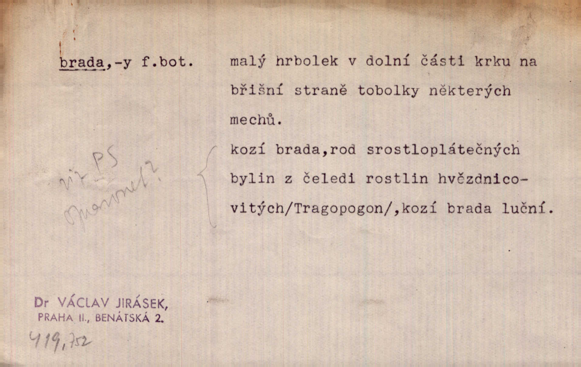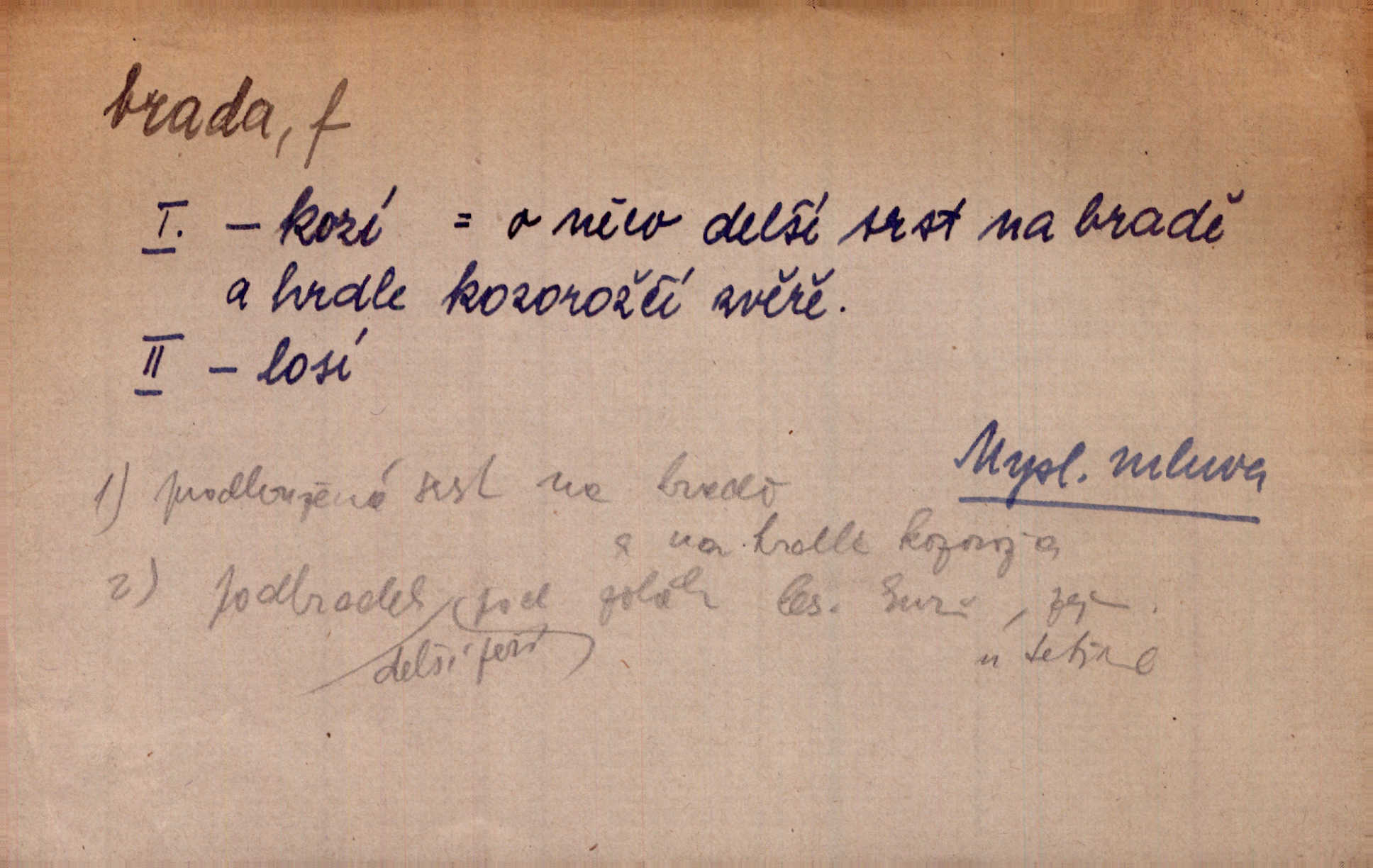 - brada, -y f. vyčnívající část obličeje pod ústy. Hladce oholený, vysedlé brady. Jir. Přen. Nepotkával jsem leč strážníky po bradu ozbrojené silně. Podl. Mít zlata po bradu a zívat při tom velebně dlouhou chvílí mnoho. Jir. Nosíte vy obě bradu vysoko jste pyšné. Herrm. Zítra šturm, a kdo ví, který z vás bude té chvíle bradou vzhůru mrtev. Jir. Mléko mu teče ještě po bradě a mluví, jako by byl už svým pánem je nedospělý, nezkušený. Šmil. D vousy na bradě. Hladě si levou rukou rozcuchanou bradu, seděl prostřed shromáždění. Staš. D Bot. kozí brada rostlina složnokvětá (Tragopogon). Rostlina z řádu pryskyřníkovitých stračka polní (Delphinium consolida). Houba kyjanka, kuřátka (Clavaria).