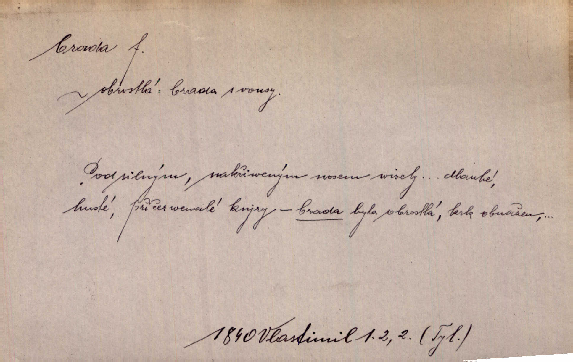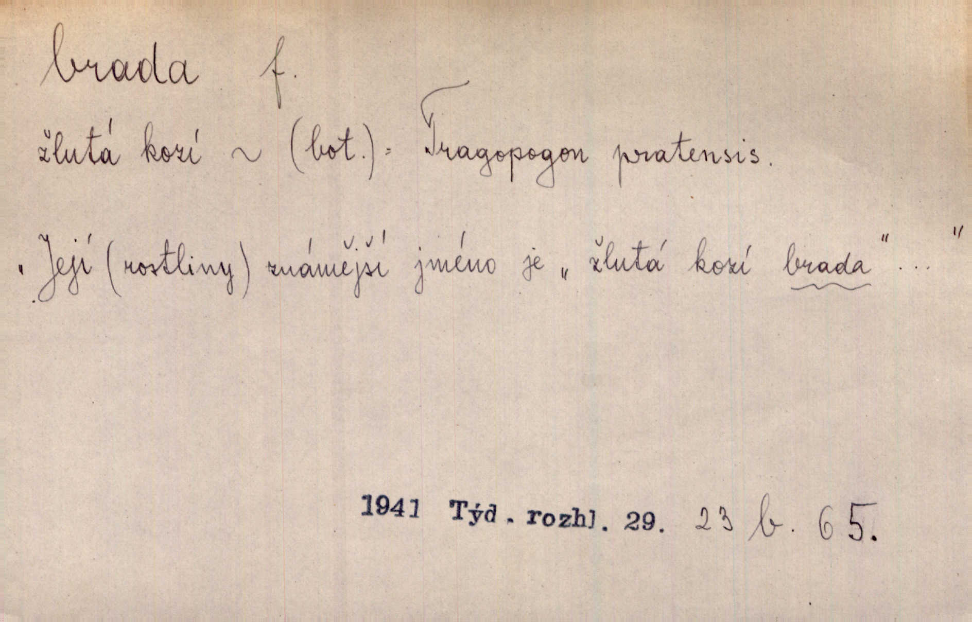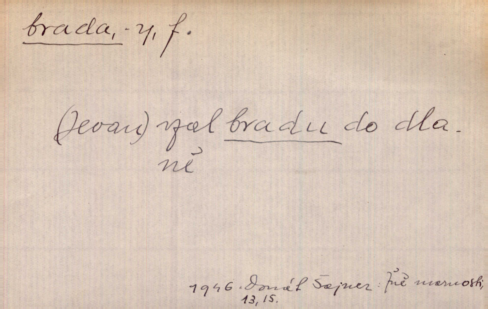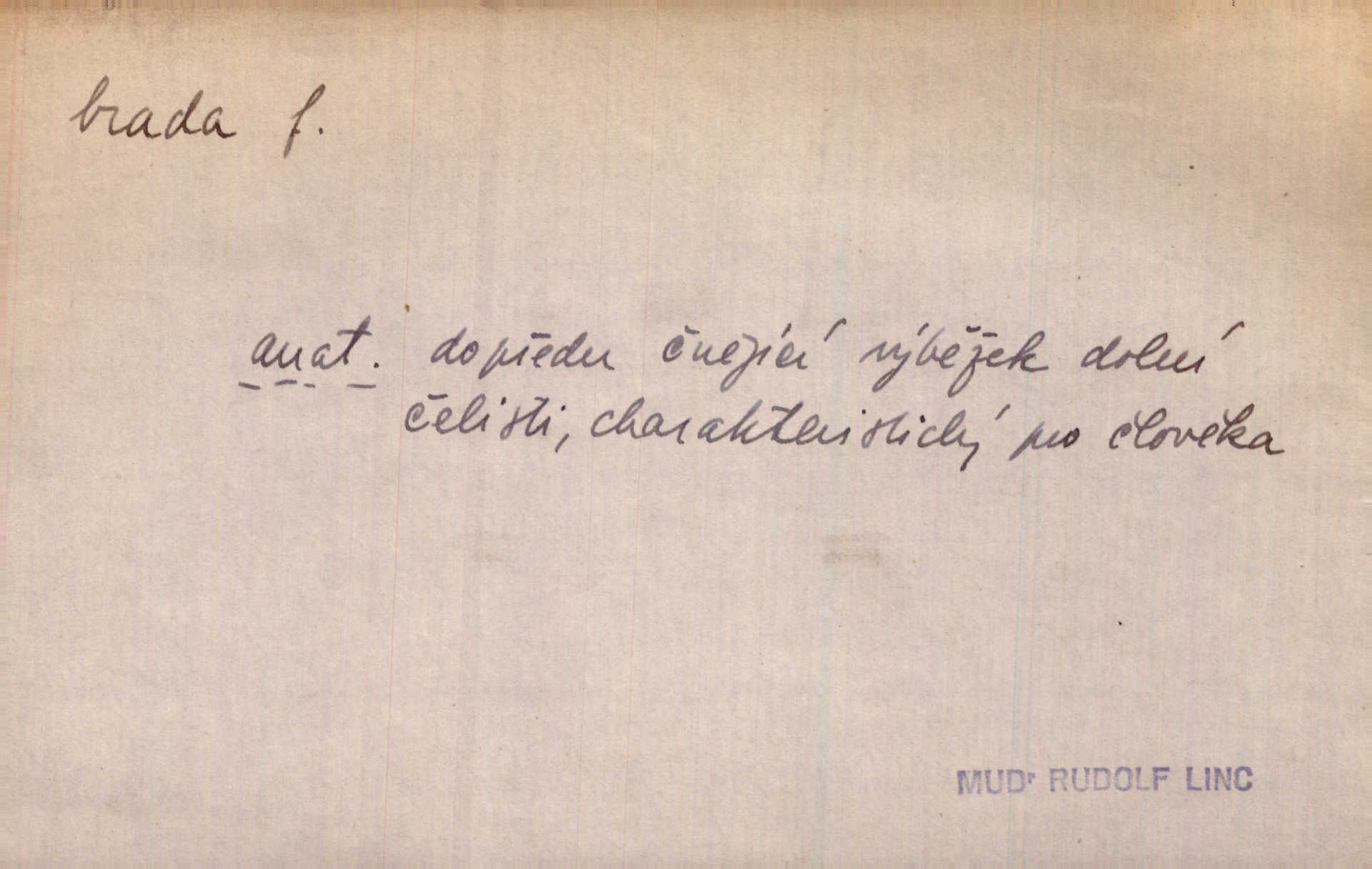 - brada, -y f. vyčnívající část obličeje pod ústy. Hladce oholený, vysedlé brady. Jir. Přen. Nepotkával jsem leč strážníky po bradu ozbrojené silně. Podl. Mít zlata po bradu a zívat při tom velebně dlouhou chvílí mnoho. Jir. Nosíte vy obě bradu vysoko jste pyšné. Herrm. Zítra šturm, a kdo ví, který z vás bude té chvíle bradou vzhůru mrtev. Jir. Mléko mu teče ještě po bradě a mluví, jako by byl už svým pánem je nedospělý, nezkušený. Šmil. D vousy na bradě. Hladě si levou rukou rozcuchanou bradu, seděl prostřed shromáždění. Staš. D Bot. kozí brada rostlina složnokvětá (Tragopogon). Rostlina z řádu pryskyřníkovitých stračka polní (Delphinium consolida). Houba kyjanka, kuřátka (Clavaria).