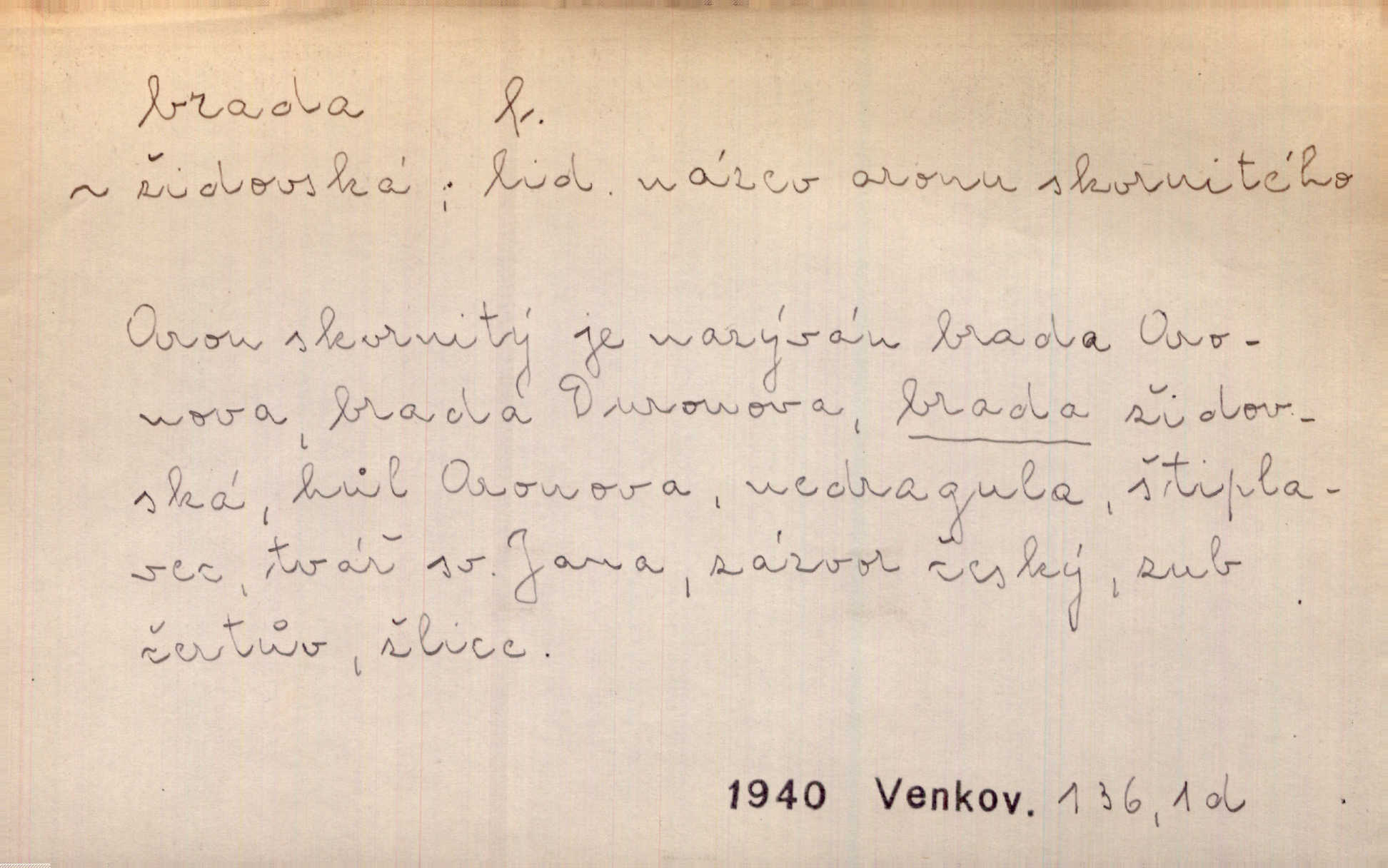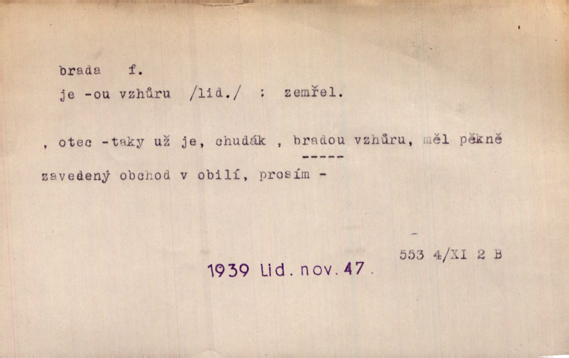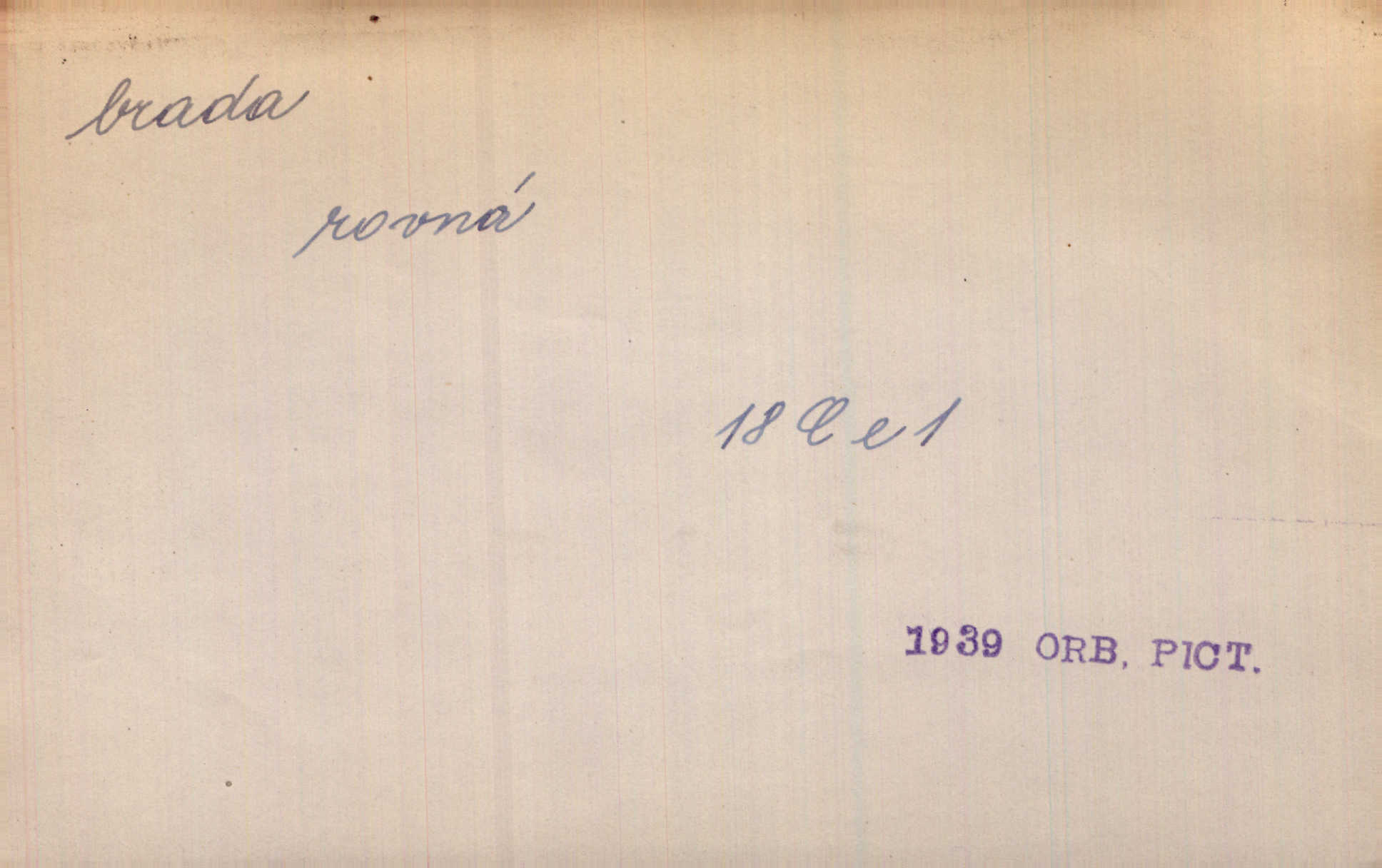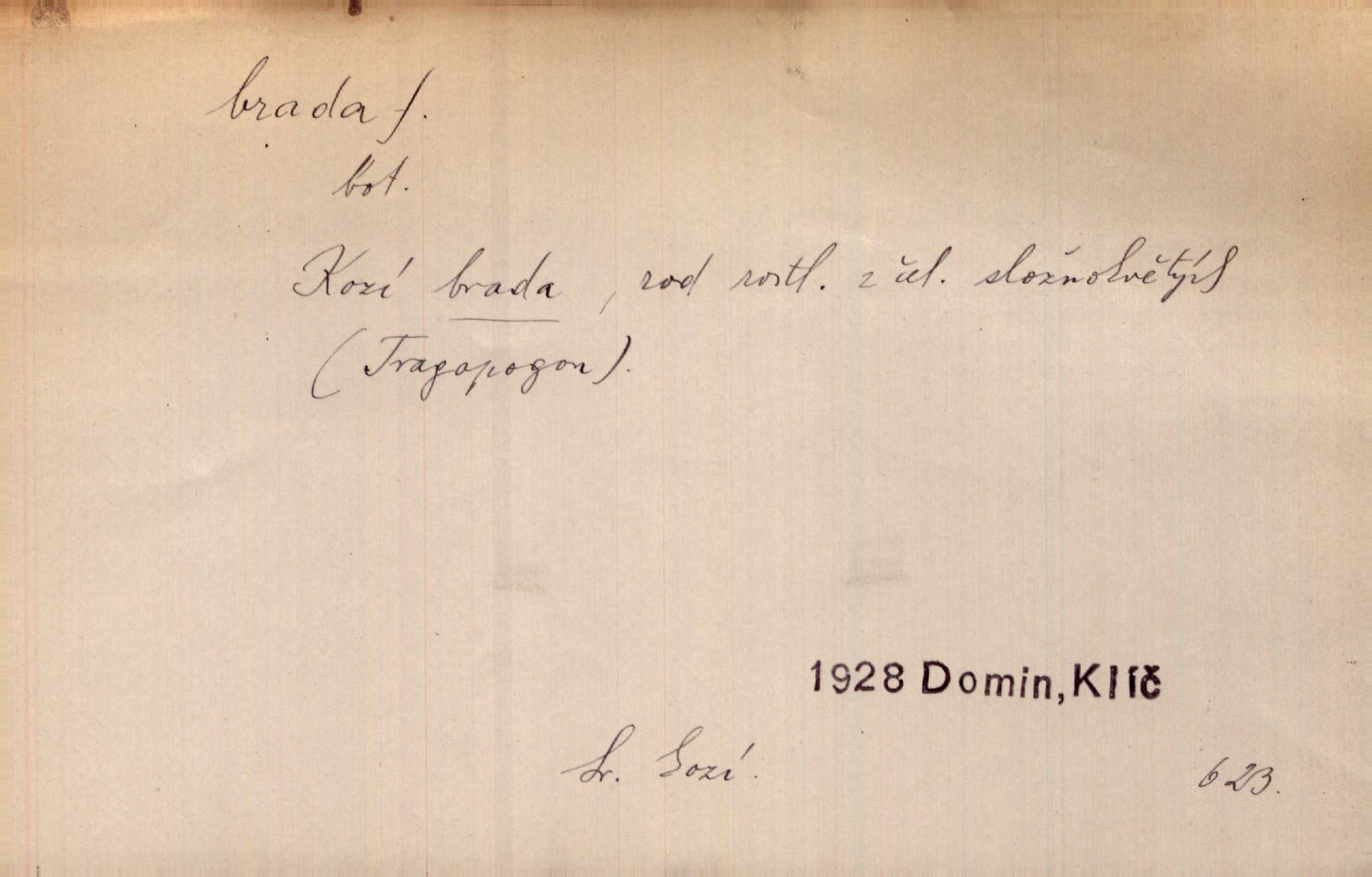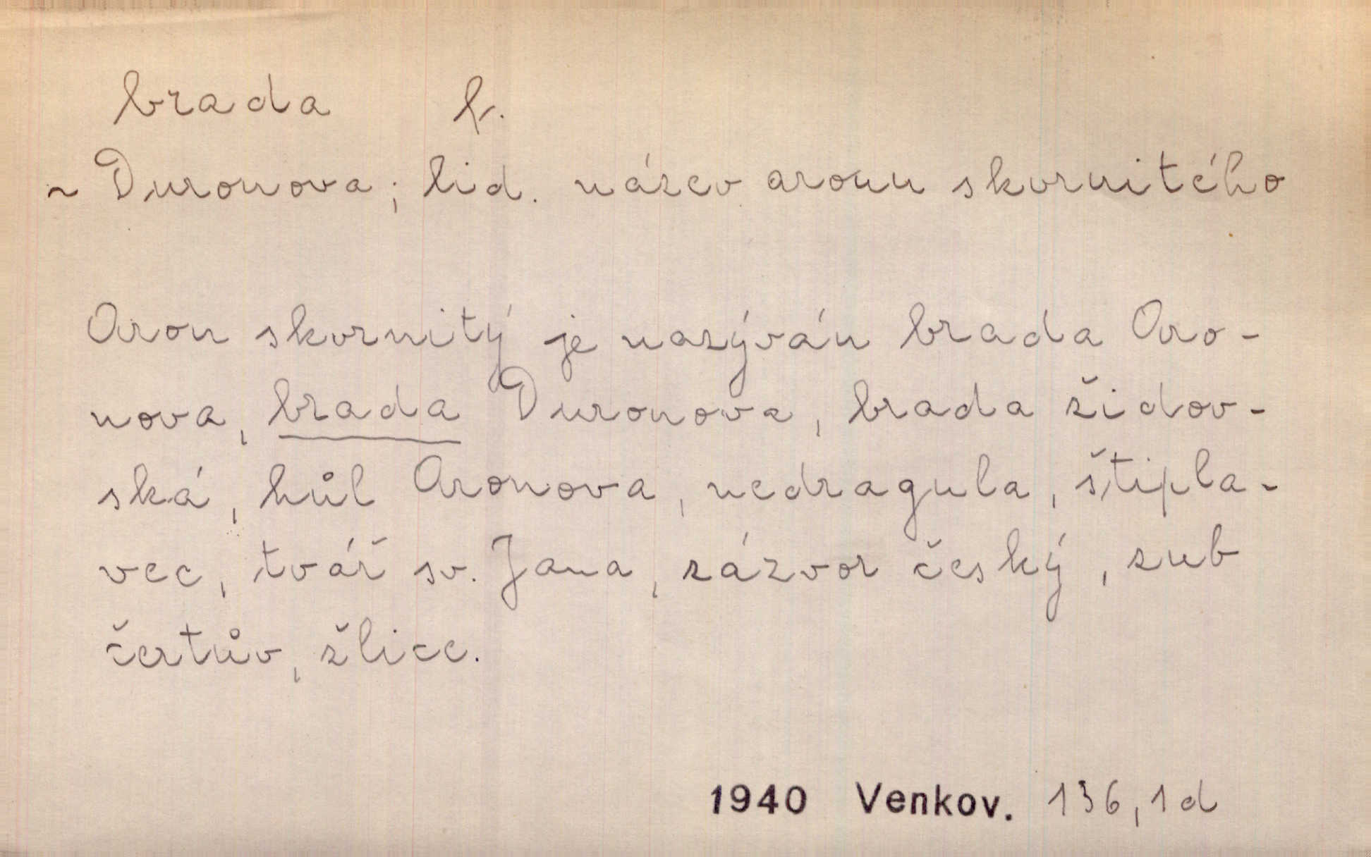 - brada, -y f. vyčnívající část obličeje pod ústy. Hladce oholený, vysedlé brady. Jir. Přen. Nepotkával jsem leč strážníky po bradu ozbrojené silně. Podl. Mít zlata po bradu a zívat při tom velebně dlouhou chvílí mnoho. Jir. Nosíte vy obě bradu vysoko jste pyšné. Herrm. Zítra šturm, a kdo ví, který z vás bude té chvíle bradou vzhůru mrtev. Jir. Mléko mu teče ještě po bradě a mluví, jako by byl už svým pánem je nedospělý, nezkušený. Šmil. D vousy na bradě. Hladě si levou rukou rozcuchanou bradu, seděl prostřed shromáždění. Staš. D Bot. kozí brada rostlina složnokvětá (Tragopogon). Rostlina z řádu pryskyřníkovitých stračka polní (Delphinium consolida). Houba kyjanka, kuřátka (Clavaria).
