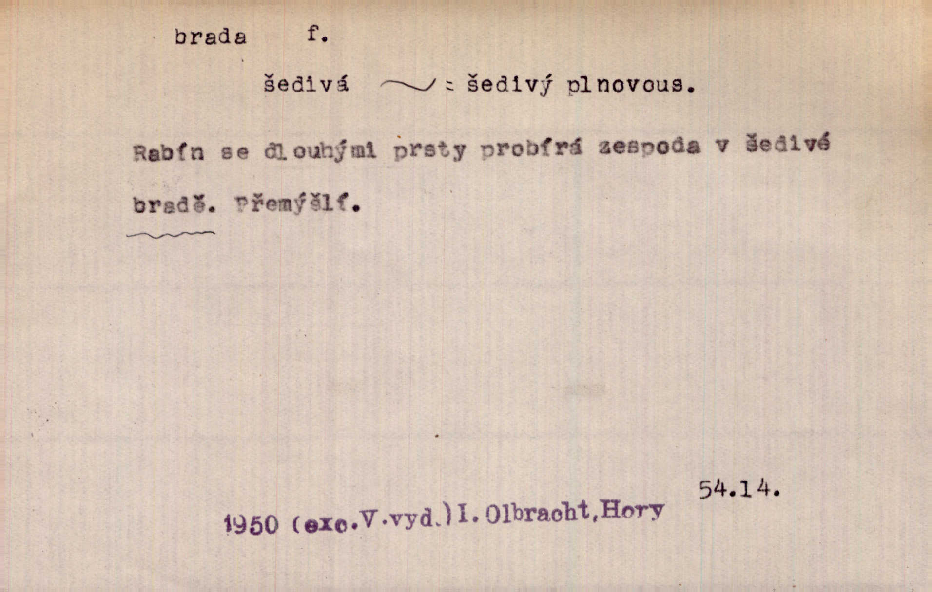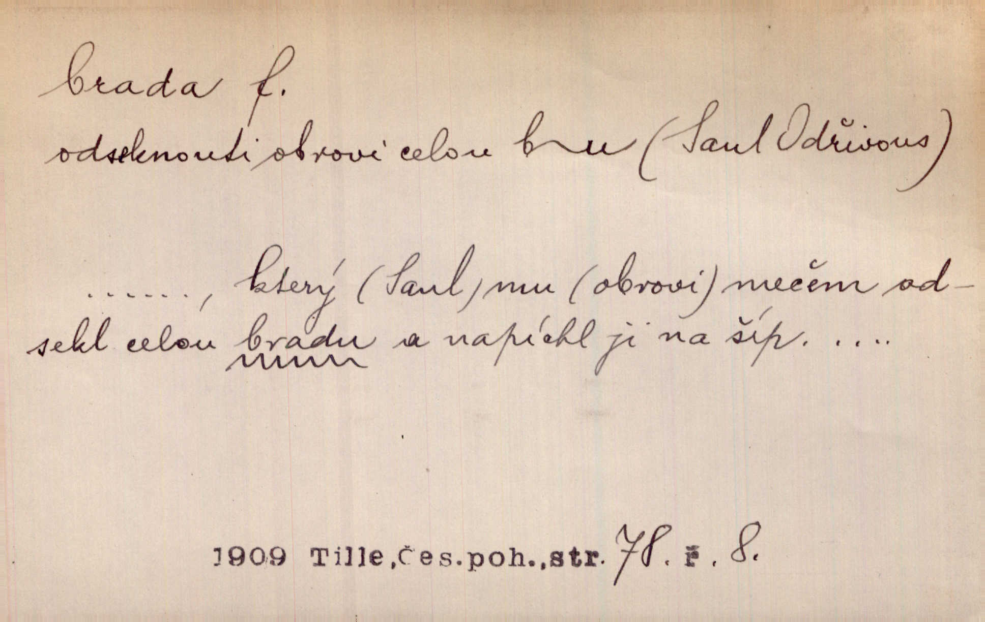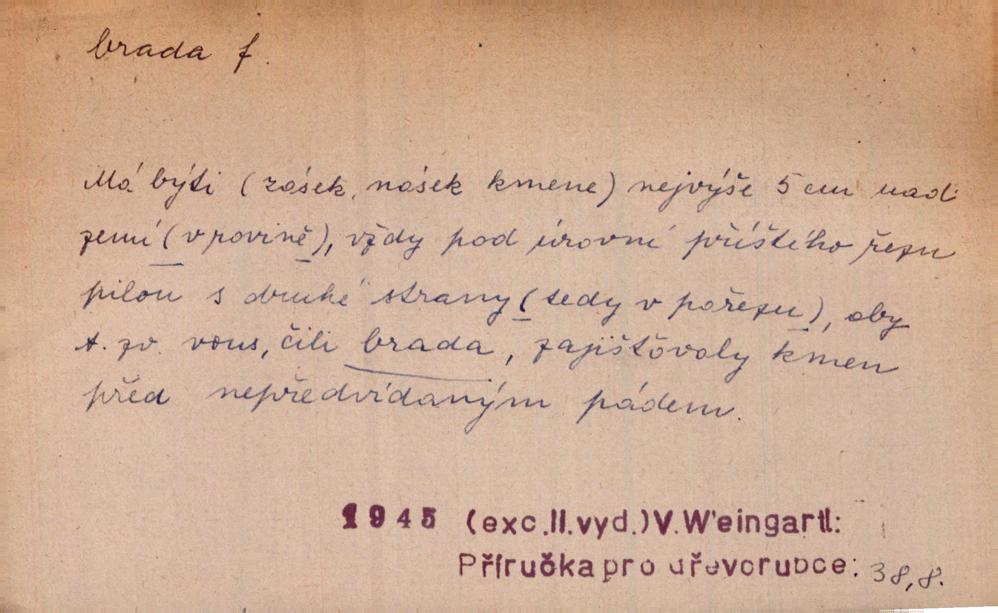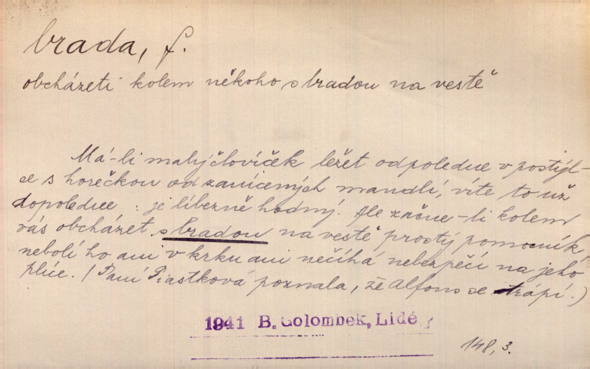 - brada, -y f. vyčnívající část obličeje pod ústy. Hladce oholený, vysedlé brady. Jir. Přen. Nepotkával jsem leč strážníky po bradu ozbrojené silně. Podl. Mít zlata po bradu a zívat při tom velebně dlouhou chvílí mnoho. Jir. Nosíte vy obě bradu vysoko jste pyšné. Herrm. Zítra šturm, a kdo ví, který z vás bude té chvíle bradou vzhůru mrtev. Jir. Mléko mu teče ještě po bradě a mluví, jako by byl už svým pánem je nedospělý, nezkušený. Šmil. D vousy na bradě. Hladě si levou rukou rozcuchanou bradu, seděl prostřed shromáždění. Staš. D Bot. kozí brada rostlina složnokvětá (Tragopogon). Rostlina z řádu pryskyřníkovitých stračka polní (Delphinium consolida). Houba kyjanka, kuřátka (Clavaria).