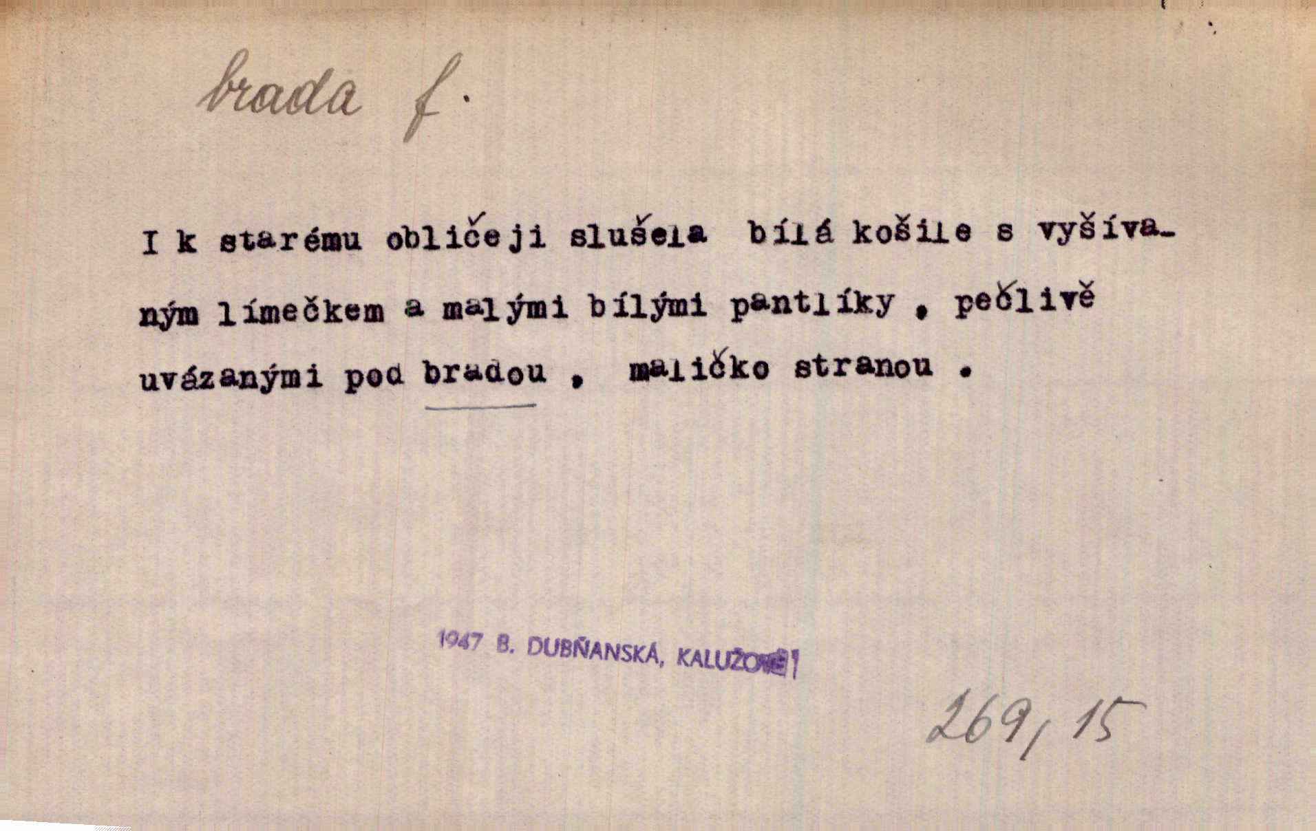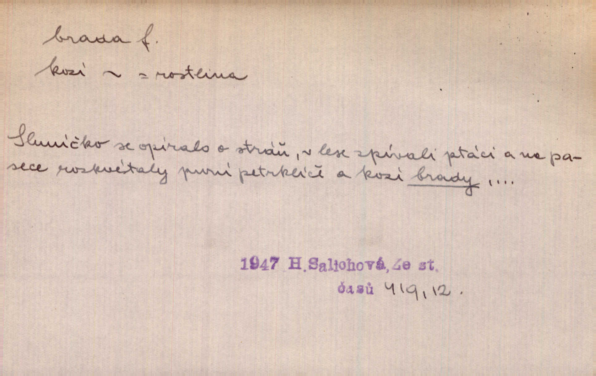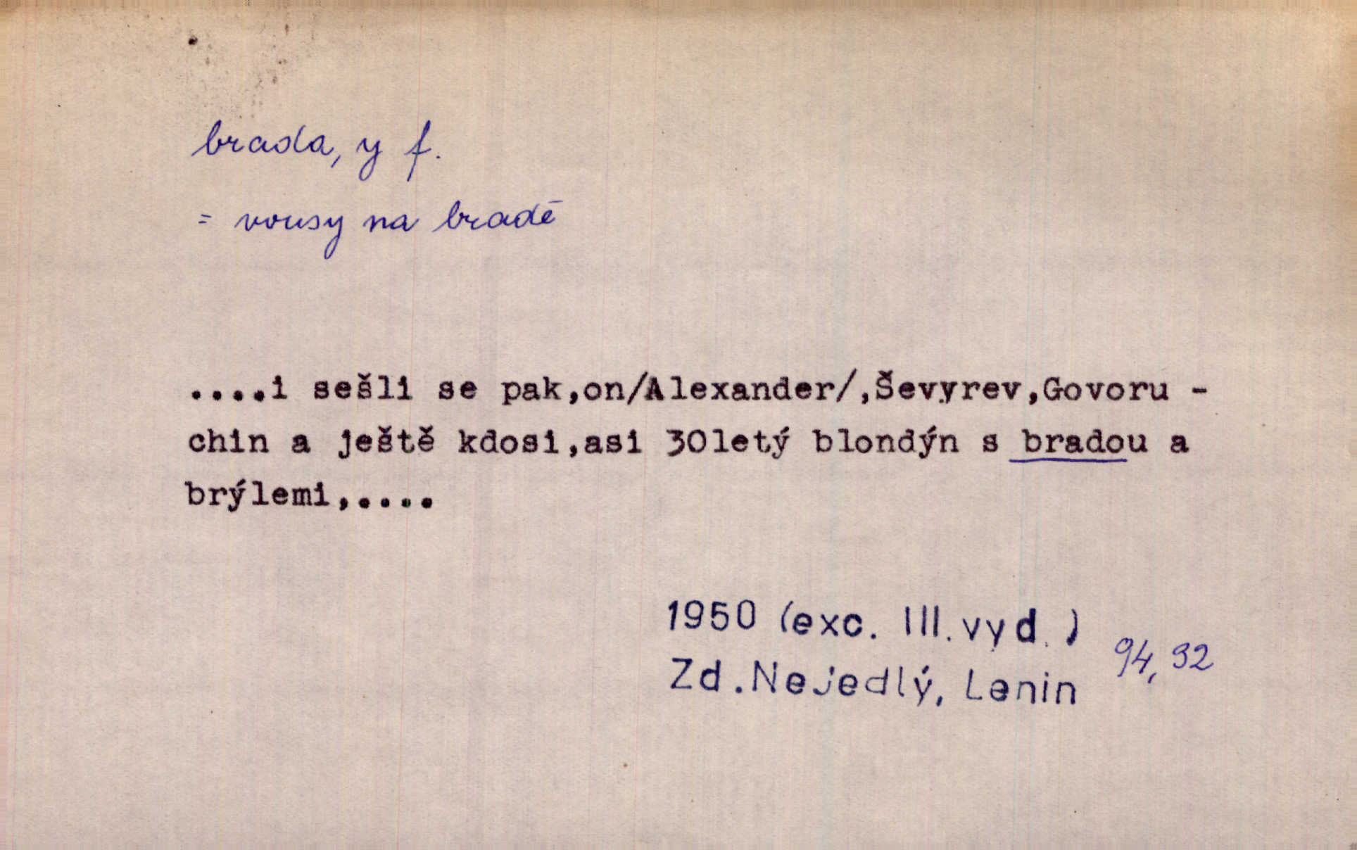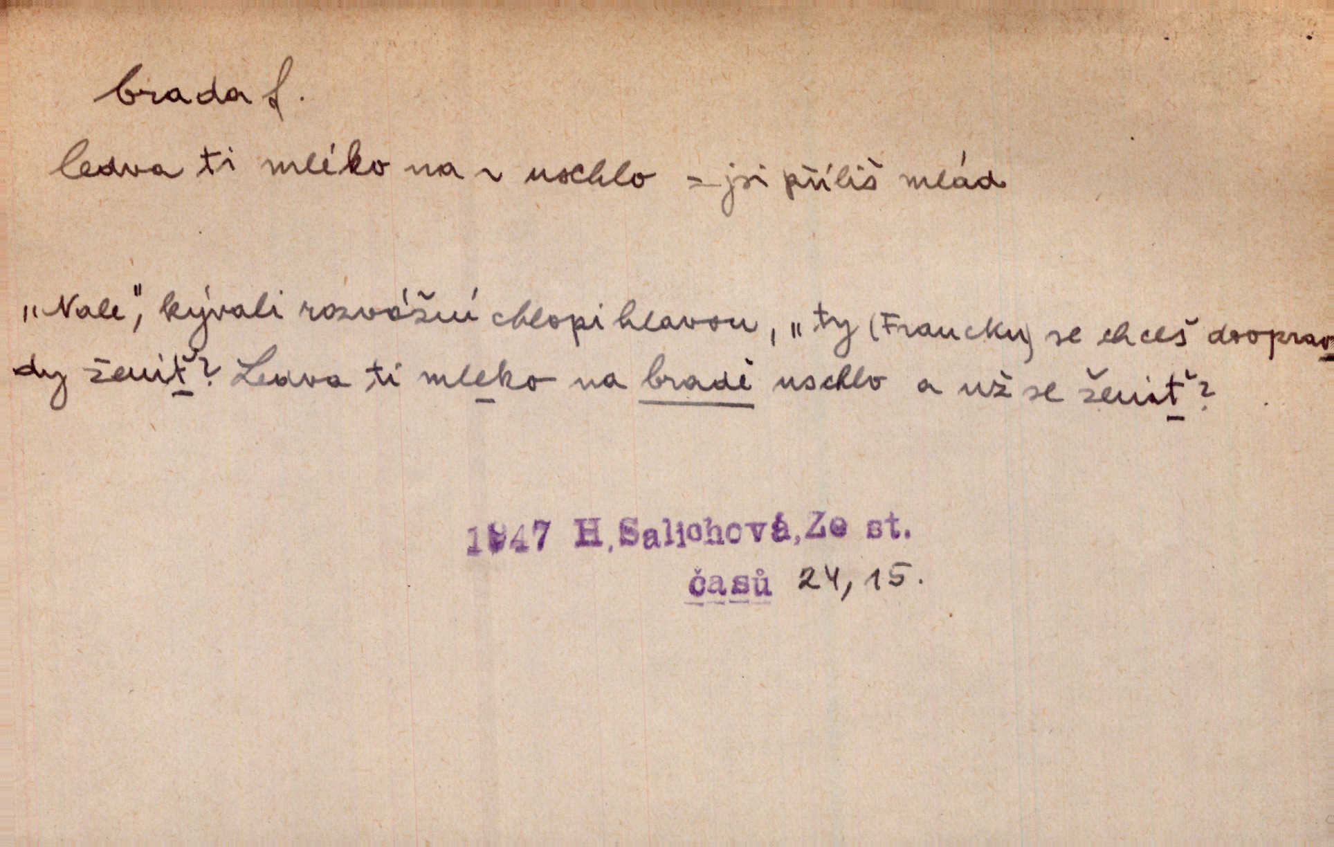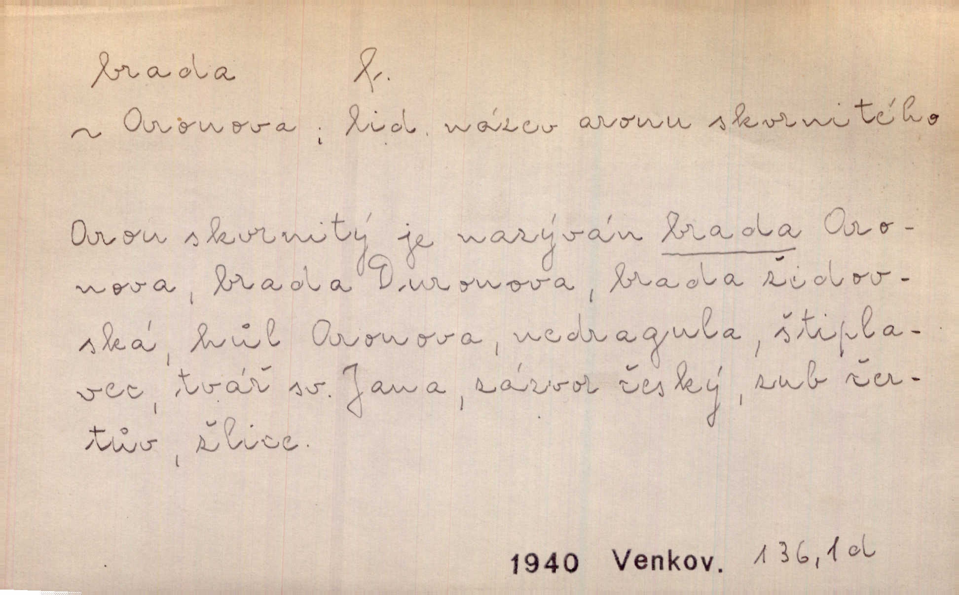 - brada, -y f. vyčnívající část obličeje pod ústy. Hladce oholený, vysedlé brady. Jir. Přen. Nepotkával jsem leč strážníky po bradu ozbrojené silně. Podl. Mít zlata po bradu a zívat při tom velebně dlouhou chvílí mnoho. Jir. Nosíte vy obě bradu vysoko jste pyšné. Herrm. Zítra šturm, a kdo ví, který z vás bude té chvíle bradou vzhůru mrtev. Jir. Mléko mu teče ještě po bradě a mluví, jako by byl už svým pánem je nedospělý, nezkušený. Šmil. D vousy na bradě. Hladě si levou rukou rozcuchanou bradu, seděl prostřed shromáždění. Staš. D Bot. kozí brada rostlina složnokvětá (Tragopogon). Rostlina z řádu pryskyřníkovitých stračka polní (Delphinium consolida). Houba kyjanka, kuřátka (Clavaria).
