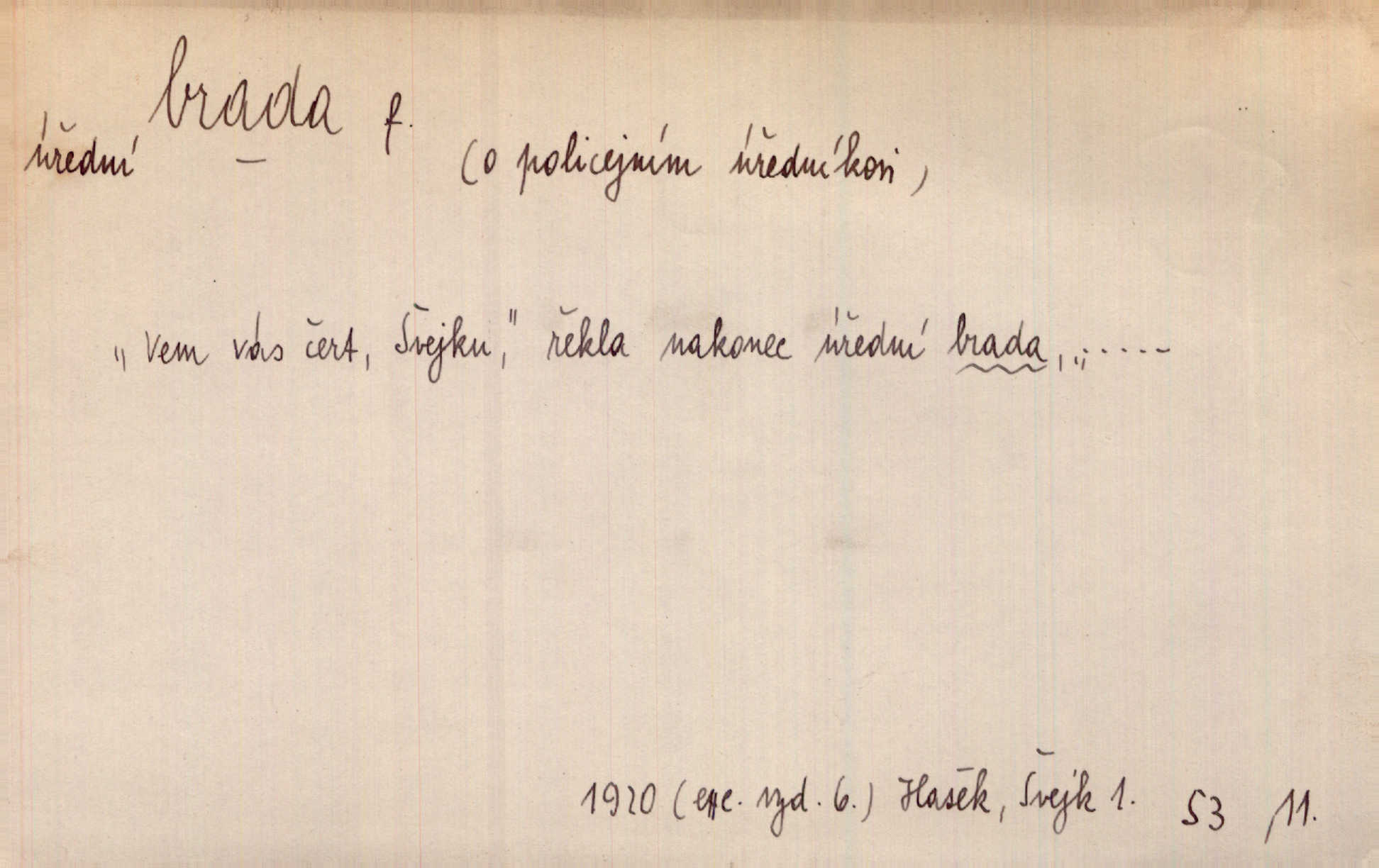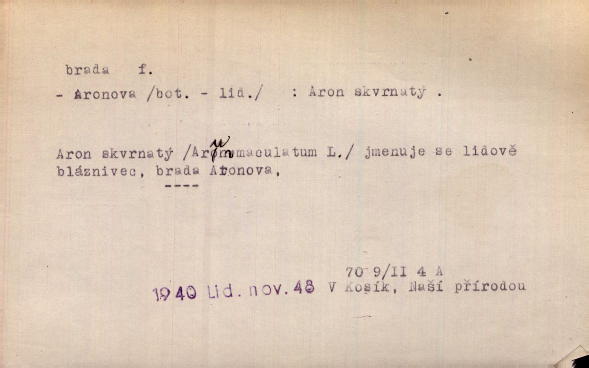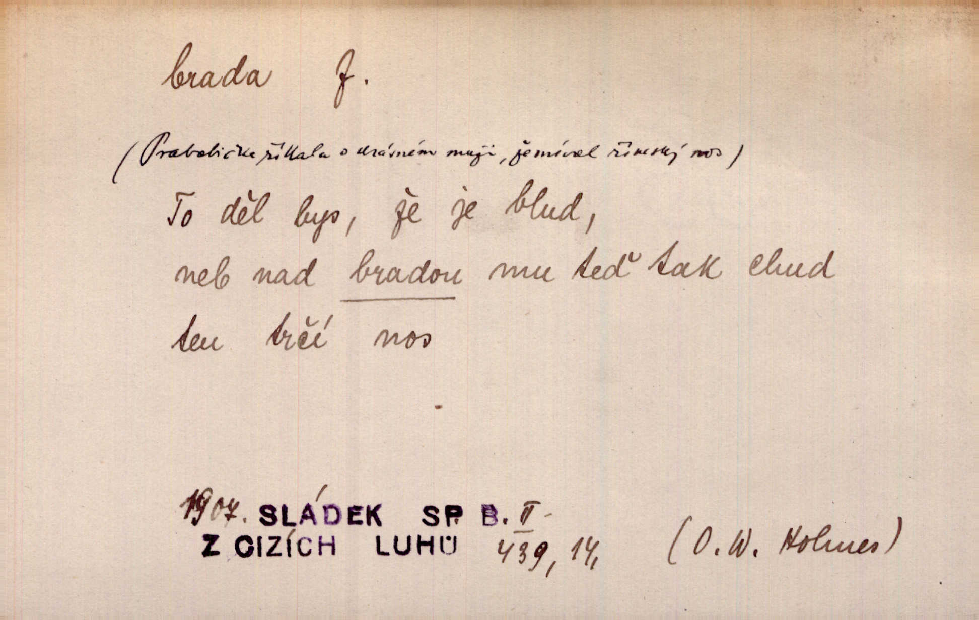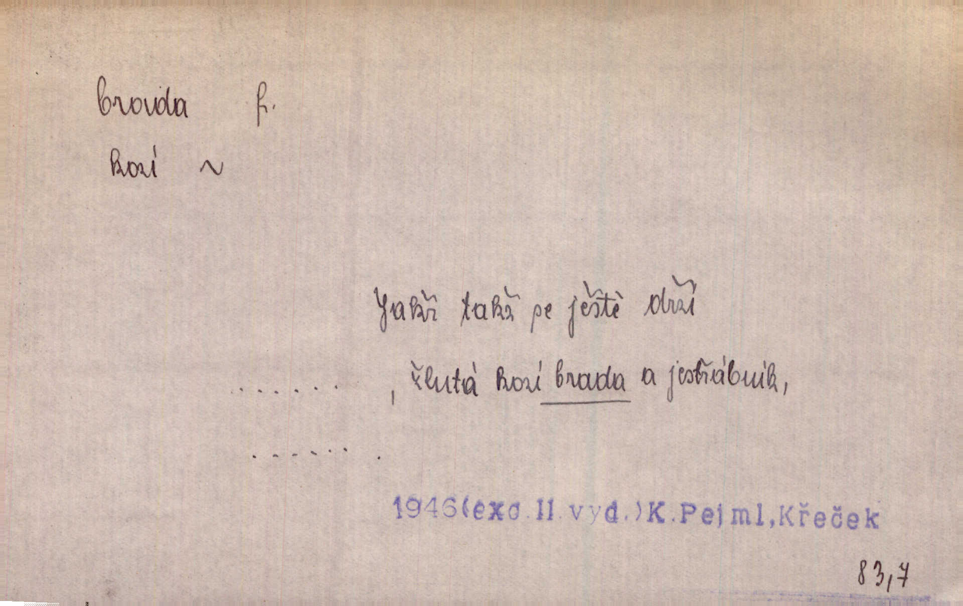 - brada, -y f. vyčnívající část obličeje pod ústy. Hladce oholený, vysedlé brady. Jir. Přen. Nepotkával jsem leč strážníky po bradu ozbrojené silně. Podl. Mít zlata po bradu a zívat při tom velebně dlouhou chvílí mnoho. Jir. Nosíte vy obě bradu vysoko jste pyšné. Herrm. Zítra šturm, a kdo ví, který z vás bude té chvíle bradou vzhůru mrtev. Jir. Mléko mu teče ještě po bradě a mluví, jako by byl už svým pánem je nedospělý, nezkušený. Šmil. D vousy na bradě. Hladě si levou rukou rozcuchanou bradu, seděl prostřed shromáždění. Staš. D Bot. kozí brada rostlina složnokvětá (Tragopogon). Rostlina z řádu pryskyřníkovitých stračka polní (Delphinium consolida). Houba kyjanka, kuřátka (Clavaria).