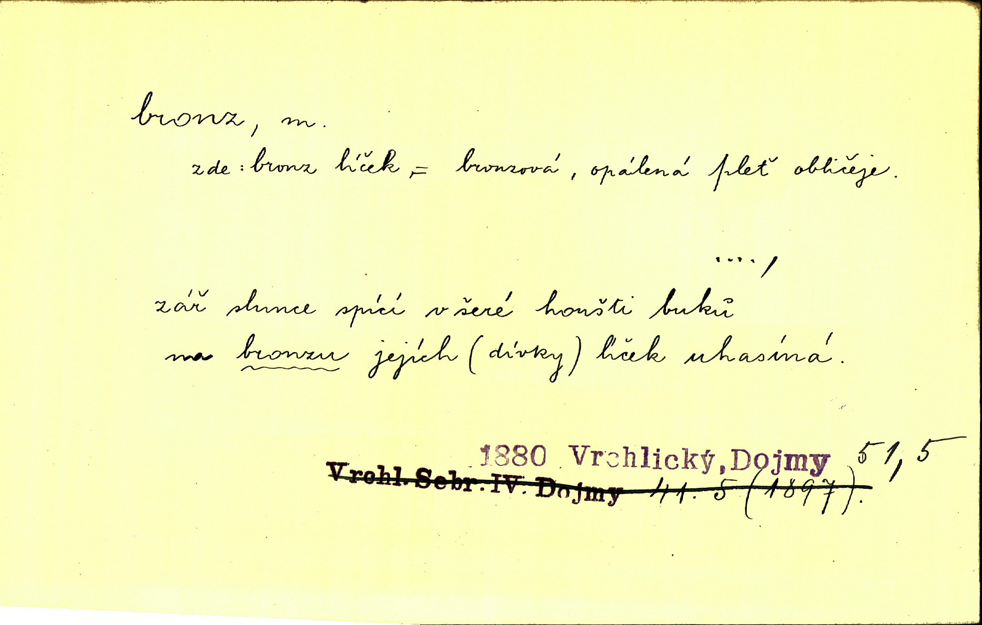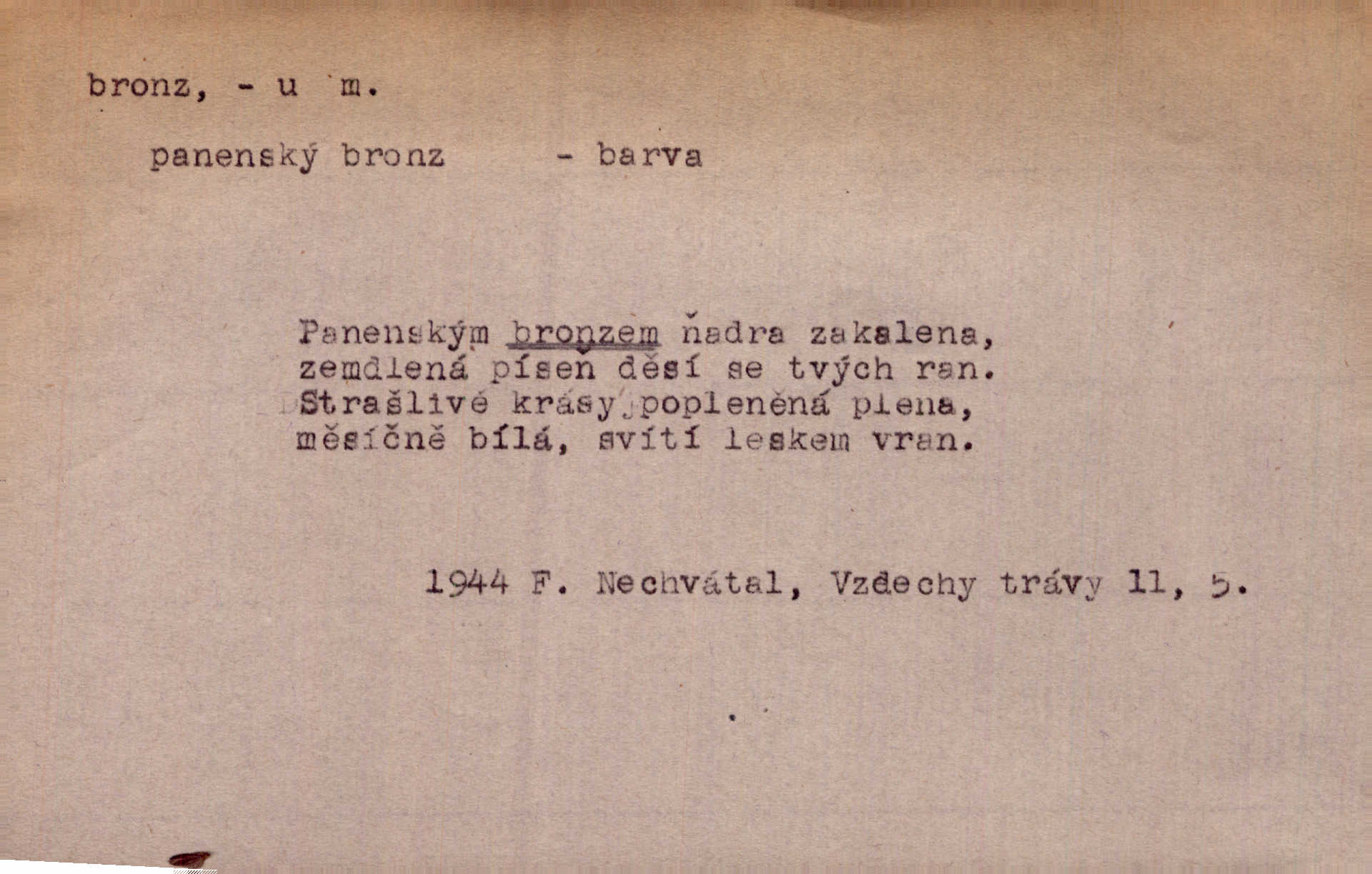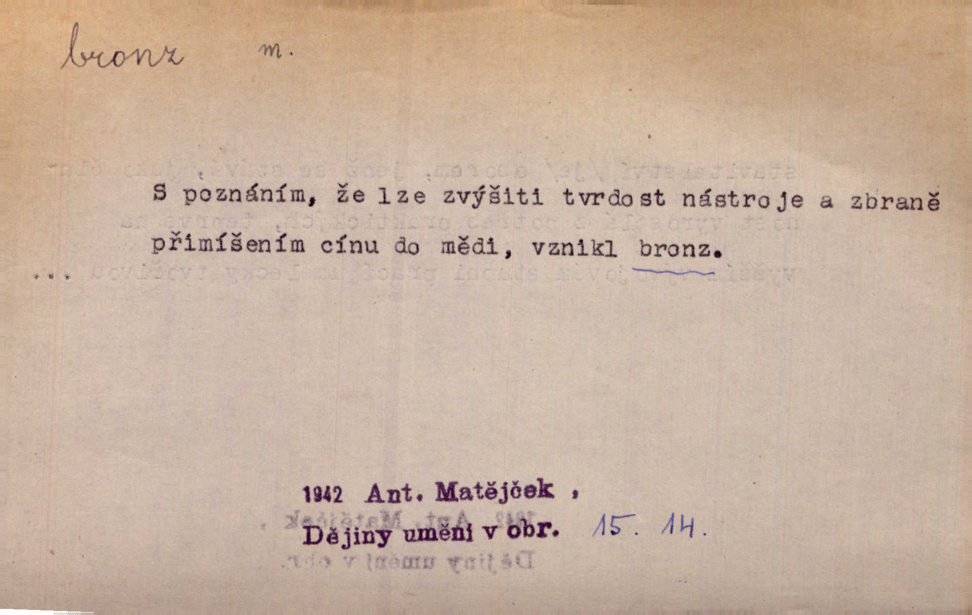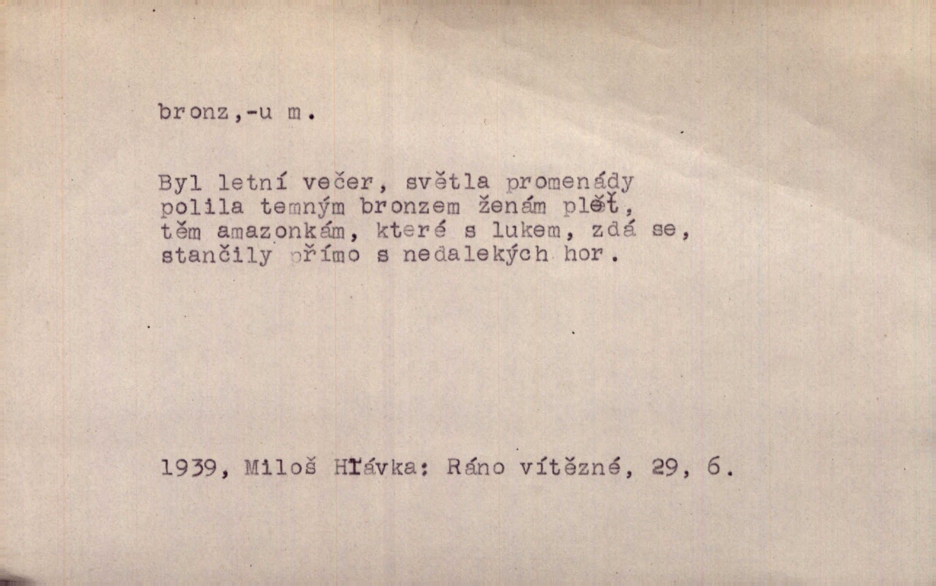 - bronz, -u m. slitina mědi a cínu, spěž. Pomník z bronzu. Umělecký předmět z bronzu. Ten nález starých bronzů, popelnic mi zprvu zdál se věcí nahodilou. Vrch. D bronzová barva. Barva celého těla je čerň a bronz. Mah.