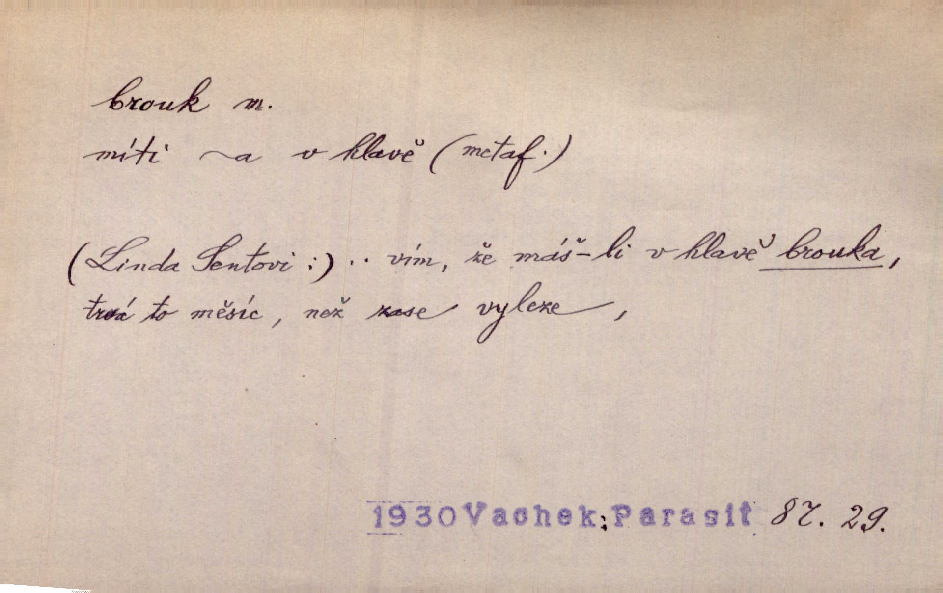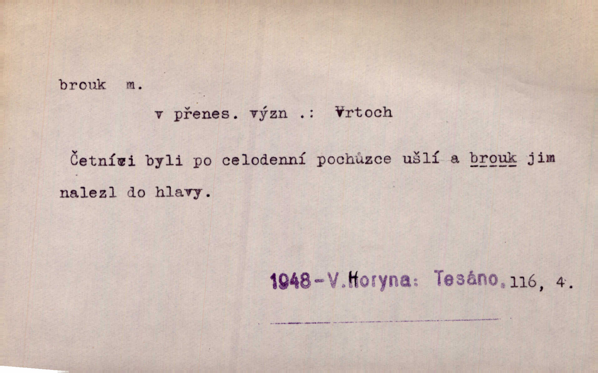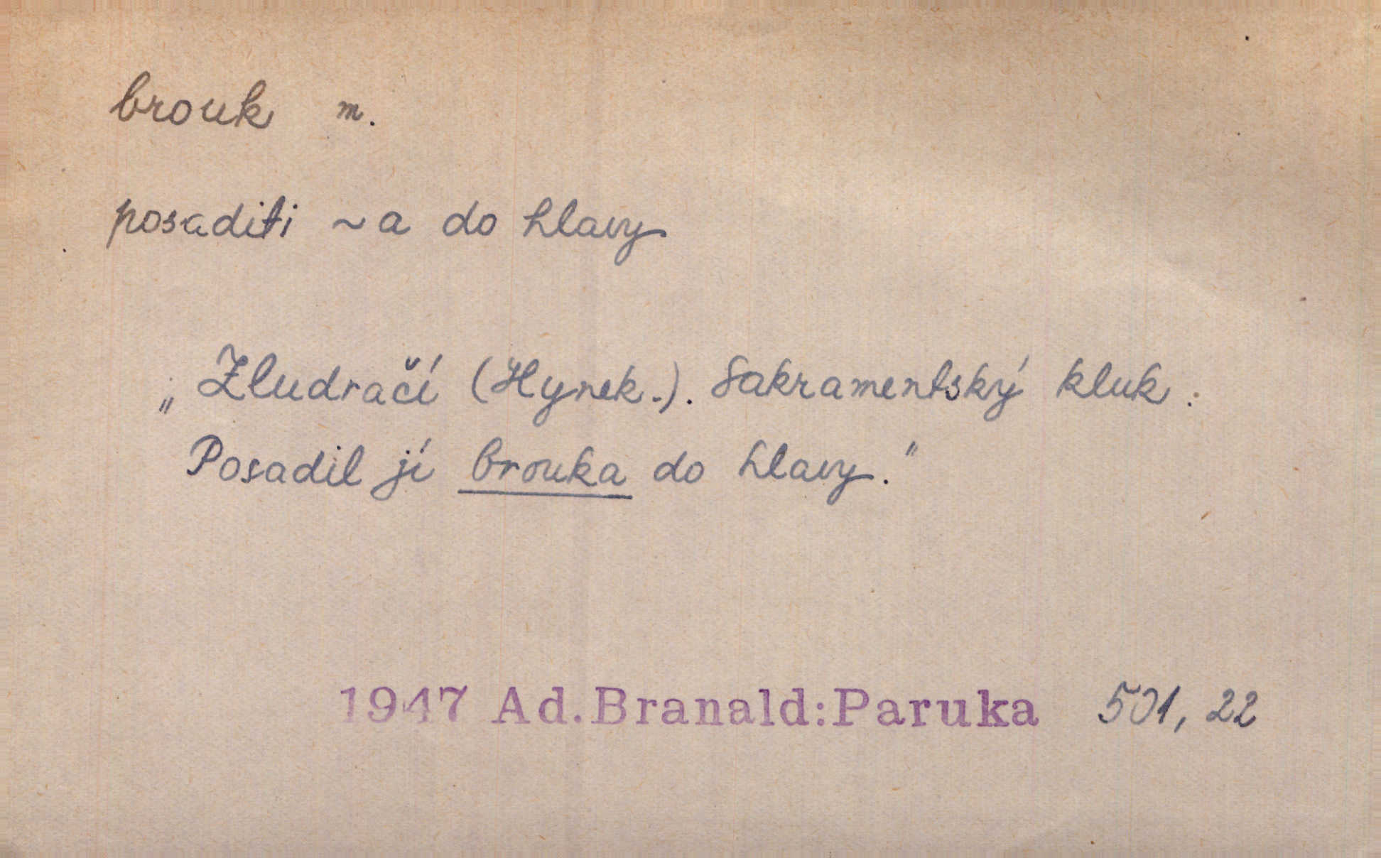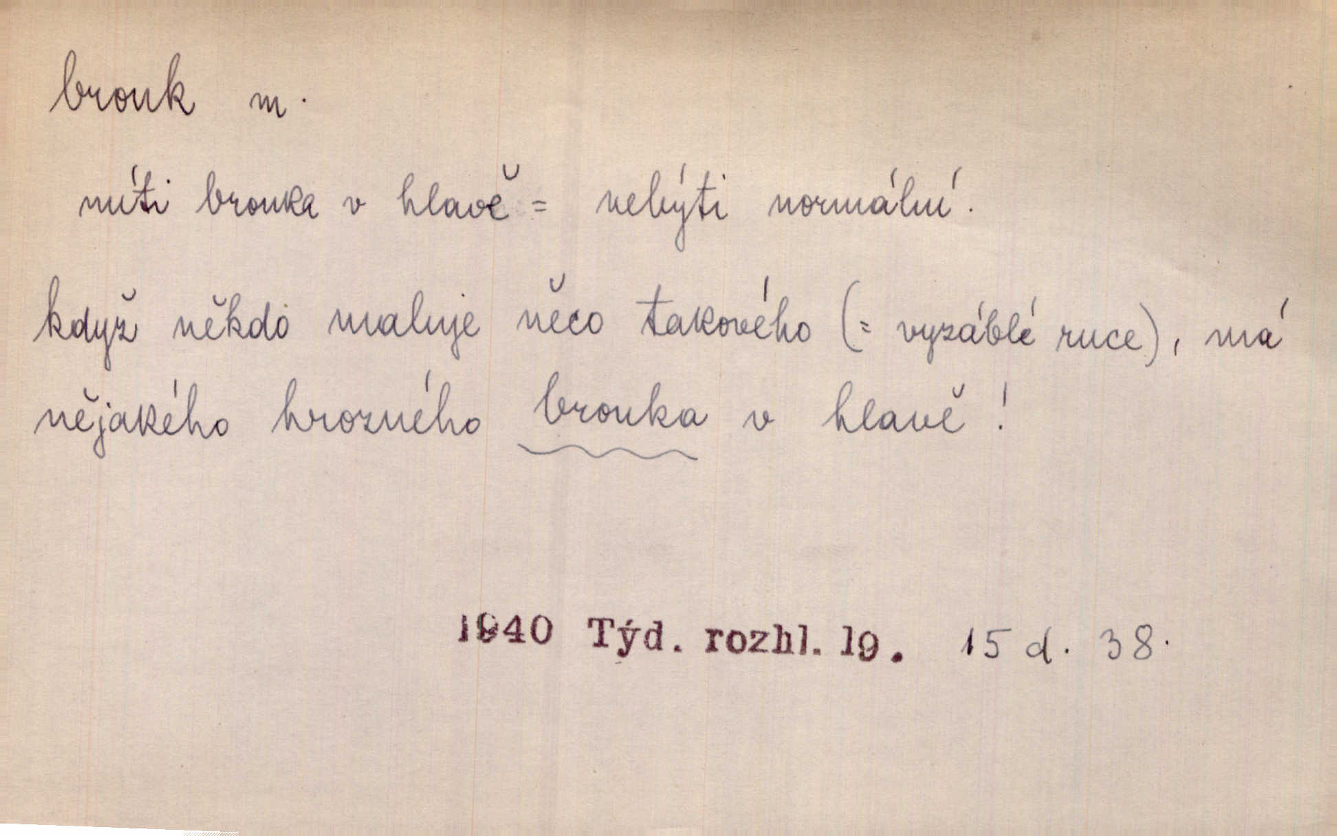 - brouk, -a m. zool. brouci řád hmyzu. Vulg. o vších. Nemáš-li brouky, tak lehni a kušuj! Čap. Ch. D bručoun, mrzout, pavouk, podivín. Ženské mají rády hodně řečí, veselé muže a ne brouky. Rais. Pan páter Šulc byl zvláštní brouk. Jir. D Hypok. dítě. „A co s vámi, brouci?“ ptá se Cimbura dětí. Baar. D přezdívka, nadávka. Nadávali mu Němců brouků. Pfleg. Slyšte, jak se tento černý brouk [theolog Jago] rouhá Pedrovi. Čap. Ch. D rozmar, vrtoch, mrzutá nálada. Jaký brouk ti najednou vlezl do hlavy? Jir. Vrtáci, podivínové, slaboši, kteří si nasadí do hlavy různé maroty a brouky. Šal. Mámy někdy mívají podivné brouky, víme? Nejde jim každý pod nos. Herrm. Zeptejte se raději psychiatra. Ti mají takové methody: vyhánějí brouky z hlavy. Vach.