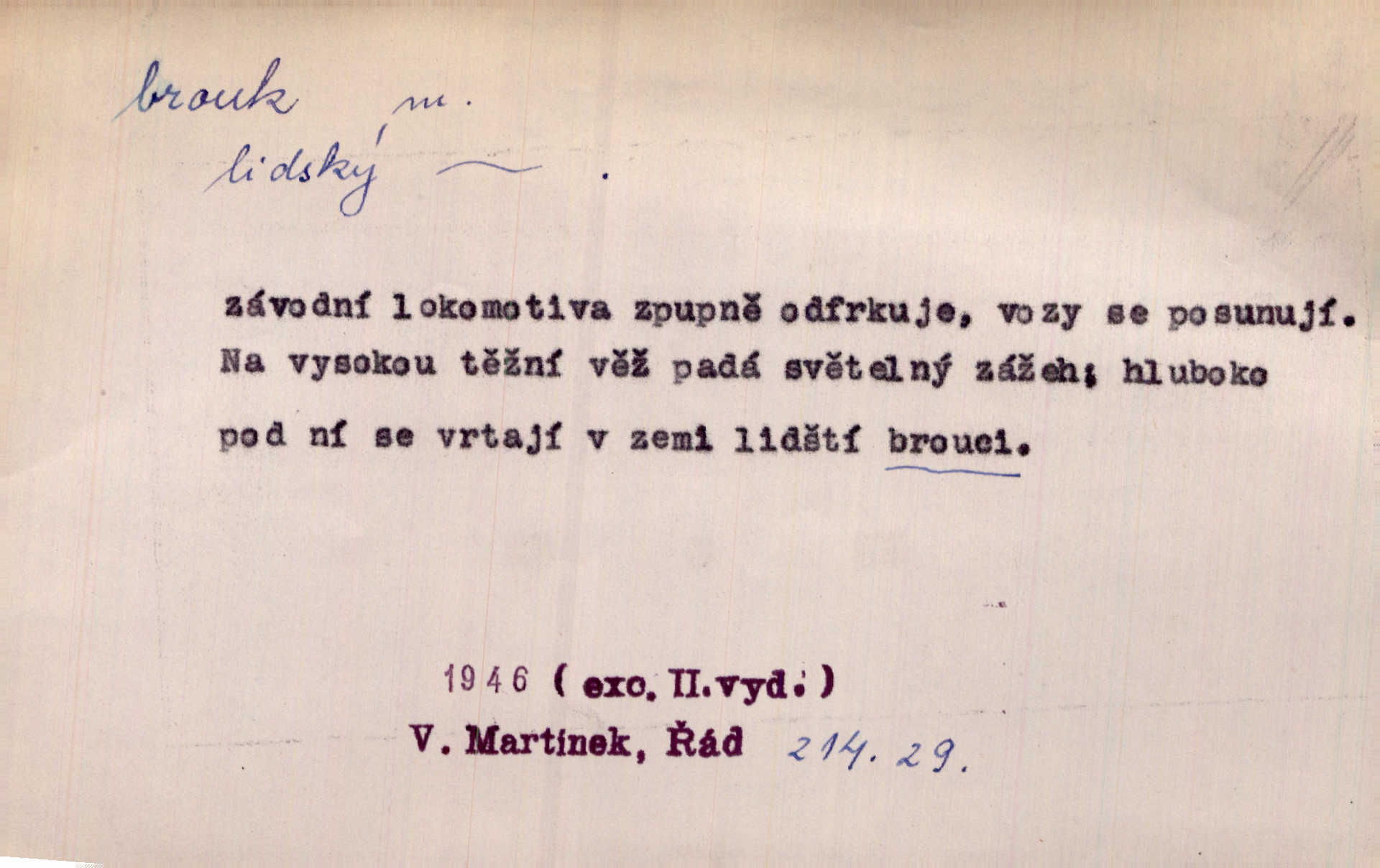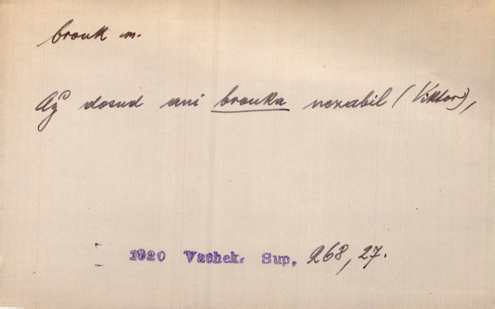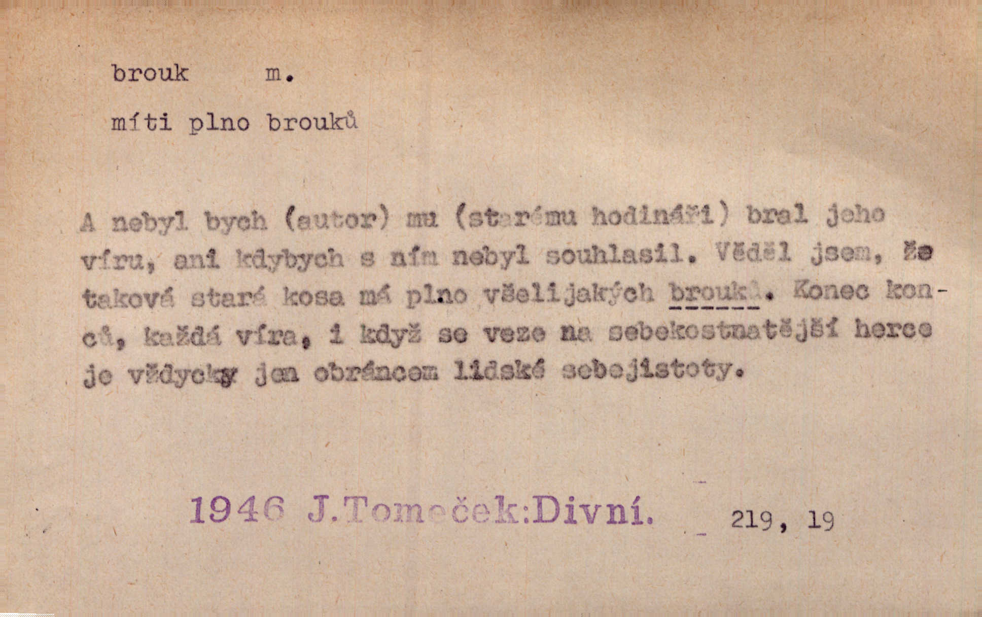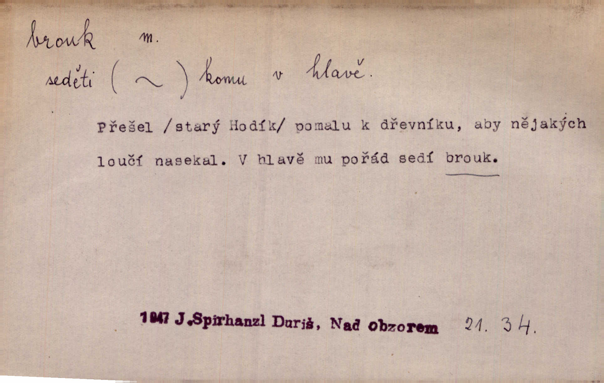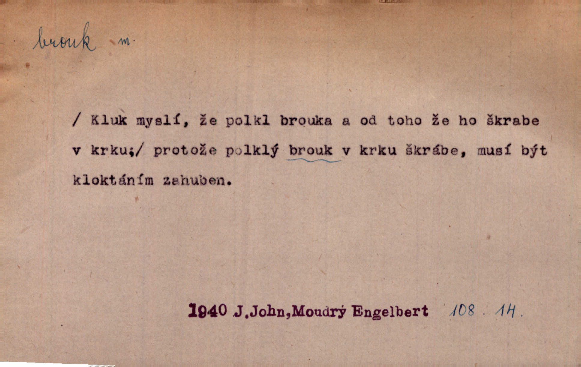 - brouk, -a m. zool. brouci řád hmyzu. Vulg. o vších. Nemáš-li brouky, tak lehni a kušuj! Čap. Ch. D bručoun, mrzout, pavouk, podivín. Ženské mají rády hodně řečí, veselé muže a ne brouky. Rais. Pan páter Šulc byl zvláštní brouk. Jir. D Hypok. dítě. „A co s vámi, brouci?“ ptá se Cimbura dětí. Baar. D přezdívka, nadávka. Nadávali mu Němců brouků. Pfleg. Slyšte, jak se tento černý brouk [theolog Jago] rouhá Pedrovi. Čap. Ch. D rozmar, vrtoch, mrzutá nálada. Jaký brouk ti najednou vlezl do hlavy? Jir. Vrtáci, podivínové, slaboši, kteří si nasadí do hlavy různé maroty a brouky. Šal. Mámy někdy mívají podivné brouky, víme? Nejde jim každý pod nos. Herrm. Zeptejte se raději psychiatra. Ti mají takové methody: vyhánějí brouky z hlavy. Vach.