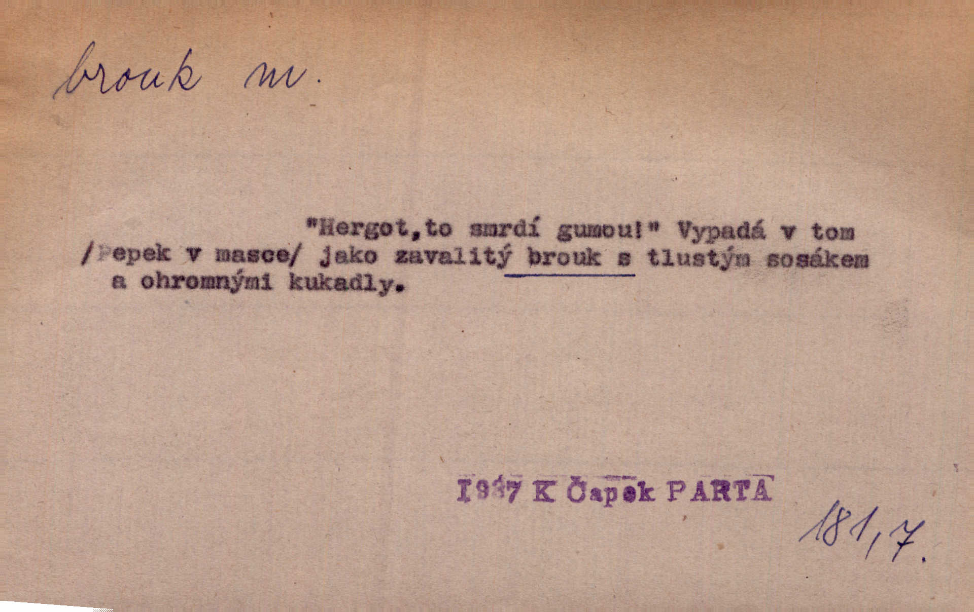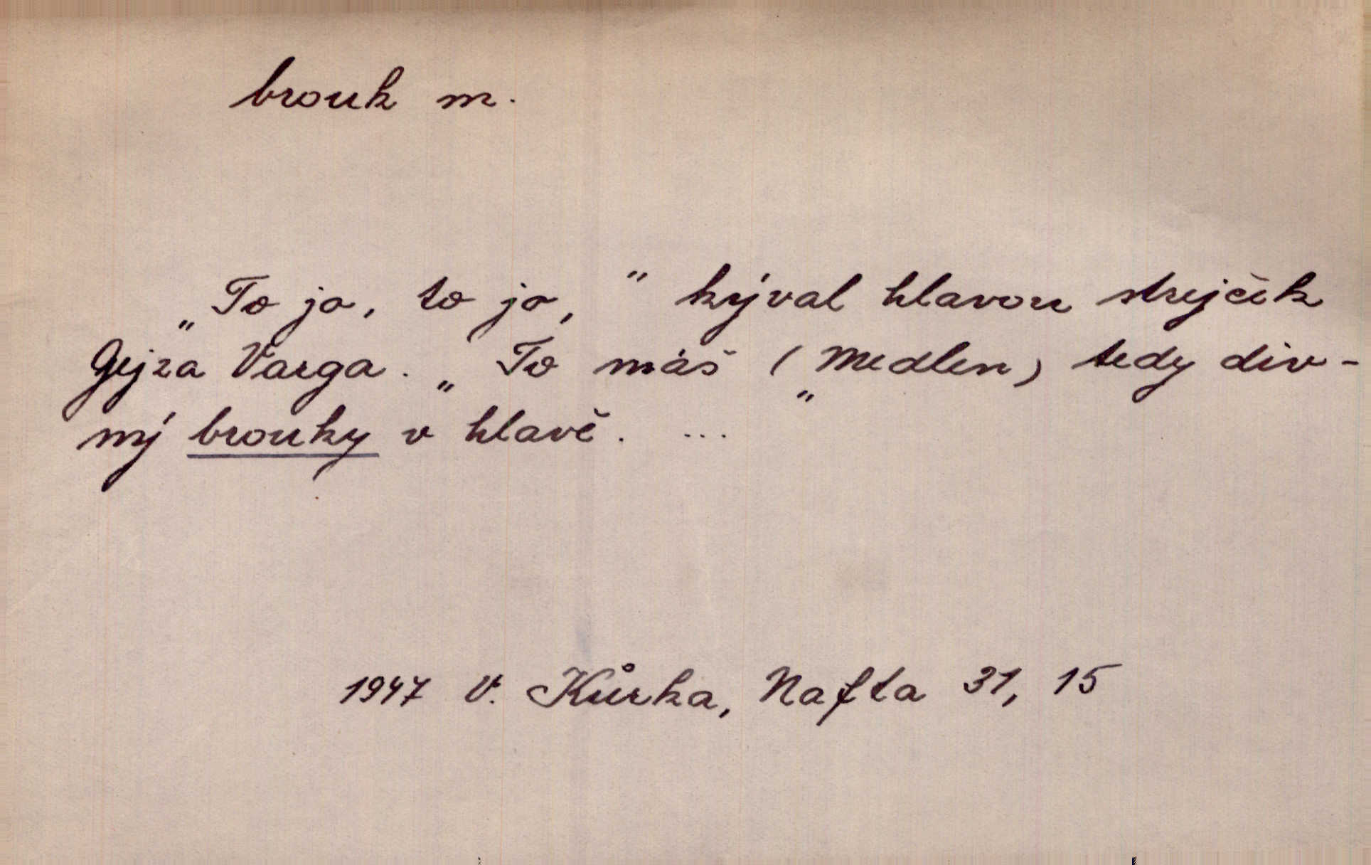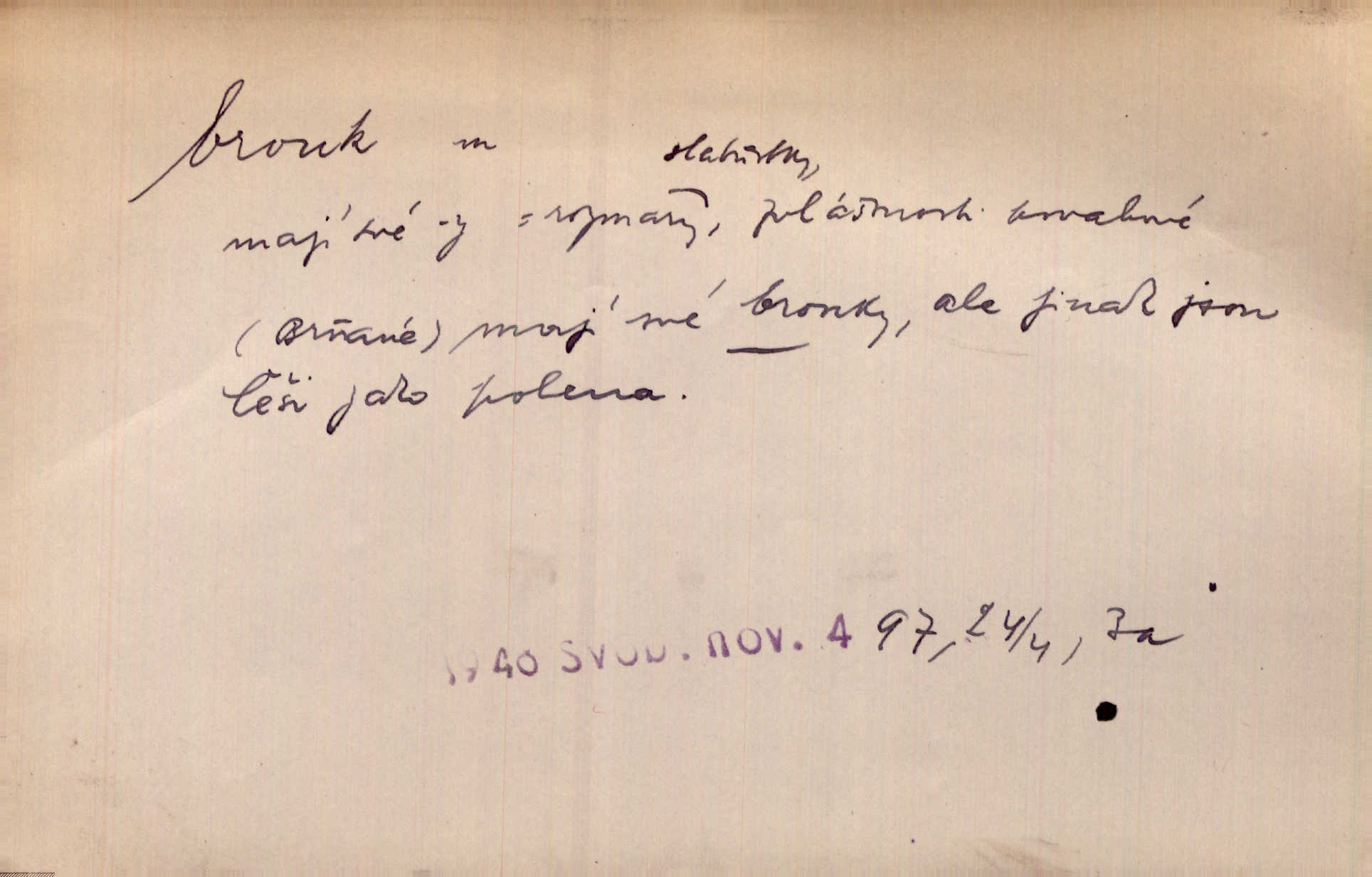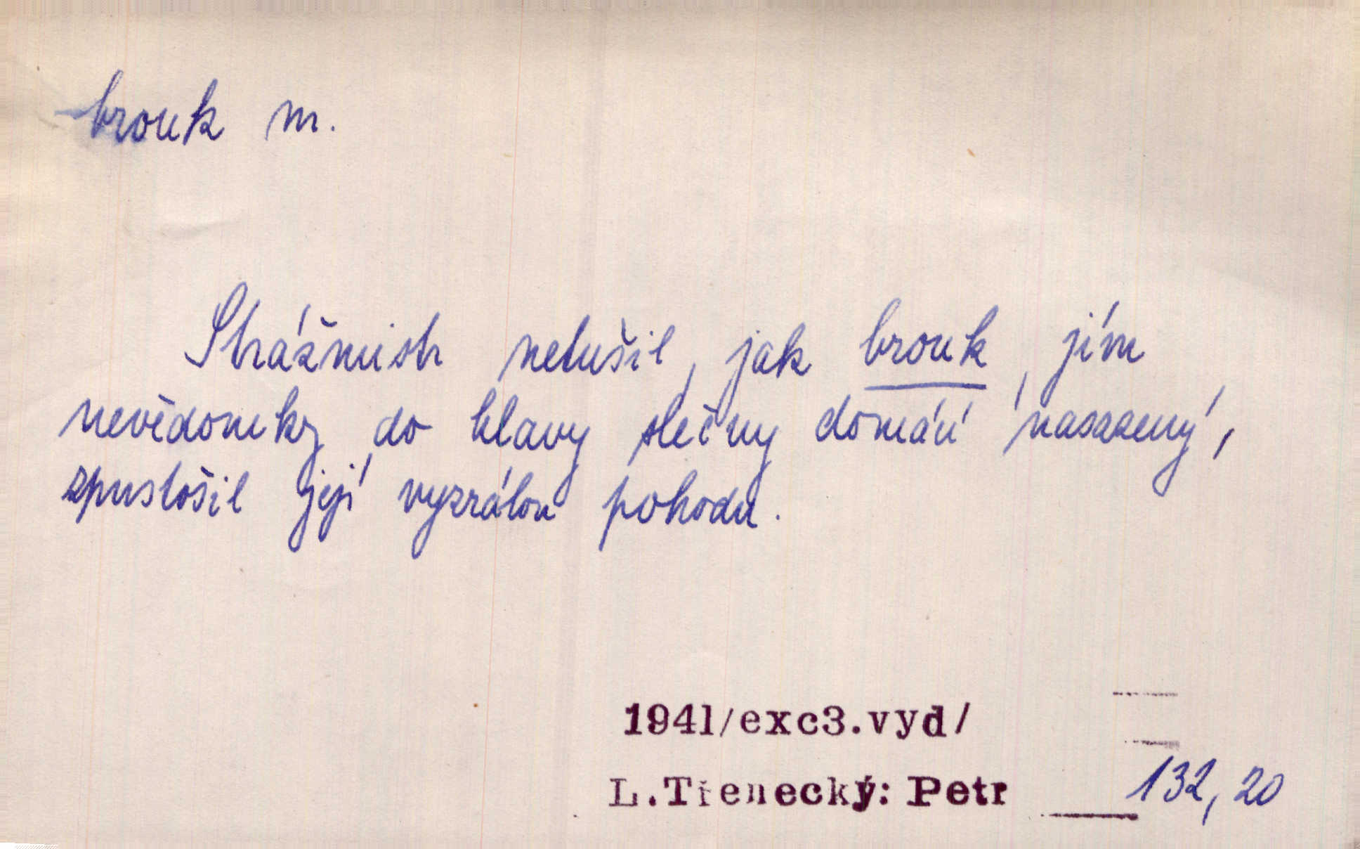 - brouk, -a m. zool. brouci řád hmyzu. Vulg. o vších. Nemáš-li brouky, tak lehni a kušuj! Čap. Ch. D bručoun, mrzout, pavouk, podivín. Ženské mají rády hodně řečí, veselé muže a ne brouky. Rais. Pan páter Šulc byl zvláštní brouk. Jir. D Hypok. dítě. „A co s vámi, brouci?“ ptá se Cimbura dětí. Baar. D přezdívka, nadávka. Nadávali mu Němců brouků. Pfleg. Slyšte, jak se tento černý brouk [theolog Jago] rouhá Pedrovi. Čap. Ch. D rozmar, vrtoch, mrzutá nálada. Jaký brouk ti najednou vlezl do hlavy? Jir. Vrtáci, podivínové, slaboši, kteří si nasadí do hlavy různé maroty a brouky. Šal. Mámy někdy mívají podivné brouky, víme? Nejde jim každý pod nos. Herrm. Zeptejte se raději psychiatra. Ti mají takové methody: vyhánějí brouky z hlavy. Vach.