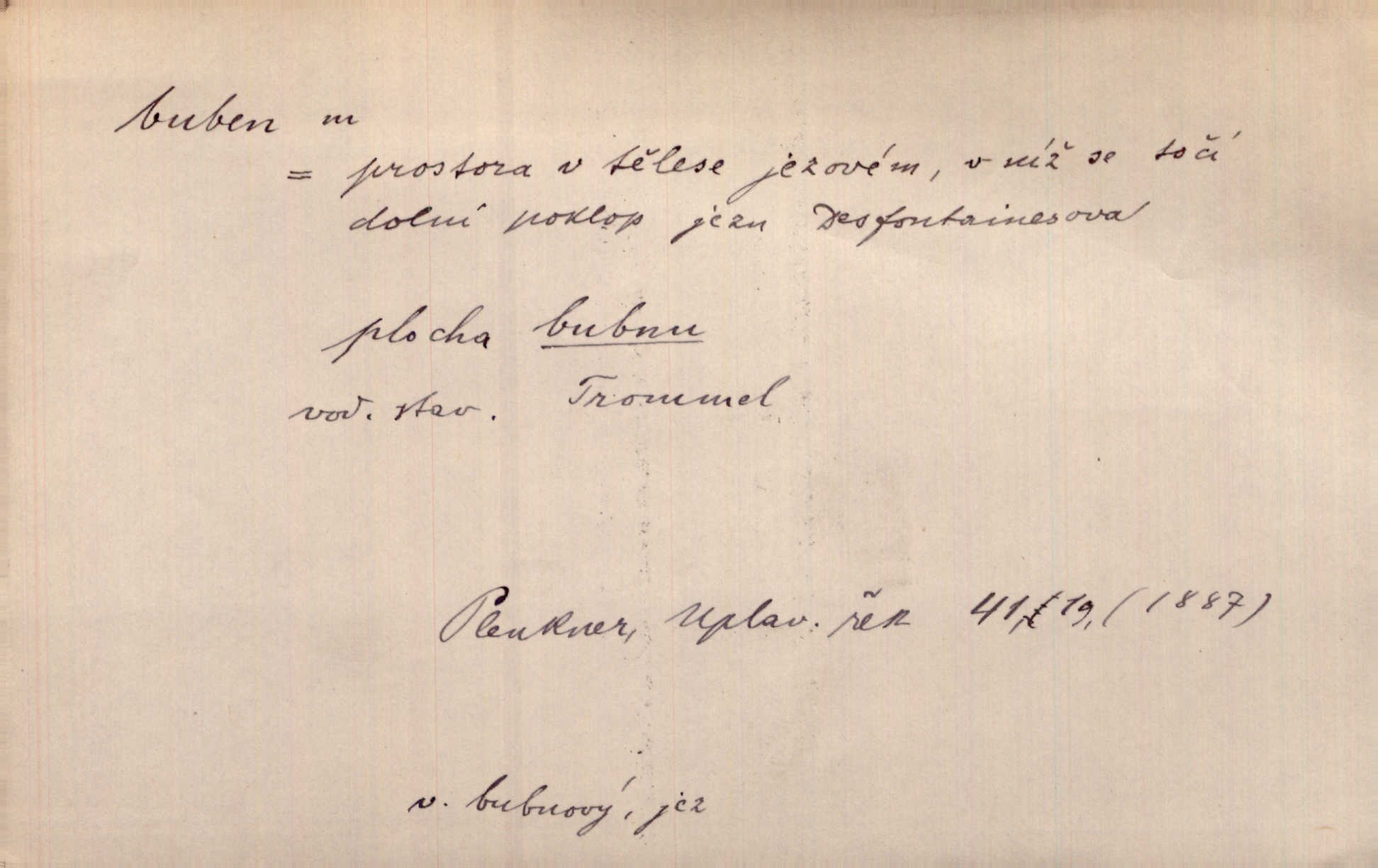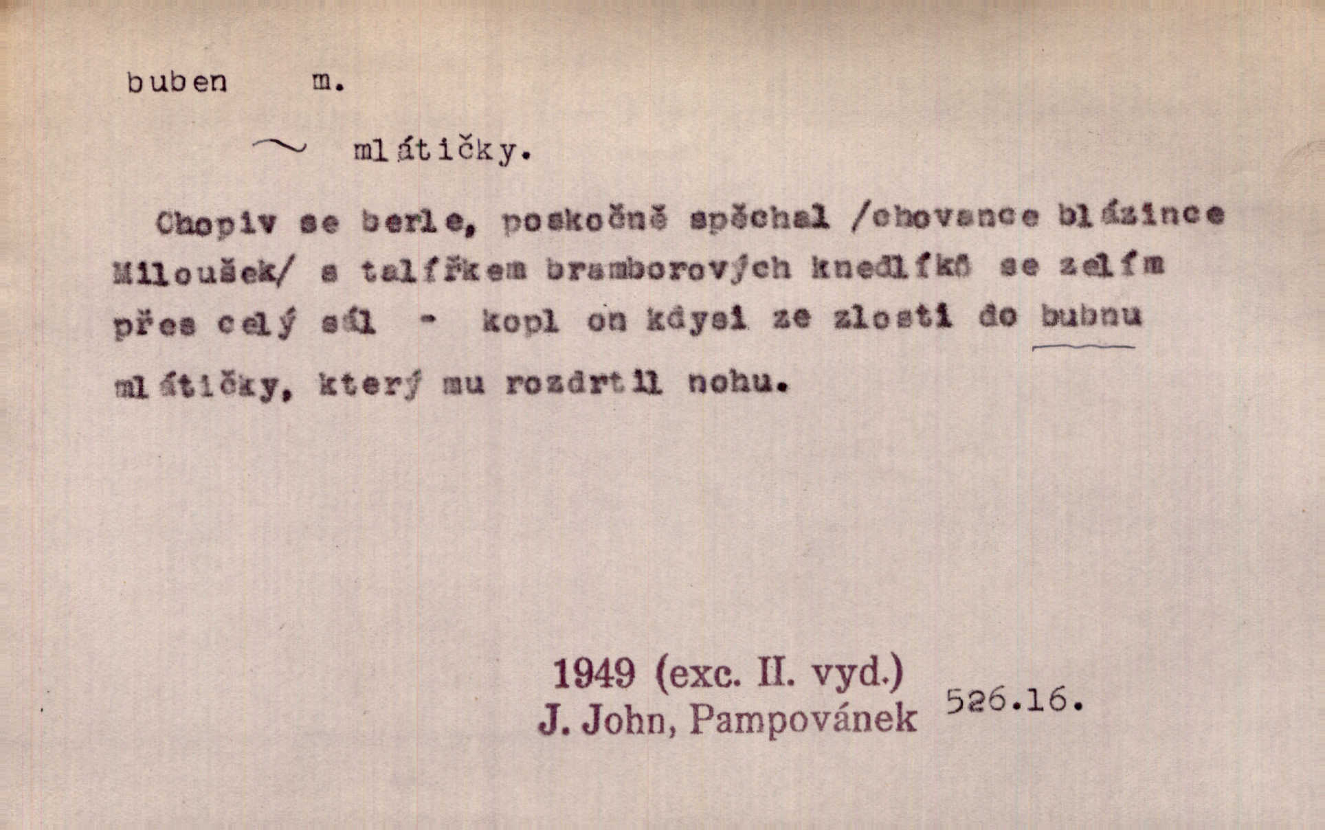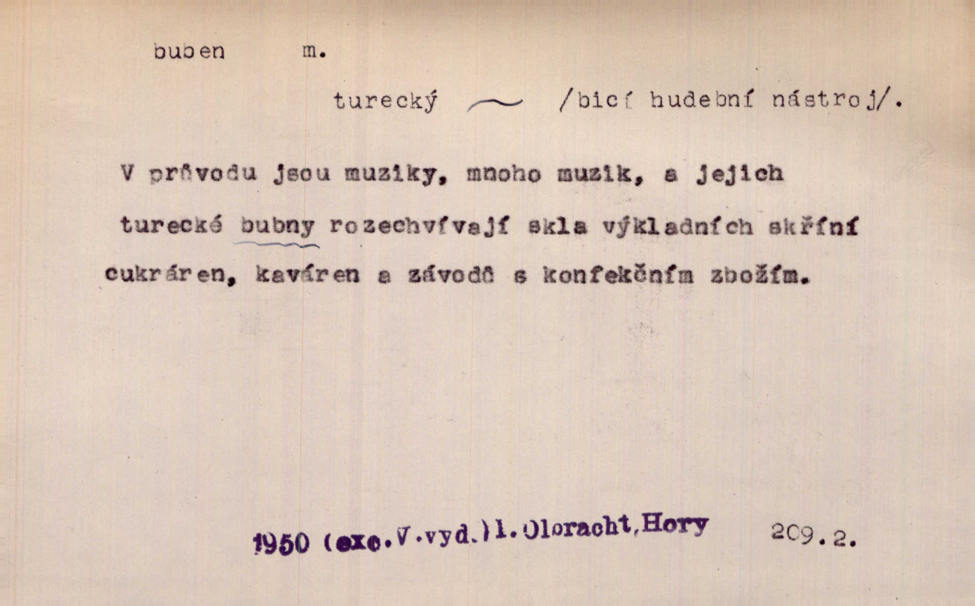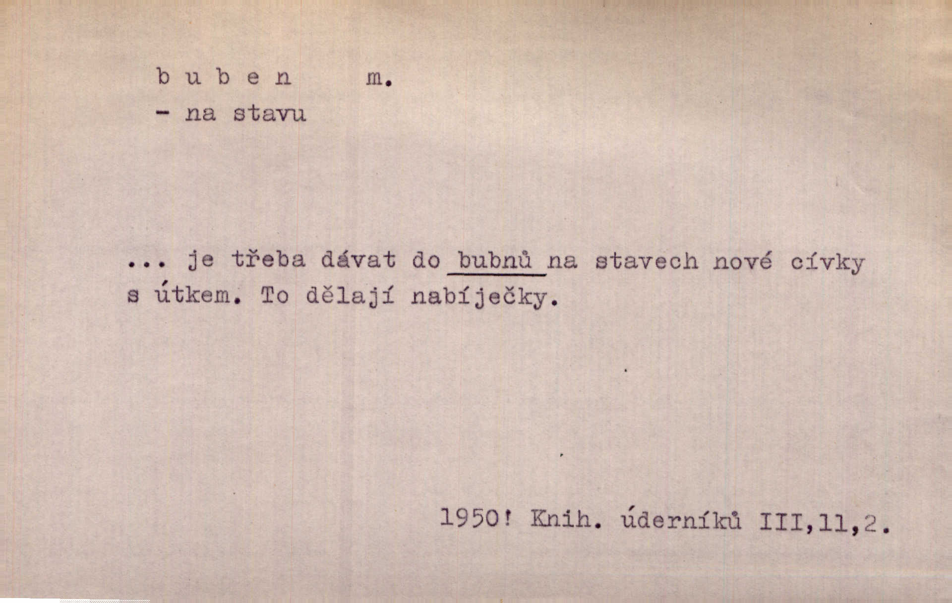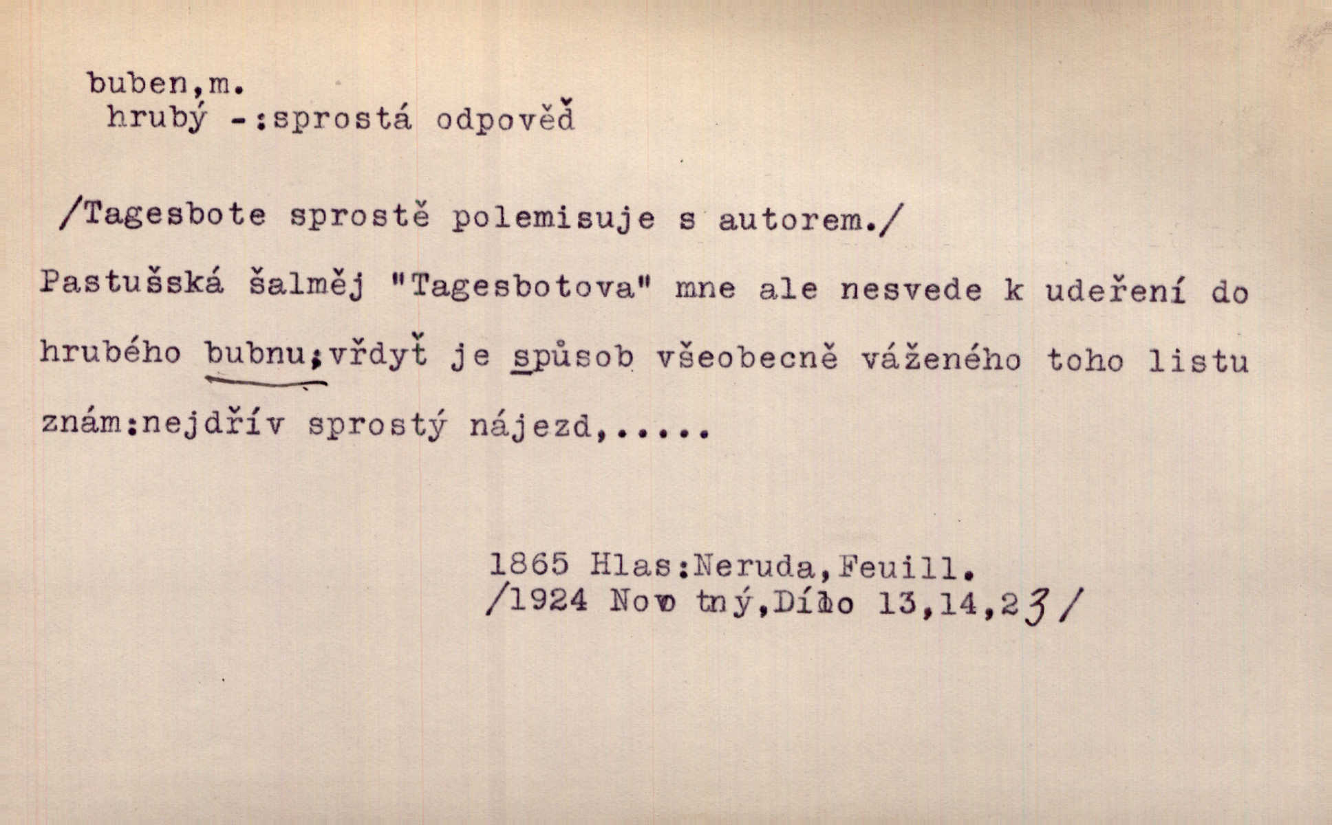 - buben, -bnu m. dutý válcovitý bicí nástroj hudební s napjatou koží na obou základnách. Bubny víří, rozléhá se píseň. Čech. Lid, jak známo, chodí na funusy, kde turecký jej buben očekává. Kam. Špáta do toho mlátil jako do bubnu, ale zajíčka netrefil zběsile na honě střílel. Rais. Ani letošní pytlák nepůjde s bubnem na zajíce, nato já, kozák starý. Šmil. Přen. jíti s bubnem na vrabce, ptáky, zajíce unáhliti se, polekati, vyplašiti koho. Že ale nikdy nechodil na vrabce s bubnem, neříkal ničehož, ani když milenci stanuli před ním. Hol. Když mu řekneš, že je to obchodní tajnost, nedá tě ve vsi na buben nerozhlásí to. Her. Myslil jsem, že překvapím celý zámek, a zatím jest to juž na bubně! Kosm. Po celé vesnici to šlo jak po bubnu. Rais. D o agitování, reklamě. Co světáctví a demokratství lživého, chvastavého tlouklo tu na svůj řvavý buben. Šlej. Řemeslnická prostřednost jde tu ruku v ruce se sterilní plochostí a s bubnem barnumské reklamy. Mach. Tlukouce na buben vlastenectví mrhají v nerovném proti nám boji zbytečně svými silami. Staš. D Přijíti na buben do dražby, na mizinu. Kdybych já to nyní drobet pohromadě nedržel, náš statek by přišel na buben. Staš. D rozličné nástroje a součásti nástrojů podobné bubnu. Vysypav první polovici kávy do bubnu, hotovil se k podpálení dřeva. Herrm. Otáčecí buben, čerpací buben. Hrotový buben u mlátičky ruční, buben lištový u mlátiček motorových a j. D Pl. bubny barva v něm. kartách, kule. Hráli v karty, na kterých pro samou špínu již ani hrubě vidět nebylo, co jsou bubny a co žaludy. Tyl.