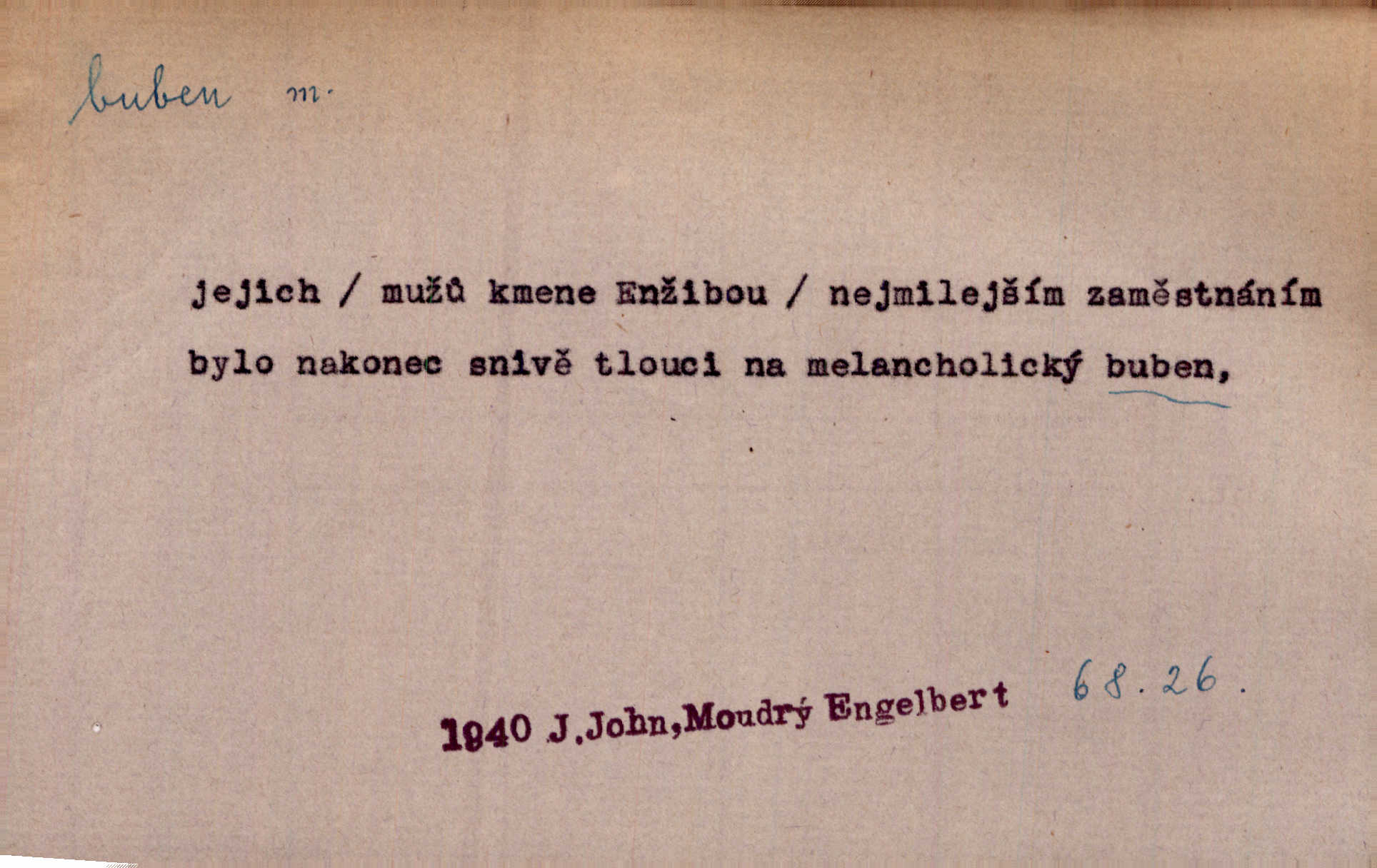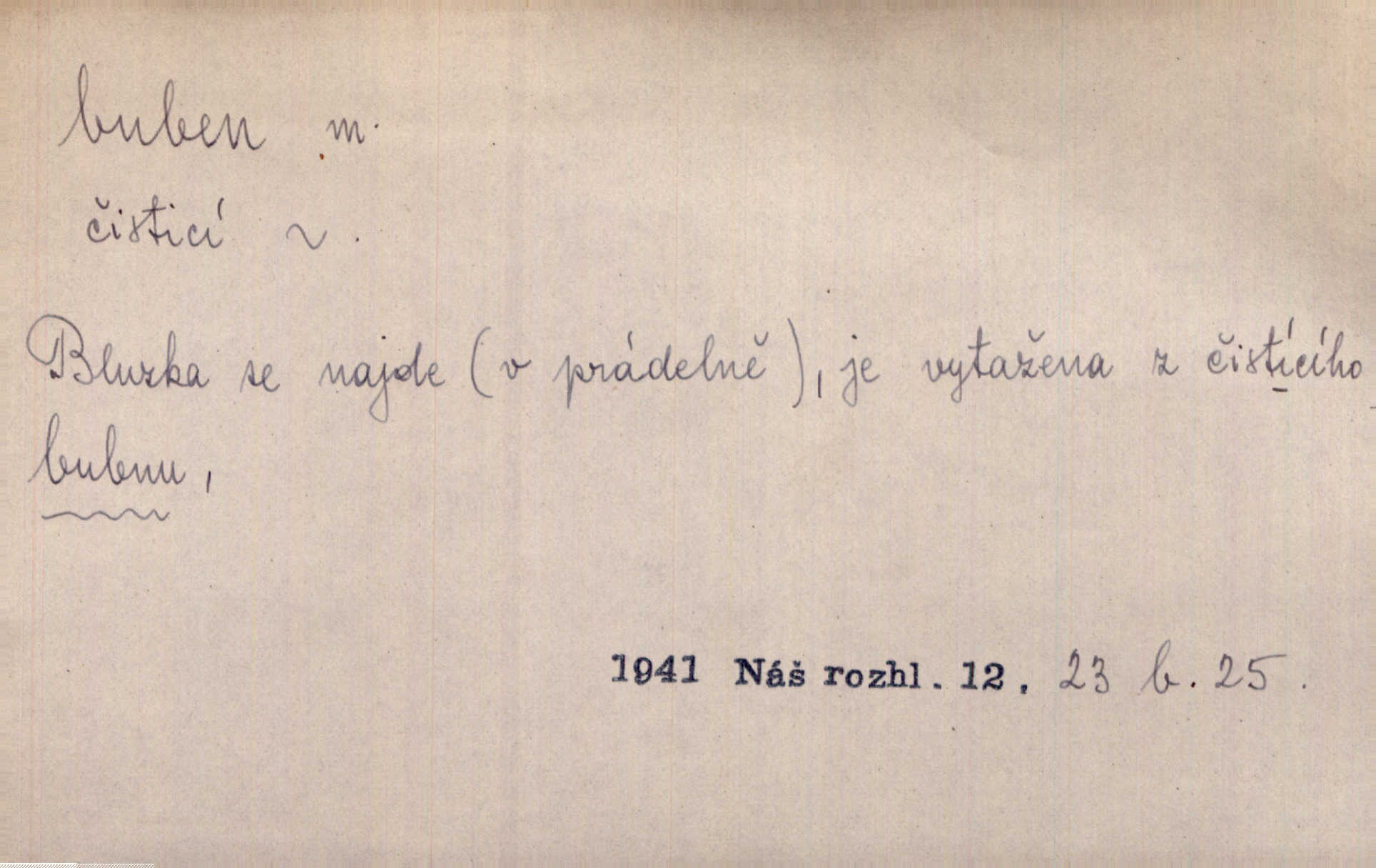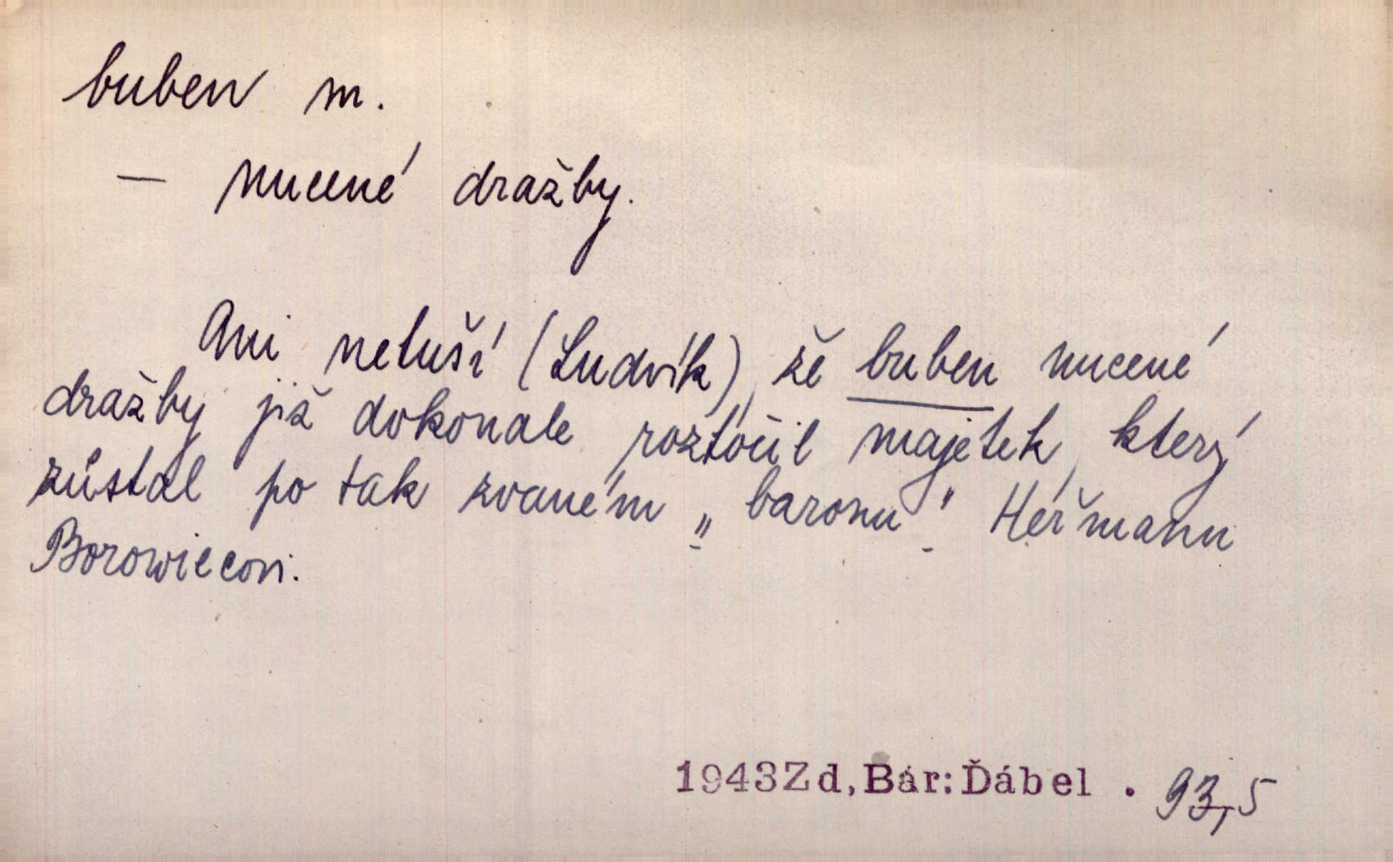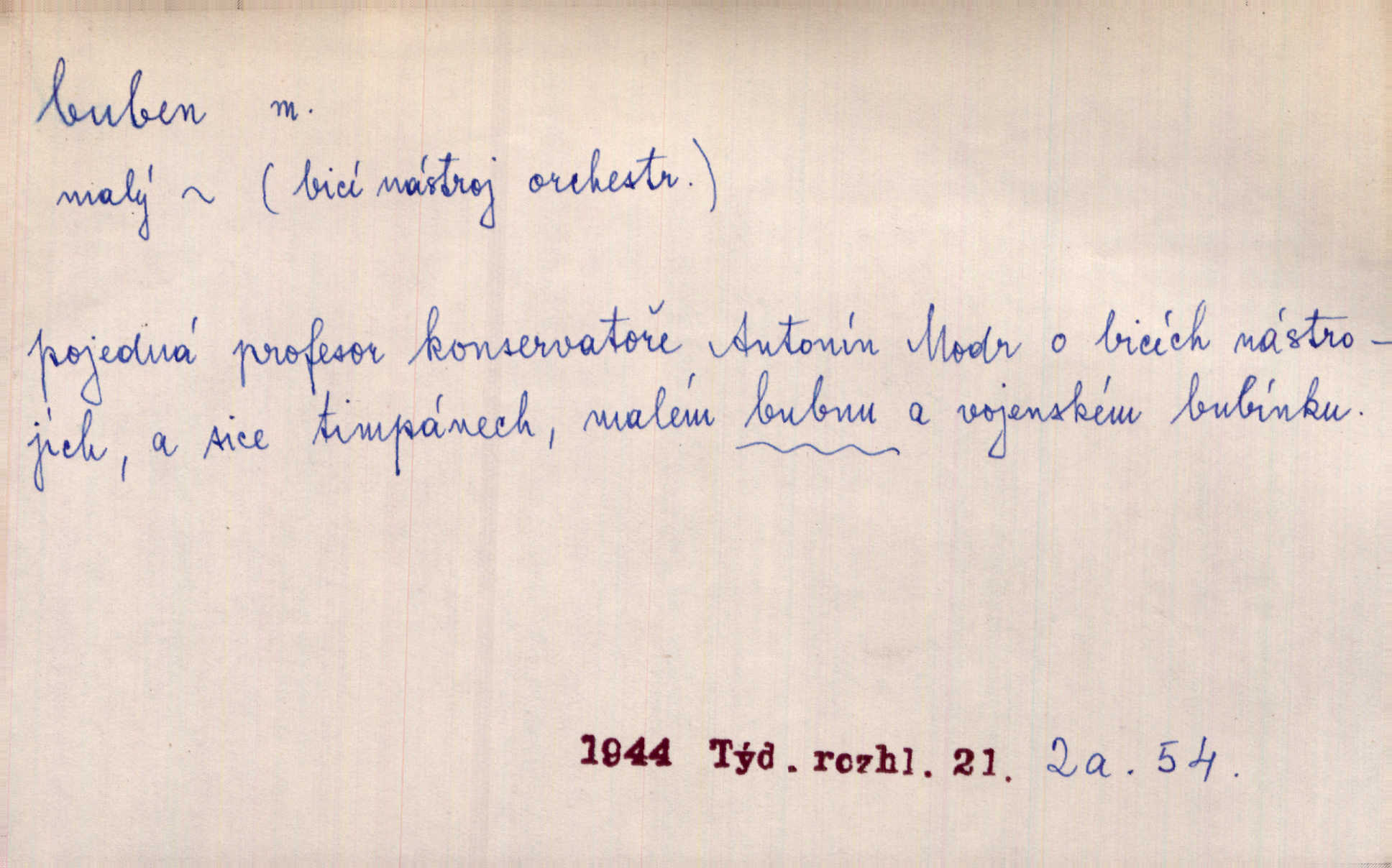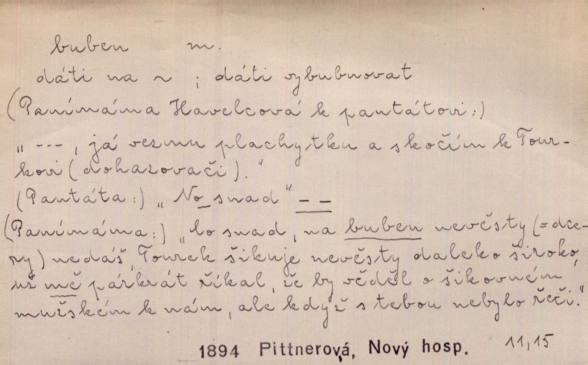- buben, -bnu m. dutý válcovitý bicí nástroj hudební s napjatou koží na obou základnách. Bubny víří, rozléhá se píseň. Čech. Lid, jak známo, chodí na funusy, kde turecký jej buben očekává. Kam. Špáta do toho mlátil jako do bubnu, ale zajíčka netrefil zběsile na honě střílel. Rais. Ani letošní pytlák nepůjde s bubnem na zajíce, nato já, kozák starý. Šmil. Přen. jíti s bubnem na vrabce, ptáky, zajíce unáhliti se, polekati, vyplašiti koho. Že ale nikdy nechodil na vrabce s bubnem, neříkal ničehož, ani když milenci stanuli před ním. Hol. Když mu řekneš, že je to obchodní tajnost, nedá tě ve vsi na buben nerozhlásí to. Her. Myslil jsem, že překvapím celý zámek, a zatím jest to juž na bubně! Kosm. Po celé vesnici to šlo jak po bubnu. Rais. D o agitování, reklamě. Co světáctví a demokratství lživého, chvastavého tlouklo tu na svůj řvavý buben. Šlej. Řemeslnická prostřednost jde tu ruku v ruce se sterilní plochostí a s bubnem barnumské reklamy. Mach. Tlukouce na buben vlastenectví mrhají v nerovném proti nám boji zbytečně svými silami. Staš. D Přijíti na buben do dražby, na mizinu. Kdybych já to nyní drobet pohromadě nedržel, náš statek by přišel na buben. Staš. D rozličné nástroje a součásti nástrojů podobné bubnu. Vysypav první polovici kávy do bubnu, hotovil se k podpálení dřeva. Herrm. Otáčecí buben, čerpací buben. Hrotový buben u mlátičky ruční, buben lištový u mlátiček motorových a j. D Pl. bubny barva v něm. kartách, kule. Hráli v karty, na kterých pro samou špínu již ani hrubě vidět nebylo, co jsou bubny a co žaludy. Tyl.
