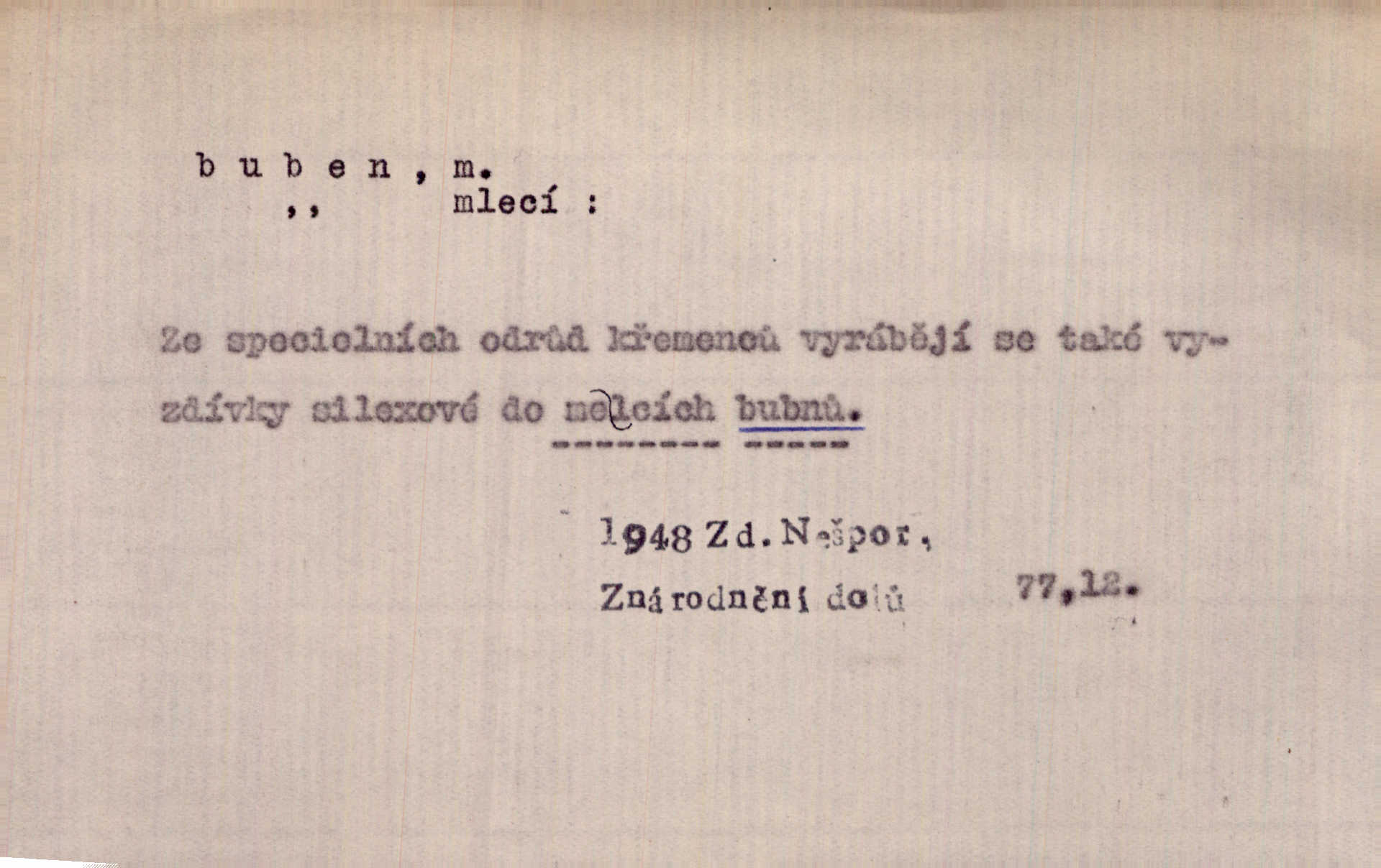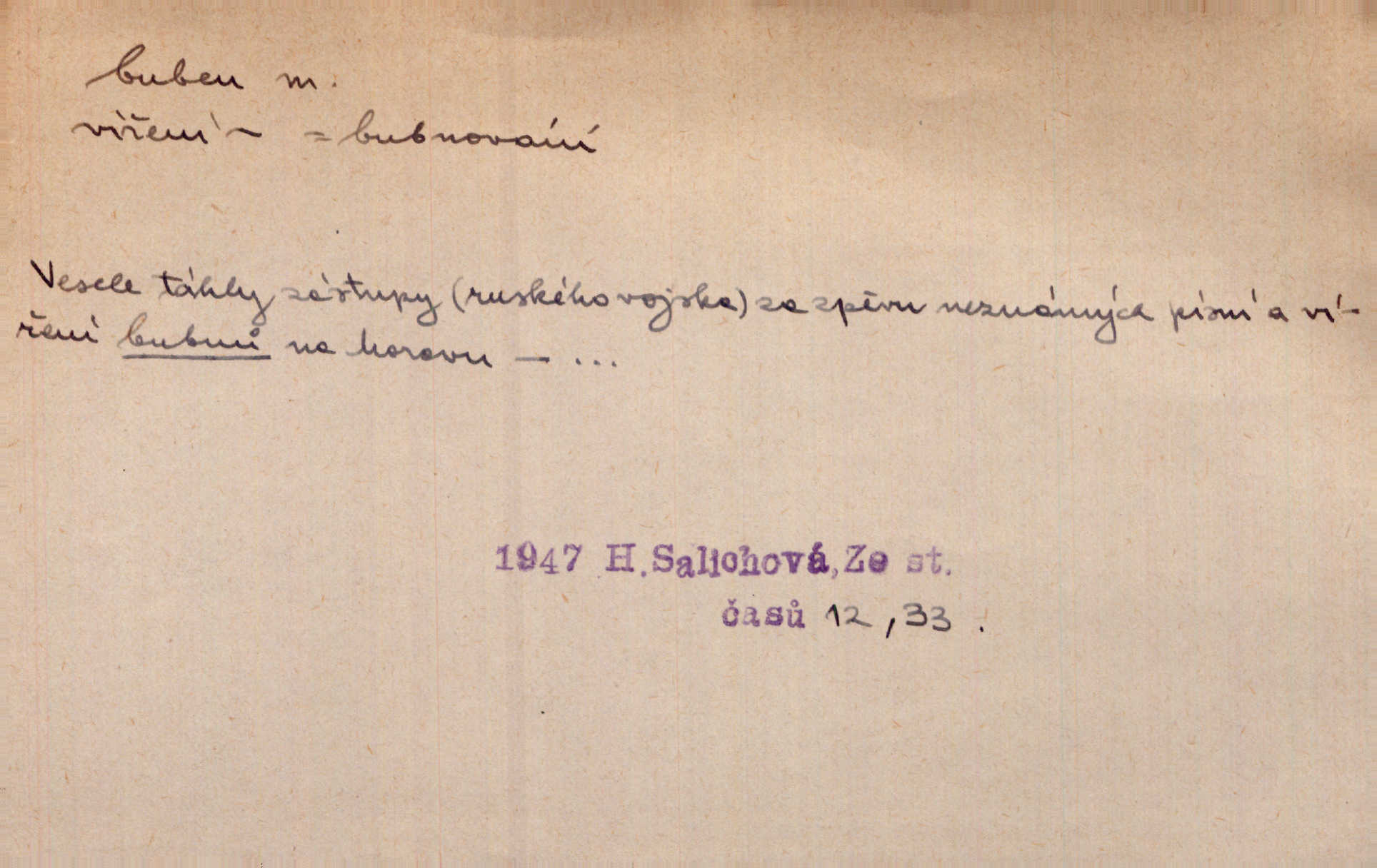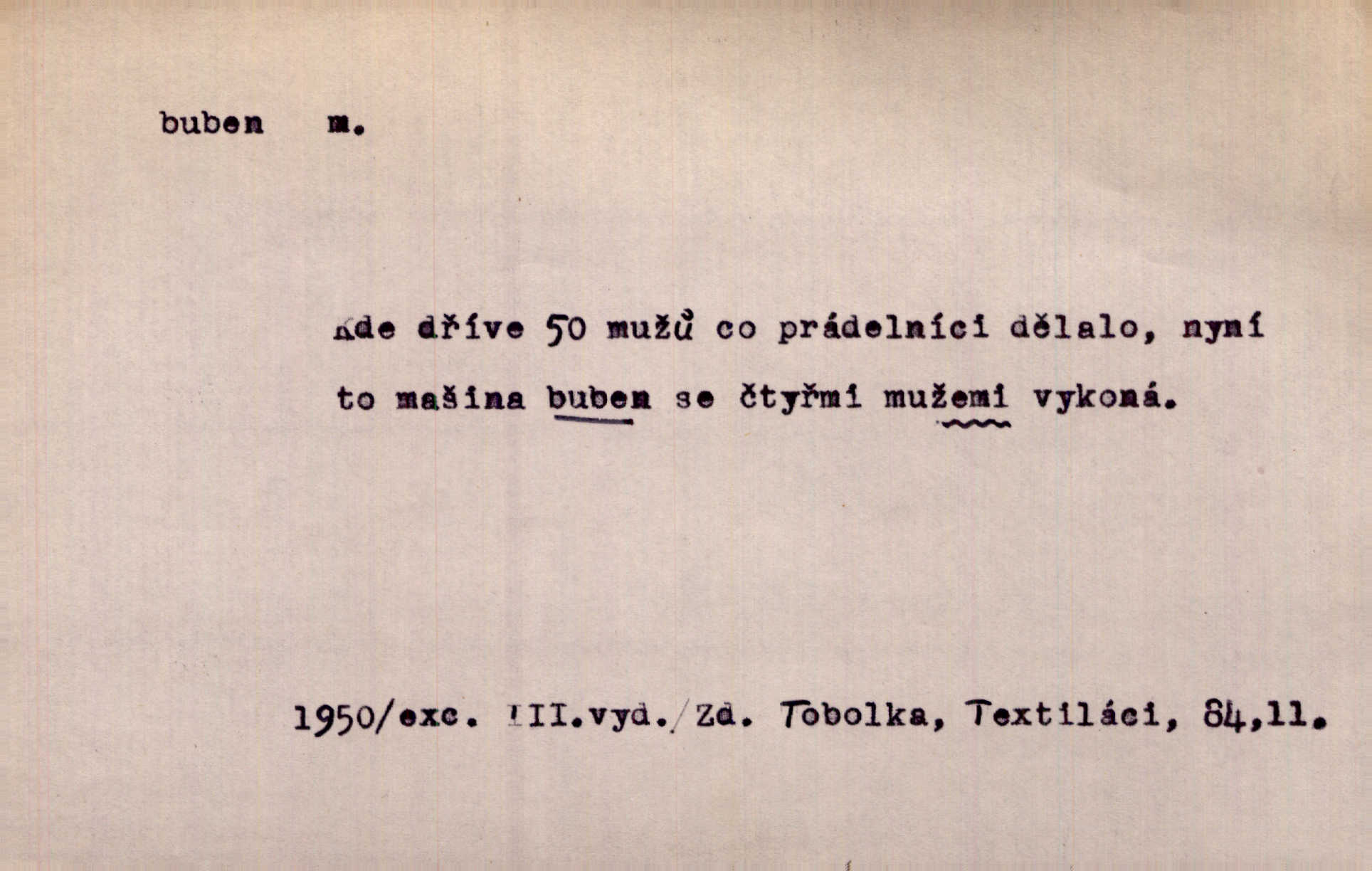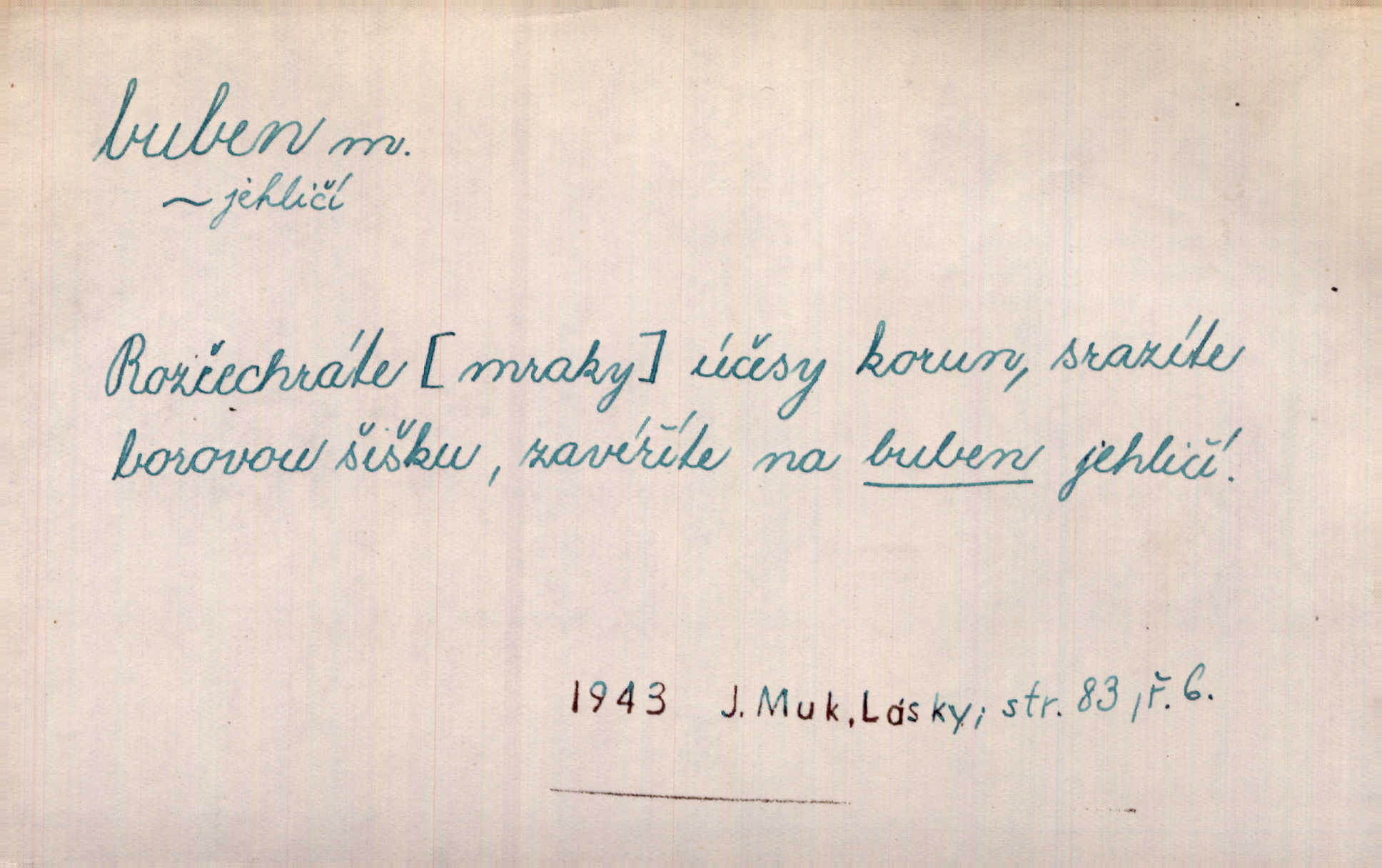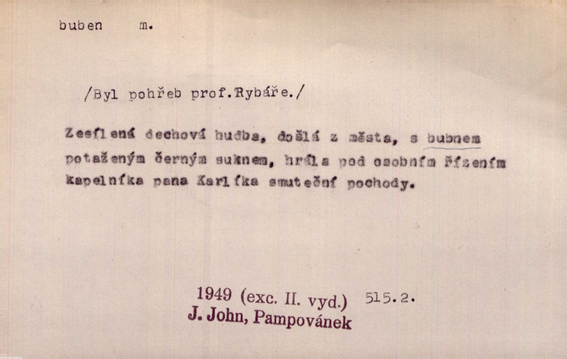 - buben, -bnu m. dutý válcovitý bicí nástroj hudební s napjatou koží na obou základnách. Bubny víří, rozléhá se píseň. Čech. Lid, jak známo, chodí na funusy, kde turecký jej buben očekává. Kam. Špáta do toho mlátil jako do bubnu, ale zajíčka netrefil zběsile na honě střílel. Rais. Ani letošní pytlák nepůjde s bubnem na zajíce, nato já, kozák starý. Šmil. Přen. jíti s bubnem na vrabce, ptáky, zajíce unáhliti se, polekati, vyplašiti koho. Že ale nikdy nechodil na vrabce s bubnem, neříkal ničehož, ani když milenci stanuli před ním. Hol. Když mu řekneš, že je to obchodní tajnost, nedá tě ve vsi na buben nerozhlásí to. Her. Myslil jsem, že překvapím celý zámek, a zatím jest to juž na bubně! Kosm. Po celé vesnici to šlo jak po bubnu. Rais. D o agitování, reklamě. Co světáctví a demokratství lživého, chvastavého tlouklo tu na svůj řvavý buben. Šlej. Řemeslnická prostřednost jde tu ruku v ruce se sterilní plochostí a s bubnem barnumské reklamy. Mach. Tlukouce na buben vlastenectví mrhají v nerovném proti nám boji zbytečně svými silami. Staš. D Přijíti na buben do dražby, na mizinu. Kdybych já to nyní drobet pohromadě nedržel, náš statek by přišel na buben. Staš. D rozličné nástroje a součásti nástrojů podobné bubnu. Vysypav první polovici kávy do bubnu, hotovil se k podpálení dřeva. Herrm. Otáčecí buben, čerpací buben. Hrotový buben u mlátičky ruční, buben lištový u mlátiček motorových a j. D Pl. bubny barva v něm. kartách, kule. Hráli v karty, na kterých pro samou špínu již ani hrubě vidět nebylo, co jsou bubny a co žaludy. Tyl.