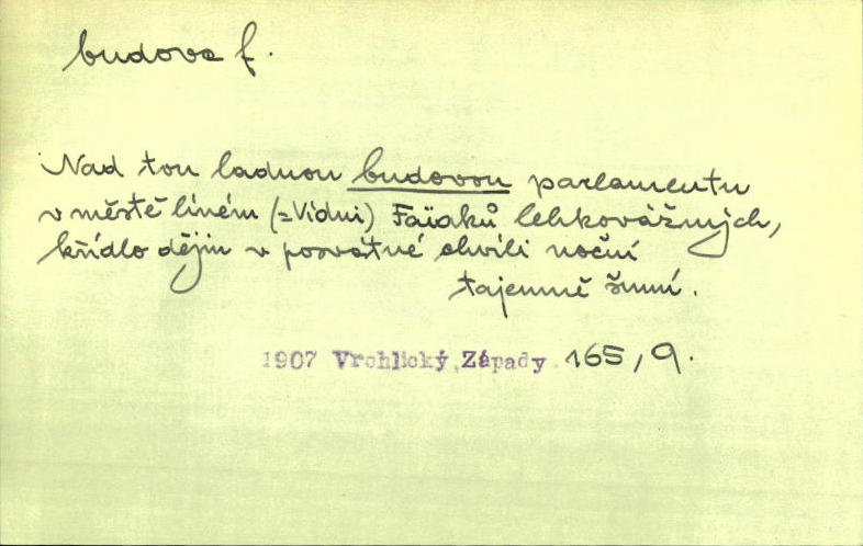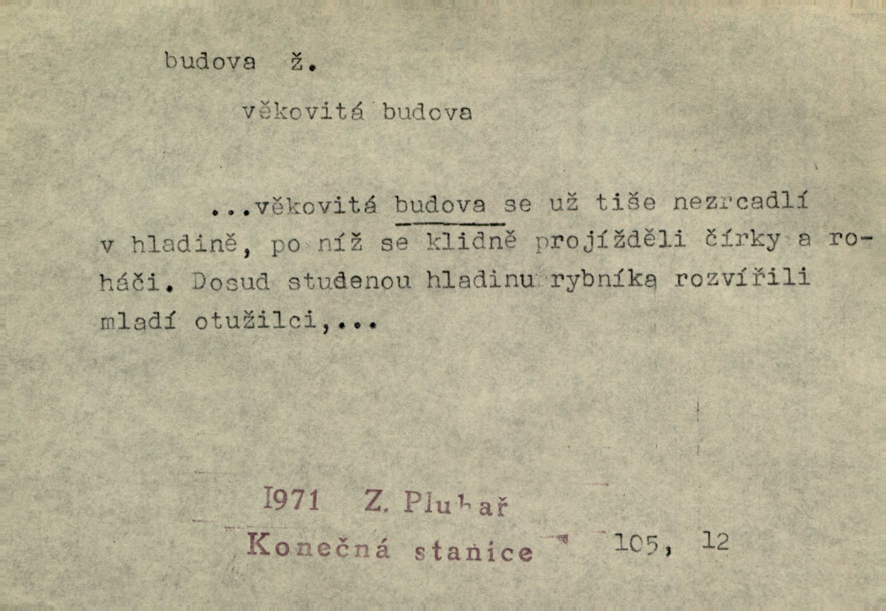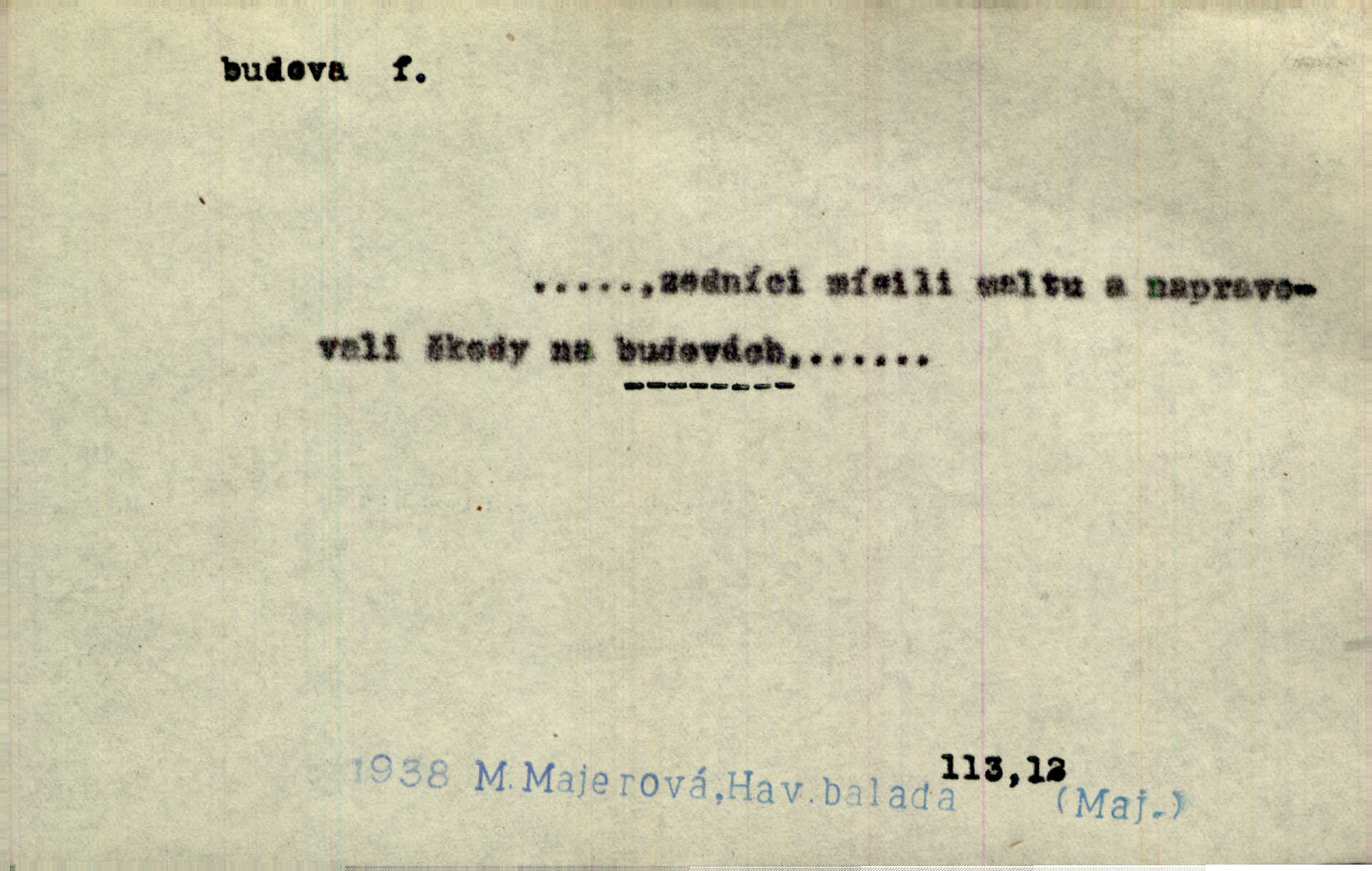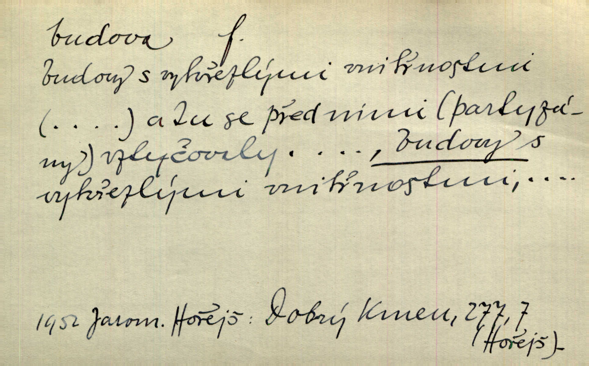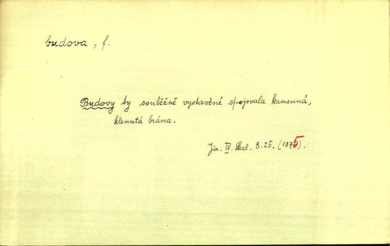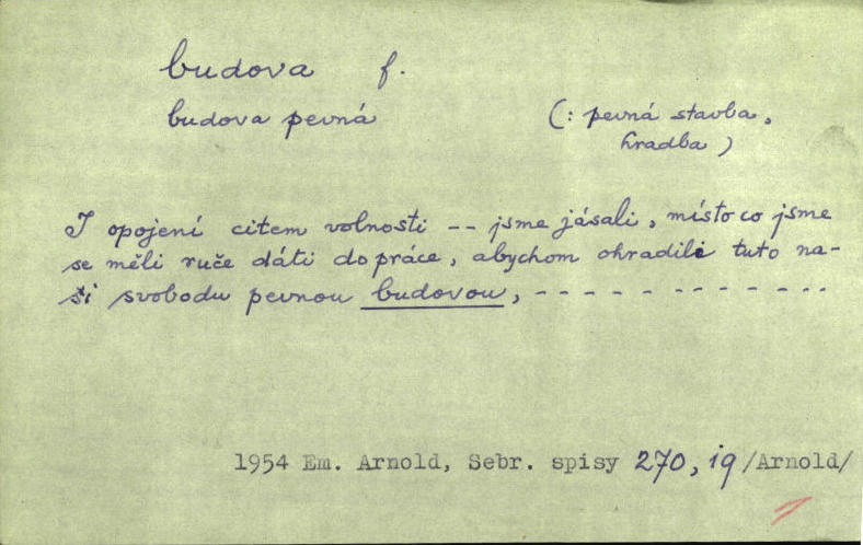 - budova, -y f. dům, stavba, stavení. Budovy rozlehlé, obrovské v tiché se náměstí spjaly. Ner. Přen. o soustavě jako výsledku práce, přemýšlení, organisace. Vítr se opřel o budovu jeho plánů, ale neskácel ji. Dyk. Vinou vaší se sesuje pyšná budova blahých mých snů. Bozd. Poruší se tím základy, na nichž budova státní spočívá. Rez.