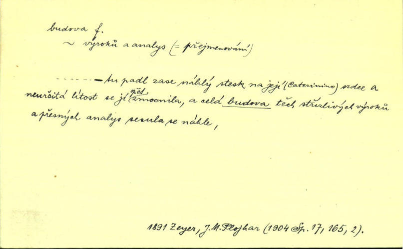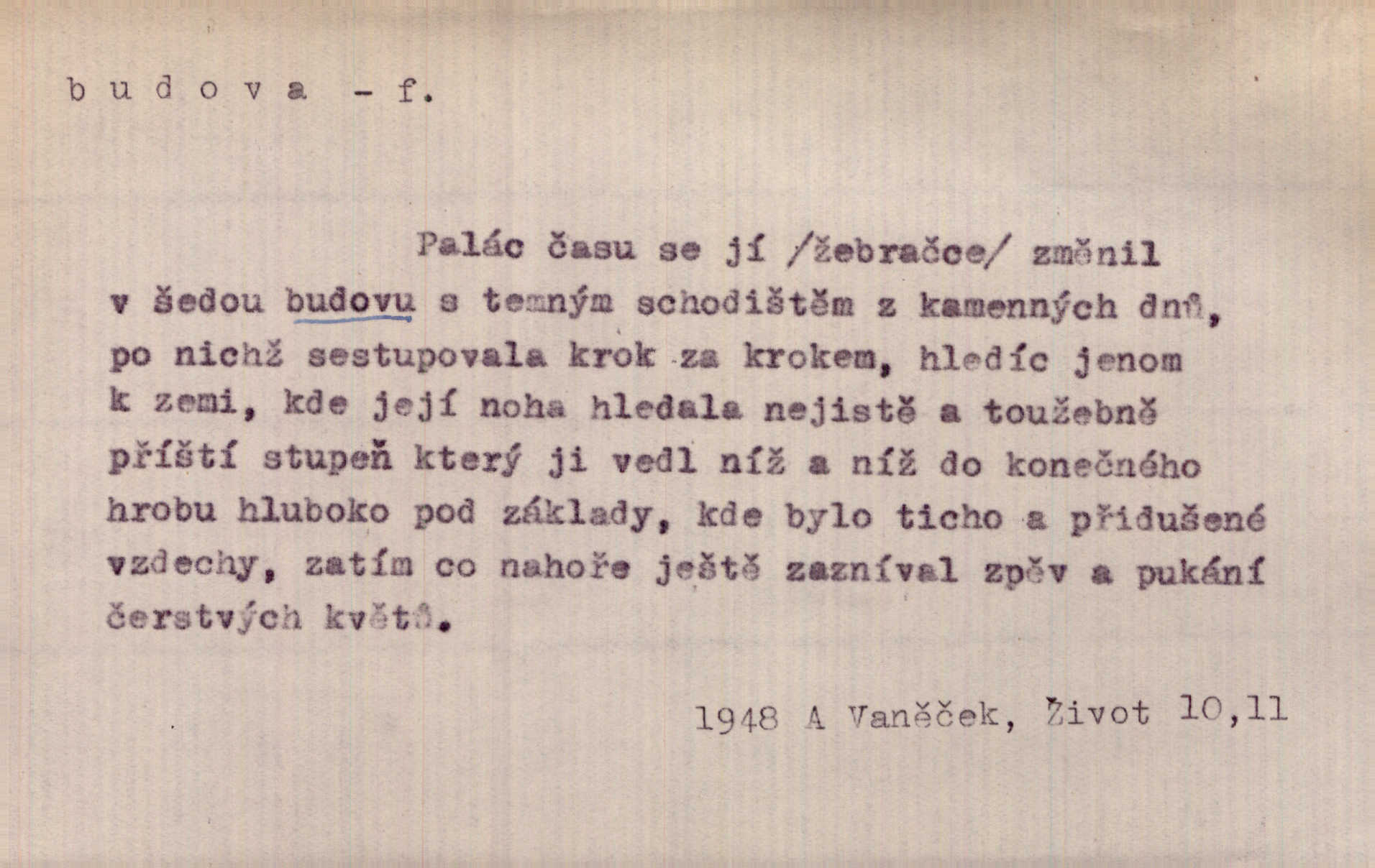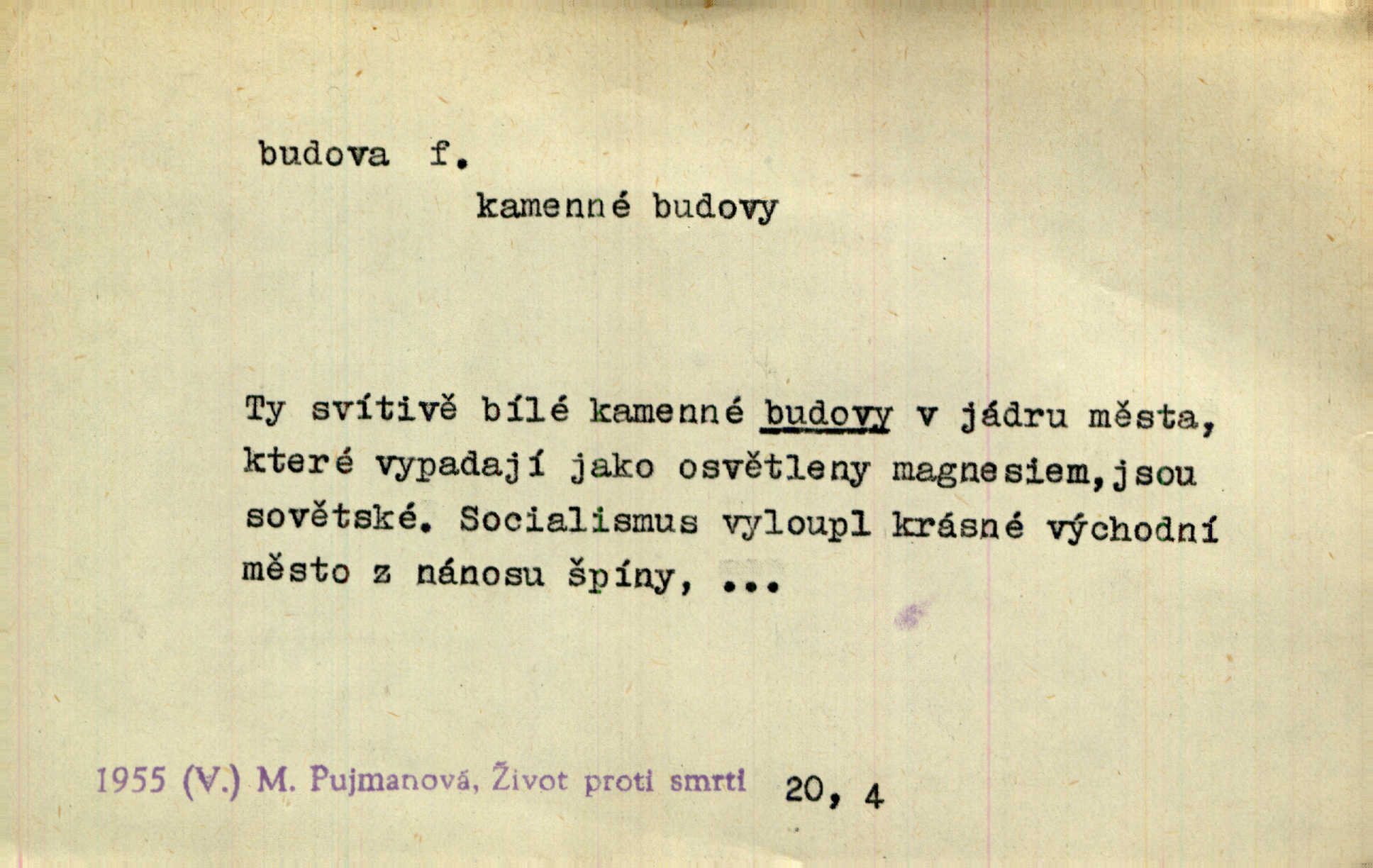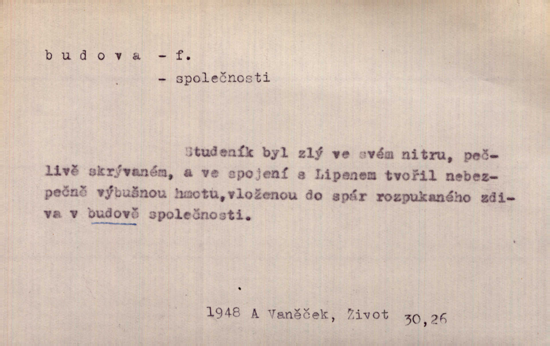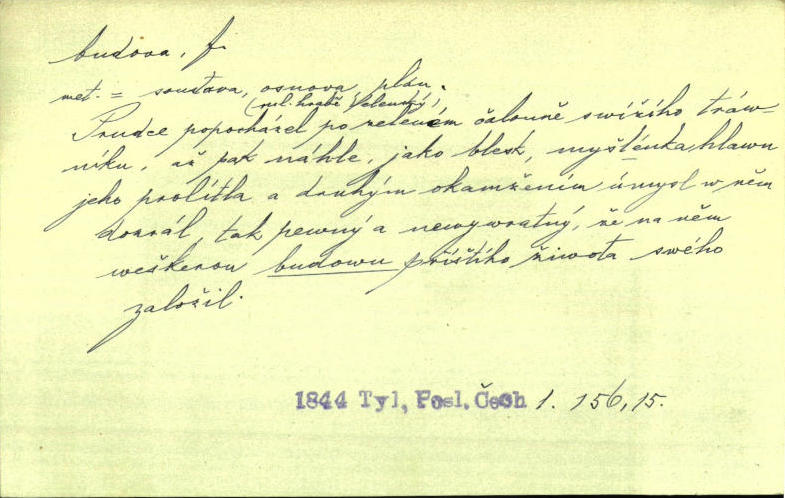 - budova, -y f. dům, stavba, stavení. Budovy rozlehlé, obrovské v tiché se náměstí spjaly. Ner. Přen. o soustavě jako výsledku práce, přemýšlení, organisace. Vítr se opřel o budovu jeho plánů, ale neskácel ji. Dyk. Vinou vaší se sesuje pyšná budova blahých mých snů. Bozd. Poruší se tím základy, na nichž budova státní spočívá. Rez.