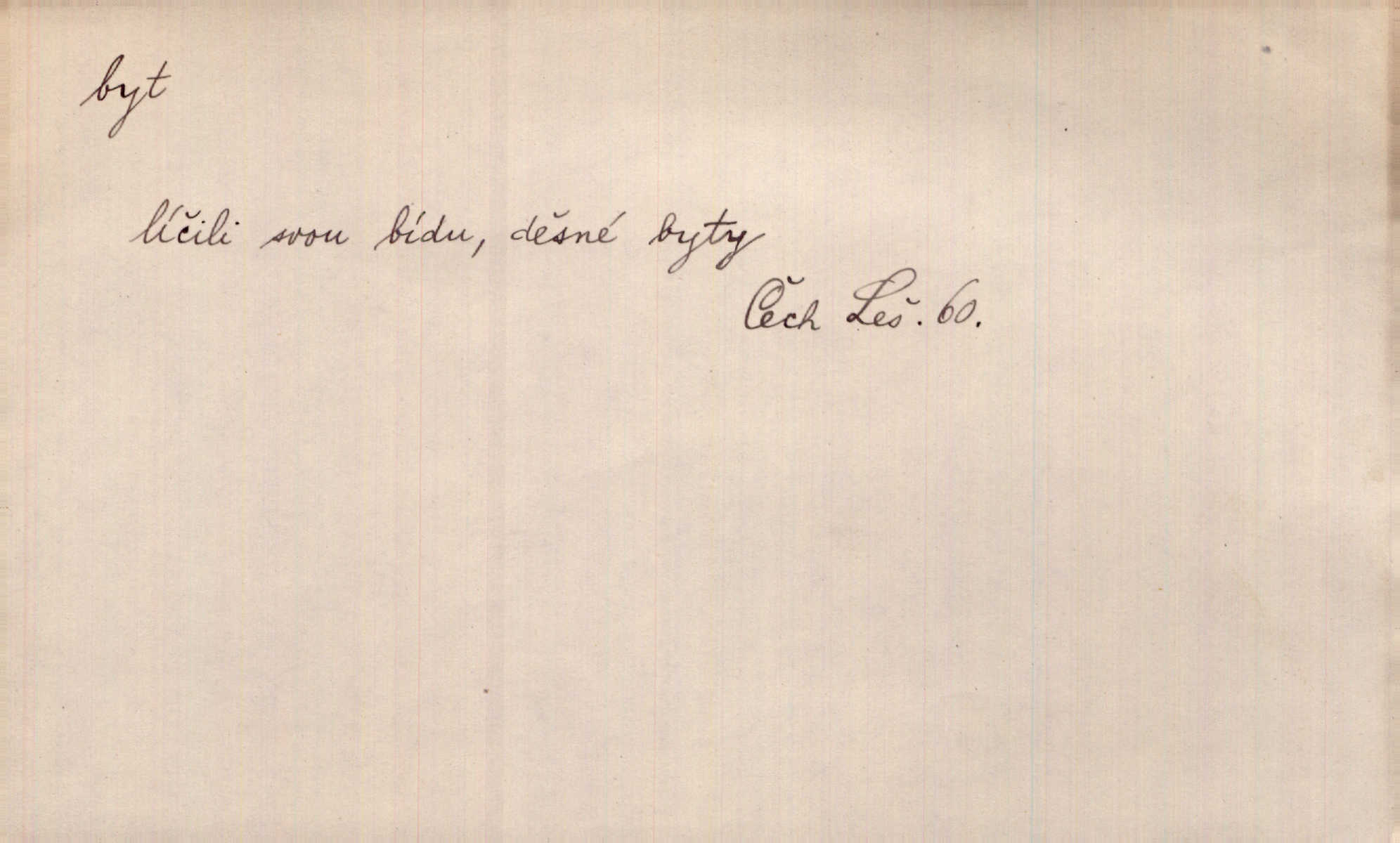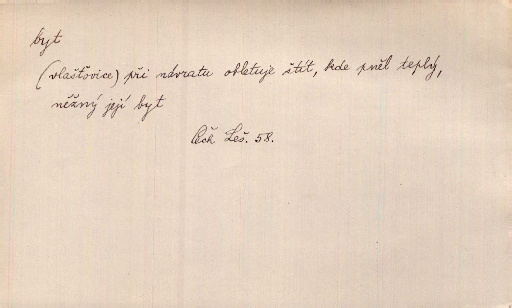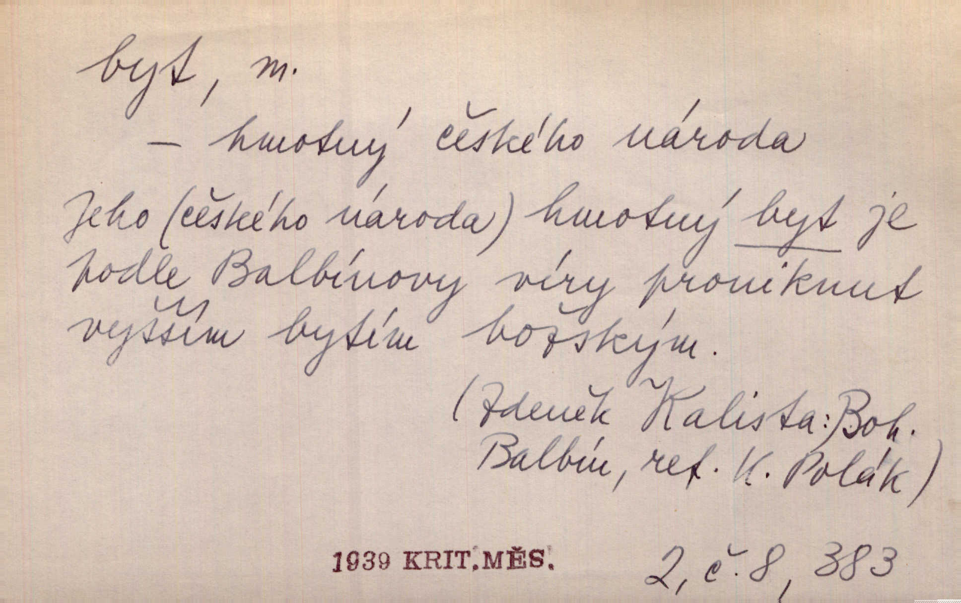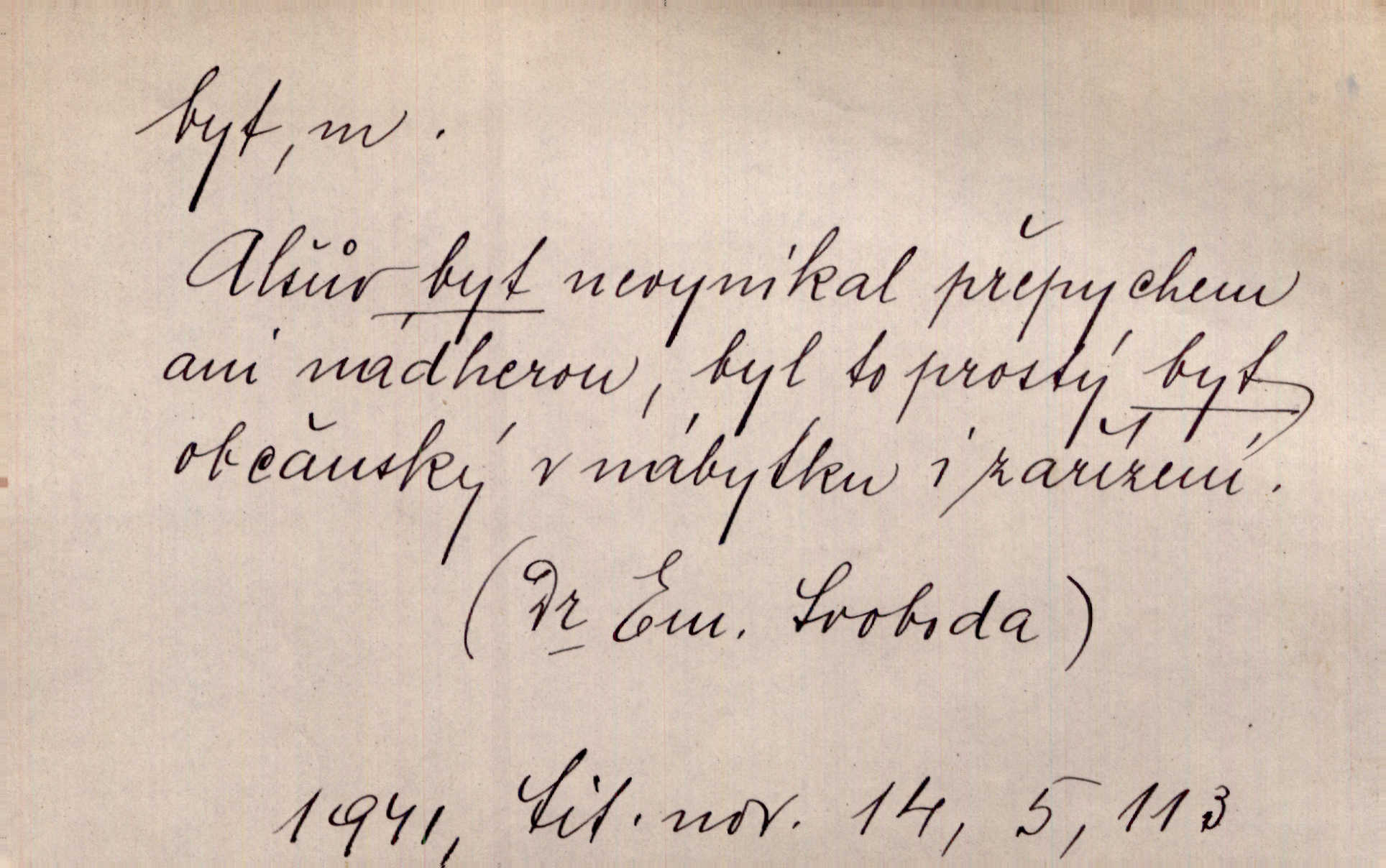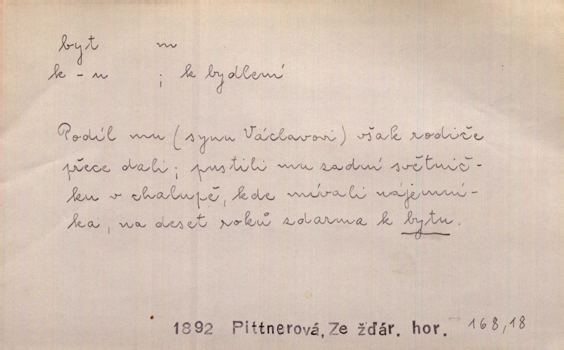 - byt, -u m. soubor místností k bydlení, příbytek, obydlí, bydliště. Jenom se přestěhuješ do prvního patra naproti, viděla jsem tam vyvěšený byt. Čap. Ch. Platiti za byt a stravu bydlení. Letní byt. Býti, dlíti bytem přebývati. Zdali zde cizí umělkyně bytem jsou? Tyl. S počátku Dobroš nebyl bytem u paní Kopecké, neznal jí. Prav. Jen ctnost a dobro může dlíti bytem v tom zjevu andělském. Čech. A přece vím, že blízko jiná, lepší zem, kde jiný, lepší život, kde je rozkoš bytem. Leg. D bytí, život, existence. Vůbec každý byt končívá se jen tím, že přechází do bytu a celku jiného. Pal. Chtěl jsem poznat přání i hospodářské podmínky bytu sedlákova. Pek. Vyjíti od líčení hmotného a společenského prostředí a bytu, z něhož umělec vzešel. Šal. Když se konečně dodělal lepšího bytu, stav se magistrátním sekretářem, zemřel záhy v mužném věku. Jir.