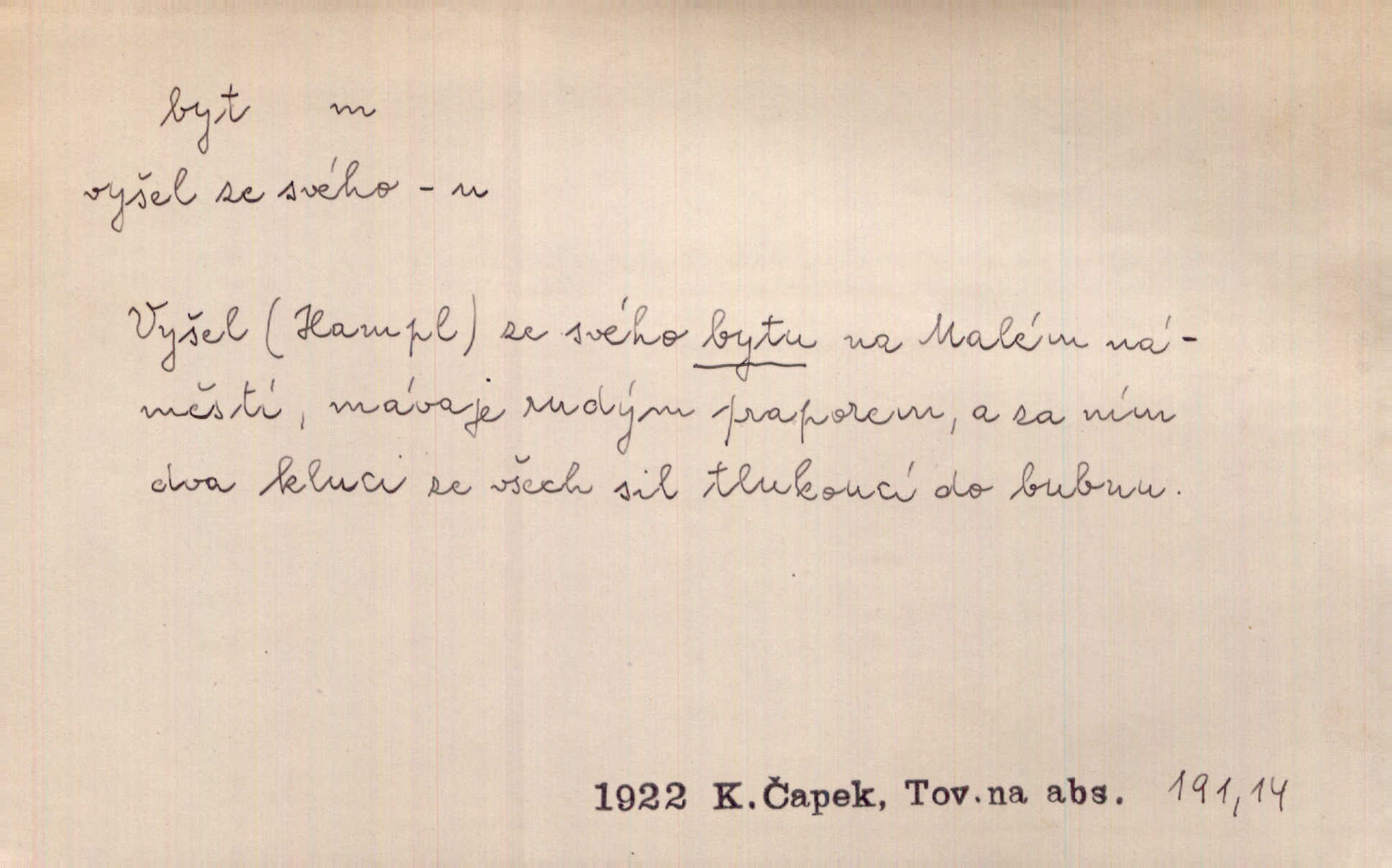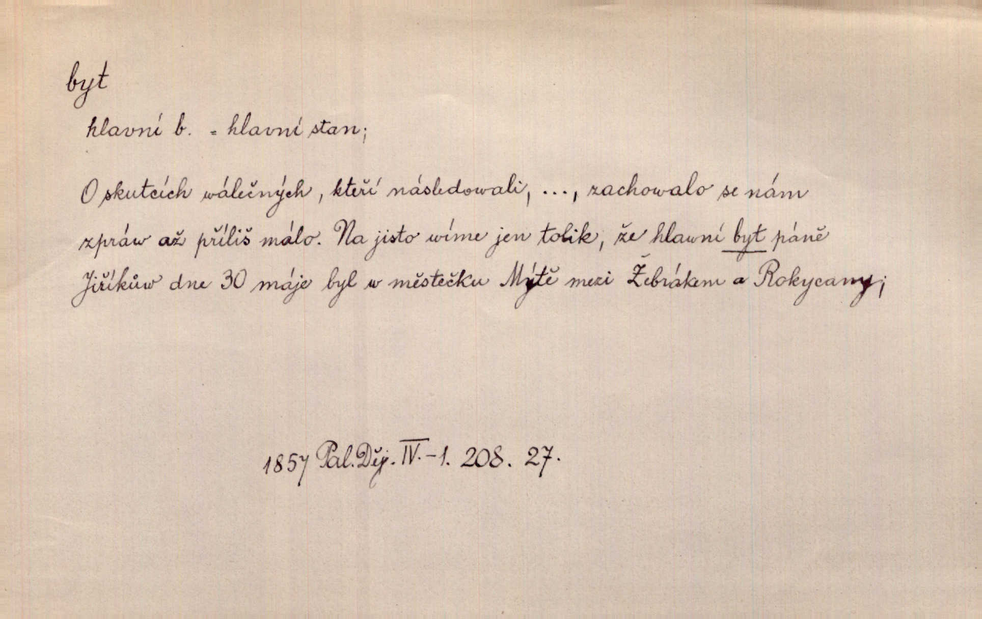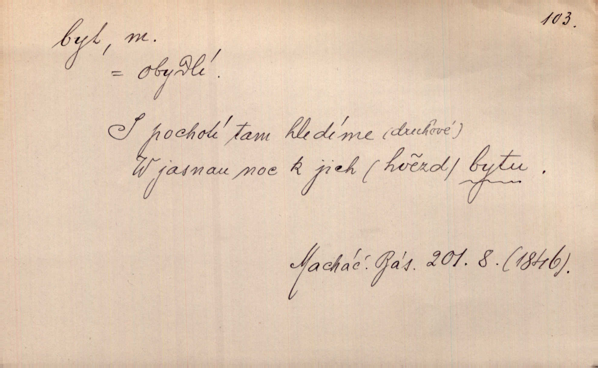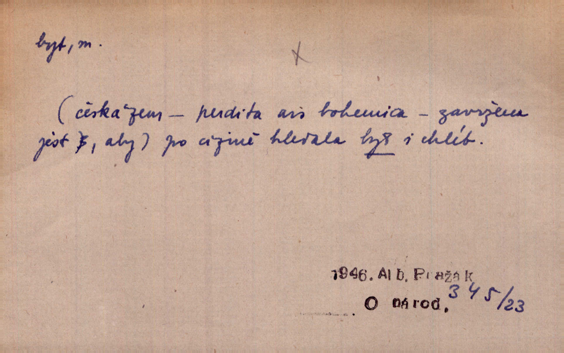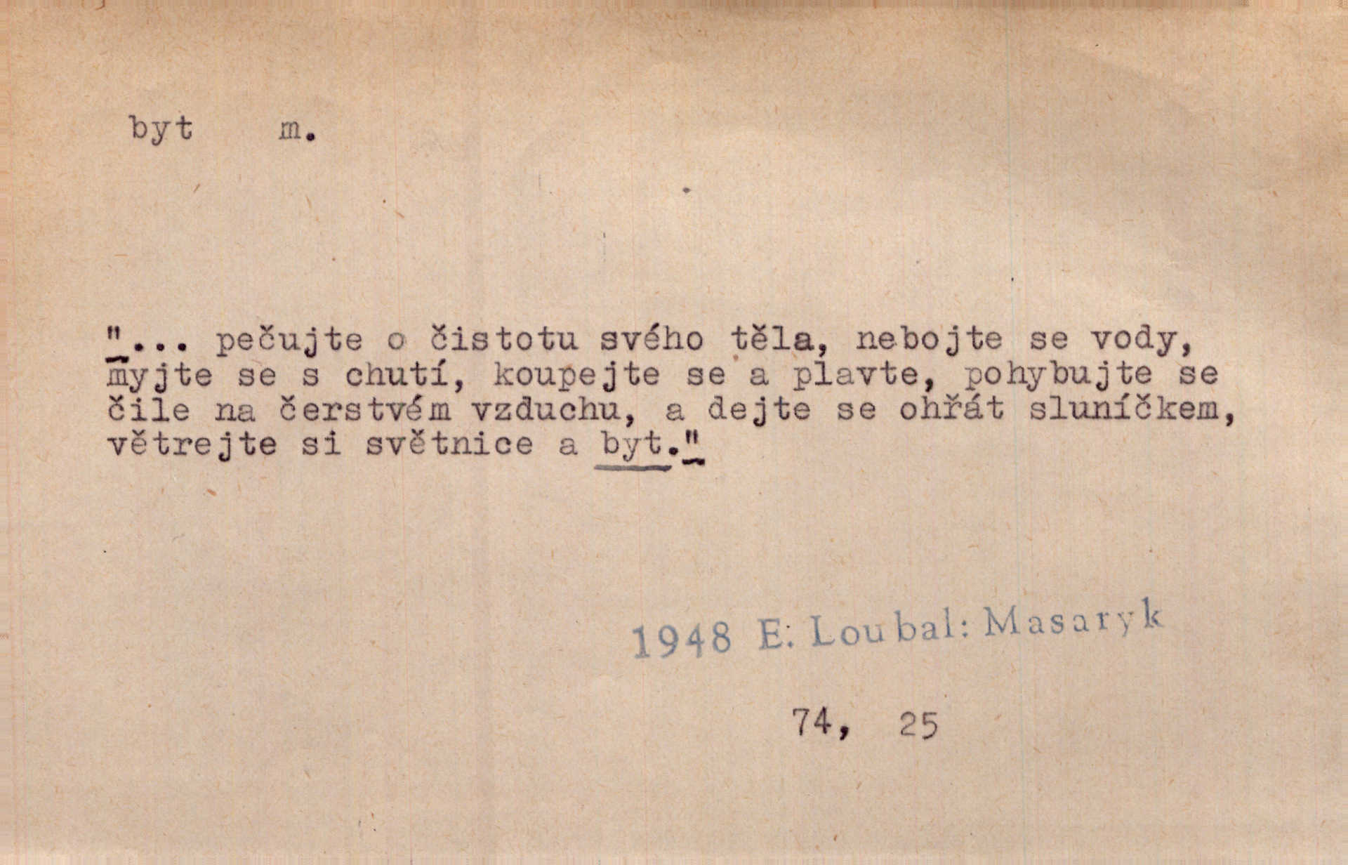 - byt, -u m. soubor místností k bydlení, příbytek, obydlí, bydliště. Jenom se přestěhuješ do prvního patra naproti, viděla jsem tam vyvěšený byt. Čap. Ch. Platiti za byt a stravu bydlení. Letní byt. Býti, dlíti bytem přebývati. Zdali zde cizí umělkyně bytem jsou? Tyl. S počátku Dobroš nebyl bytem u paní Kopecké, neznal jí. Prav. Jen ctnost a dobro může dlíti bytem v tom zjevu andělském. Čech. A přece vím, že blízko jiná, lepší zem, kde jiný, lepší život, kde je rozkoš bytem. Leg. D bytí, život, existence. Vůbec každý byt končívá se jen tím, že přechází do bytu a celku jiného. Pal. Chtěl jsem poznat přání i hospodářské podmínky bytu sedlákova. Pek. Vyjíti od líčení hmotného a společenského prostředí a bytu, z něhož umělec vzešel. Šal. Když se konečně dodělal lepšího bytu, stav se magistrátním sekretářem, zemřel záhy v mužném věku. Jir.