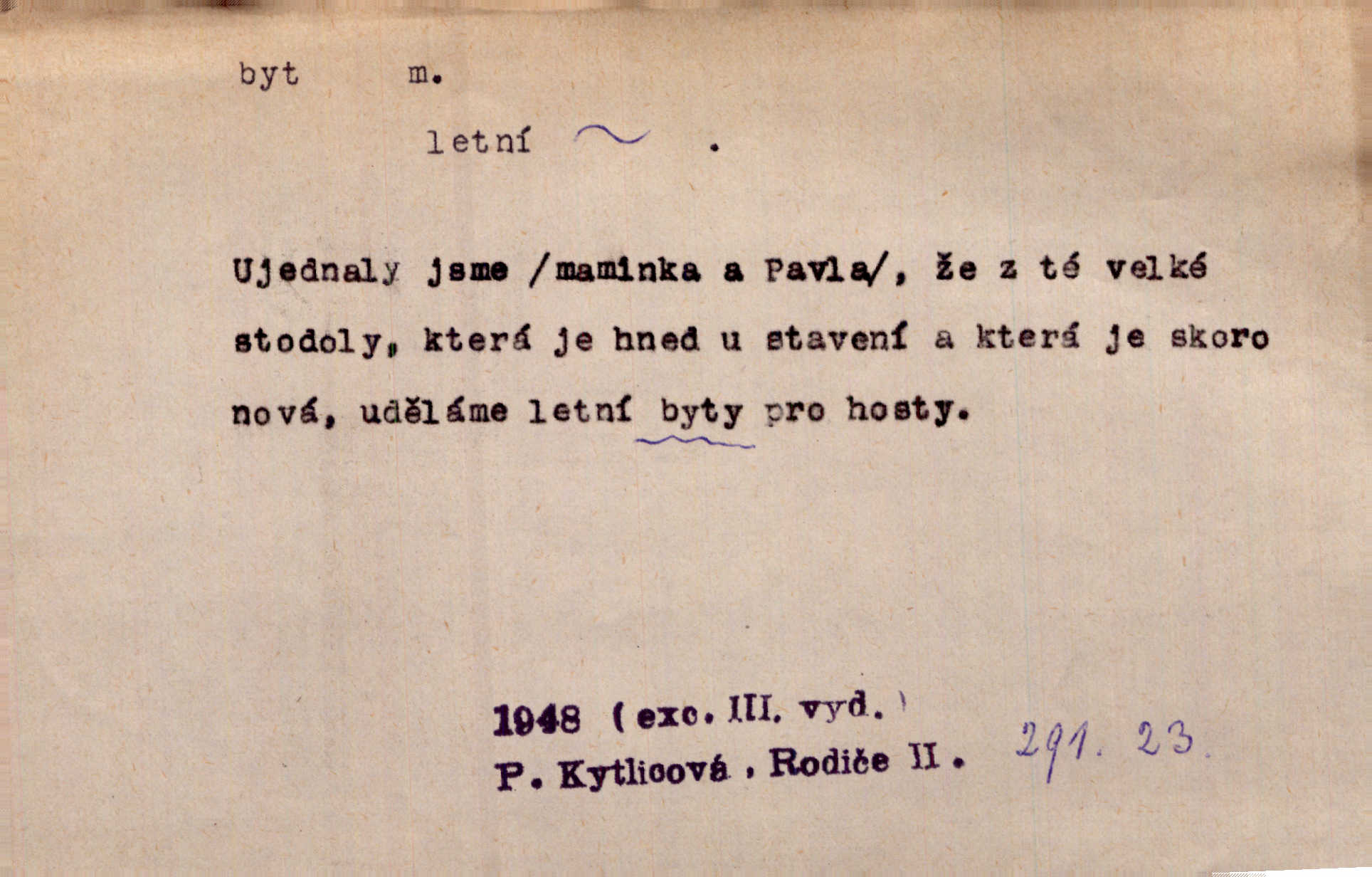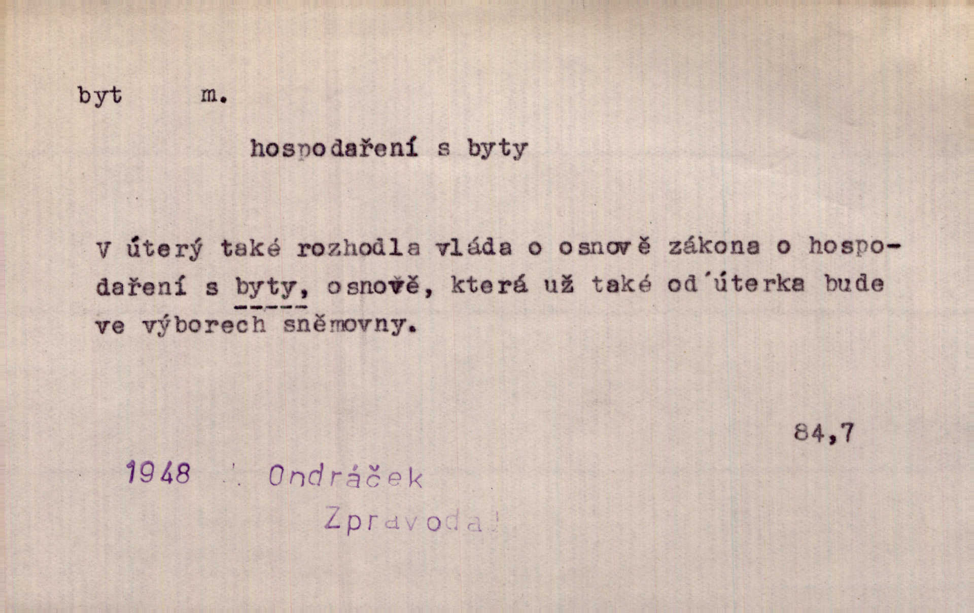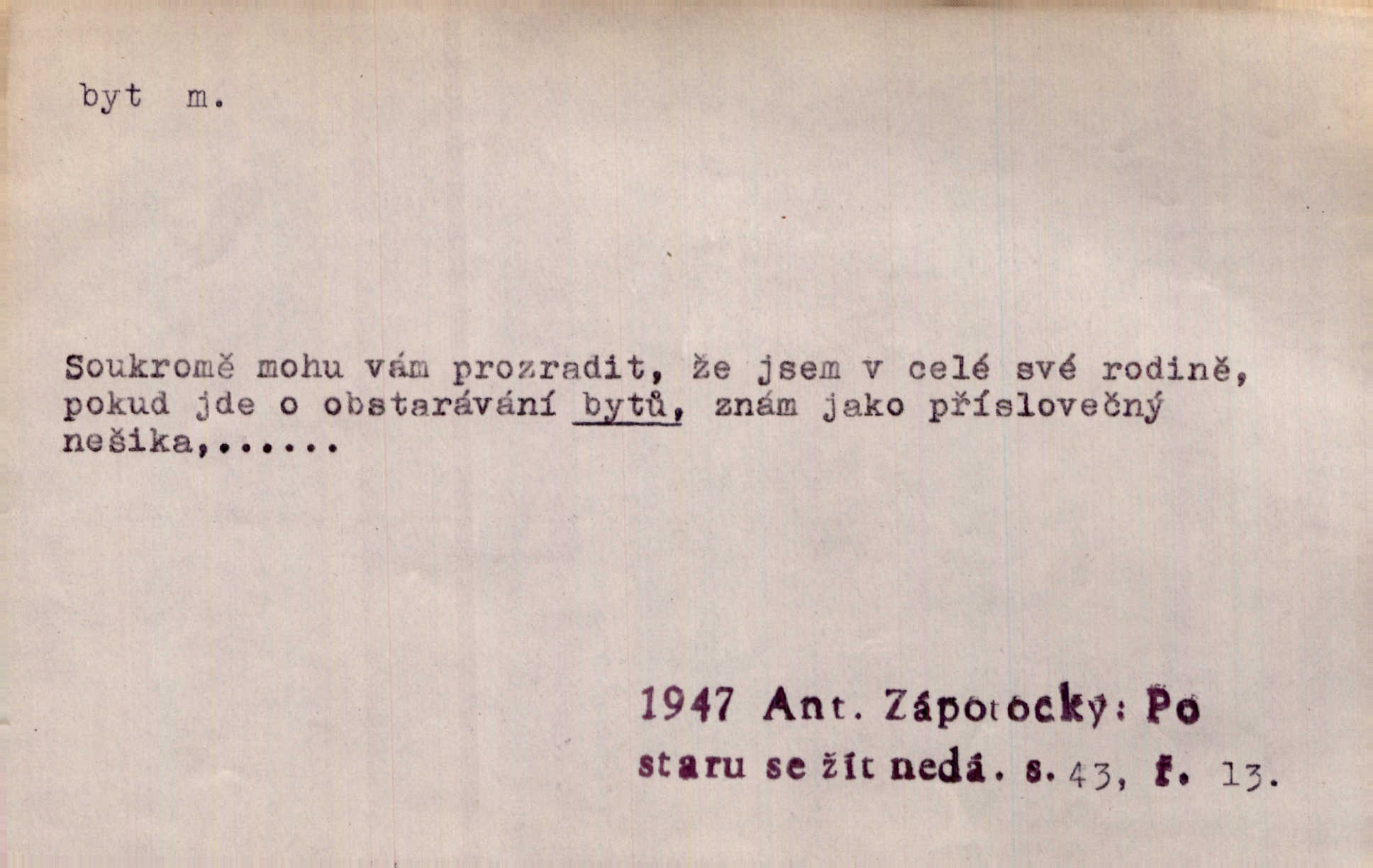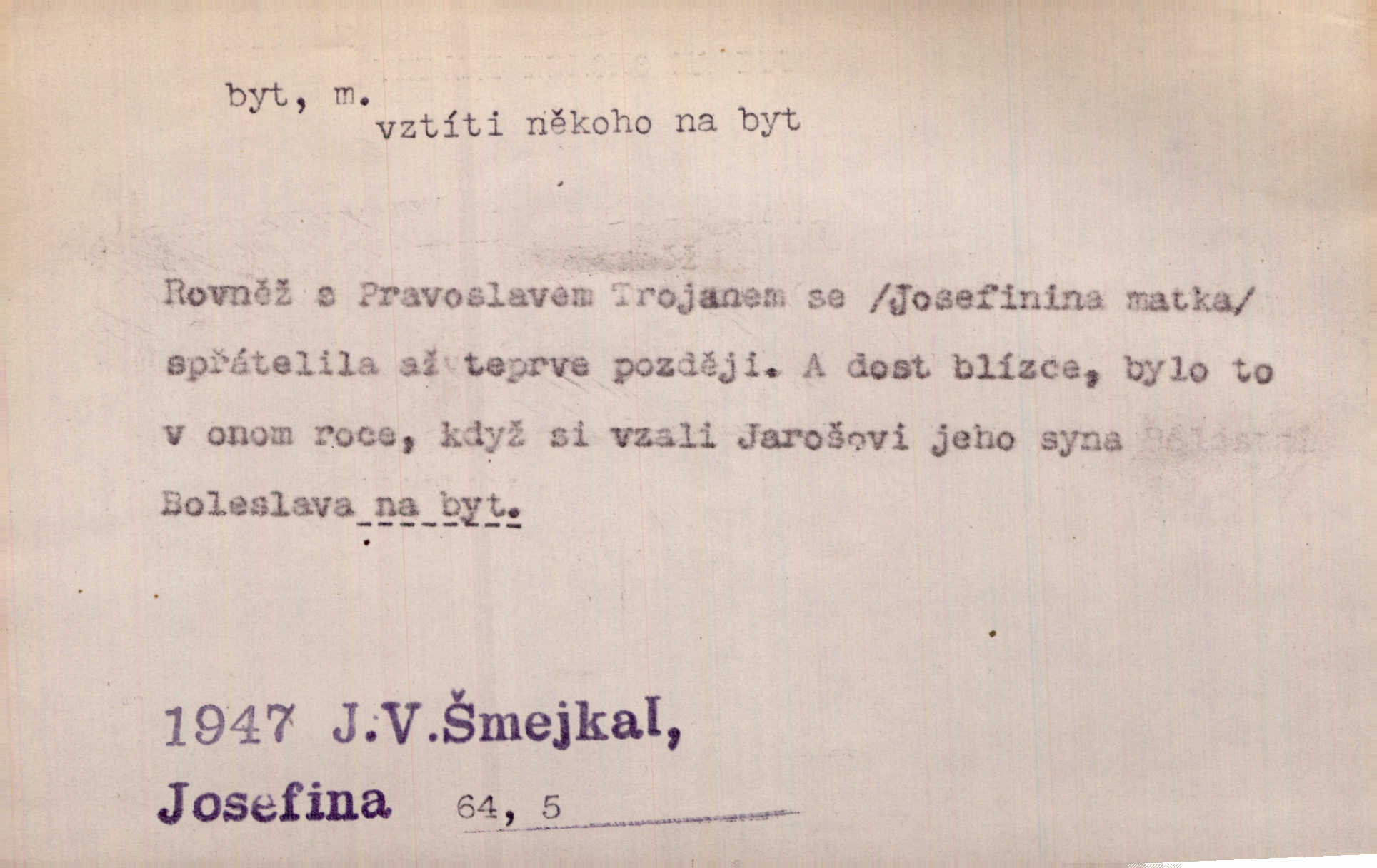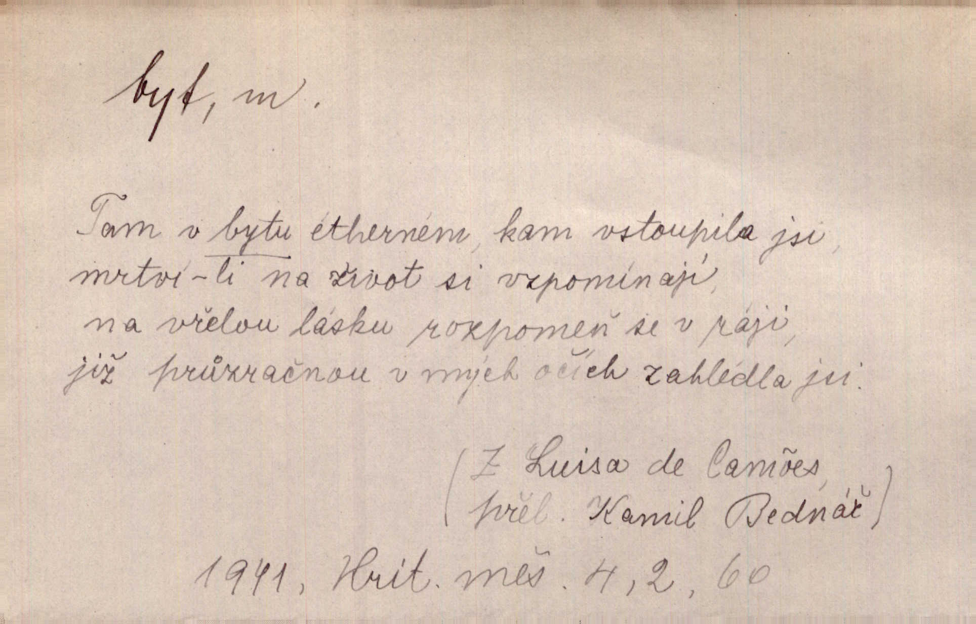- byt, -u m. soubor místností k bydlení, příbytek, obydlí, bydliště. Jenom se přestěhuješ do prvního patra naproti, viděla jsem tam vyvěšený byt. Čap. Ch. Platiti za byt a stravu bydlení. Letní byt. Býti, dlíti bytem přebývati. Zdali zde cizí umělkyně bytem jsou? Tyl. S počátku Dobroš nebyl bytem u paní Kopecké, neznal jí. Prav. Jen ctnost a dobro může dlíti bytem v tom zjevu andělském. Čech. A přece vím, že blízko jiná, lepší zem, kde jiný, lepší život, kde je rozkoš bytem. Leg. D bytí, život, existence. Vůbec každý byt končívá se jen tím, že přechází do bytu a celku jiného. Pal. Chtěl jsem poznat přání i hospodářské podmínky bytu sedlákova. Pek. Vyjíti od líčení hmotného a společenského prostředí a bytu, z něhož umělec vzešel. Šal. Když se konečně dodělal lepšího bytu, stav se magistrátním sekretářem, zemřel záhy v mužném věku. Jir.