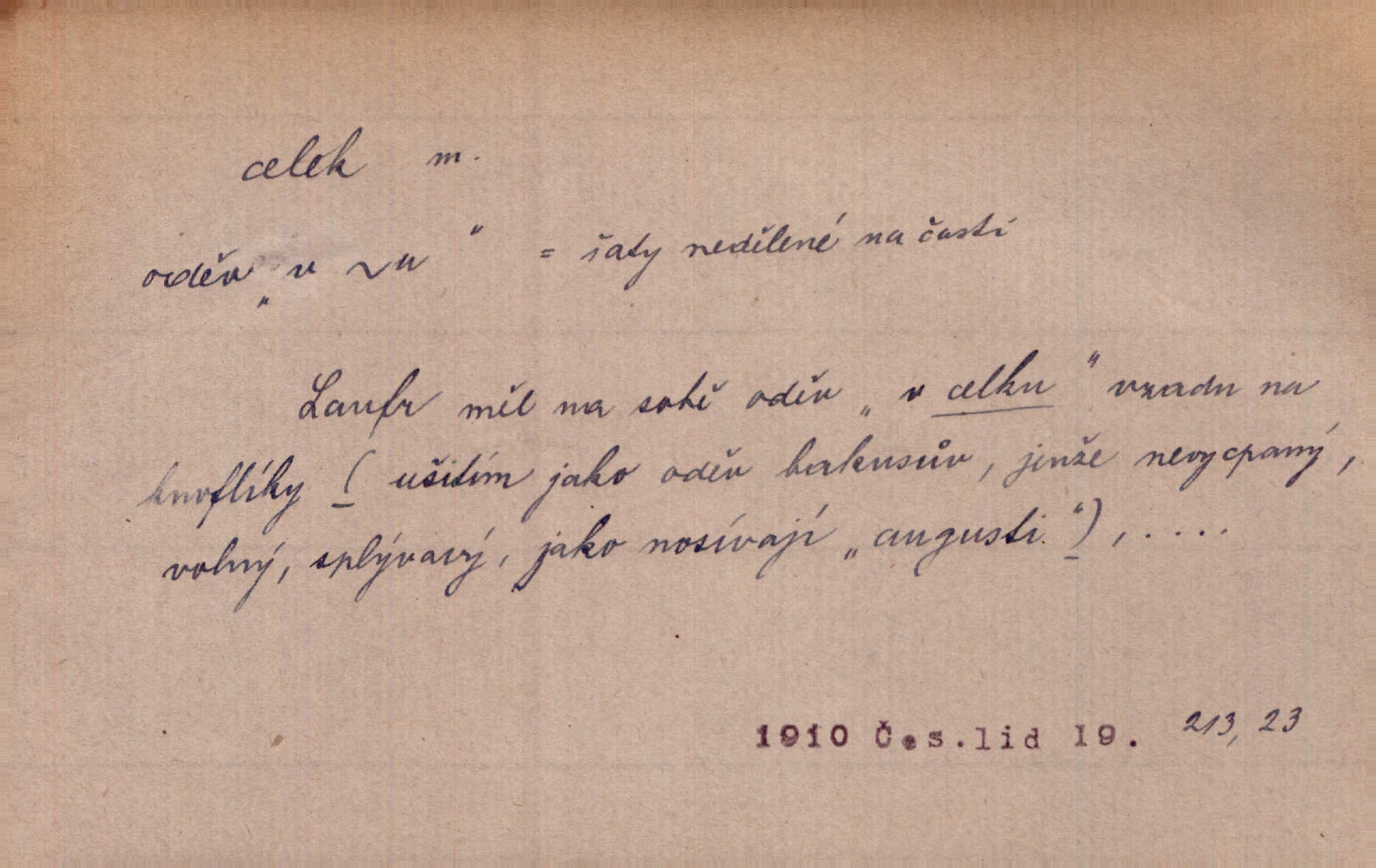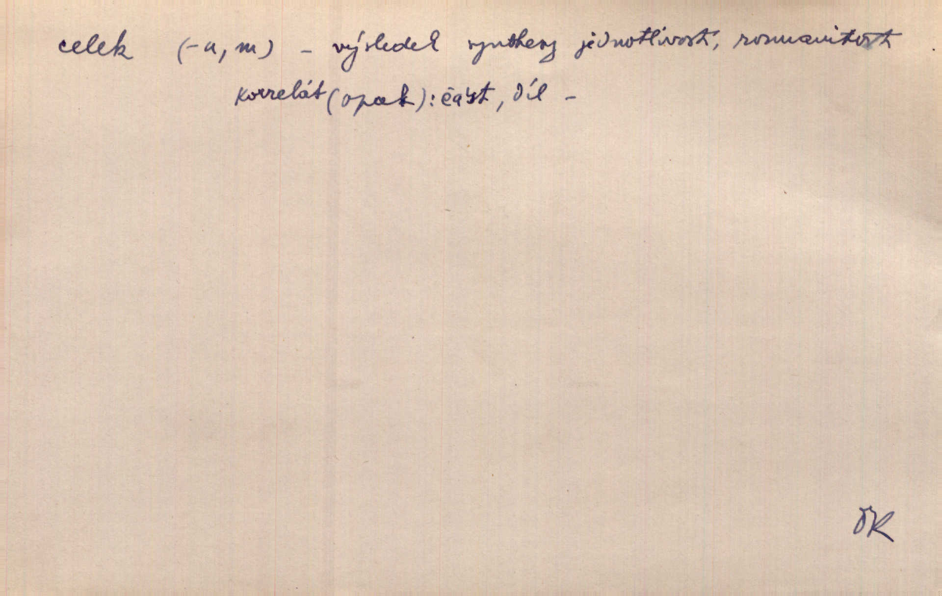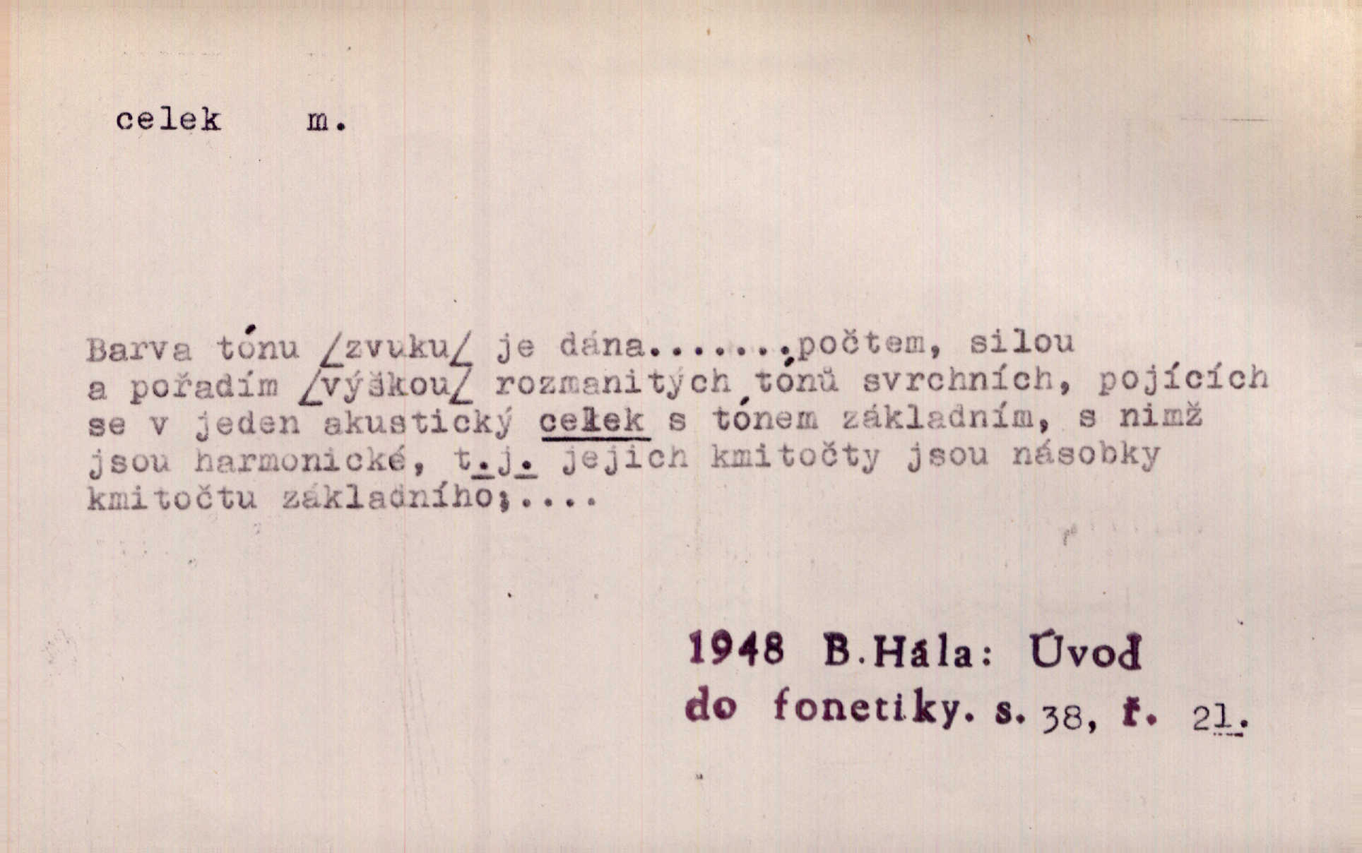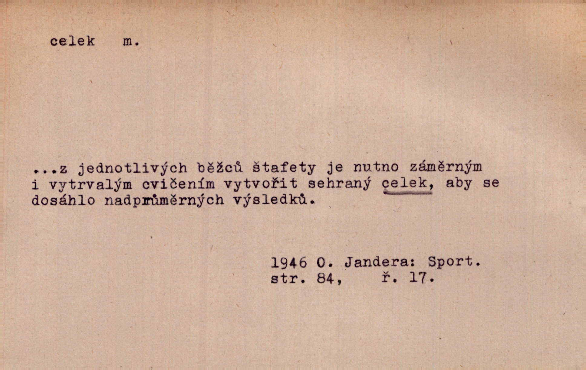 - celek, -lku m. soubor částí n. jednotlivin (op. část, jednotlivina). Mnohdy torso jasněji mluví než velký, do všech detailů propracovaný celek. Mach. Co je štěstí a blaho jednotlivce naproti zájmům velikého celku? Zey. Po kostele šli se všichni do lázní vykoupat, při čemž si starší ženy a muži dávali obyčejně baňky sázet, to patřilo k celku. Něm. Šaty si sama šila a vždycky hladké a v celku ne sukni a kabát zvlášť. R. Svob. Domovní dveře jsou buď v celku nebo se skládají ze dvou volných částí jednokřídlové. Jir. Dámy soudily o případech milostných duchaplně i v celku spravedlivě celkem. Ner.