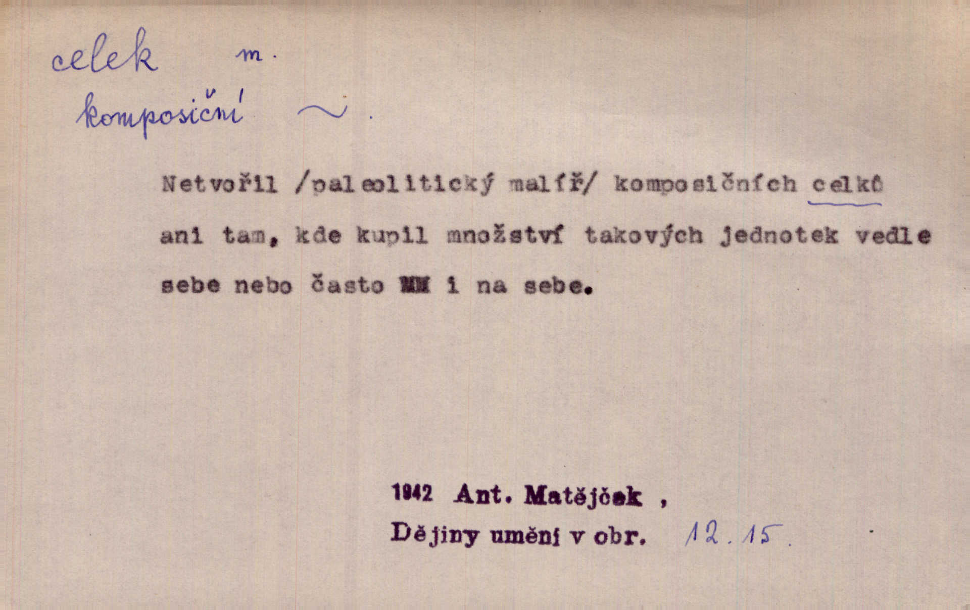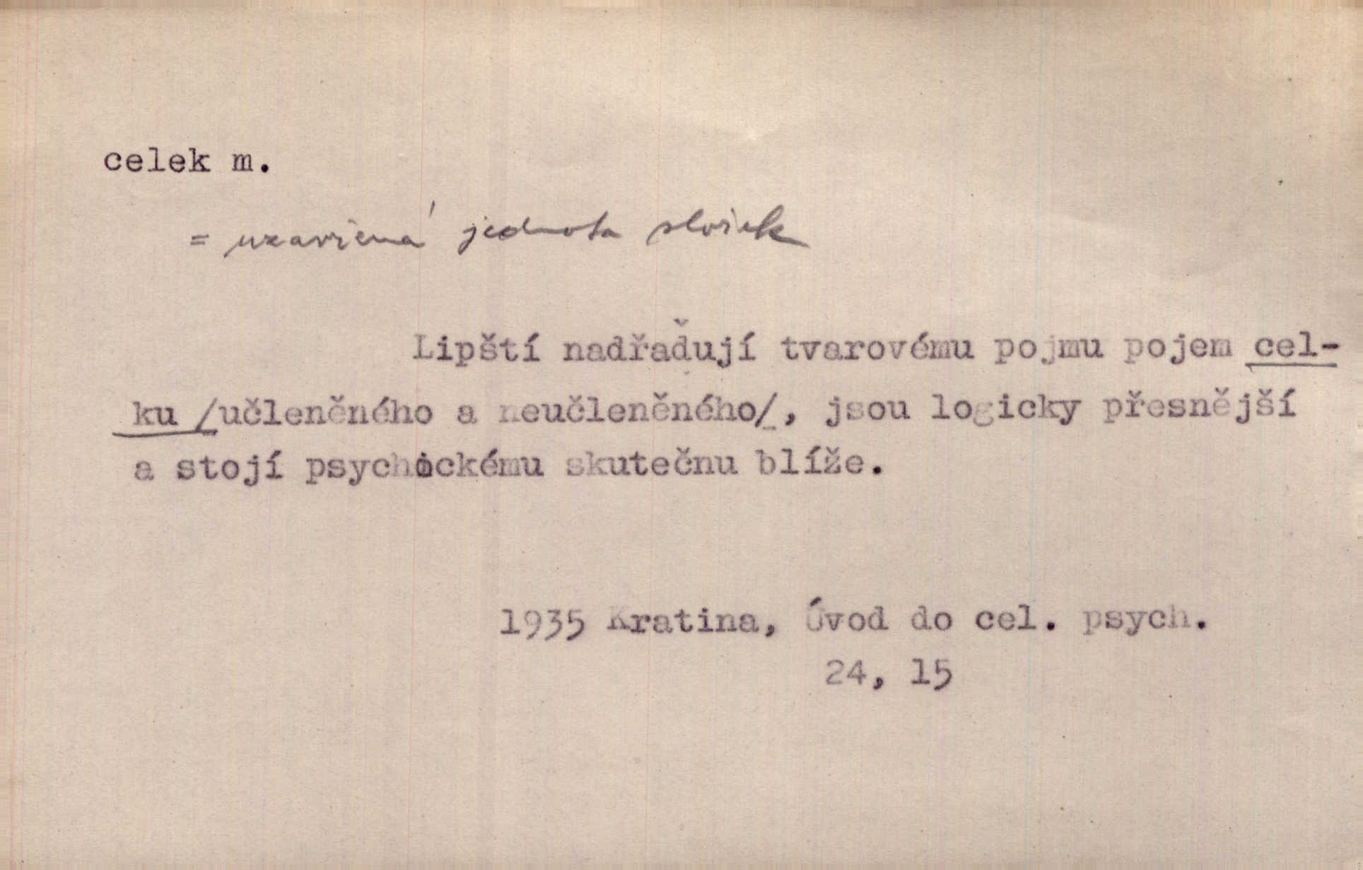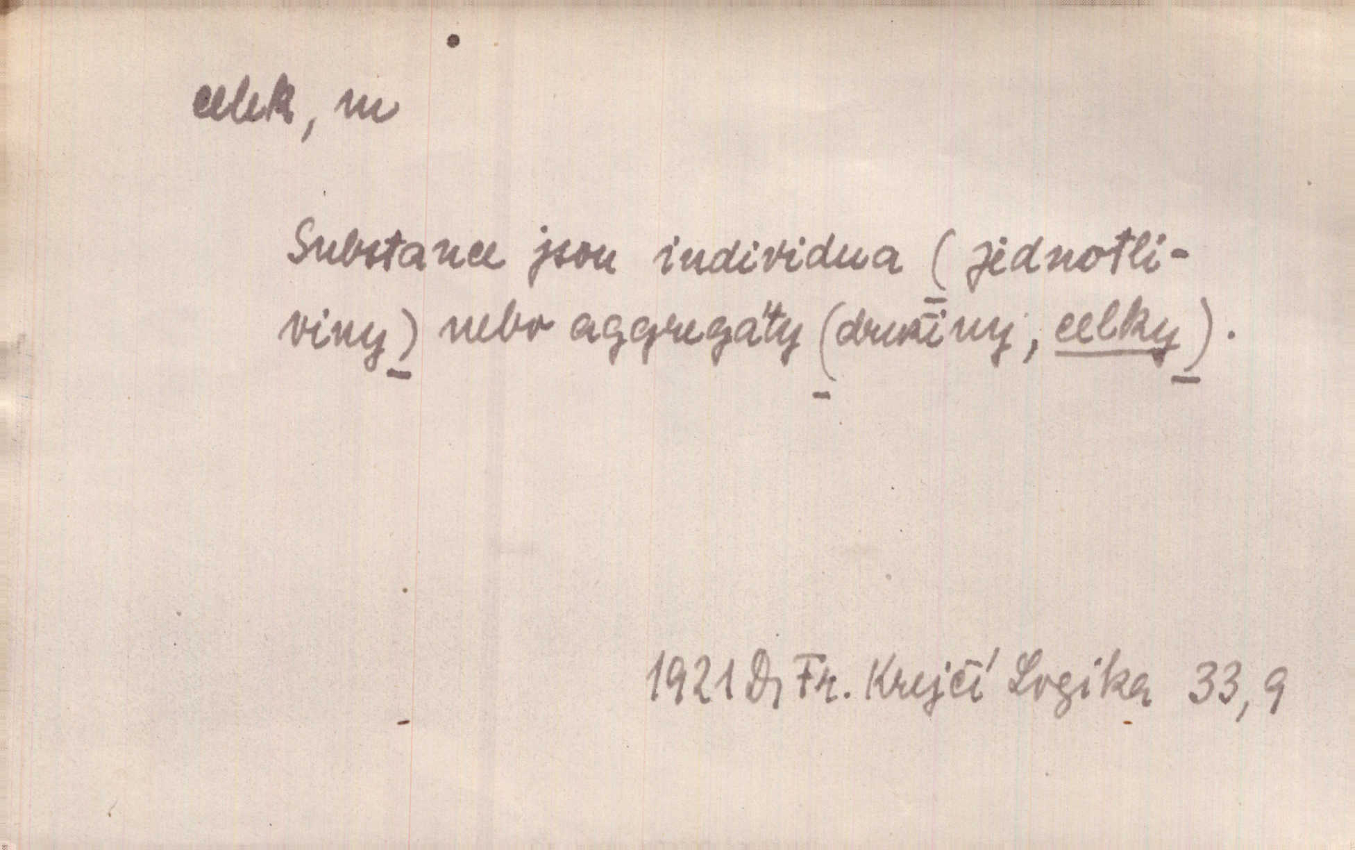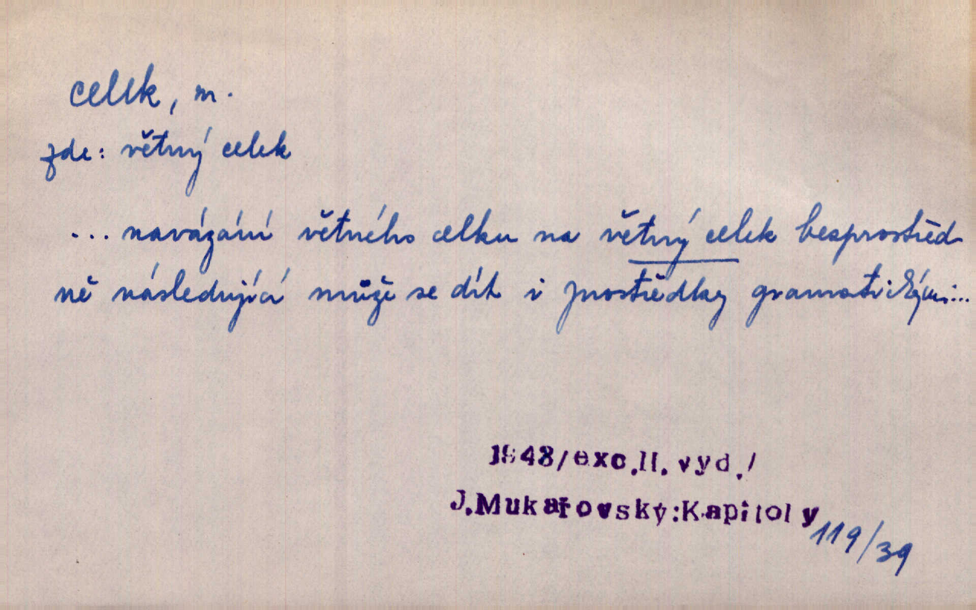 - celek, -lku m. soubor částí n. jednotlivin (op. část, jednotlivina). Mnohdy torso jasněji mluví než velký, do všech detailů propracovaný celek. Mach. Co je štěstí a blaho jednotlivce naproti zájmům velikého celku? Zey. Po kostele šli se všichni do lázní vykoupat, při čemž si starší ženy a muži dávali obyčejně baňky sázet, to patřilo k celku. Něm. Šaty si sama šila a vždycky hladké a v celku ne sukni a kabát zvlášť. R. Svob. Domovní dveře jsou buď v celku nebo se skládají ze dvou volných částí jednokřídlové. Jir. Dámy soudily o případech milostných duchaplně i v celku spravedlivě celkem. Ner.