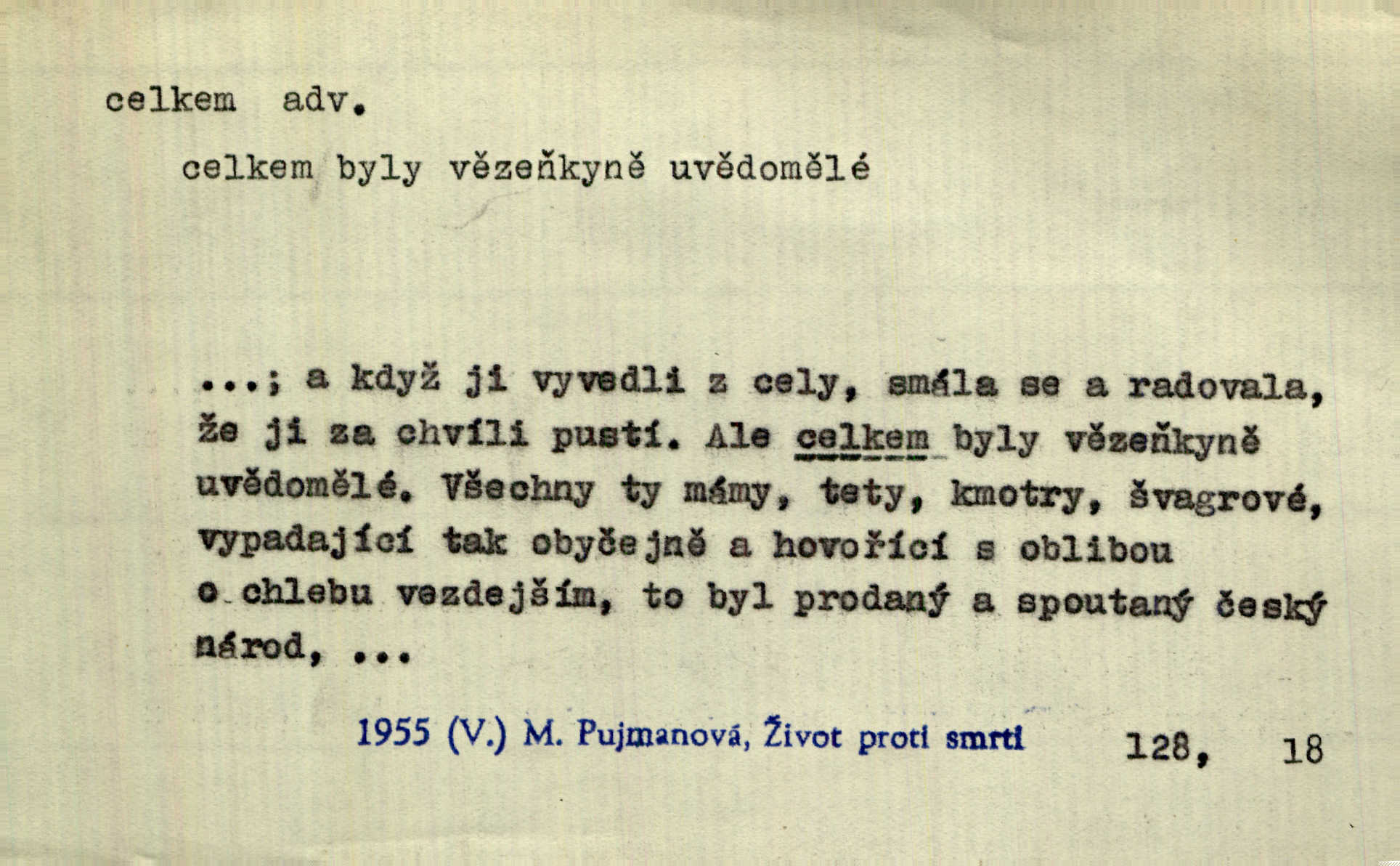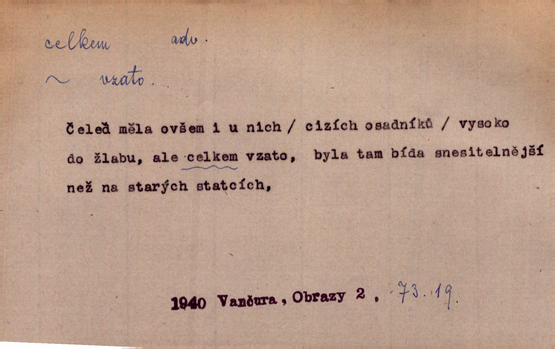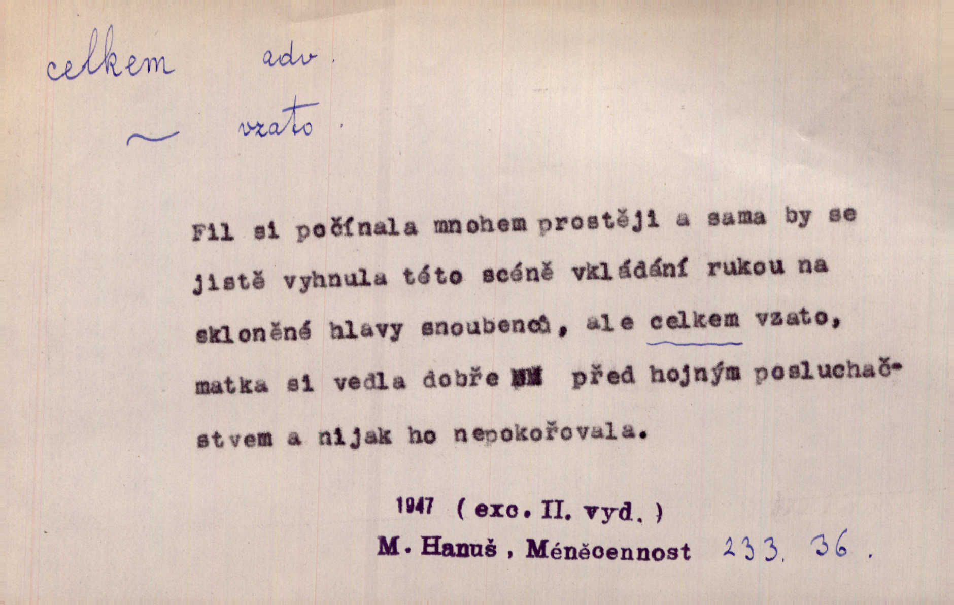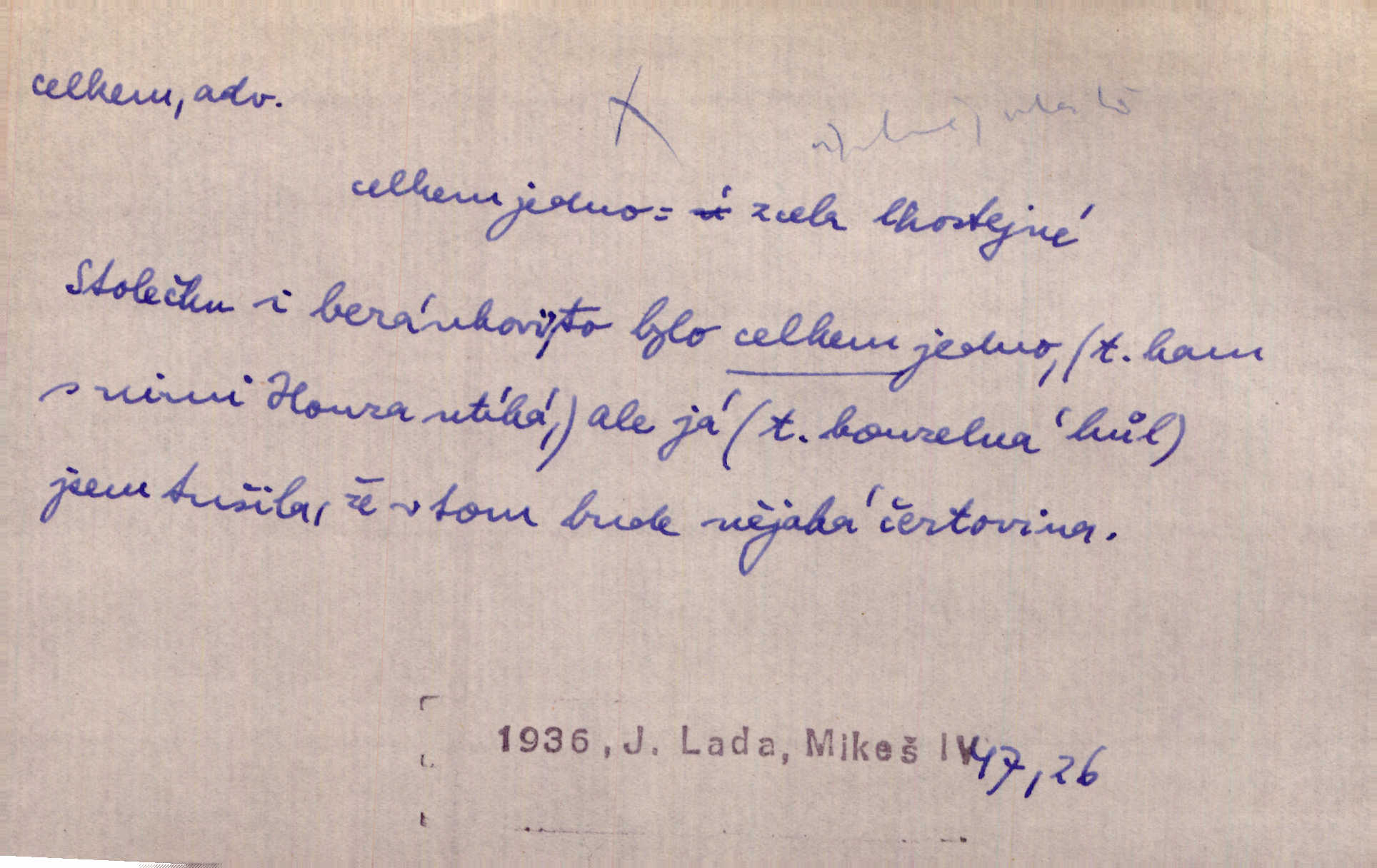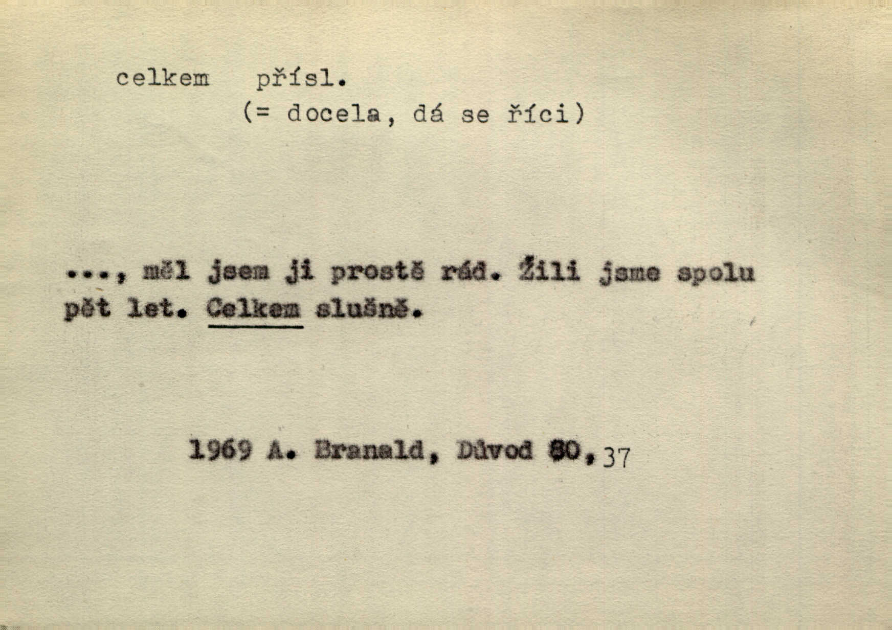 - celkem adv. úhrnem. Celkem možná říci, že byla zvědavost Dlugošova divně ukojena. Hál. Za ten čas se dávalo na divadle našem celkem 49 představení. Zl. Praha. Celkem celků však opravil Larvin v lecčems své iluse o milovaném mistrovi. Čap. Ch. D zhruba, přibližně, asi. Typograf, autor, roznašeč i trafikant, který žurnál prodává, jsou si celkem rovni. V. Mrš. Bylť [Říha] celkem člověk nepříliš přívětivý. Šmil. Upejpá se Hanýša, ale celkem se nezlobí. Herb. D Arch. v celku, úplně. Nejhlavnější [z Kapistranových žádostí] byla, aby papež zrušil celkem kompaktáta. Tomek.