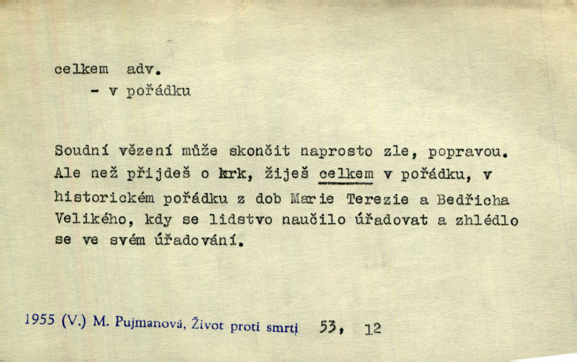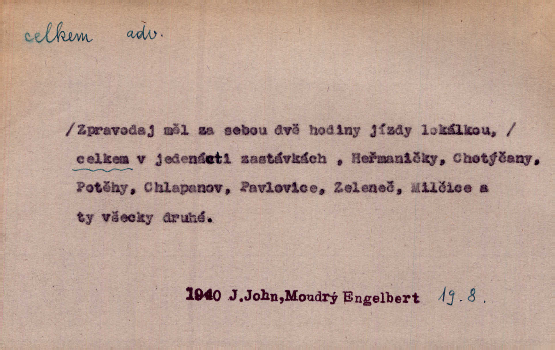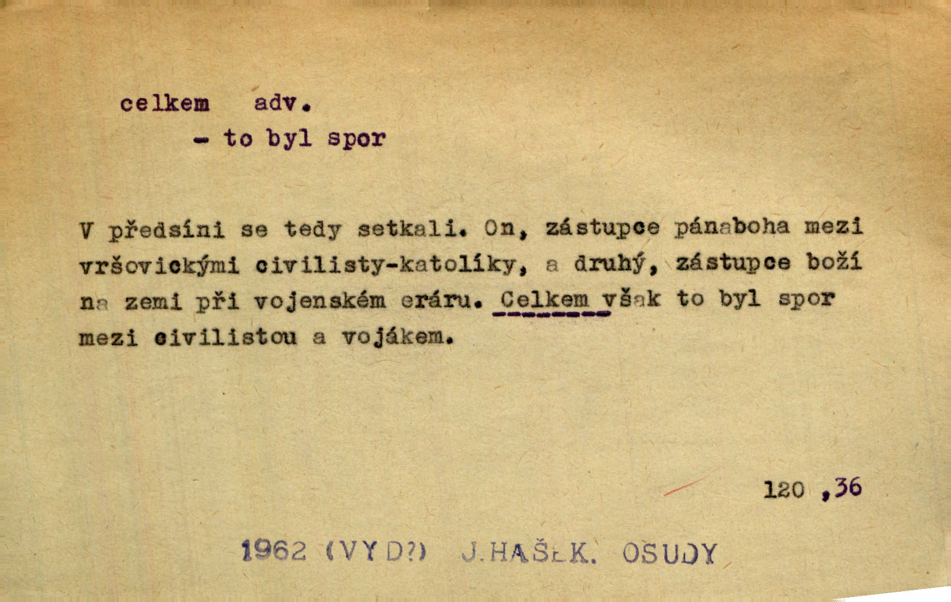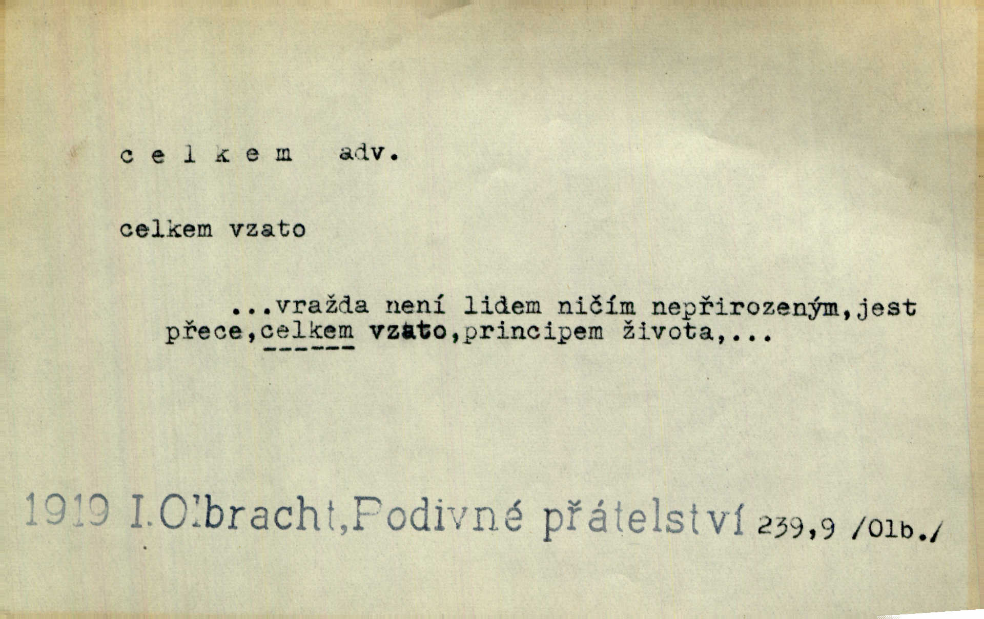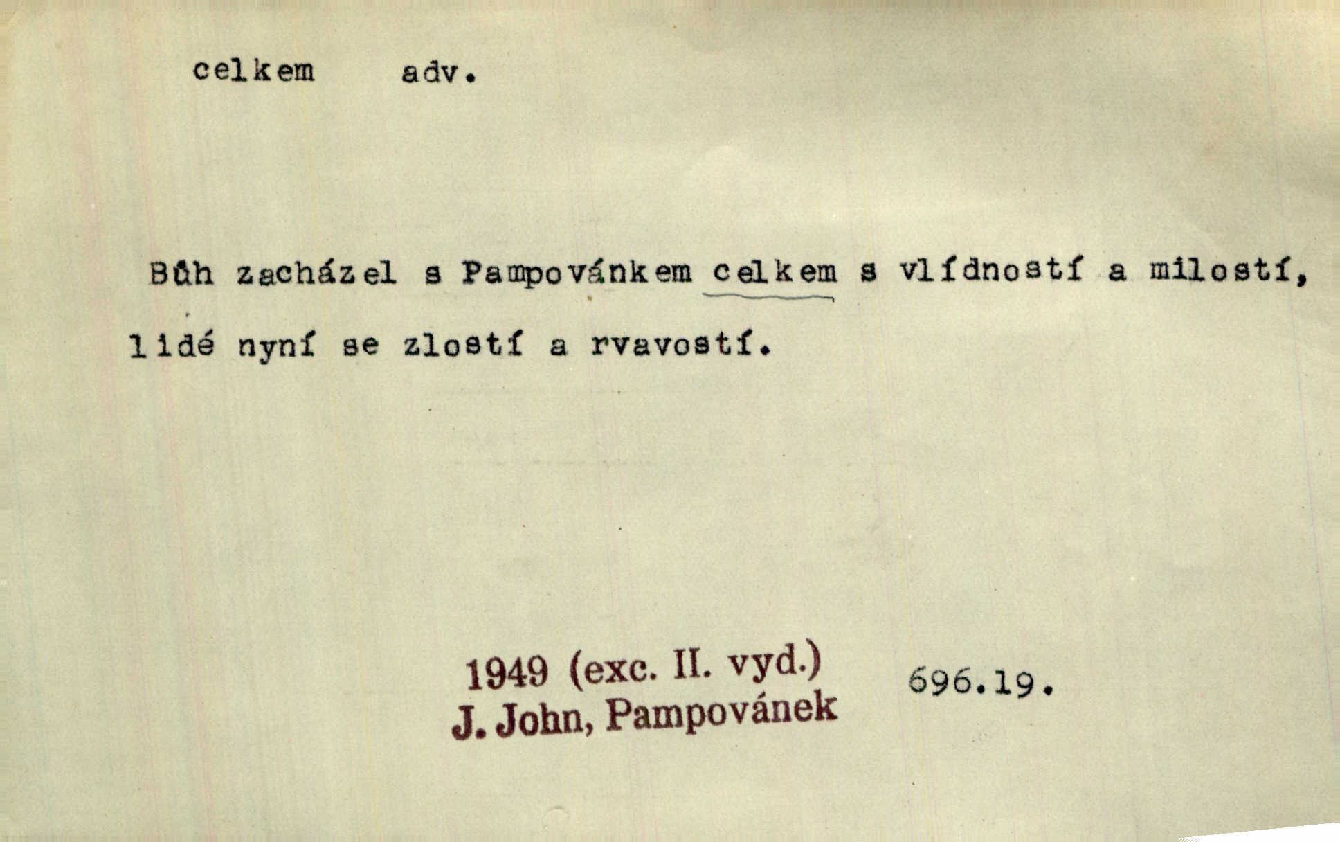 - celkem adv. úhrnem. Celkem možná říci, že byla zvědavost Dlugošova divně ukojena. Hál. Za ten čas se dávalo na divadle našem celkem 49 představení. Zl. Praha. Celkem celků však opravil Larvin v lecčems své iluse o milovaném mistrovi. Čap. Ch. D zhruba, přibližně, asi. Typograf, autor, roznašeč i trafikant, který žurnál prodává, jsou si celkem rovni. V. Mrš. Bylť [Říha] celkem člověk nepříliš přívětivý. Šmil. Upejpá se Hanýša, ale celkem se nezlobí. Herb. D Arch. v celku, úplně. Nejhlavnější [z Kapistranových žádostí] byla, aby papež zrušil celkem kompaktáta. Tomek.