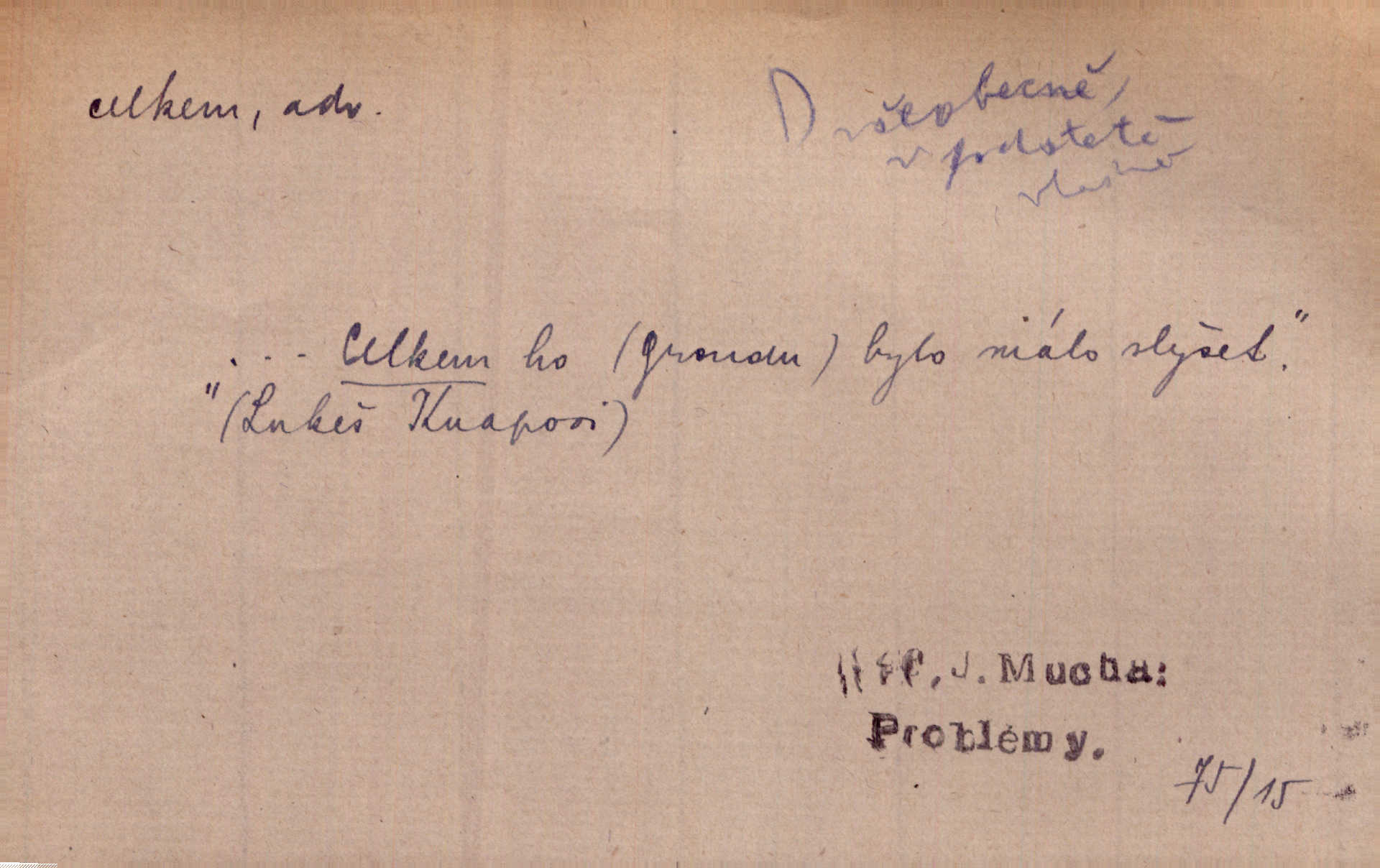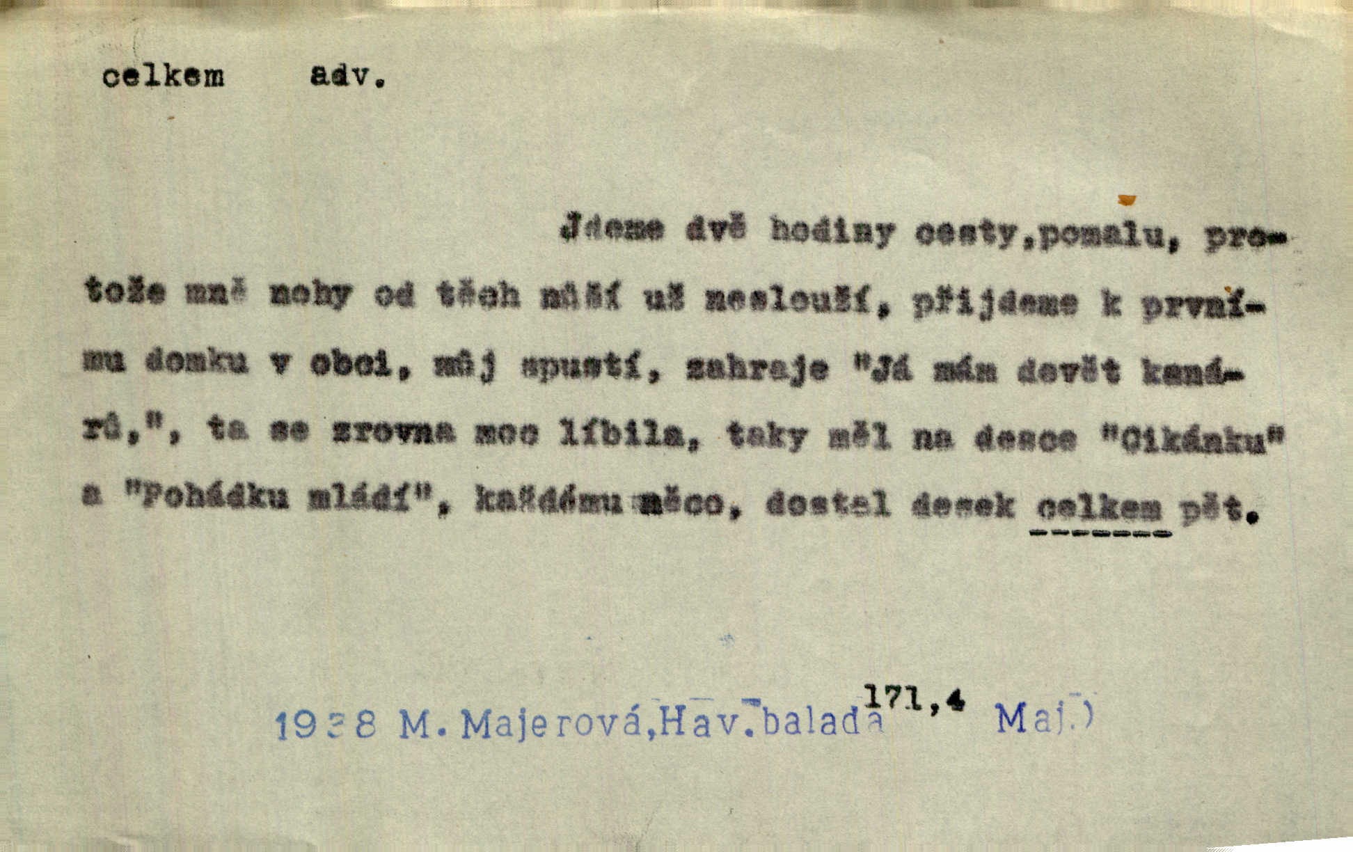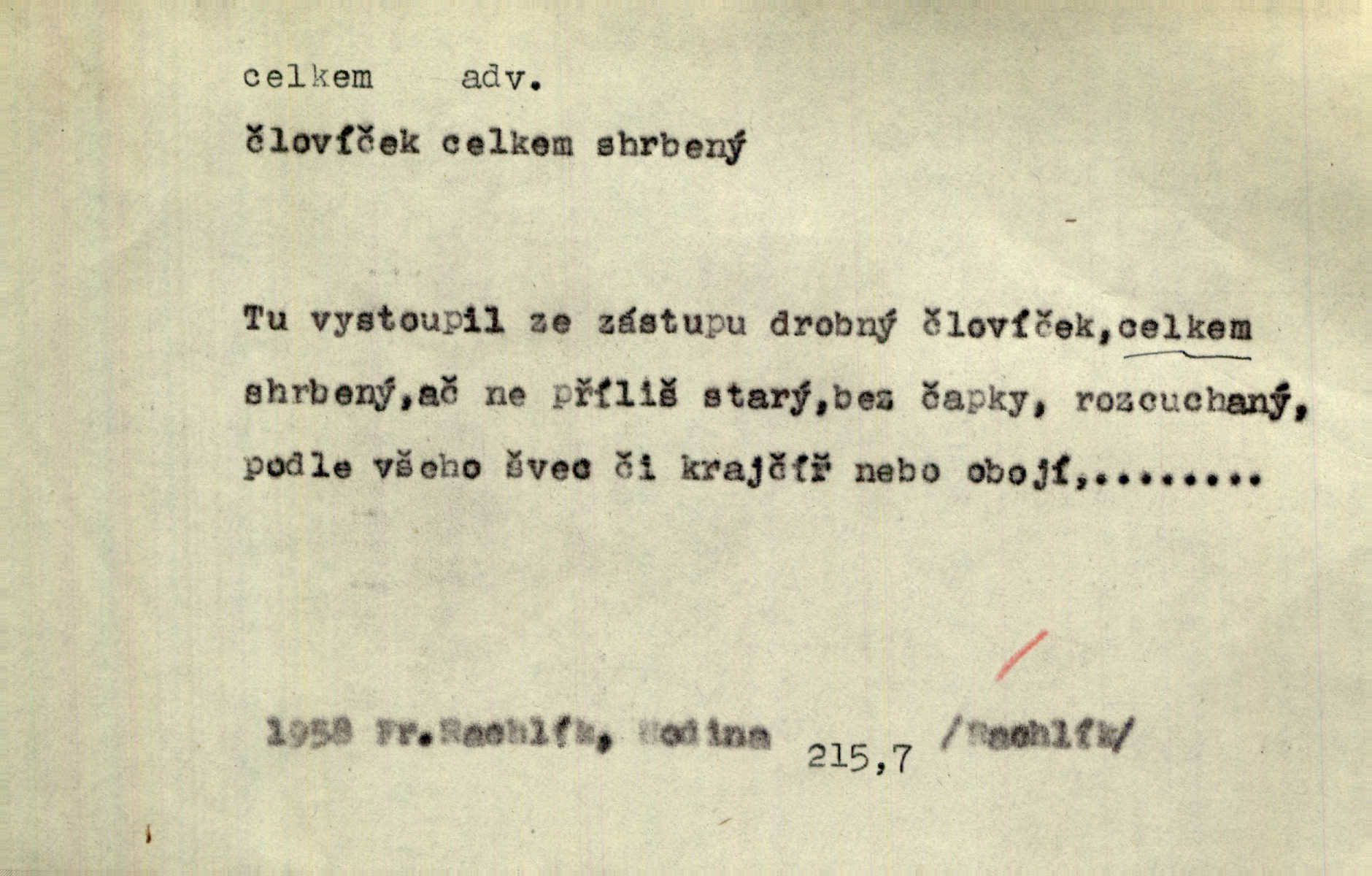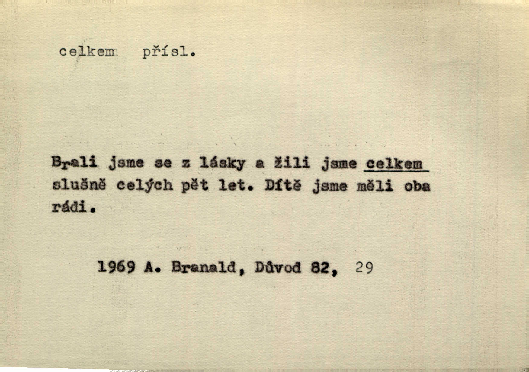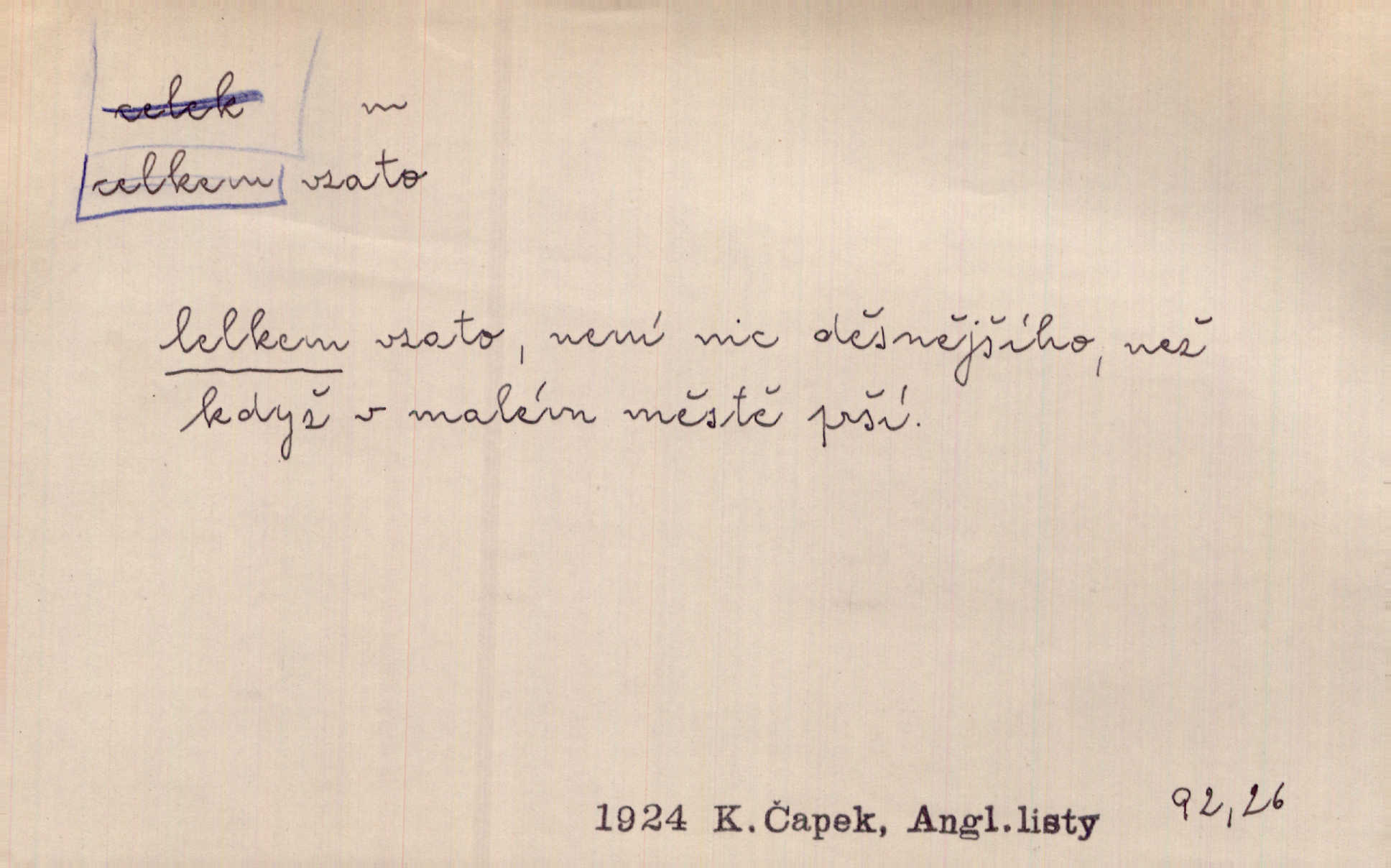 - celkem adv. úhrnem. Celkem možná říci, že byla zvědavost Dlugošova divně ukojena. Hál. Za ten čas se dávalo na divadle našem celkem 49 představení. Zl. Praha. Celkem celků však opravil Larvin v lecčems své iluse o milovaném mistrovi. Čap. Ch. D zhruba, přibližně, asi. Typograf, autor, roznašeč i trafikant, který žurnál prodává, jsou si celkem rovni. V. Mrš. Bylť [Říha] celkem člověk nepříliš přívětivý. Šmil. Upejpá se Hanýša, ale celkem se nezlobí. Herb. D Arch. v celku, úplně. Nejhlavnější [z Kapistranových žádostí] byla, aby papež zrušil celkem kompaktáta. Tomek.