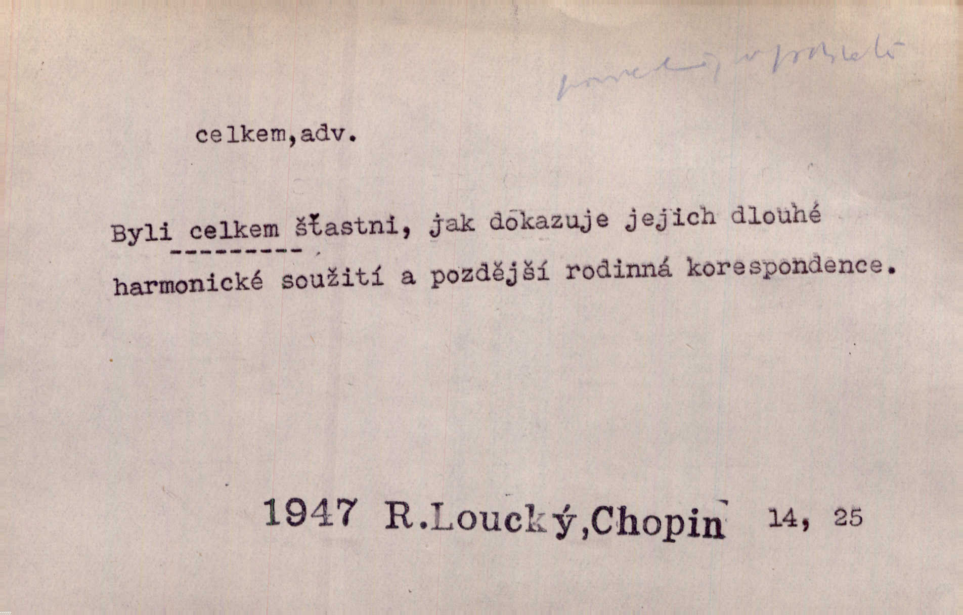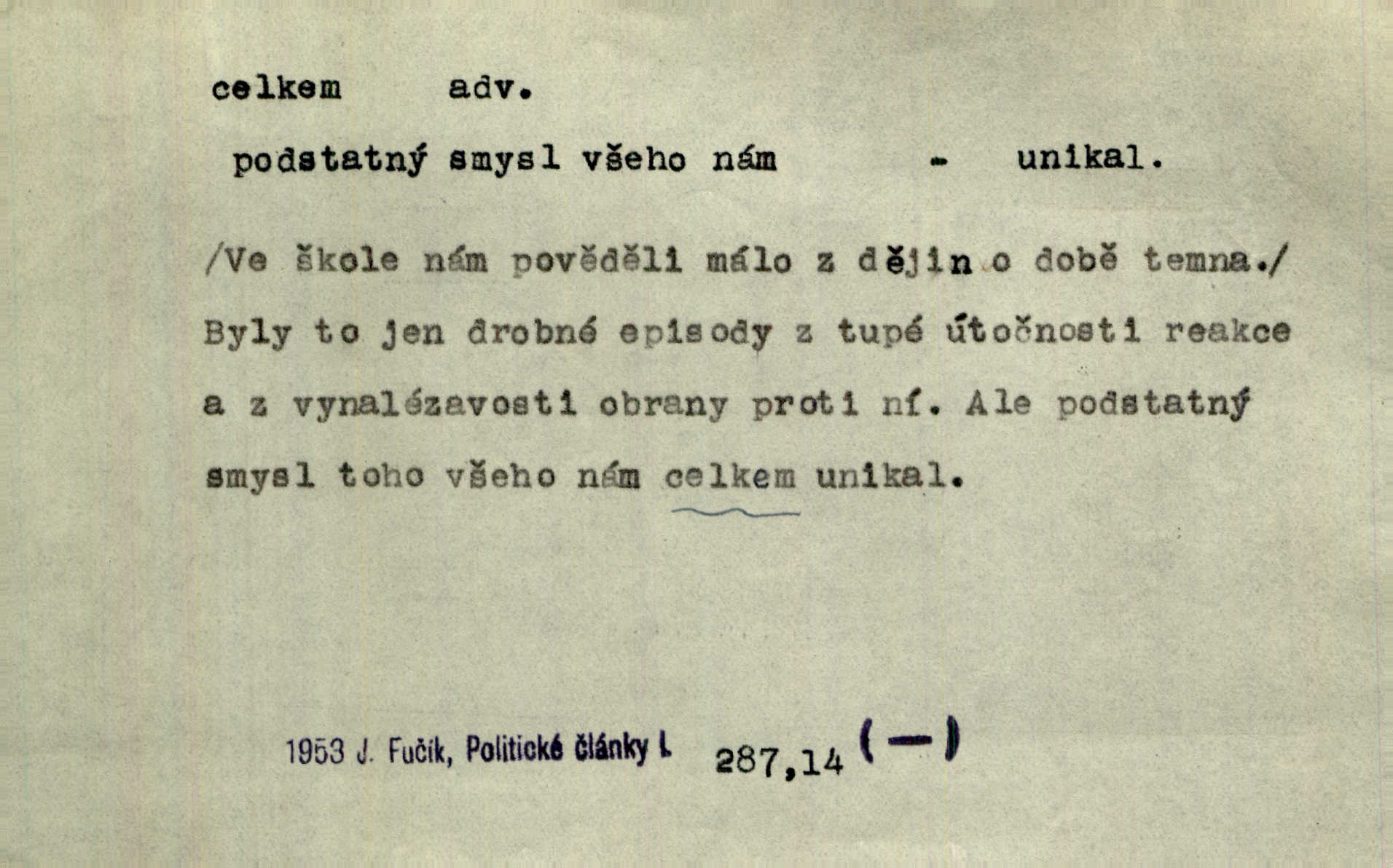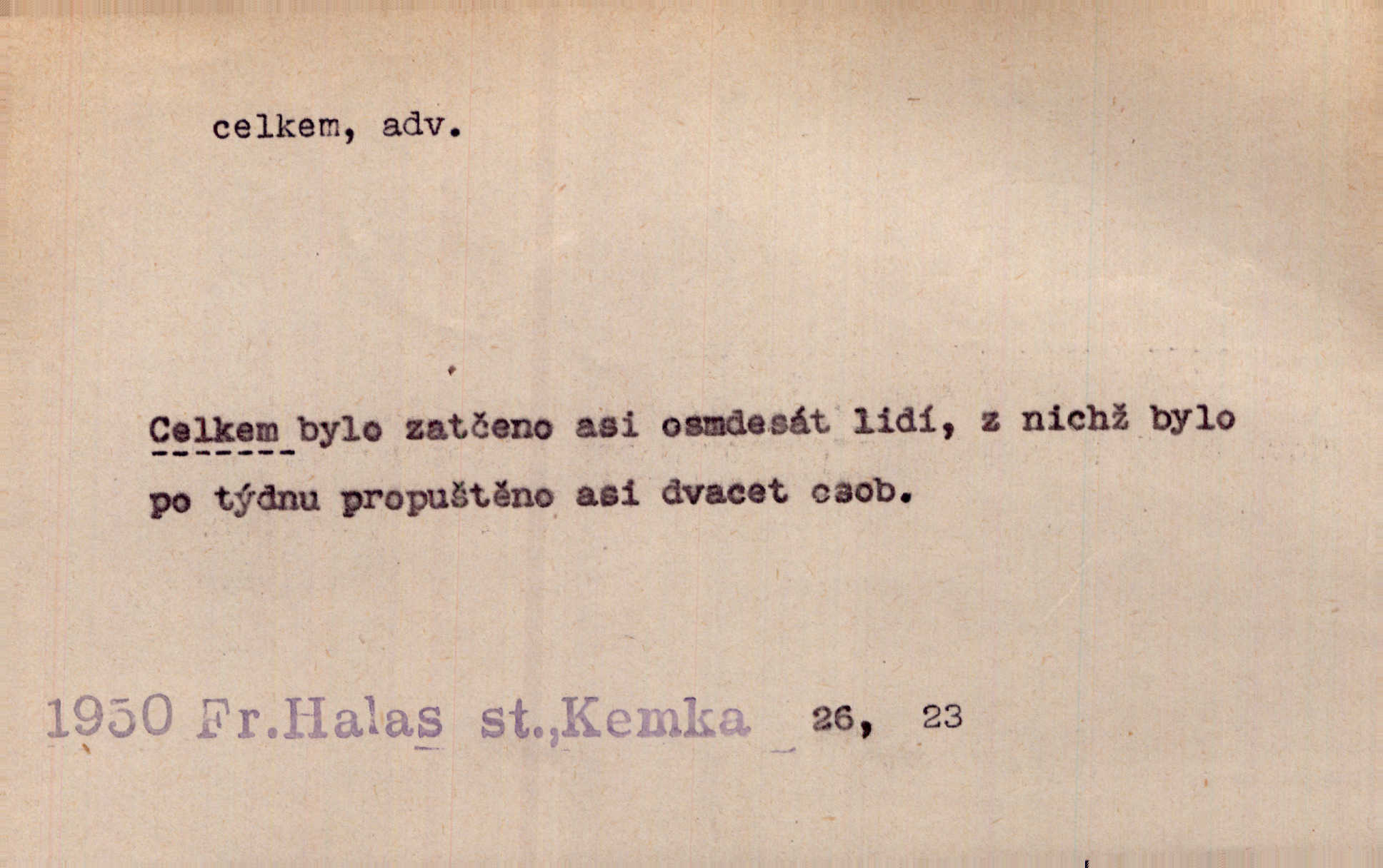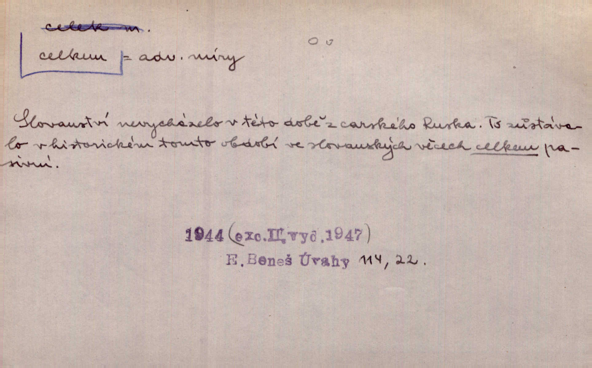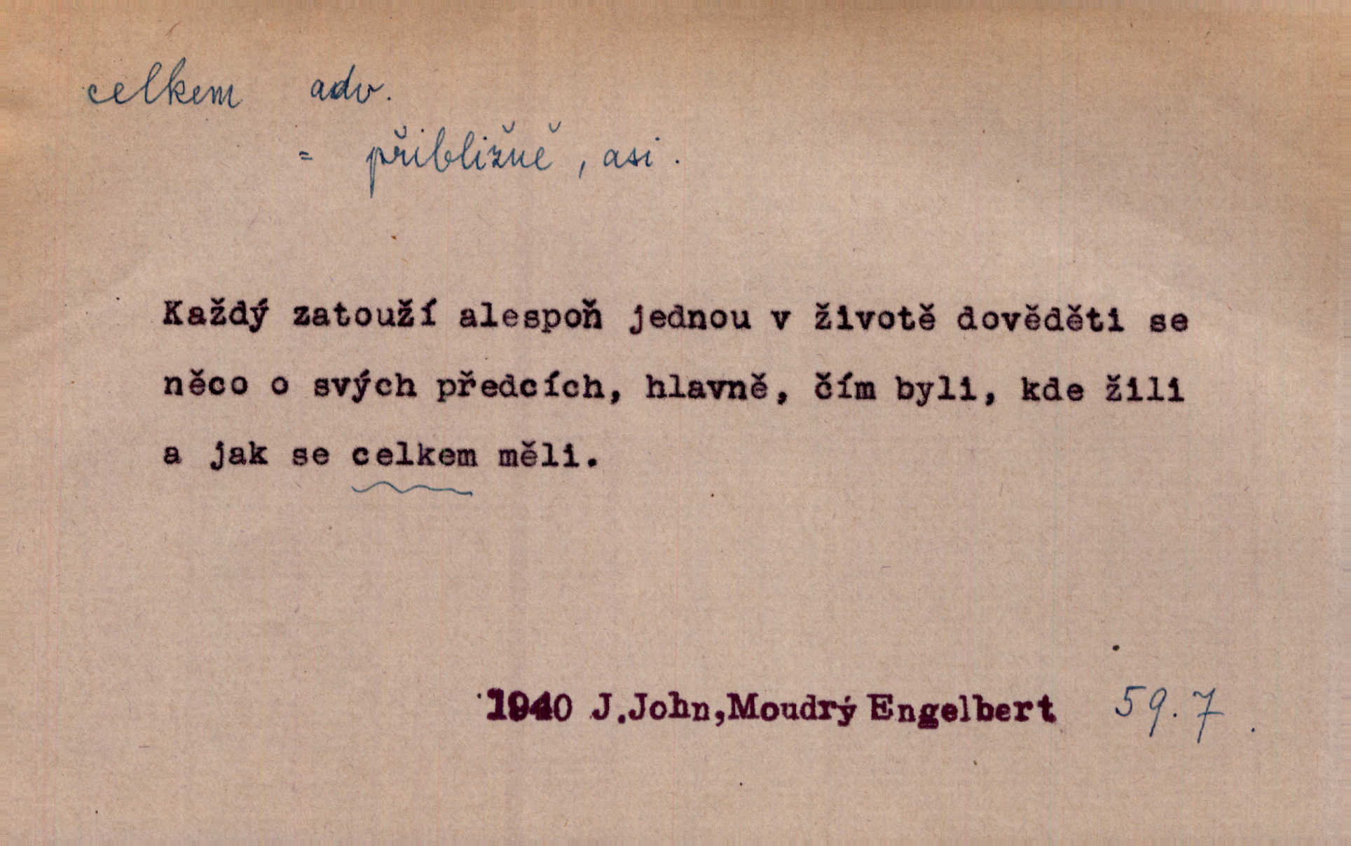 - celkem adv. úhrnem. Celkem možná říci, že byla zvědavost Dlugošova divně ukojena. Hál. Za ten čas se dávalo na divadle našem celkem 49 představení. Zl. Praha. Celkem celků však opravil Larvin v lecčems své iluse o milovaném mistrovi. Čap. Ch. D zhruba, přibližně, asi. Typograf, autor, roznašeč i trafikant, který žurnál prodává, jsou si celkem rovni. V. Mrš. Bylť [Říha] celkem člověk nepříliš přívětivý. Šmil. Upejpá se Hanýša, ale celkem se nezlobí. Herb. D Arch. v celku, úplně. Nejhlavnější [z Kapistranových žádostí] byla, aby papež zrušil celkem kompaktáta. Tomek.