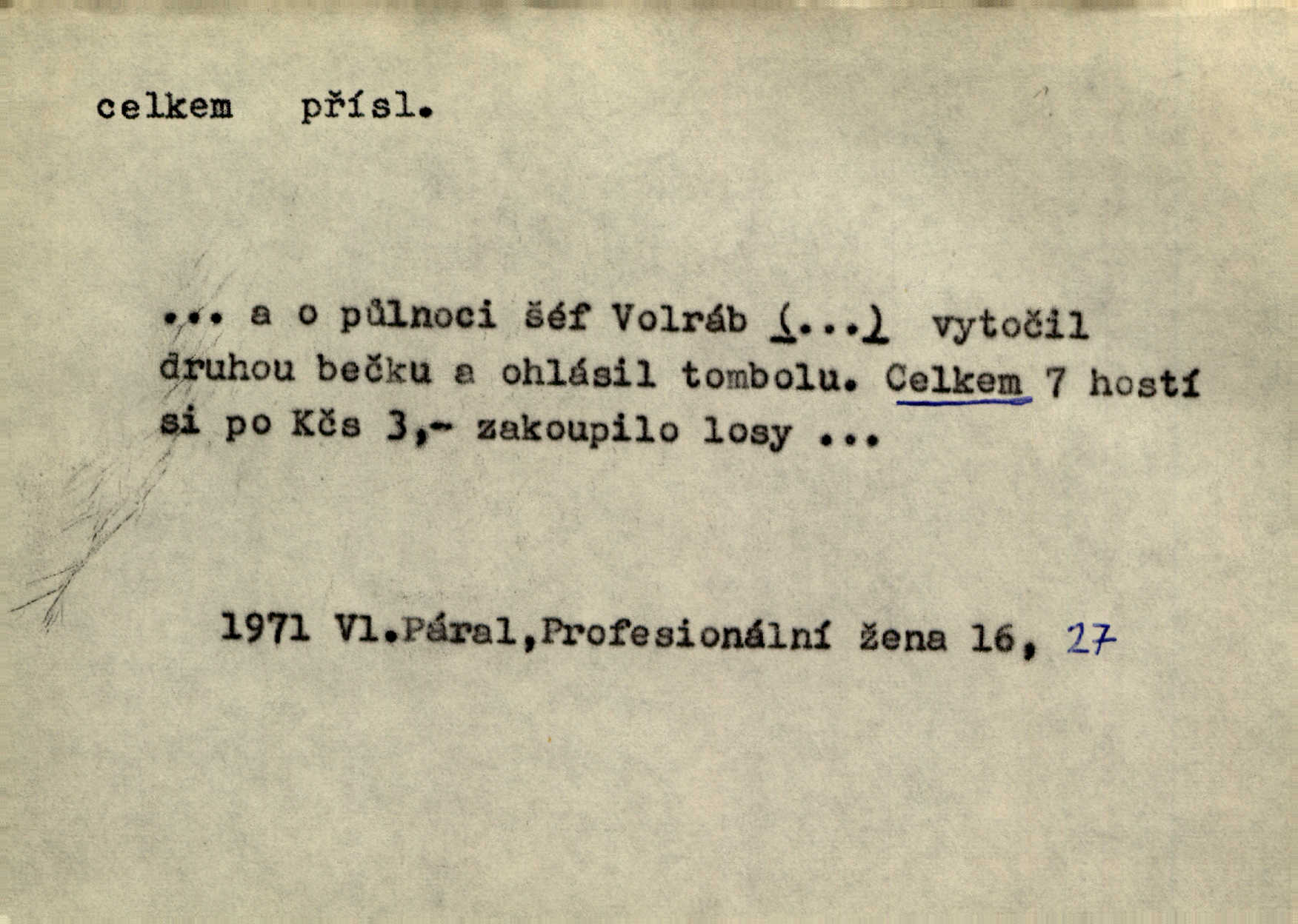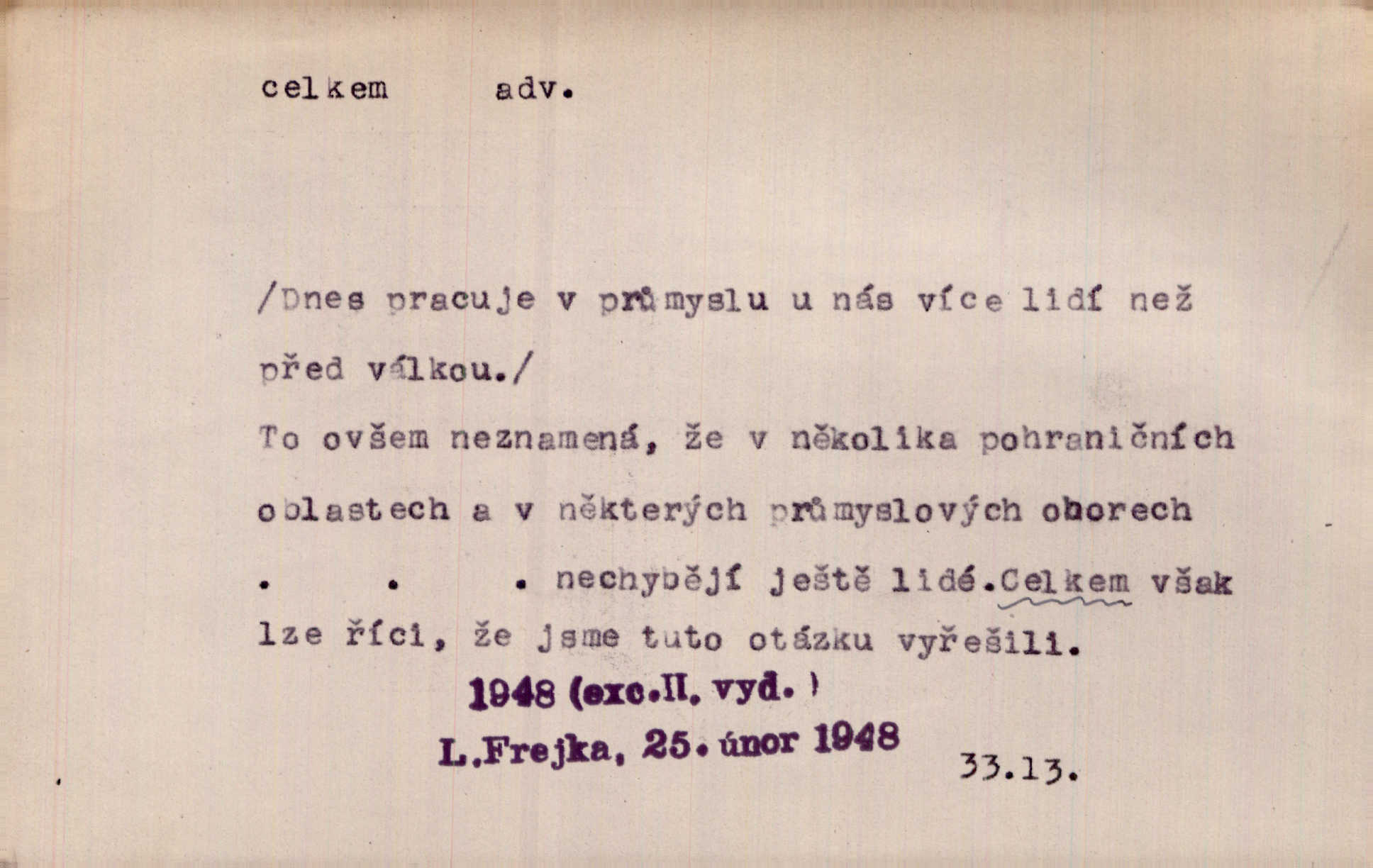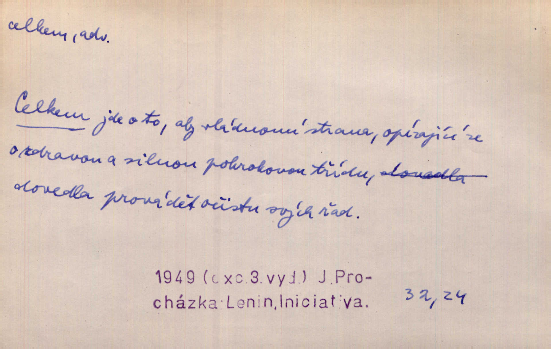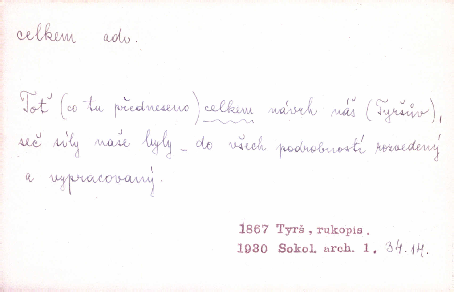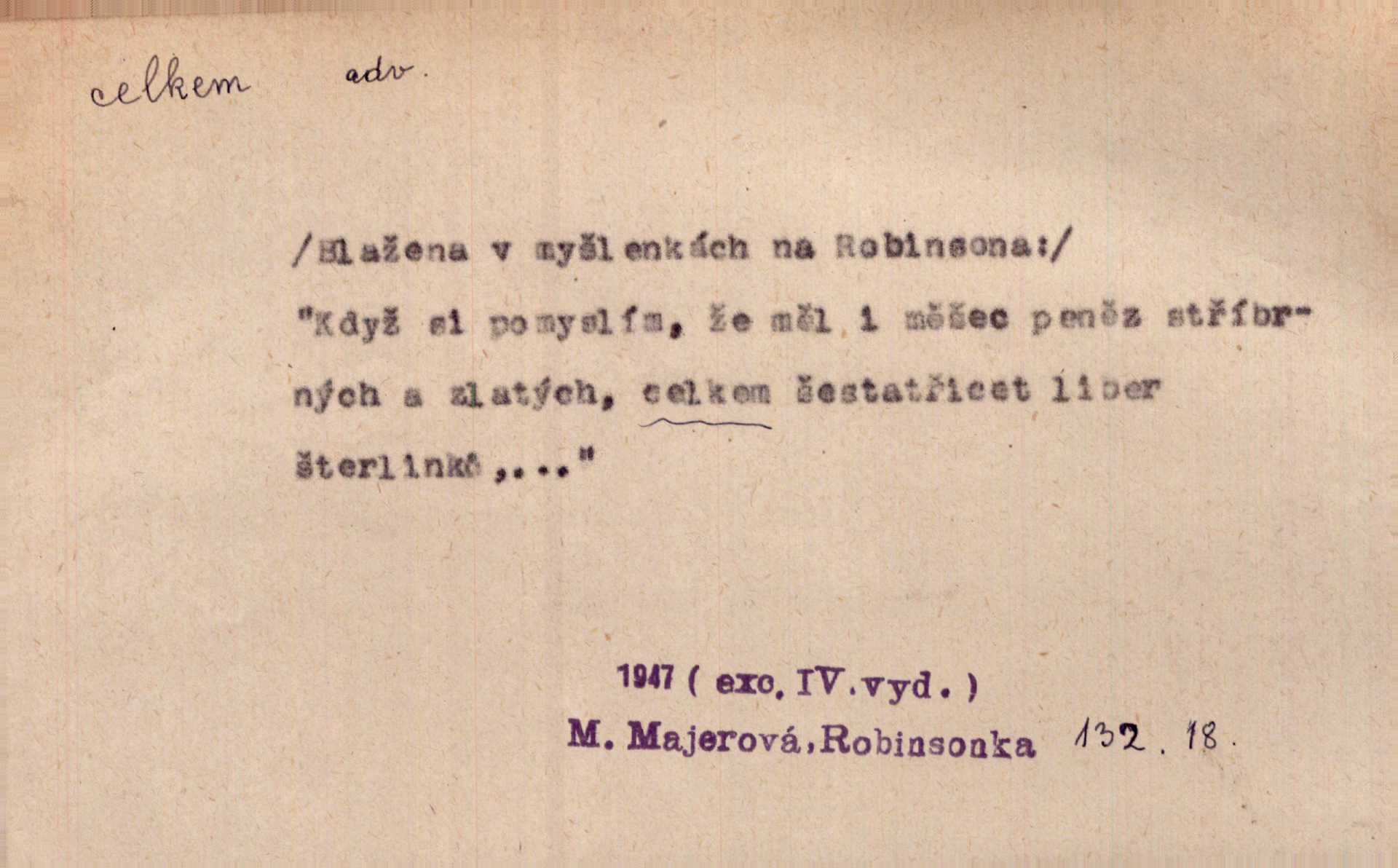 - celkem adv. úhrnem. Celkem možná říci, že byla zvědavost Dlugošova divně ukojena. Hál. Za ten čas se dávalo na divadle našem celkem 49 představení. Zl. Praha. Celkem celků však opravil Larvin v lecčems své iluse o milovaném mistrovi. Čap. Ch. D zhruba, přibližně, asi. Typograf, autor, roznašeč i trafikant, který žurnál prodává, jsou si celkem rovni. V. Mrš. Bylť [Říha] celkem člověk nepříliš přívětivý. Šmil. Upejpá se Hanýša, ale celkem se nezlobí. Herb. D Arch. v celku, úplně. Nejhlavnější [z Kapistranových žádostí] byla, aby papež zrušil celkem kompaktáta. Tomek.