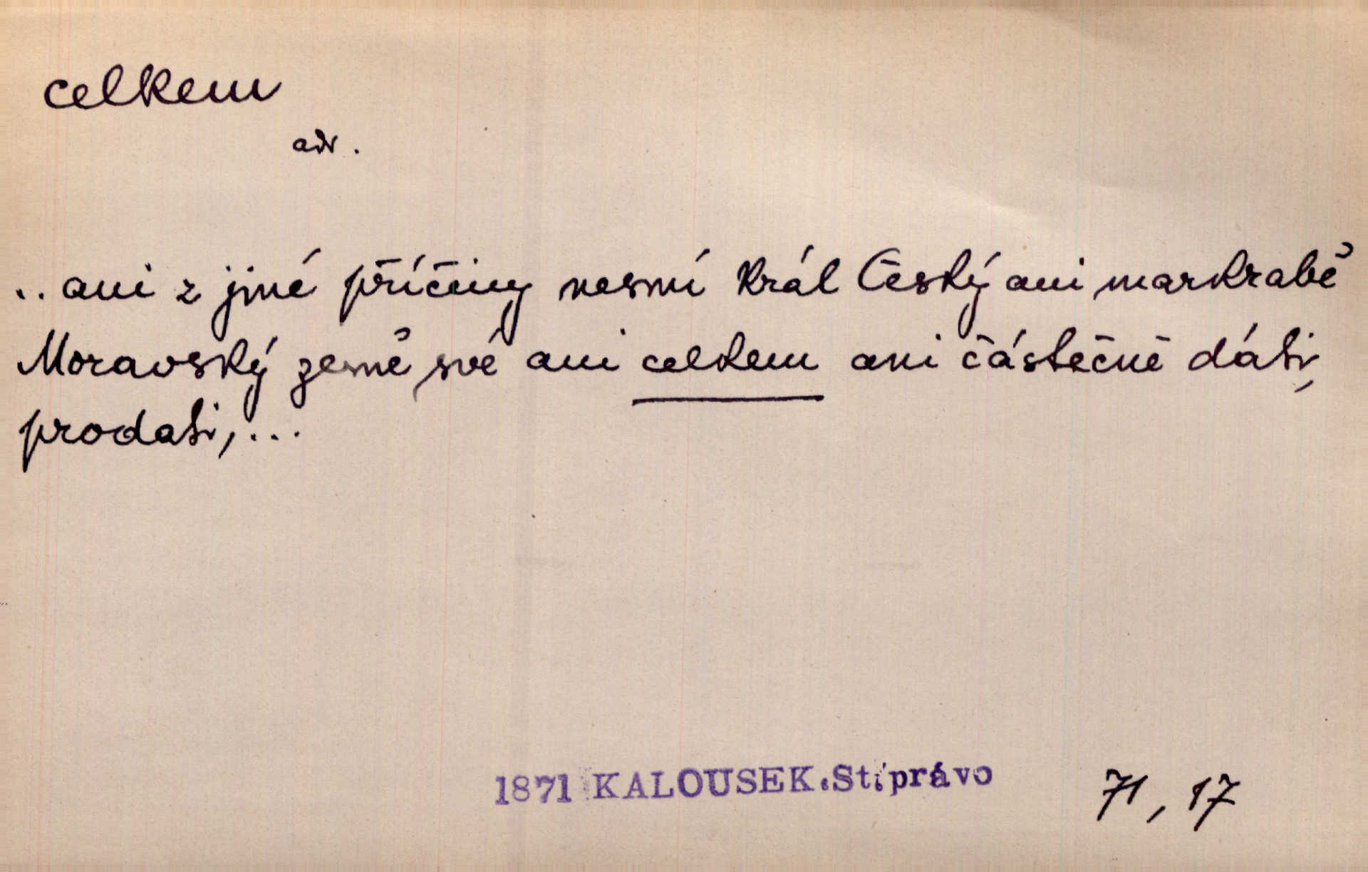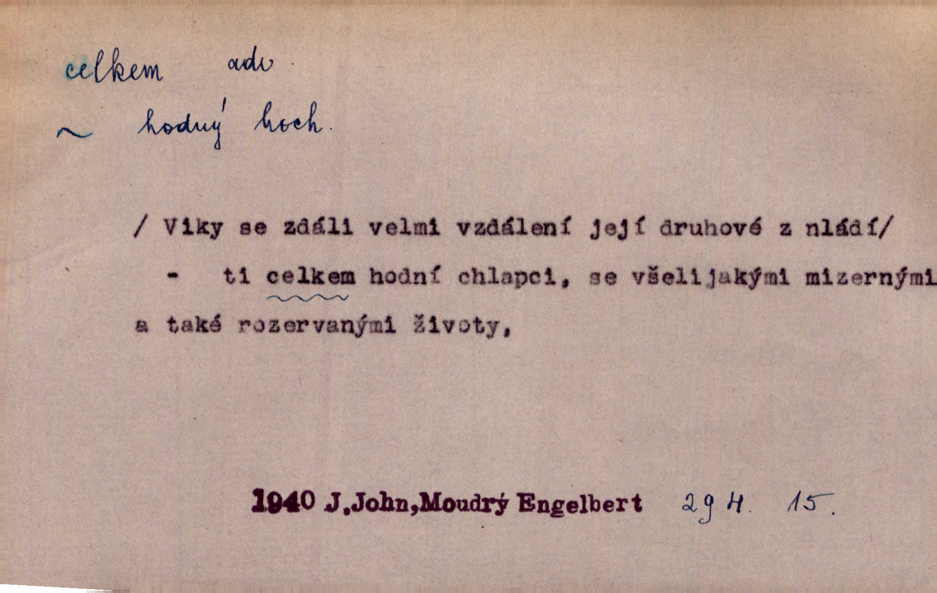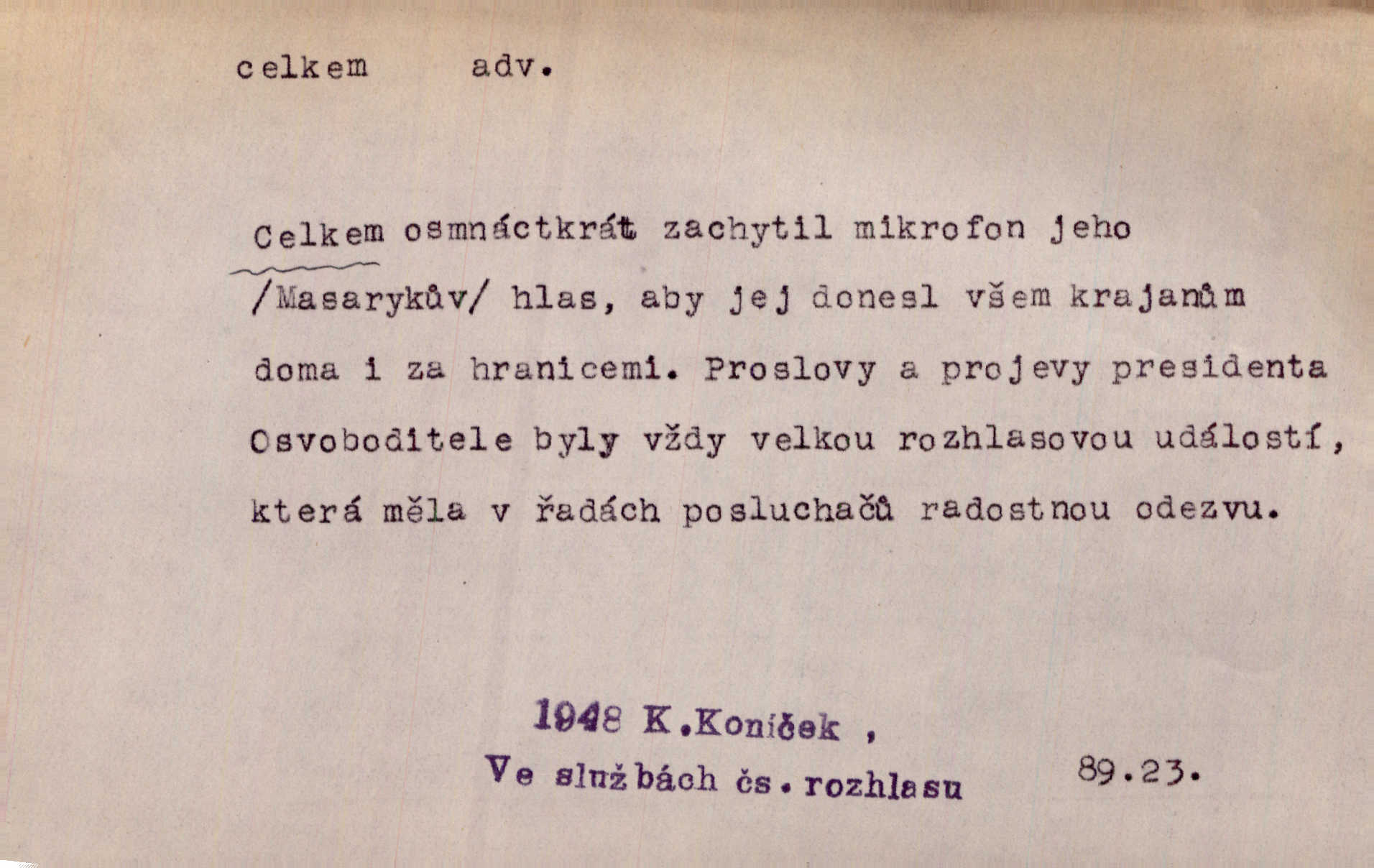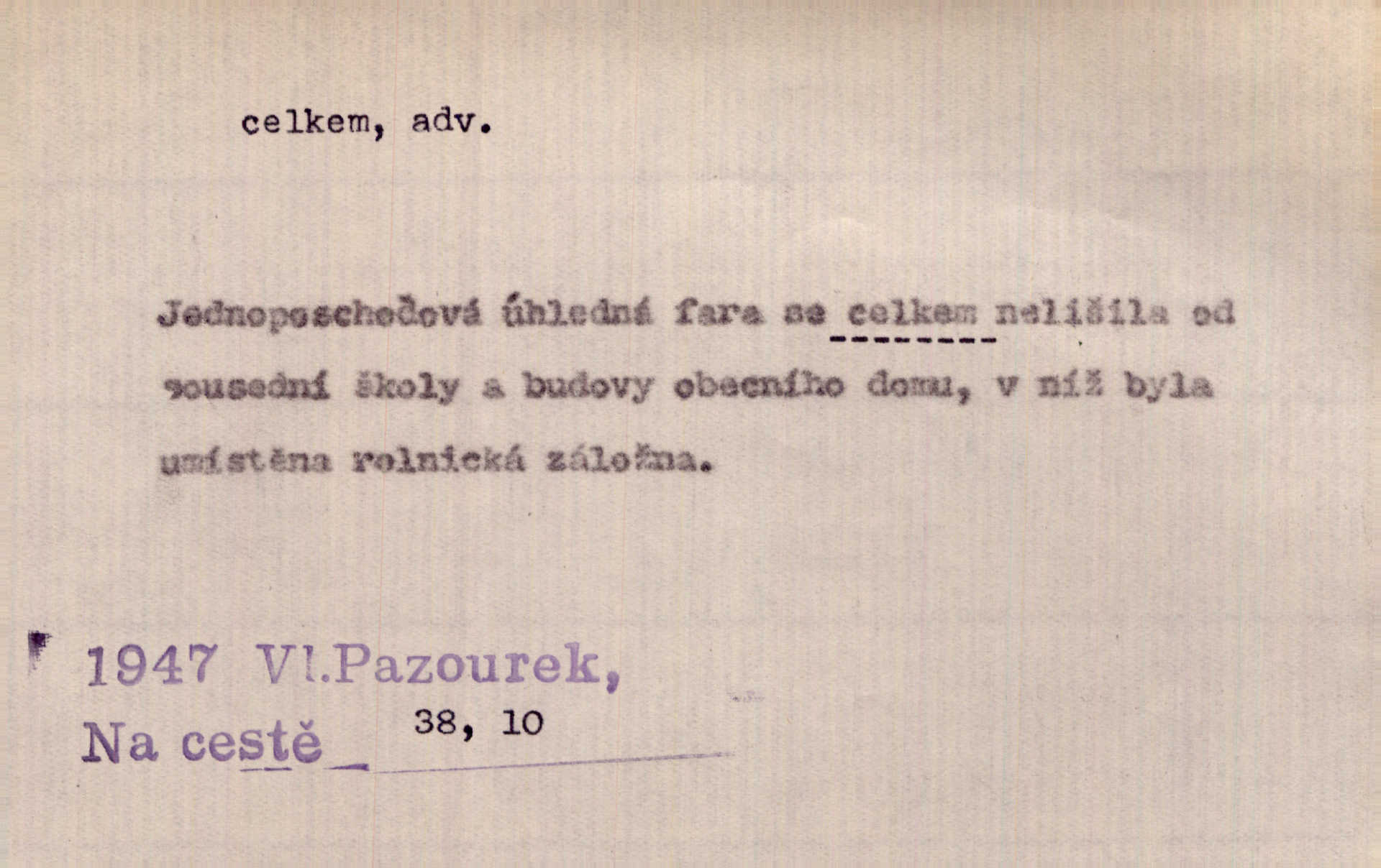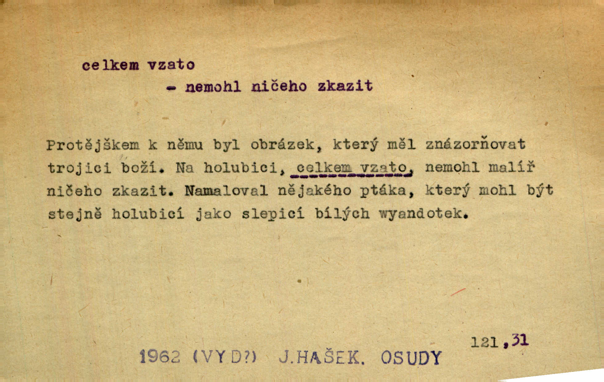- celkem adv. úhrnem. Celkem možná říci, že byla zvědavost Dlugošova divně ukojena. Hál. Za ten čas se dávalo na divadle našem celkem 49 představení. Zl. Praha. Celkem celků však opravil Larvin v lecčems své iluse o milovaném mistrovi. Čap. Ch. D zhruba, přibližně, asi. Typograf, autor, roznašeč i trafikant, který žurnál prodává, jsou si celkem rovni. V. Mrš. Bylť [Říha] celkem člověk nepříliš přívětivý. Šmil. Upejpá se Hanýša, ale celkem se nezlobí. Herb. D Arch. v celku, úplně. Nejhlavnější [z Kapistranových žádostí] byla, aby papež zrušil celkem kompaktáta. Tomek.