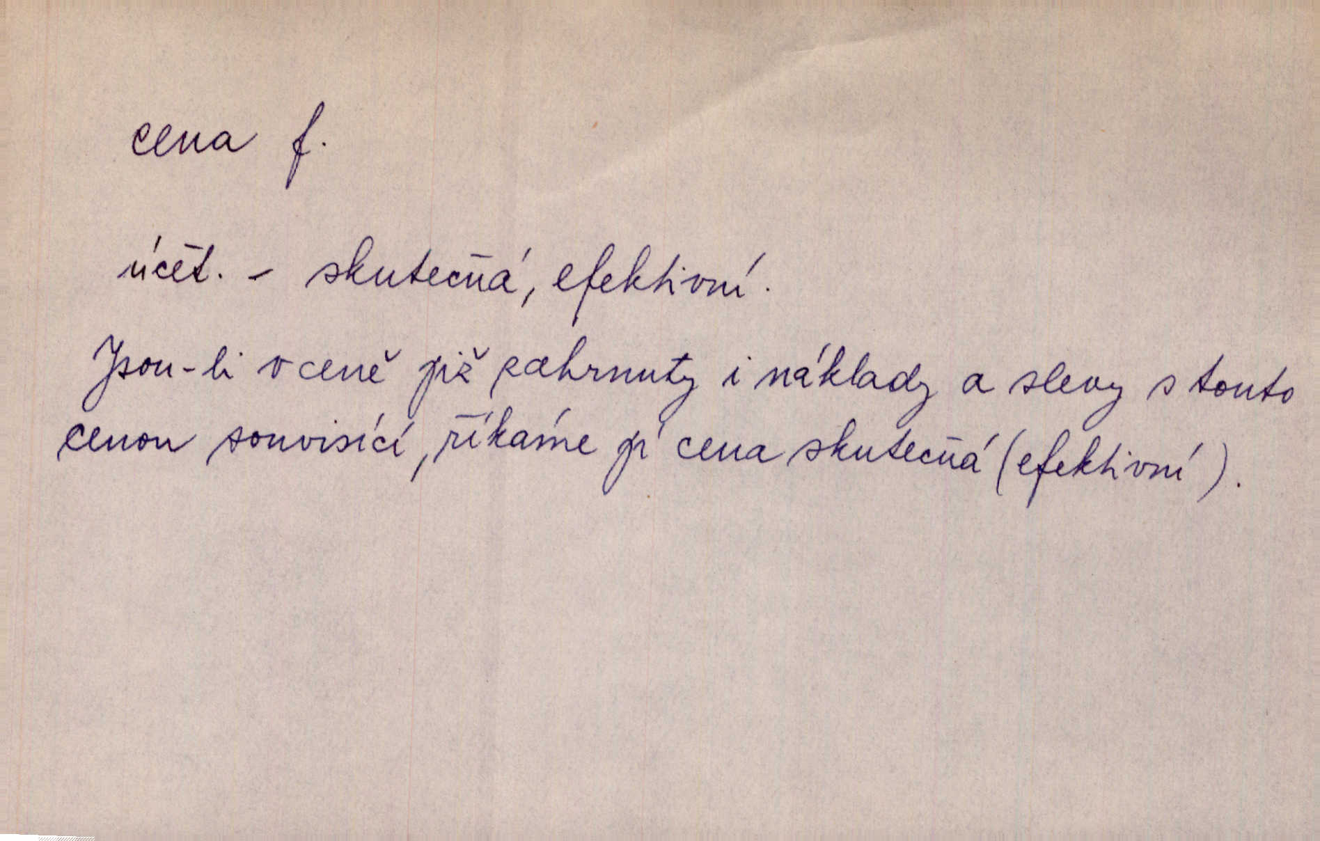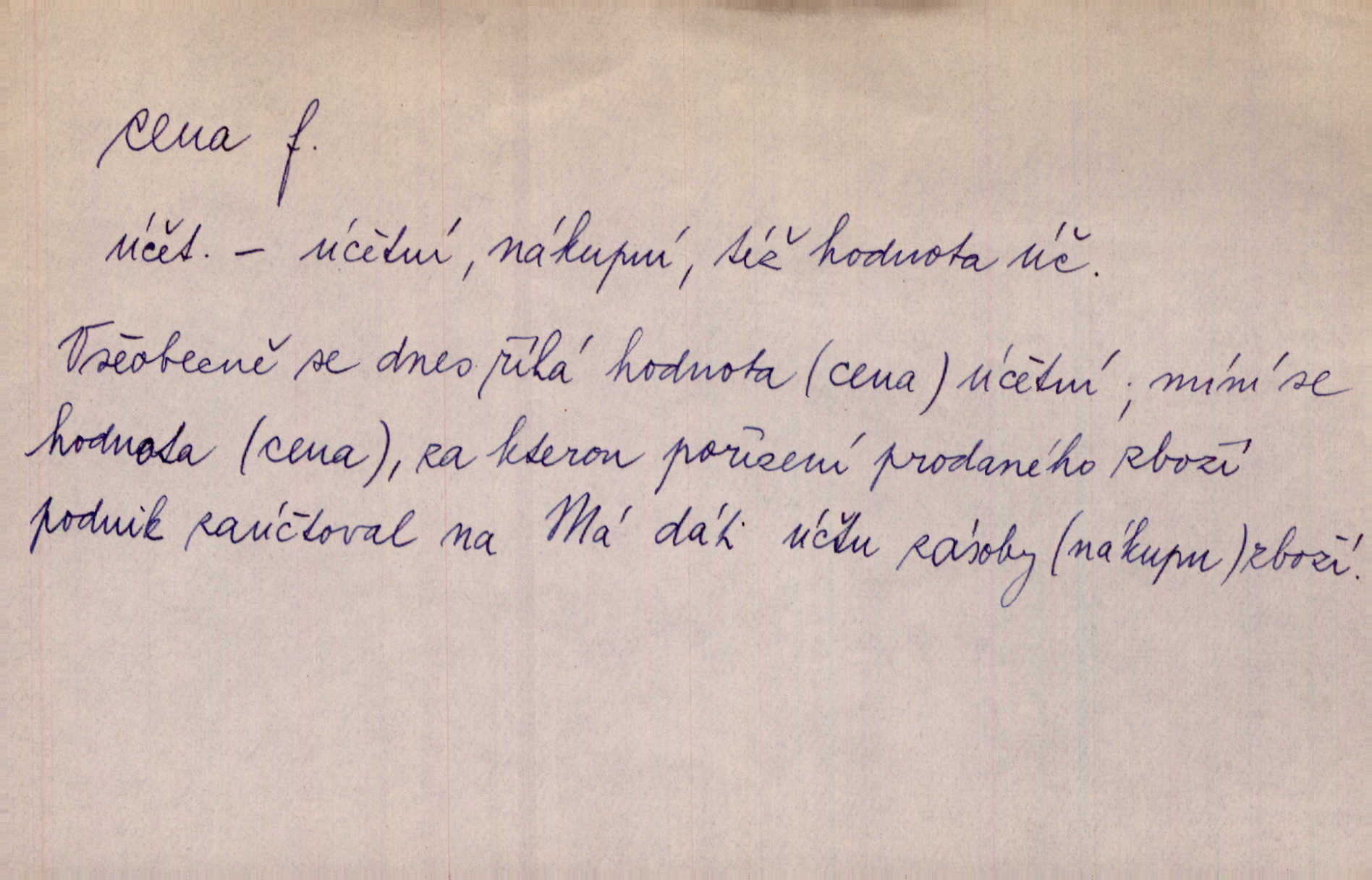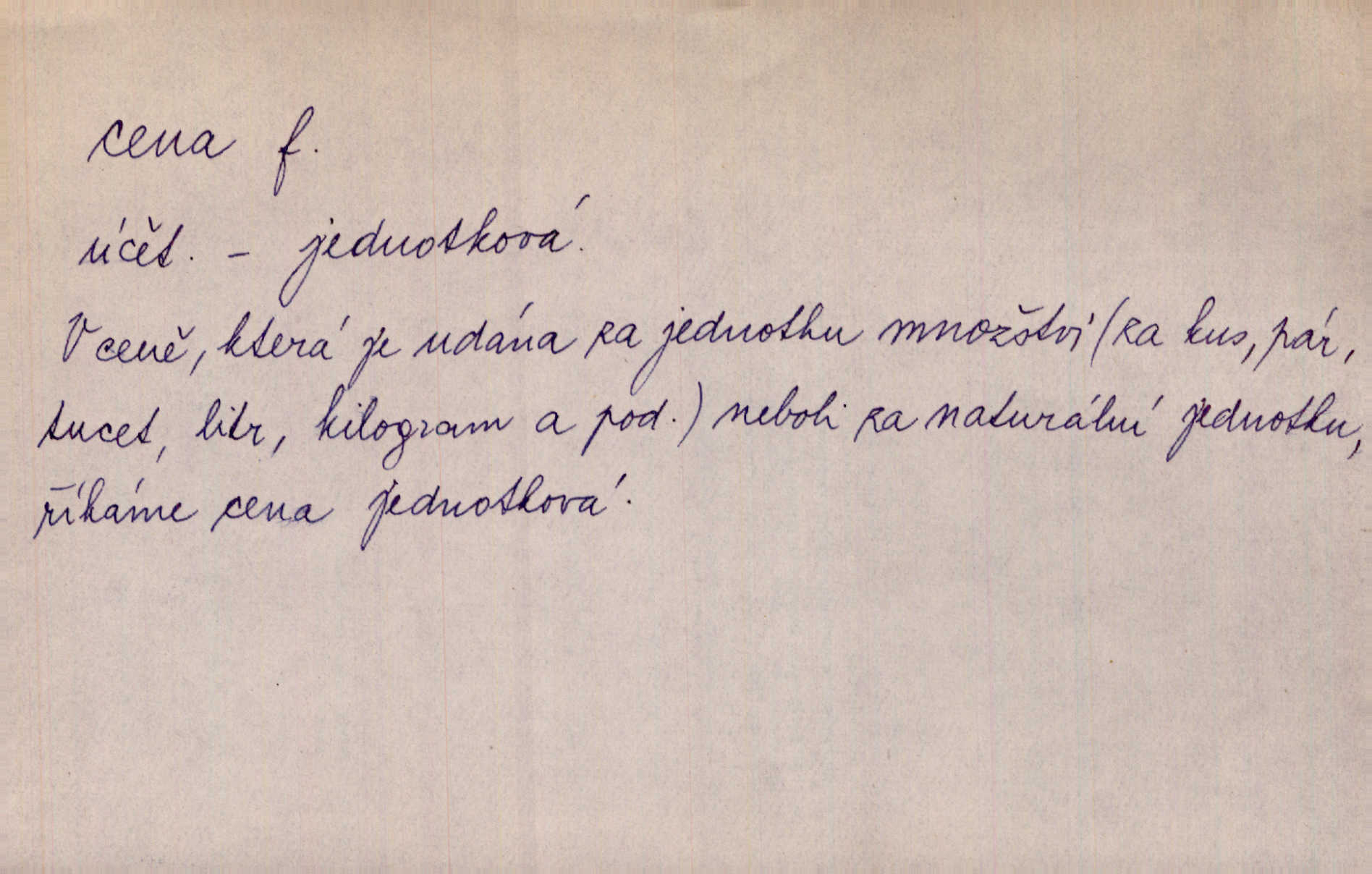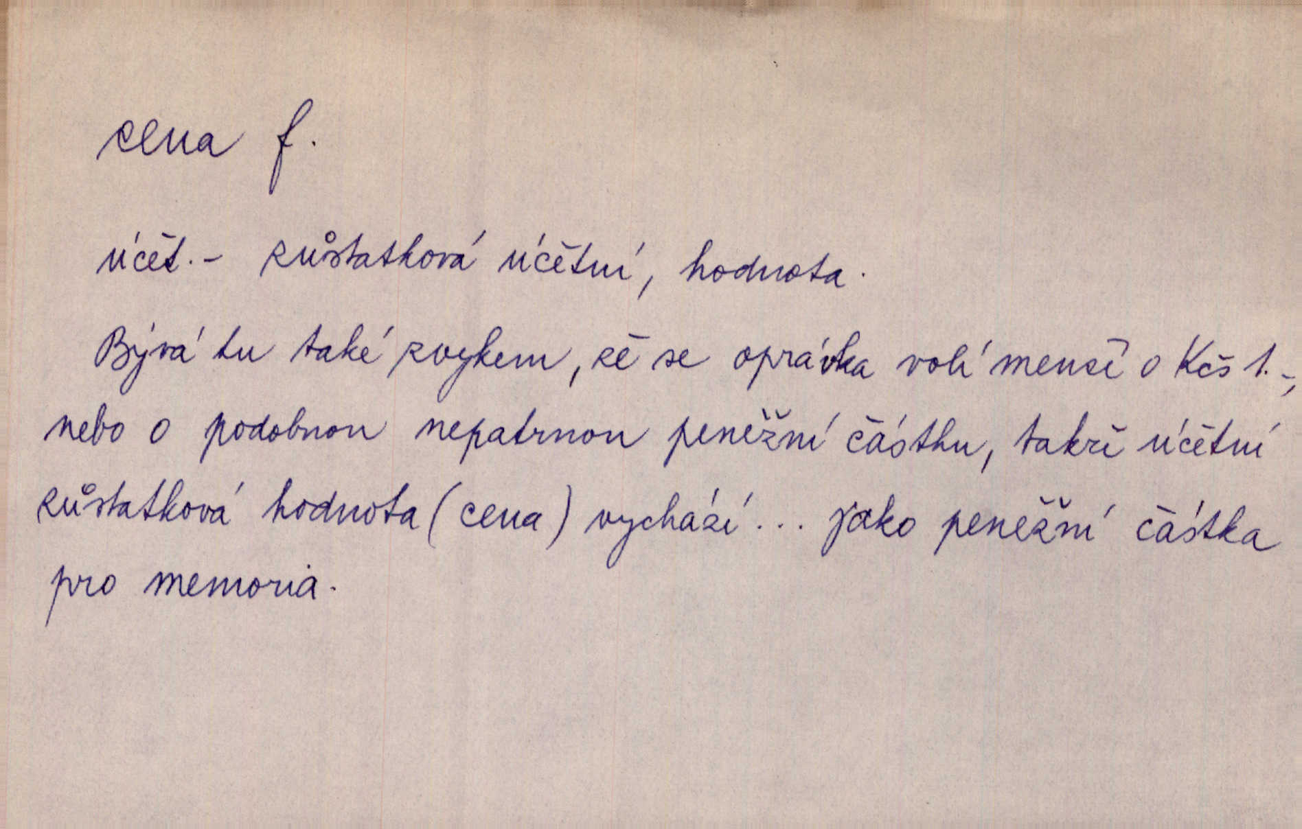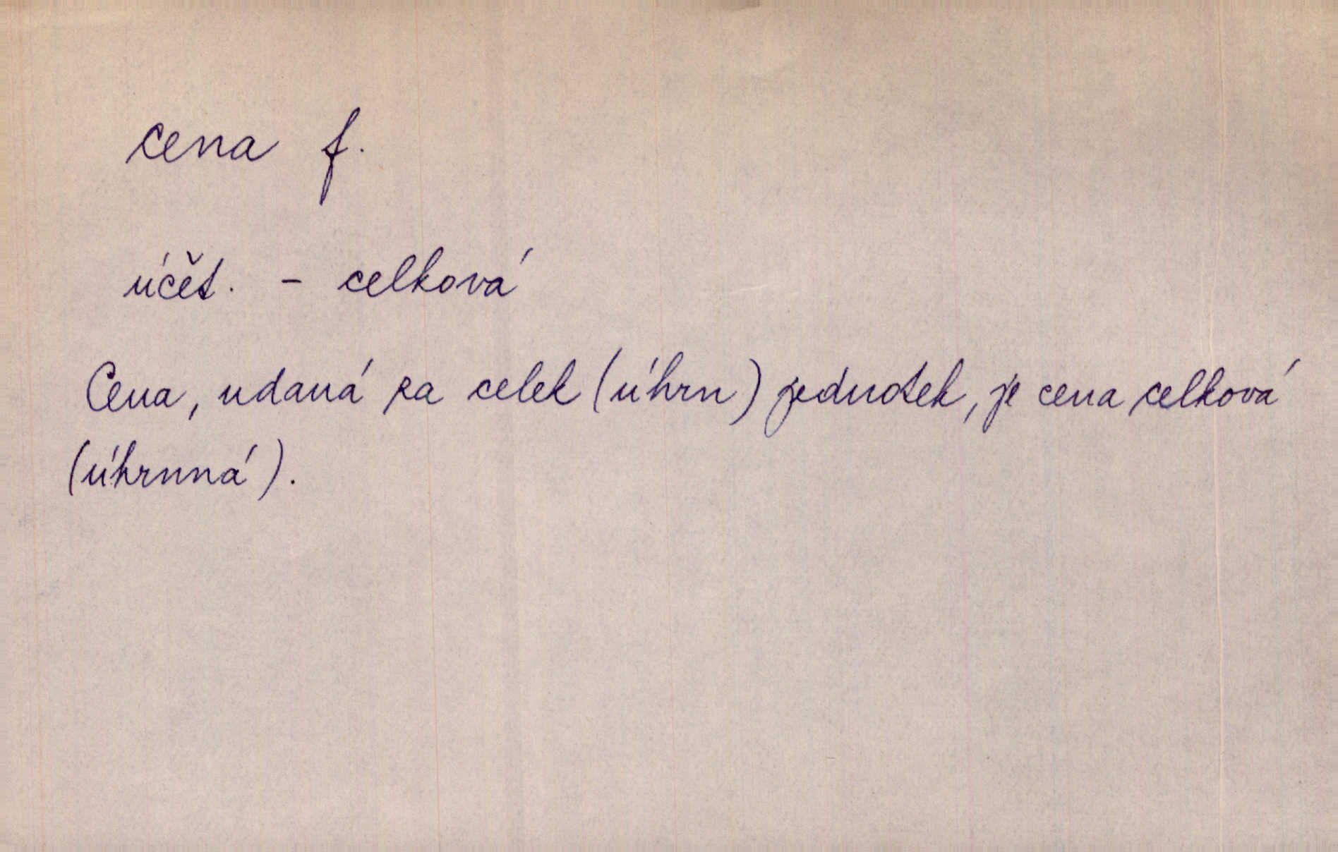 - cena, -y f. peněžní hodnota věci. Smluvili se o cenu statku, jejž rychtář kupoval. Hál. Ceny kuchyňských potřeb. Rais. Ceny na jídelním lístku. Prodávati za pevné, vysoké, nízké, levné, mírné, snížené, poloviční ceny. Koupím za každou cenu. Neprodám to za žádnou cenu. Výrobní, nákupní, režijní, prodejní, tovární, tržní (trhová), skutečná cena zboží. Sleviti s ceny. Snížiti, zvýšiti ceny. Prodávati pod cenou. Cena zboží klesá, stoupá. Obilí stouplo, kleslo, spadlo v ceně. Zboží tratí, ztratilo na ceně. Přen. Hájiti něco i za cenu popularity, lépe: třebas to stálo popularitu. Provésti něco i za cenu života, lépe: i kdyby to stálo život. Kde není řeč o kupní ceně, je za rčení za každou cenu správněji stůj co stůj, buď jak buď a za rčení za žádnou cenu správněji za nic na světě, nikterak, pod žádnou podmínkou. Umínil jsem si zachovati za každou cenu klid. Šlej. Boj je nutno dobojovati za každou cenu. Dyk. Dámy by za žádnou cenu nebyly česky promluvily. Ner. Koketování toho druhu netrpím za žádnou cenu. Kun. D vnitřní hodnota, význam, důležitost věci. Barvotisky pochybné ceny. Jir. Přišla v očích vlastních o všechnu cenu a důležitost, o všechen význam. Svět. V tomto majestátním klidu vidím vysokou morální cenu anglického románu. V. Mrš. Život nemá pro mne nijaké ceny. Čech. D odměna (získaná v soutěži a p.). Komise přiřkla první cenu za plán městské radnice. Staš. Báseň cenou poctěná. Čestná cena. Ucházeti se o cenu. Vypsati cenu na (za) nejlepší knihu pro mládež. Obyvatelstvo briganty nezradí, i kdyby byla sebe větší cena na hlavy jejich vypsána. Mach.