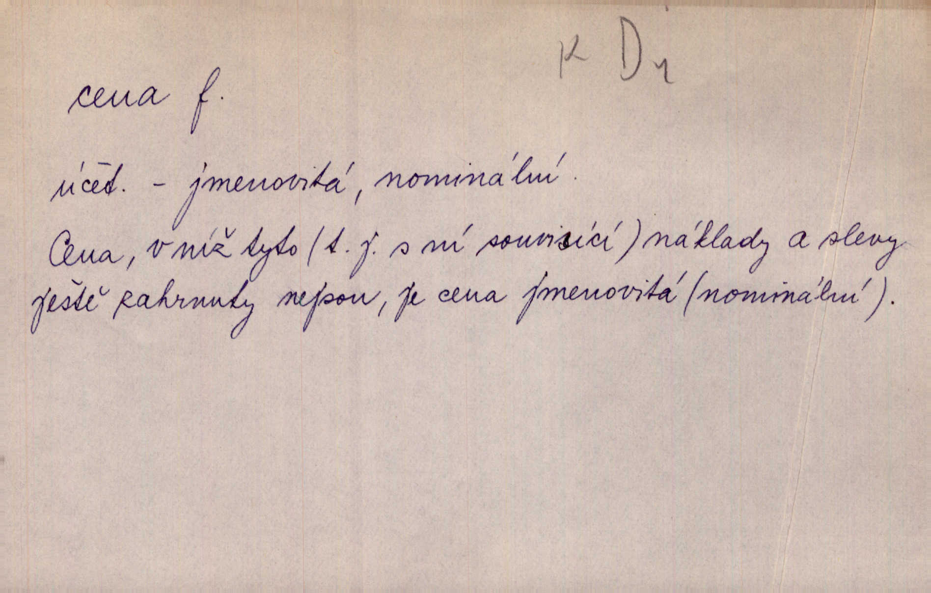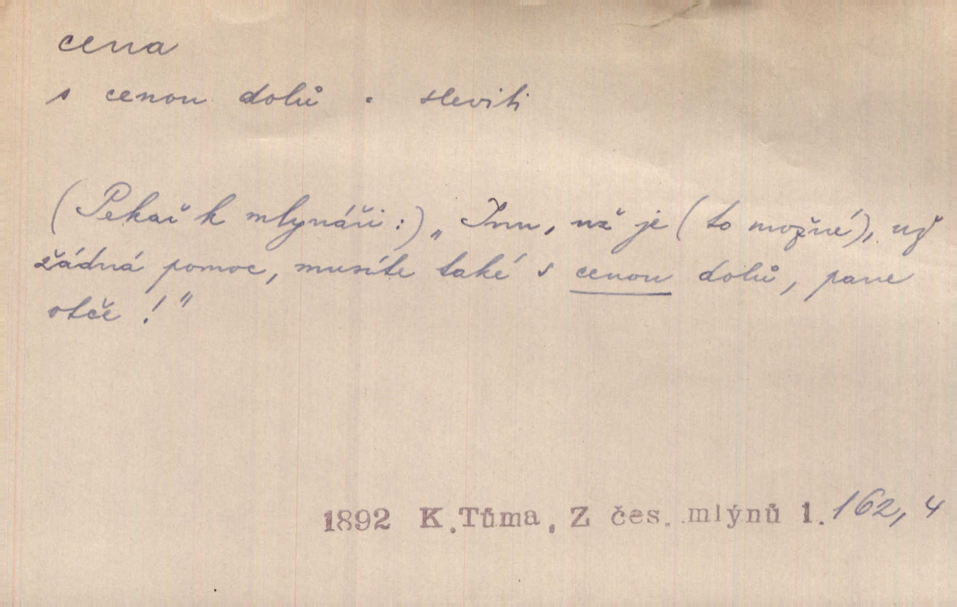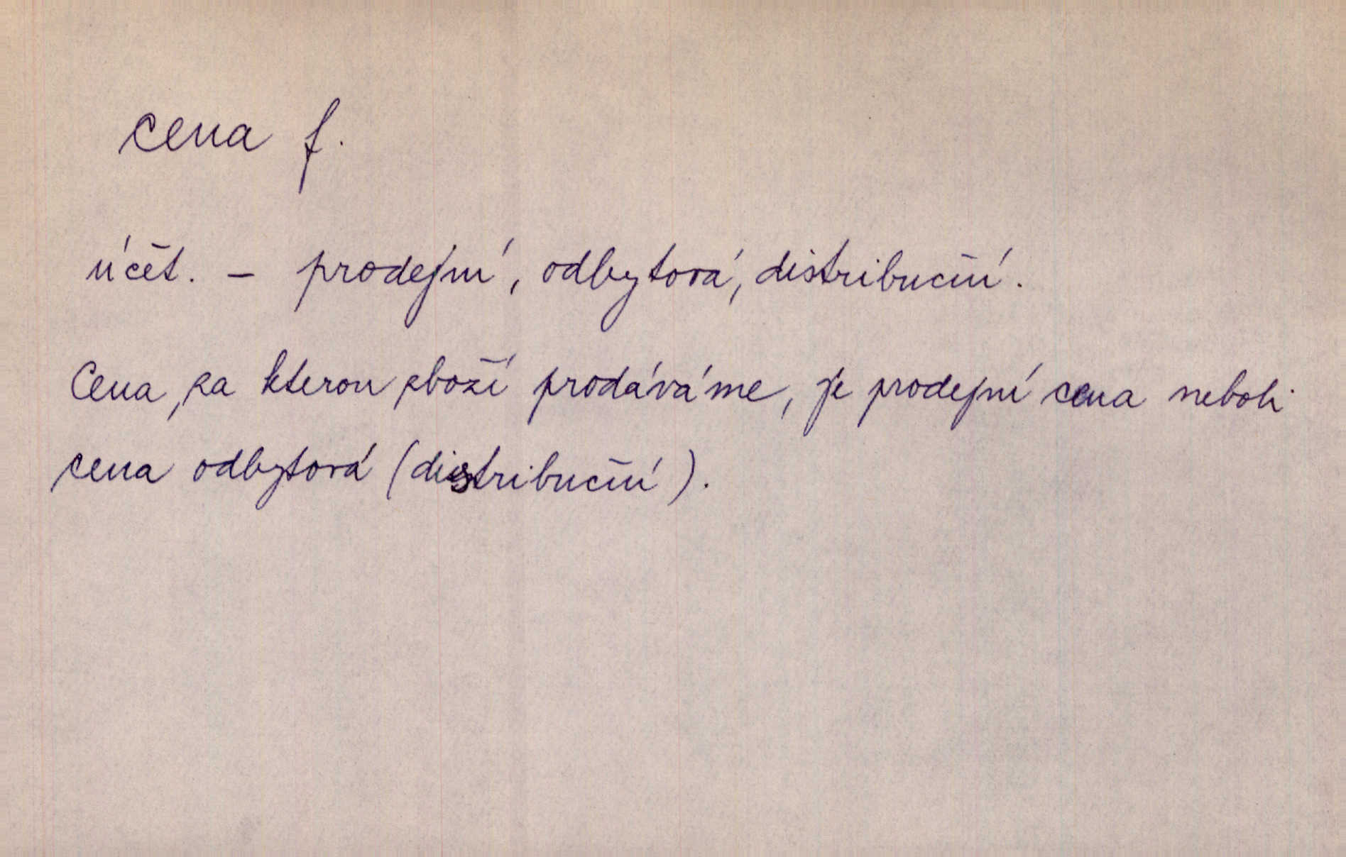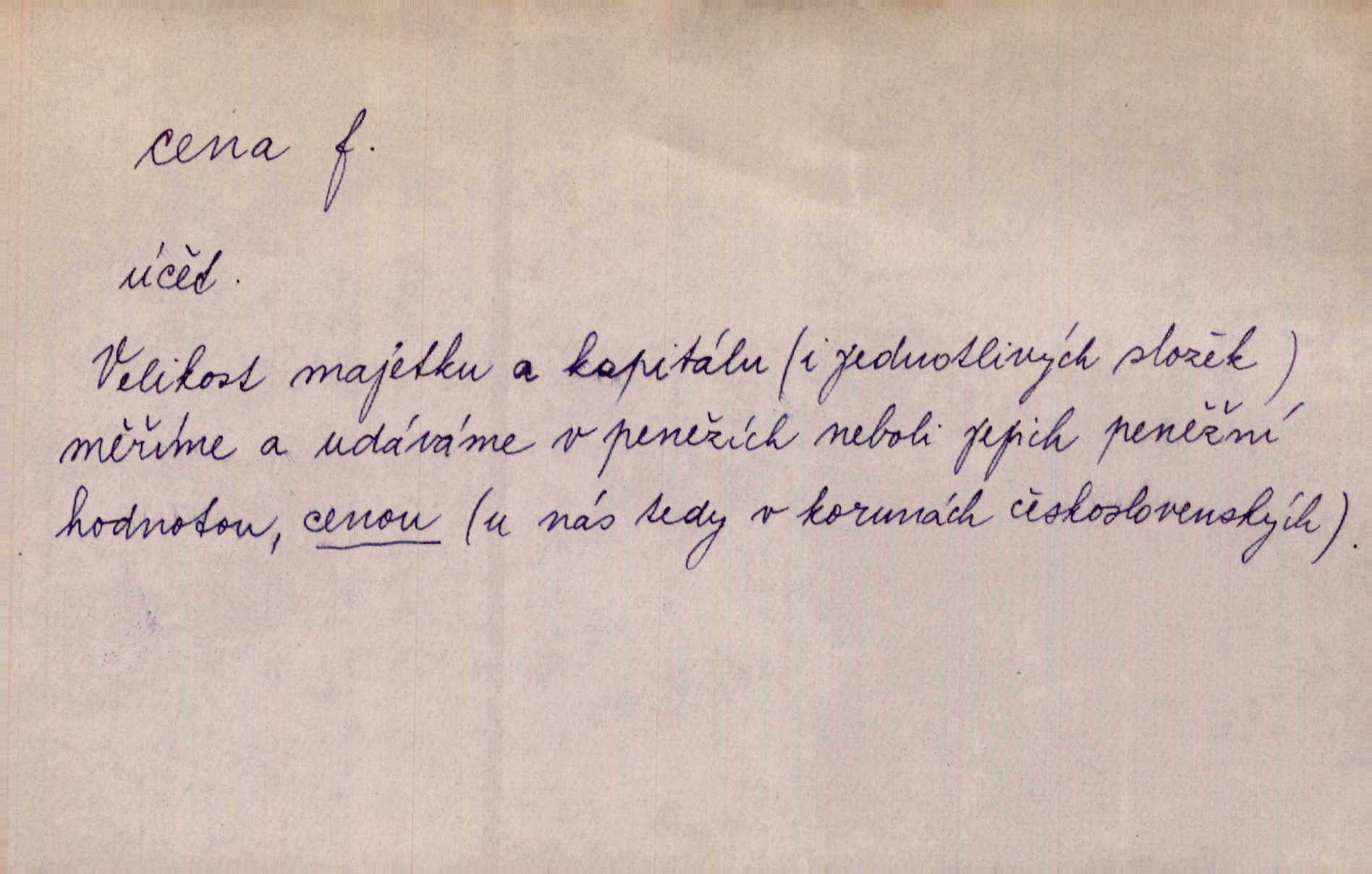 - cena, -y f. peněžní hodnota věci. Smluvili se o cenu statku, jejž rychtář kupoval. Hál. Ceny kuchyňských potřeb. Rais. Ceny na jídelním lístku. Prodávati za pevné, vysoké, nízké, levné, mírné, snížené, poloviční ceny. Koupím za každou cenu. Neprodám to za žádnou cenu. Výrobní, nákupní, režijní, prodejní, tovární, tržní (trhová), skutečná cena zboží. Sleviti s ceny. Snížiti, zvýšiti ceny. Prodávati pod cenou. Cena zboží klesá, stoupá. Obilí stouplo, kleslo, spadlo v ceně. Zboží tratí, ztratilo na ceně. Přen. Hájiti něco i za cenu popularity, lépe: třebas to stálo popularitu. Provésti něco i za cenu života, lépe: i kdyby to stálo život. Kde není řeč o kupní ceně, je za rčení za každou cenu správněji stůj co stůj, buď jak buď a za rčení za žádnou cenu správněji za nic na světě, nikterak, pod žádnou podmínkou. Umínil jsem si zachovati za každou cenu klid. Šlej. Boj je nutno dobojovati za každou cenu. Dyk. Dámy by za žádnou cenu nebyly česky promluvily. Ner. Koketování toho druhu netrpím za žádnou cenu. Kun. D vnitřní hodnota, význam, důležitost věci. Barvotisky pochybné ceny. Jir. Přišla v očích vlastních o všechnu cenu a důležitost, o všechen význam. Svět. V tomto majestátním klidu vidím vysokou morální cenu anglického románu. V. Mrš. Život nemá pro mne nijaké ceny. Čech. D odměna (získaná v soutěži a p.). Komise přiřkla první cenu za plán městské radnice. Staš. Báseň cenou poctěná. Čestná cena. Ucházeti se o cenu. Vypsati cenu na (za) nejlepší knihu pro mládež. Obyvatelstvo briganty nezradí, i kdyby byla sebe větší cena na hlavy jejich vypsána. Mach.