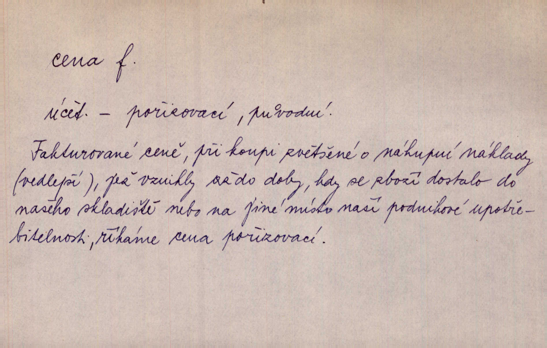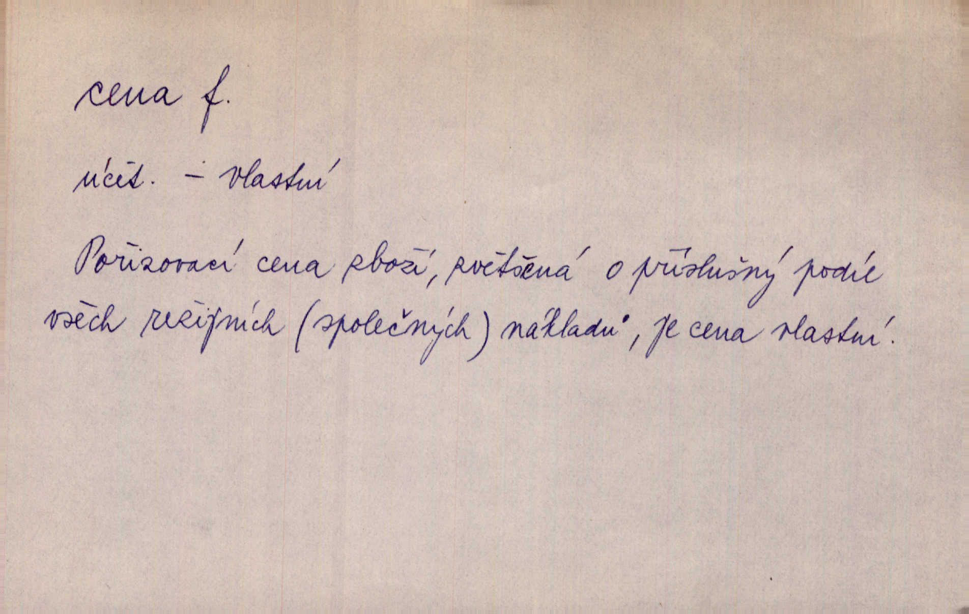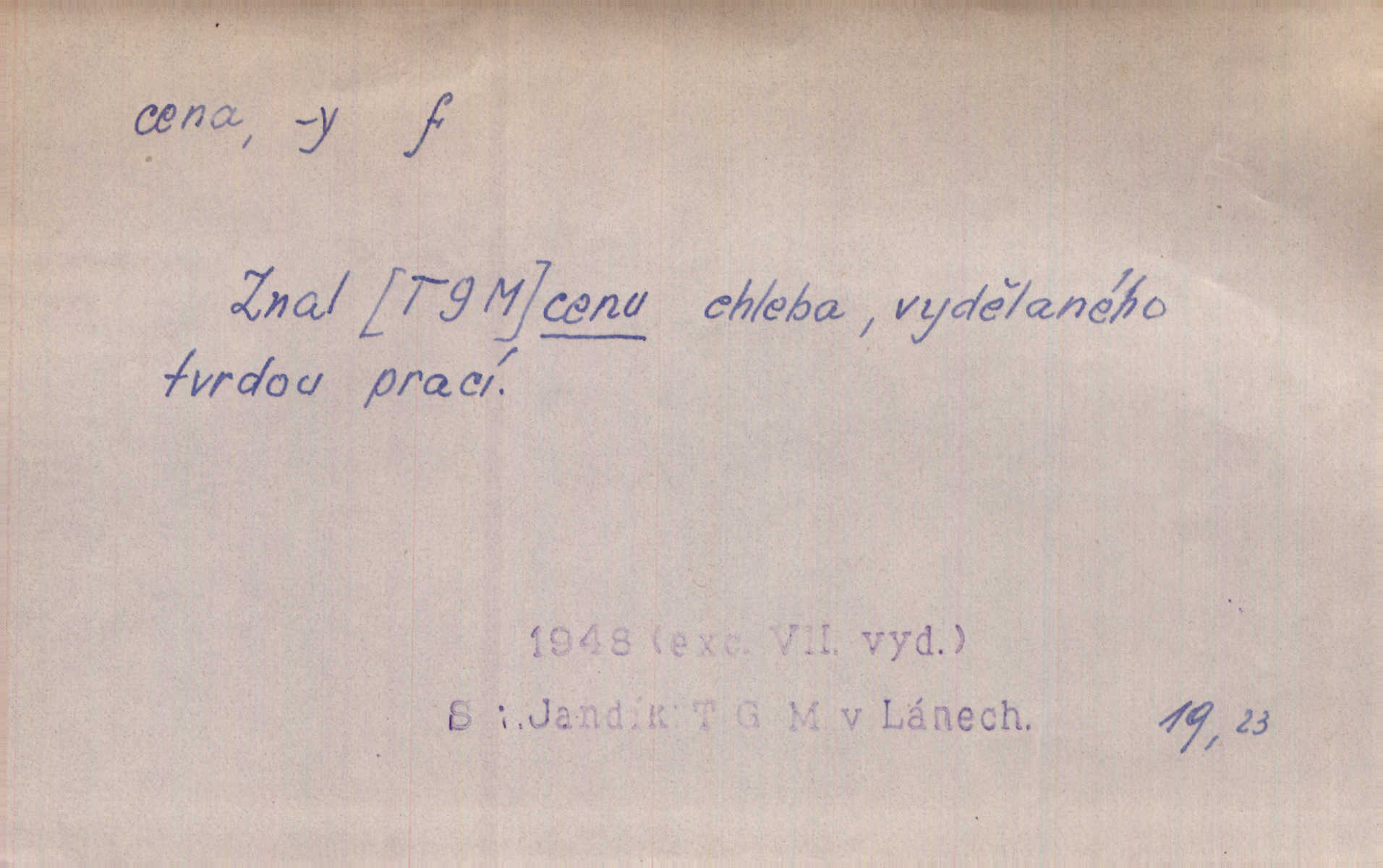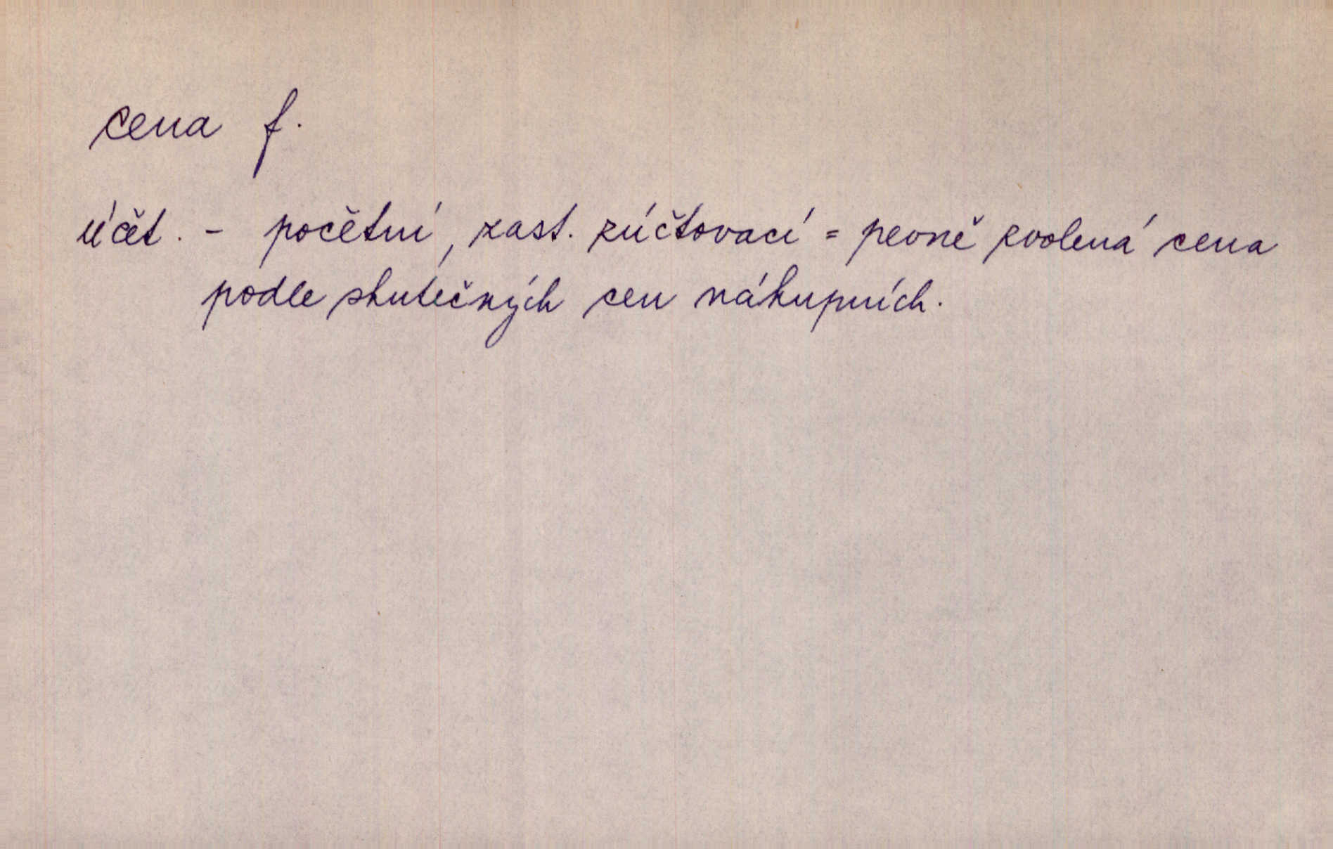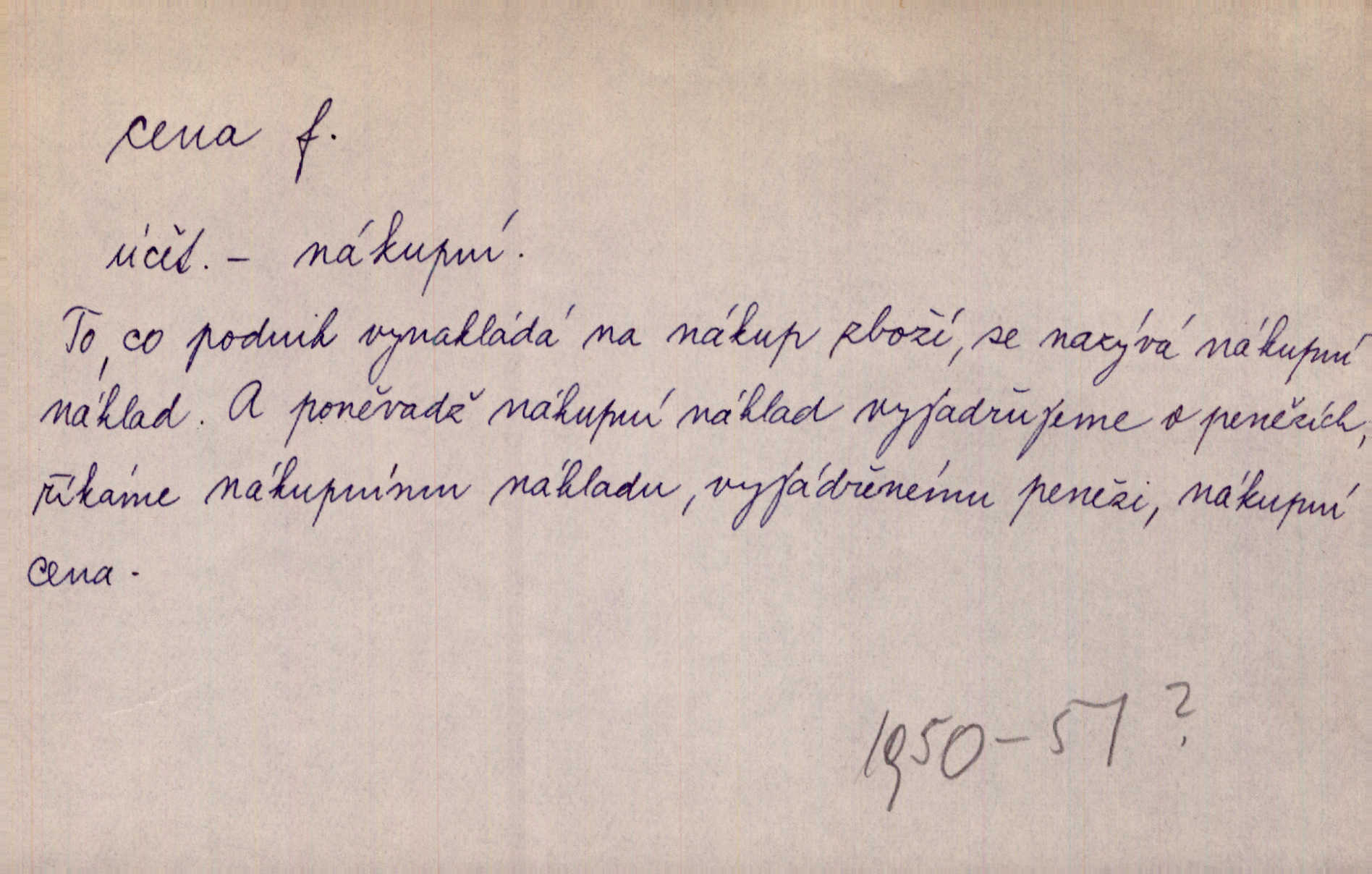 - cena, -y f. peněžní hodnota věci. Smluvili se o cenu statku, jejž rychtář kupoval. Hál. Ceny kuchyňských potřeb. Rais. Ceny na jídelním lístku. Prodávati za pevné, vysoké, nízké, levné, mírné, snížené, poloviční ceny. Koupím za každou cenu. Neprodám to za žádnou cenu. Výrobní, nákupní, režijní, prodejní, tovární, tržní (trhová), skutečná cena zboží. Sleviti s ceny. Snížiti, zvýšiti ceny. Prodávati pod cenou. Cena zboží klesá, stoupá. Obilí stouplo, kleslo, spadlo v ceně. Zboží tratí, ztratilo na ceně. Přen. Hájiti něco i za cenu popularity, lépe: třebas to stálo popularitu. Provésti něco i za cenu života, lépe: i kdyby to stálo život. Kde není řeč o kupní ceně, je za rčení za každou cenu správněji stůj co stůj, buď jak buď a za rčení za žádnou cenu správněji za nic na světě, nikterak, pod žádnou podmínkou. Umínil jsem si zachovati za každou cenu klid. Šlej. Boj je nutno dobojovati za každou cenu. Dyk. Dámy by za žádnou cenu nebyly česky promluvily. Ner. Koketování toho druhu netrpím za žádnou cenu. Kun. D vnitřní hodnota, význam, důležitost věci. Barvotisky pochybné ceny. Jir. Přišla v očích vlastních o všechnu cenu a důležitost, o všechen význam. Svět. V tomto majestátním klidu vidím vysokou morální cenu anglického románu. V. Mrš. Život nemá pro mne nijaké ceny. Čech. D odměna (získaná v soutěži a p.). Komise přiřkla první cenu za plán městské radnice. Staš. Báseň cenou poctěná. Čestná cena. Ucházeti se o cenu. Vypsati cenu na (za) nejlepší knihu pro mládež. Obyvatelstvo briganty nezradí, i kdyby byla sebe větší cena na hlavy jejich vypsána. Mach.
