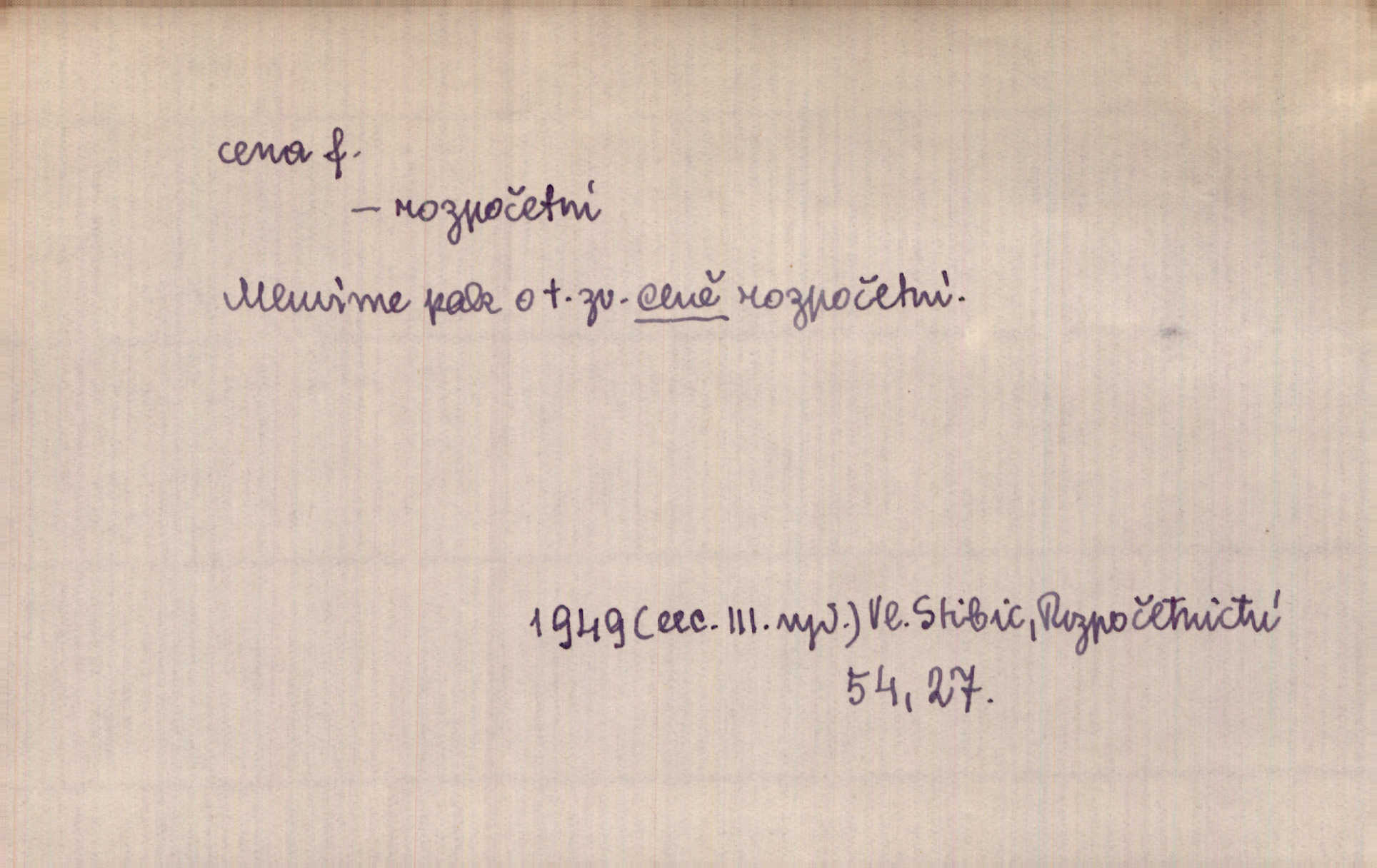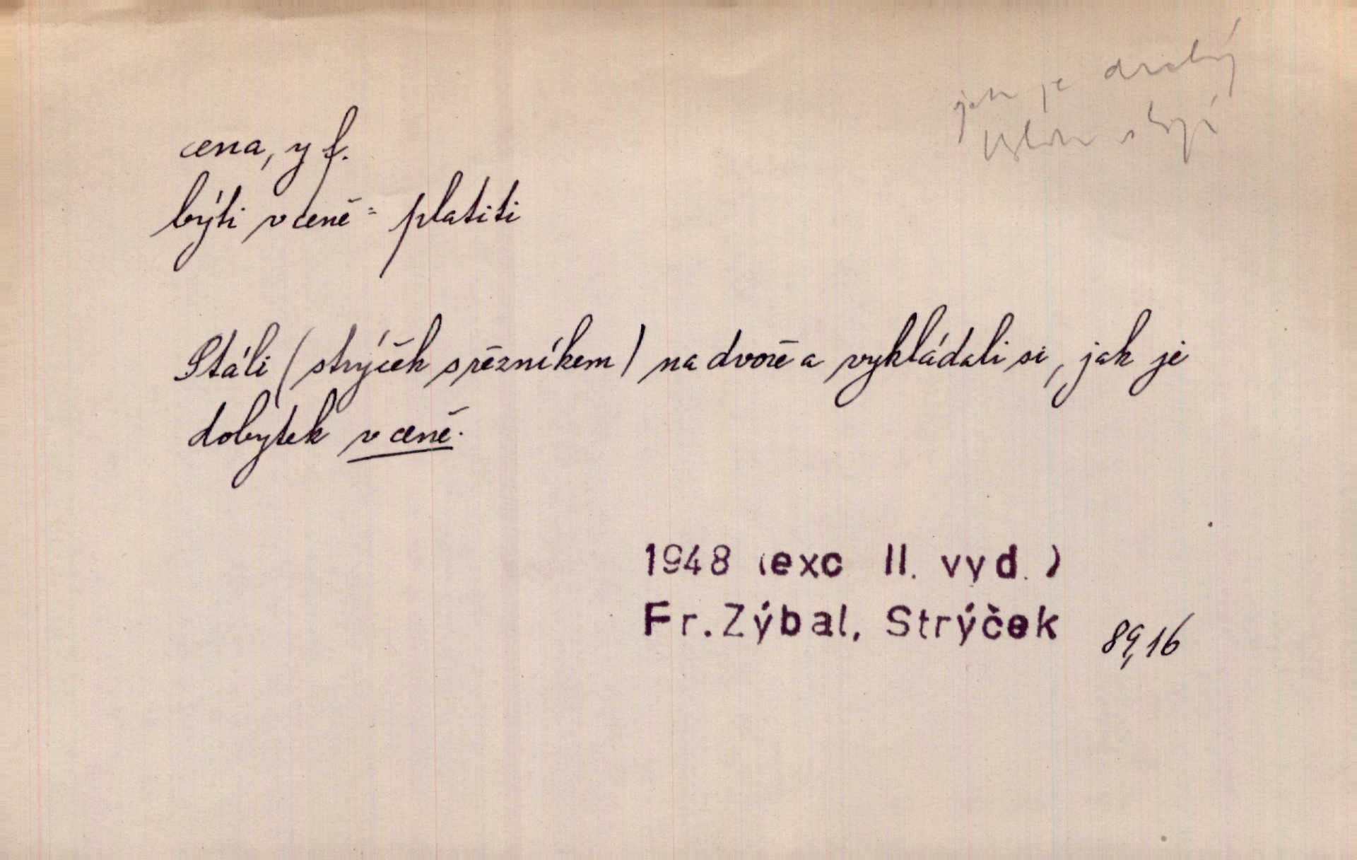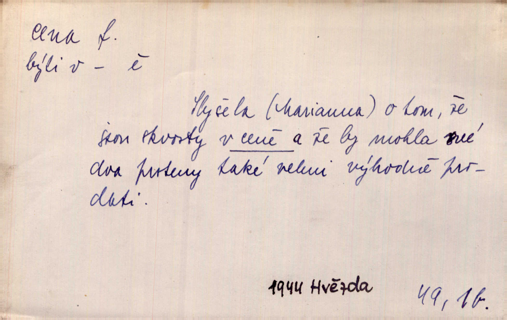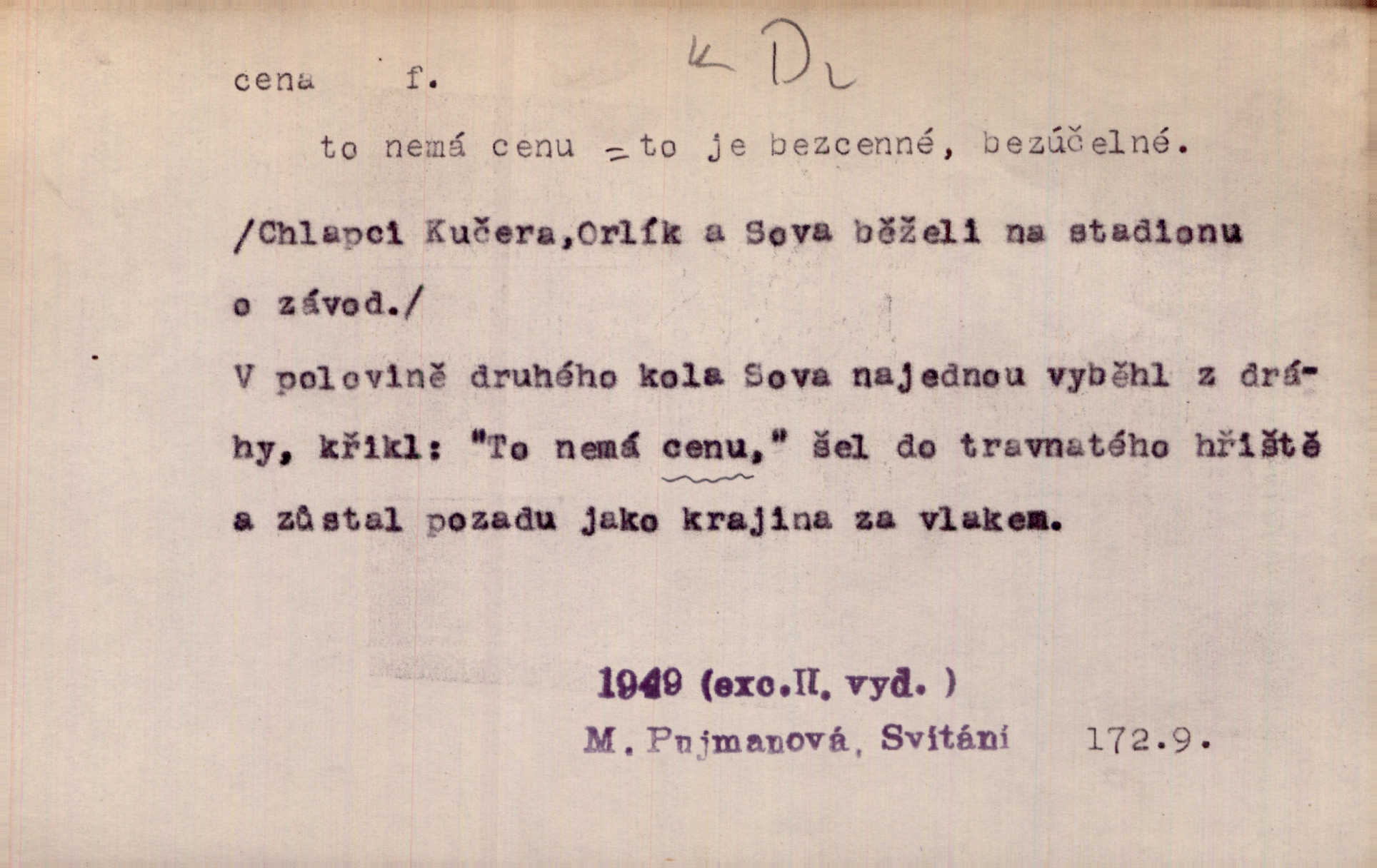 - cena, -y f. peněžní hodnota věci. Smluvili se o cenu statku, jejž rychtář kupoval. Hál. Ceny kuchyňských potřeb. Rais. Ceny na jídelním lístku. Prodávati za pevné, vysoké, nízké, levné, mírné, snížené, poloviční ceny. Koupím za každou cenu. Neprodám to za žádnou cenu. Výrobní, nákupní, režijní, prodejní, tovární, tržní (trhová), skutečná cena zboží. Sleviti s ceny. Snížiti, zvýšiti ceny. Prodávati pod cenou. Cena zboží klesá, stoupá. Obilí stouplo, kleslo, spadlo v ceně. Zboží tratí, ztratilo na ceně. Přen. Hájiti něco i za cenu popularity, lépe: třebas to stálo popularitu. Provésti něco i za cenu života, lépe: i kdyby to stálo život. Kde není řeč o kupní ceně, je za rčení za každou cenu správněji stůj co stůj, buď jak buď a za rčení za žádnou cenu správněji za nic na světě, nikterak, pod žádnou podmínkou. Umínil jsem si zachovati za každou cenu klid. Šlej. Boj je nutno dobojovati za každou cenu. Dyk. Dámy by za žádnou cenu nebyly česky promluvily. Ner. Koketování toho druhu netrpím za žádnou cenu. Kun. D vnitřní hodnota, význam, důležitost věci. Barvotisky pochybné ceny. Jir. Přišla v očích vlastních o všechnu cenu a důležitost, o všechen význam. Svět. V tomto majestátním klidu vidím vysokou morální cenu anglického románu. V. Mrš. Život nemá pro mne nijaké ceny. Čech. D odměna (získaná v soutěži a p.). Komise přiřkla první cenu za plán městské radnice. Staš. Báseň cenou poctěná. Čestná cena. Ucházeti se o cenu. Vypsati cenu na (za) nejlepší knihu pro mládež. Obyvatelstvo briganty nezradí, i kdyby byla sebe větší cena na hlavy jejich vypsána. Mach.