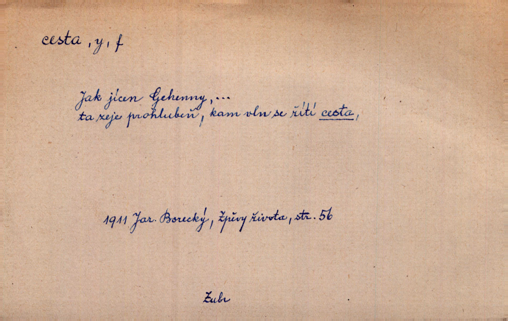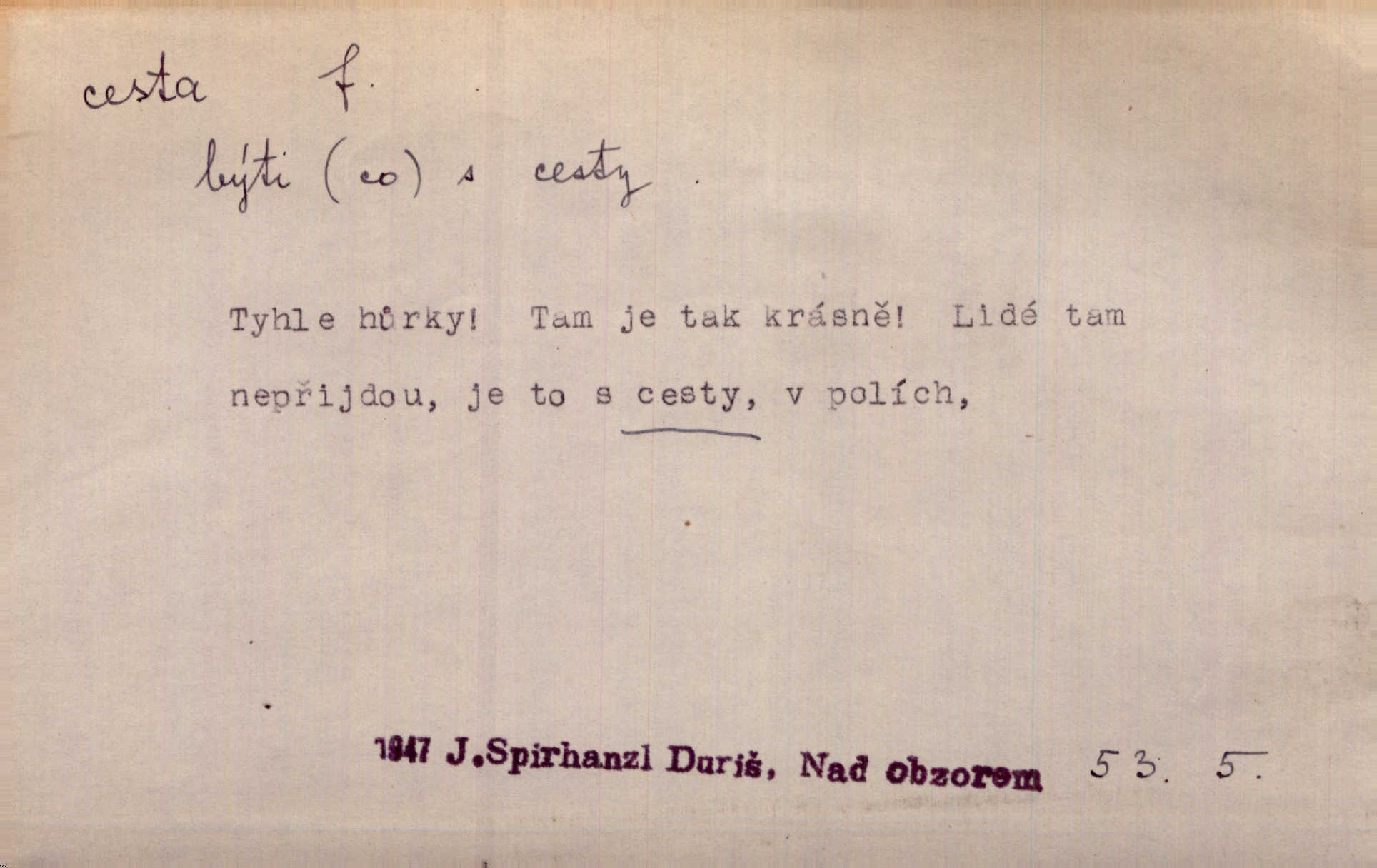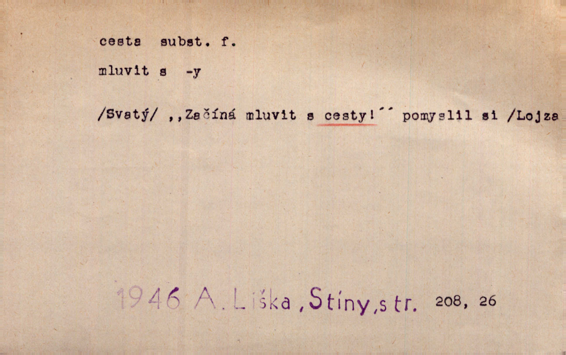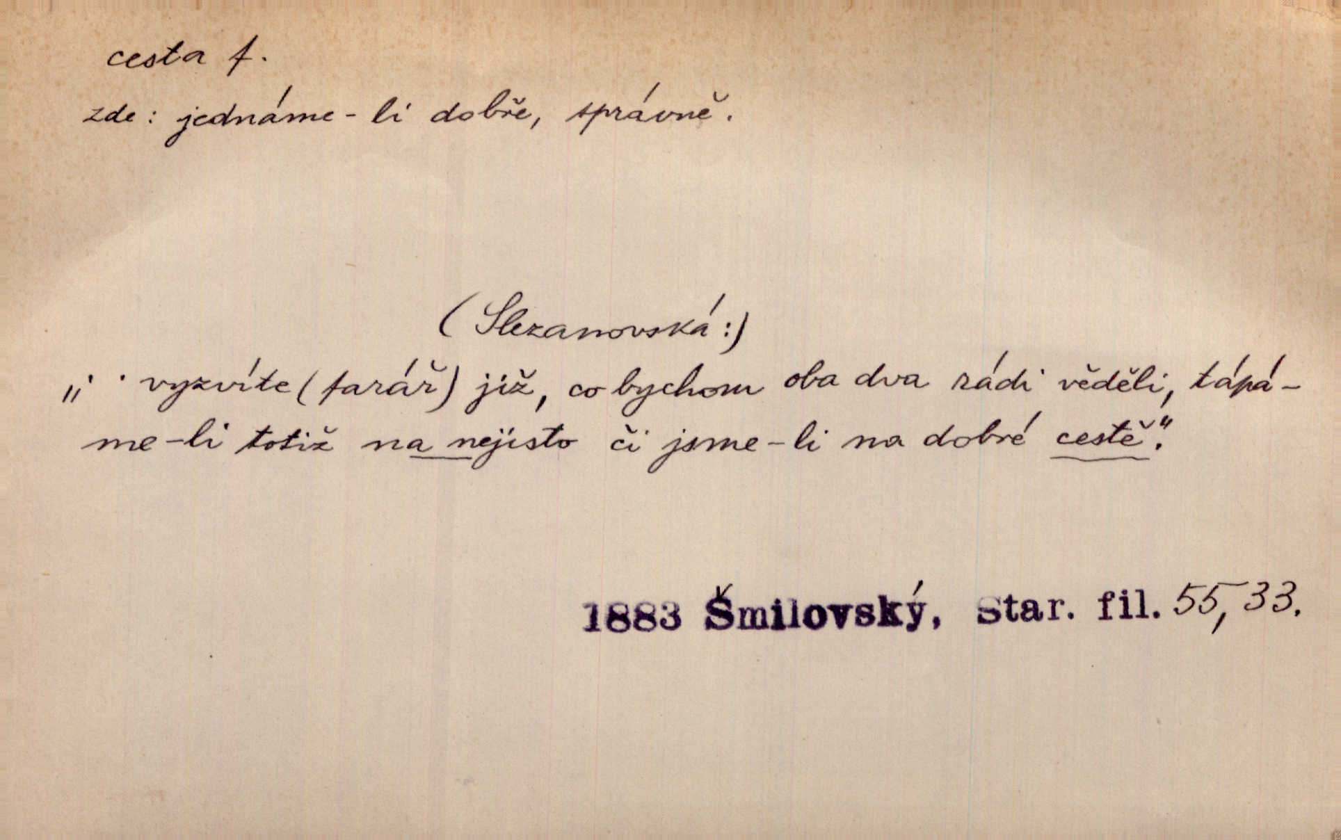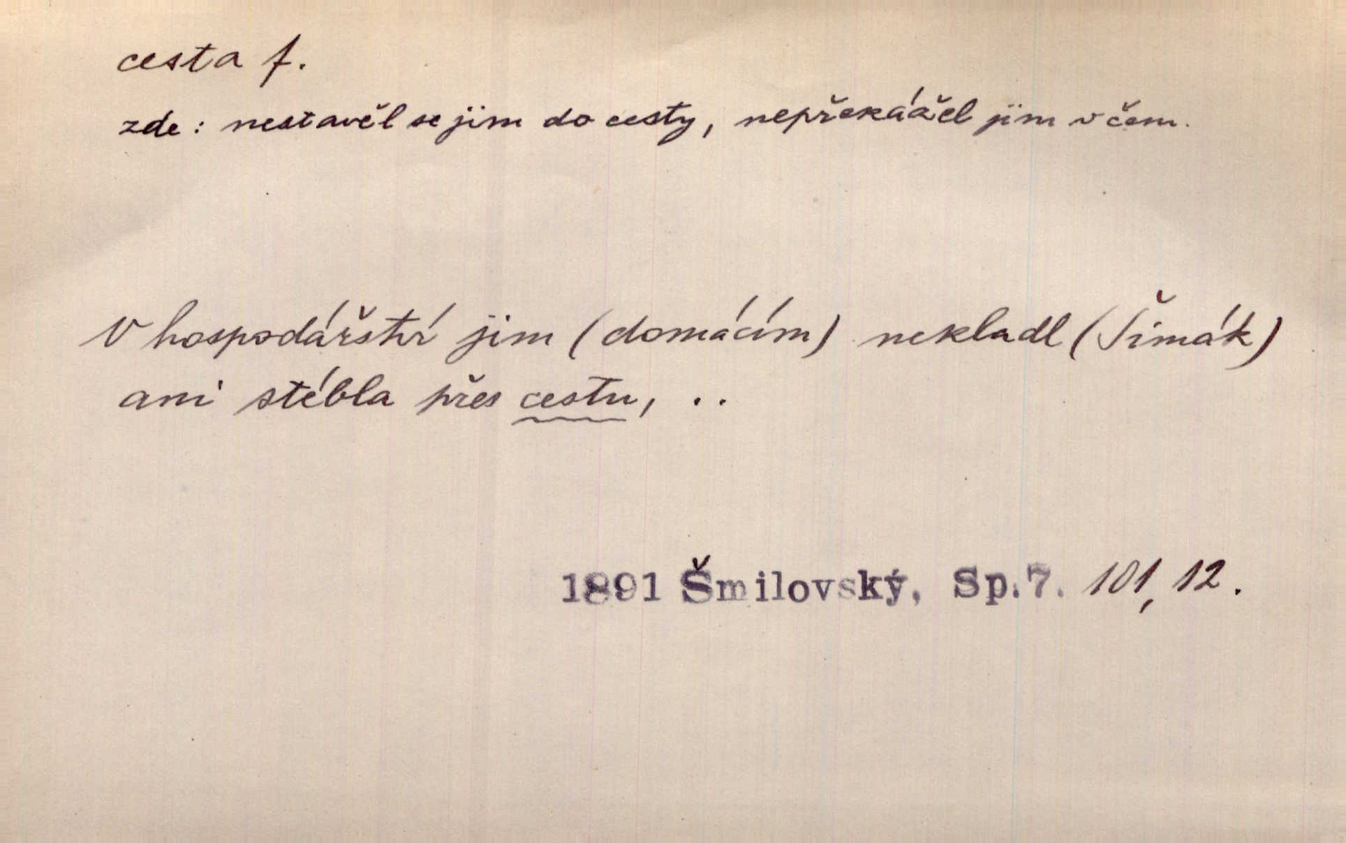 - cesta, -y f. pruh země upravený pro chůzi n. jízdu menšími povozy, pěšina, stezka a j. Ze silnice šla cesta do vsi. Šmil. Hrabě nejezdil nikdy cestami nebo silnicí. Herb. Cesty byly, jak když je utluče. Rais. Lesem běží cesta. Vozová, polní cesta. Círk. křížová cesta řada čtrnácti obrazů v kostele nebo čtrnácti kapliček s obrazy znázorňujícími jednotlivé výjevy z umučení Páně. Kostel, postavený nad cestou křížovou cestou s obrazy o umučení Páně. Svob. Modliti se křížovou cestu modlitby o umučení. Jir. Voditi křížovou cestu procesí. Prav. Přen. křížová cesta uměleckého zápasu. Mrš. Kráčeti křížovou cestou lásky. Svět. D jakákoliv dráha pro chůzi n. jízdu, průchod někam, přechod n. přístup. Řeky plynou po různých cestách. Hál. Vodní cesty uvnitř země. Ner. Měřil jsem tu cestu čtyřikrát denně. Jir. Cesta se lidem netrhne. Byl opilý a šněroval cestu. Maj. Voda si klestí cestu otvorem. Ner. Potok si prodral cestu skalami. Pfleg. Raziti si cestu spoustou prachu. Podl. Ukažte cestu vrahu vyžeňte jej! O. Červ. Měl bys mu pořádně posvítit na cestu vyhnati ho. Mlátí do všeho, co mu do cesty přijde. Vrch. Zastoupiti, zastaviti, zaskočiti komu cestu. Zameziti cestu ohni. Kram. Postaviti se do cesty, v cestu komu, čemu. Plésti se komu do cesty. Nejsem, nepřekážím nikomu v cestě. Ani stébla nepřeložiti (nepřehnouti, nepoložiti) přes cestu komu. Jíti kus cesty za vesnici. Ujíti tři hodiny cesty. Bylo to slyšet na několik mil cesty. Zastaviti se na poloviční cestě. Kam vás vede cesta kam jdete? Znám tudy dobře cestu do města. Cesta k chrámu vedla širokými ulicemi. Vrch. Měl jsem Nymburk na cestě. Jan. Zde je to s cesty odlehlé. Štěp. Dub byl příliš na cestě. Podl. Zblouditi s cesty. Přen. Nemocný mluví s cesty blouzní. Mluviti s cesty nesmyslně. Sejíti s cesty v řeči odbočiti. Rozbory psychologické jsou již poněkud z cesty stranou. Hostin. Přen. Klestiti cestu pravdě. Havlasa. Raziti si cestu k úspěchu. Cesta ke kariéře je mu otevřena. Láska si najde cestu do srdce. Klicp. Zatarasiti cestu k cíli. Svět. Zatrhnouti komu cestu k činu. Šmil. V cestu vývoji se hrne mnoho překážek. Stavěti se v cestu náruživosti. Bůh sází na cestu života ženy jako hvězdy na oblohu. Ner. Cesta do pekla je vydlážděna samými dobrými úmysly. Herb. Bás. Cesta slunce se sklání. Vrch. D chůze (jízda, plavba atd.), cestování. Lékař doporučoval cestu po moři. Cesta po Slovensku, Slovenskem. Památky z cest. Cesta zpáteční, pěší, svatební, studijní, obchodní, dobrodružná. Šťastnou cestu! Dáti se, vydati se, strojiti se, chystati se, vypraviti se na cestu. Nastoupiti zpáteční cestu. Podniknouti vědeckou cestu. Pokračovati v cestě. Býti na cestě, na cestách. Konati cestu (cesty) po evropských zemích. Tomek. Udělali jsme cestu Evropou. Mach. Krátiti si cestu zpěvem. Mám velkou cestu před sebou. Kram. Přen. Máš cestu před sebou převábivou o sňatku. Sab. První má cesta je k vám. Šim. Jsme ušlí po cestě. Erb. Darmo jste sem vážil cestu. Baar. Tu máte na cestu. Nezbylo mi na cestu. Ehrenb. Dáti, dostati co od cesty, nechati si co od cesty. Cestou po cestě, za cesty. Odkud cestou a kam? Stroup. A matka usedavě cestou plakala. Ner. Po cestě, na cestě, za cesty, cestou domů si zpívati. Za pět minut musíme být na cestě. Pfleg. Býti na cestě ke komu. Osm dní budete na cestě. Rais. Zásilka je už na cestě. A. Mrš. Přen. Veselka se odbývala na rychlo, neboť dítě bylo už na cestě. Vrba. Když zrána kýcháme, je rýma na cestě. Javor. Cesta ke hrobu je krátká. Voc. Nastoupiti cestu k věčnosti. Cesta věčného nenavrácení. Klicp. Odejíti cestou všelikého těla. Šmil. Vyzpovídati se před poslední cestou. Doprovázeti koho na poslední cestě. Pfleg. Ostříhati koho na všech cestách života. Octnouti se na špatných cestách. Obrátiti se na pravou cestu žíti ctnostně. Nastoupení cesty pravé k Bohu. Přivésti koho na cestu moudrosti. Spustiti se s pravé cesty. Cesta ke štěstí, za štěstím. D směr, postup, methoda, způsob n. prostředek nějakého jednání n. usilování. Vychování dítěte šlo křivými cestami. Svob. Aleš šel cestou Mánesovou. Jir. Hudba nechť si jde svou cestou. Ner. Jdu rovnou cestou řeknu vše upřímně. Hál. Nejkratší cesta, kterou lze dojíti slávy. V. Mrš. Dáti se na jiné cesty v své činnosti. Pal. Bráti se positivnější cestou. V. Mrš. Nastoupiti cestu smíření a pokoje. Pal. Cesta k zdokonalení jazyka. Krok. Naskýtá se cesta z nesnází. Herb. Snažiti se všemi prostředky a cestami. Her. Upřímnost zde bude nejlepší cesta. Bozd. Světélka nových směrů a cest ve zmatku duchů. Vrch. Věc se dostala na lepší cestu. Klost. Žádost je na dobré, nejlepší cestě. Jir. Jsi na dobré cestě státi se moudrým mužem. Šmil. Práv. Jíti ku předu cestou práva. Heyd. Nastoupiti cestu práva. Získati touto (jinou) cestou přízeň. Poslati co cestou úřední. Dosáhnouti čeho cestou právní. Dosáhnouti svobody cestou milosti. Cestou soudní přiměti koho k čemu. Cukrovar byl prodán cestou exekuční. Herb. Určiti co cestou nařizovací, administrativní; uplatňovati nárok cestou instanční. Tech. Cestou mechanickou, chemickou. Suchou cestou n. na suché cestě (op. mokrou cestou, na mokré cestě). Přen. polit. bolševisace suchou cestou bez zjevného revolučního násilí.