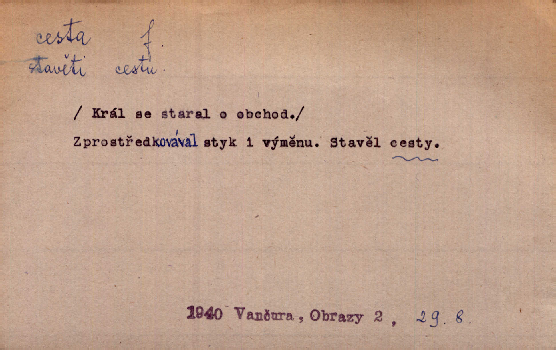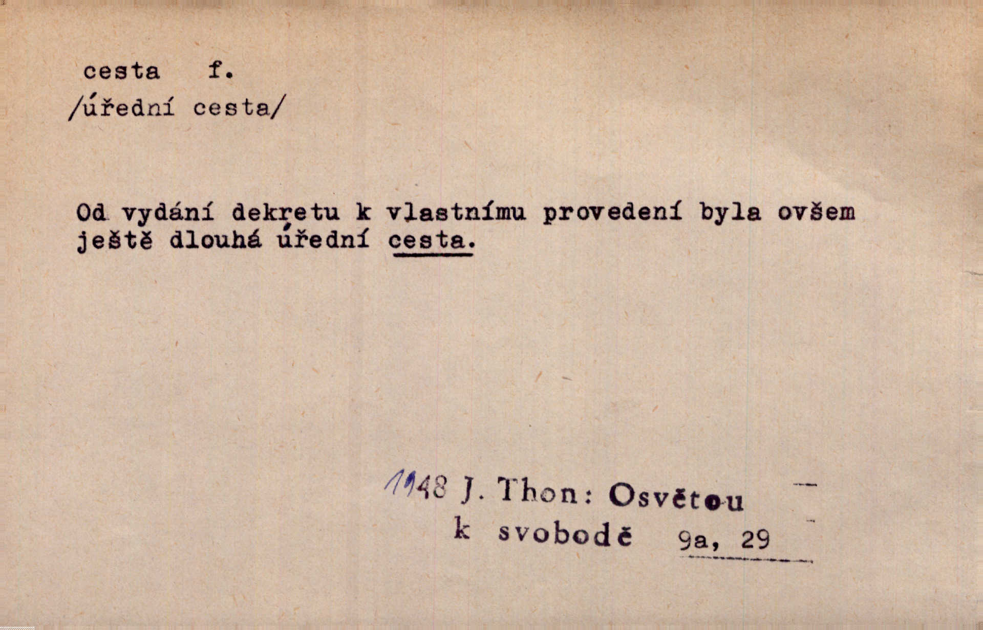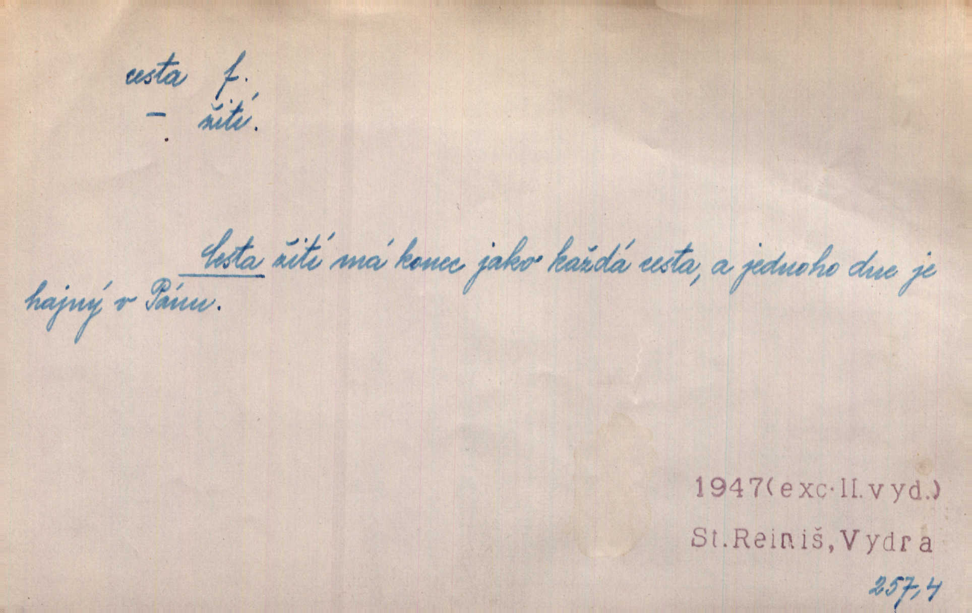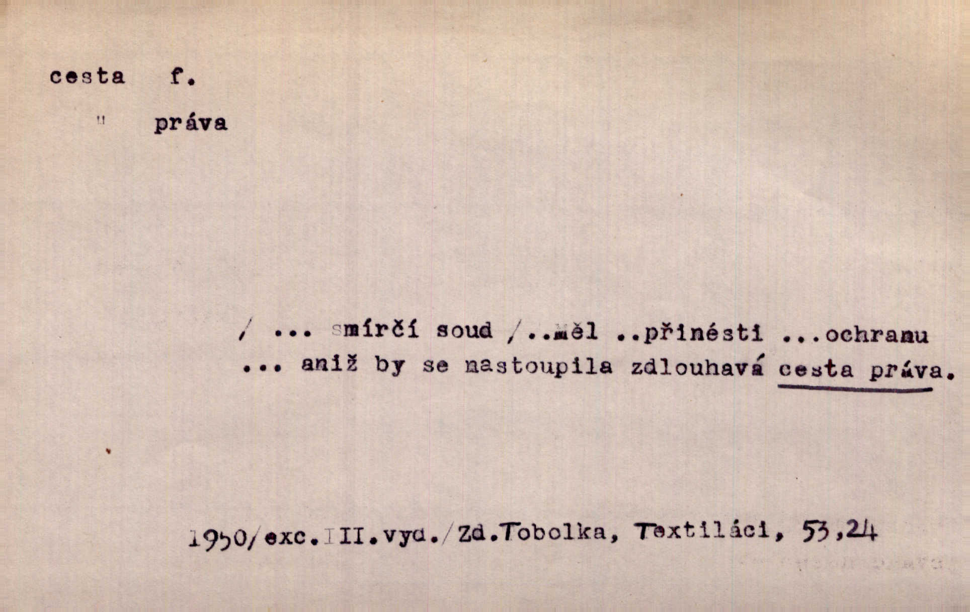 - cesta, -y f. pruh země upravený pro chůzi n. jízdu menšími povozy, pěšina, stezka a j. Ze silnice šla cesta do vsi. Šmil. Hrabě nejezdil nikdy cestami nebo silnicí. Herb. Cesty byly, jak když je utluče. Rais. Lesem běží cesta. Vozová, polní cesta. Círk. křížová cesta řada čtrnácti obrazů v kostele nebo čtrnácti kapliček s obrazy znázorňujícími jednotlivé výjevy z umučení Páně. Kostel, postavený nad cestou křížovou cestou s obrazy o umučení Páně. Svob. Modliti se křížovou cestu modlitby o umučení. Jir. Voditi křížovou cestu procesí. Prav. Přen. křížová cesta uměleckého zápasu. Mrš. Kráčeti křížovou cestou lásky. Svět. D jakákoliv dráha pro chůzi n. jízdu, průchod někam, přechod n. přístup. Řeky plynou po různých cestách. Hál. Vodní cesty uvnitř země. Ner. Měřil jsem tu cestu čtyřikrát denně. Jir. Cesta se lidem netrhne. Byl opilý a šněroval cestu. Maj. Voda si klestí cestu otvorem. Ner. Potok si prodral cestu skalami. Pfleg. Raziti si cestu spoustou prachu. Podl. Ukažte cestu vrahu vyžeňte jej! O. Červ. Měl bys mu pořádně posvítit na cestu vyhnati ho. Mlátí do všeho, co mu do cesty přijde. Vrch. Zastoupiti, zastaviti, zaskočiti komu cestu. Zameziti cestu ohni. Kram. Postaviti se do cesty, v cestu komu, čemu. Plésti se komu do cesty. Nejsem, nepřekážím nikomu v cestě. Ani stébla nepřeložiti (nepřehnouti, nepoložiti) přes cestu komu. Jíti kus cesty za vesnici. Ujíti tři hodiny cesty. Bylo to slyšet na několik mil cesty. Zastaviti se na poloviční cestě. Kam vás vede cesta kam jdete? Znám tudy dobře cestu do města. Cesta k chrámu vedla širokými ulicemi. Vrch. Měl jsem Nymburk na cestě. Jan. Zde je to s cesty odlehlé. Štěp. Dub byl příliš na cestě. Podl. Zblouditi s cesty. Přen. Nemocný mluví s cesty blouzní. Mluviti s cesty nesmyslně. Sejíti s cesty v řeči odbočiti. Rozbory psychologické jsou již poněkud z cesty stranou. Hostin. Přen. Klestiti cestu pravdě. Havlasa. Raziti si cestu k úspěchu. Cesta ke kariéře je mu otevřena. Láska si najde cestu do srdce. Klicp. Zatarasiti cestu k cíli. Svět. Zatrhnouti komu cestu k činu. Šmil. V cestu vývoji se hrne mnoho překážek. Stavěti se v cestu náruživosti. Bůh sází na cestu života ženy jako hvězdy na oblohu. Ner. Cesta do pekla je vydlážděna samými dobrými úmysly. Herb. Bás. Cesta slunce se sklání. Vrch. D chůze (jízda, plavba atd.), cestování. Lékař doporučoval cestu po moři. Cesta po Slovensku, Slovenskem. Památky z cest. Cesta zpáteční, pěší, svatební, studijní, obchodní, dobrodružná. Šťastnou cestu! Dáti se, vydati se, strojiti se, chystati se, vypraviti se na cestu. Nastoupiti zpáteční cestu. Podniknouti vědeckou cestu. Pokračovati v cestě. Býti na cestě, na cestách. Konati cestu (cesty) po evropských zemích. Tomek. Udělali jsme cestu Evropou. Mach. Krátiti si cestu zpěvem. Mám velkou cestu před sebou. Kram. Přen. Máš cestu před sebou převábivou o sňatku. Sab. První má cesta je k vám. Šim. Jsme ušlí po cestě. Erb. Darmo jste sem vážil cestu. Baar. Tu máte na cestu. Nezbylo mi na cestu. Ehrenb. Dáti, dostati co od cesty, nechati si co od cesty. Cestou po cestě, za cesty. Odkud cestou a kam? Stroup. A matka usedavě cestou plakala. Ner. Po cestě, na cestě, za cesty, cestou domů si zpívati. Za pět minut musíme být na cestě. Pfleg. Býti na cestě ke komu. Osm dní budete na cestě. Rais. Zásilka je už na cestě. A. Mrš. Přen. Veselka se odbývala na rychlo, neboť dítě bylo už na cestě. Vrba. Když zrána kýcháme, je rýma na cestě. Javor. Cesta ke hrobu je krátká. Voc. Nastoupiti cestu k věčnosti. Cesta věčného nenavrácení. Klicp. Odejíti cestou všelikého těla. Šmil. Vyzpovídati se před poslední cestou. Doprovázeti koho na poslední cestě. Pfleg. Ostříhati koho na všech cestách života. Octnouti se na špatných cestách. Obrátiti se na pravou cestu žíti ctnostně. Nastoupení cesty pravé k Bohu. Přivésti koho na cestu moudrosti. Spustiti se s pravé cesty. Cesta ke štěstí, za štěstím. D směr, postup, methoda, způsob n. prostředek nějakého jednání n. usilování. Vychování dítěte šlo křivými cestami. Svob. Aleš šel cestou Mánesovou. Jir. Hudba nechť si jde svou cestou. Ner. Jdu rovnou cestou řeknu vše upřímně. Hál. Nejkratší cesta, kterou lze dojíti slávy. V. Mrš. Dáti se na jiné cesty v své činnosti. Pal. Bráti se positivnější cestou. V. Mrš. Nastoupiti cestu smíření a pokoje. Pal. Cesta k zdokonalení jazyka. Krok. Naskýtá se cesta z nesnází. Herb. Snažiti se všemi prostředky a cestami. Her. Upřímnost zde bude nejlepší cesta. Bozd. Světélka nových směrů a cest ve zmatku duchů. Vrch. Věc se dostala na lepší cestu. Klost. Žádost je na dobré, nejlepší cestě. Jir. Jsi na dobré cestě státi se moudrým mužem. Šmil. Práv. Jíti ku předu cestou práva. Heyd. Nastoupiti cestu práva. Získati touto (jinou) cestou přízeň. Poslati co cestou úřední. Dosáhnouti čeho cestou právní. Dosáhnouti svobody cestou milosti. Cestou soudní přiměti koho k čemu. Cukrovar byl prodán cestou exekuční. Herb. Určiti co cestou nařizovací, administrativní; uplatňovati nárok cestou instanční. Tech. Cestou mechanickou, chemickou. Suchou cestou n. na suché cestě (op. mokrou cestou, na mokré cestě). Přen. polit. bolševisace suchou cestou bez zjevného revolučního násilí.