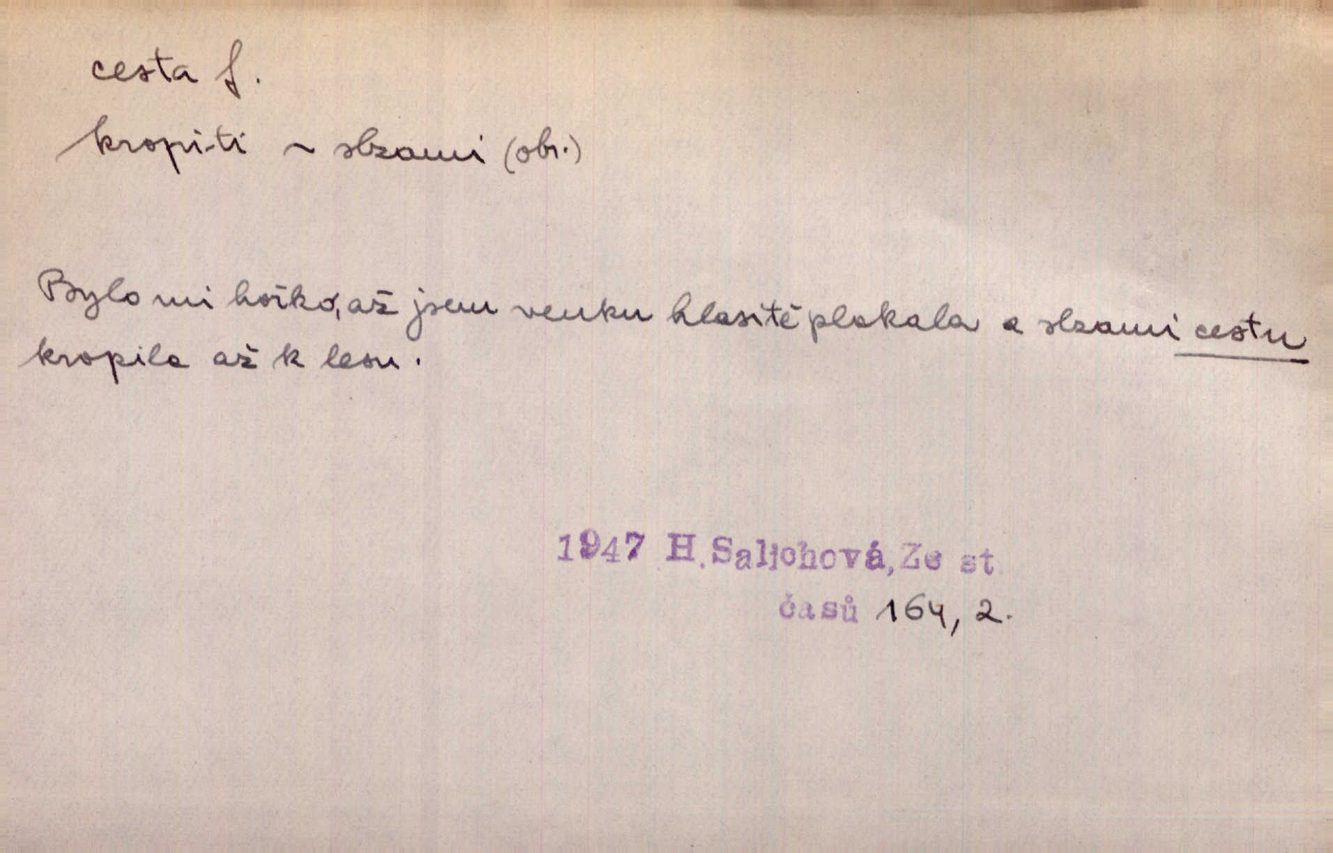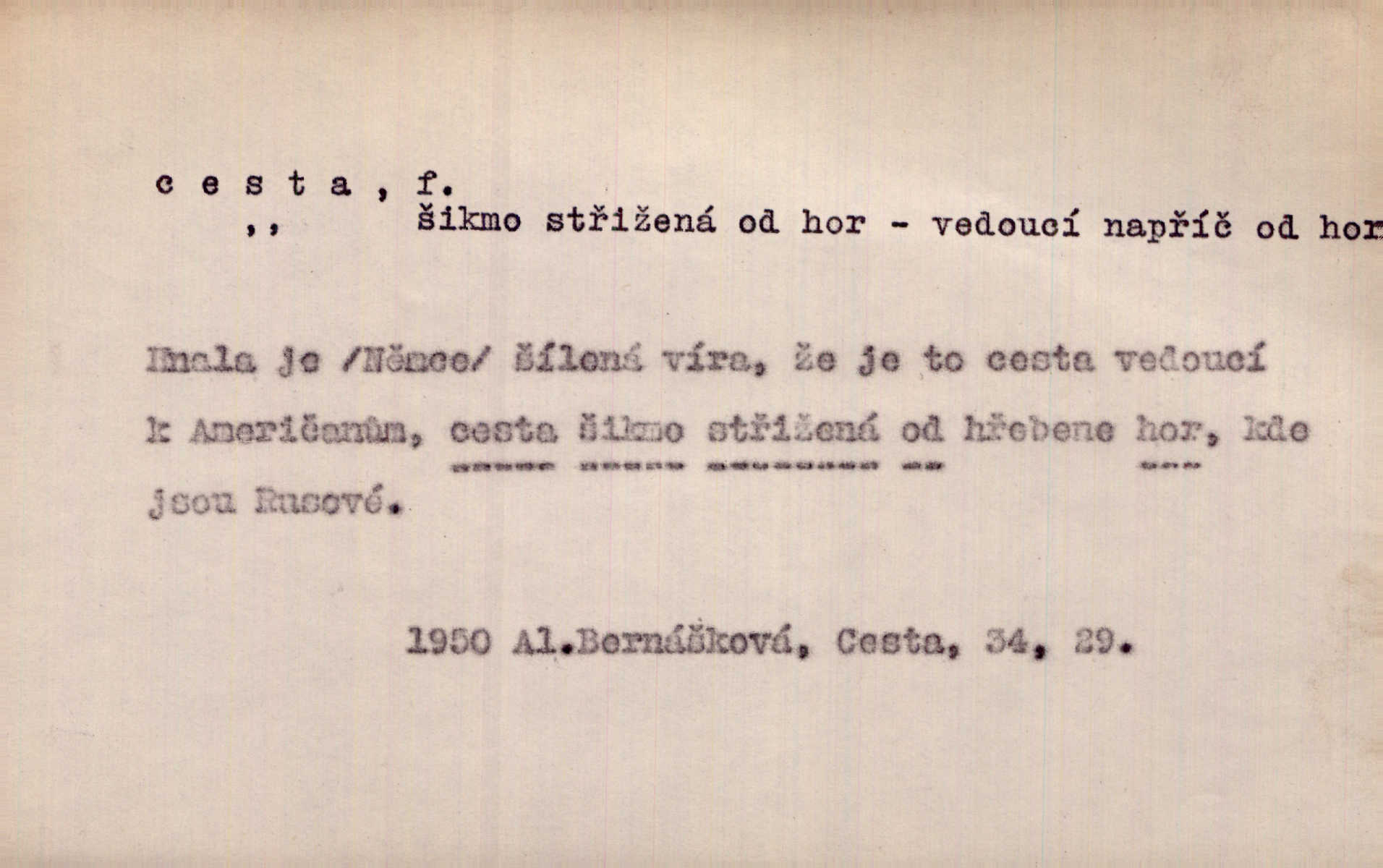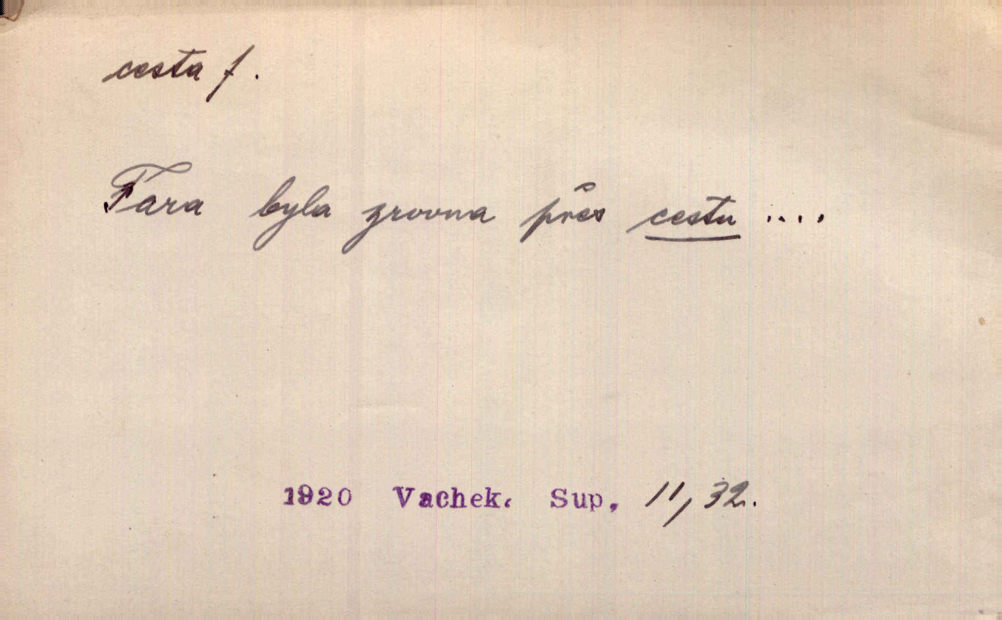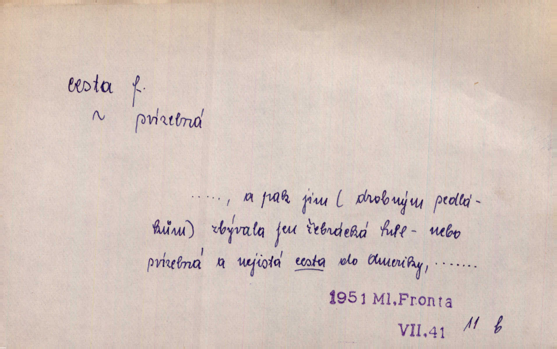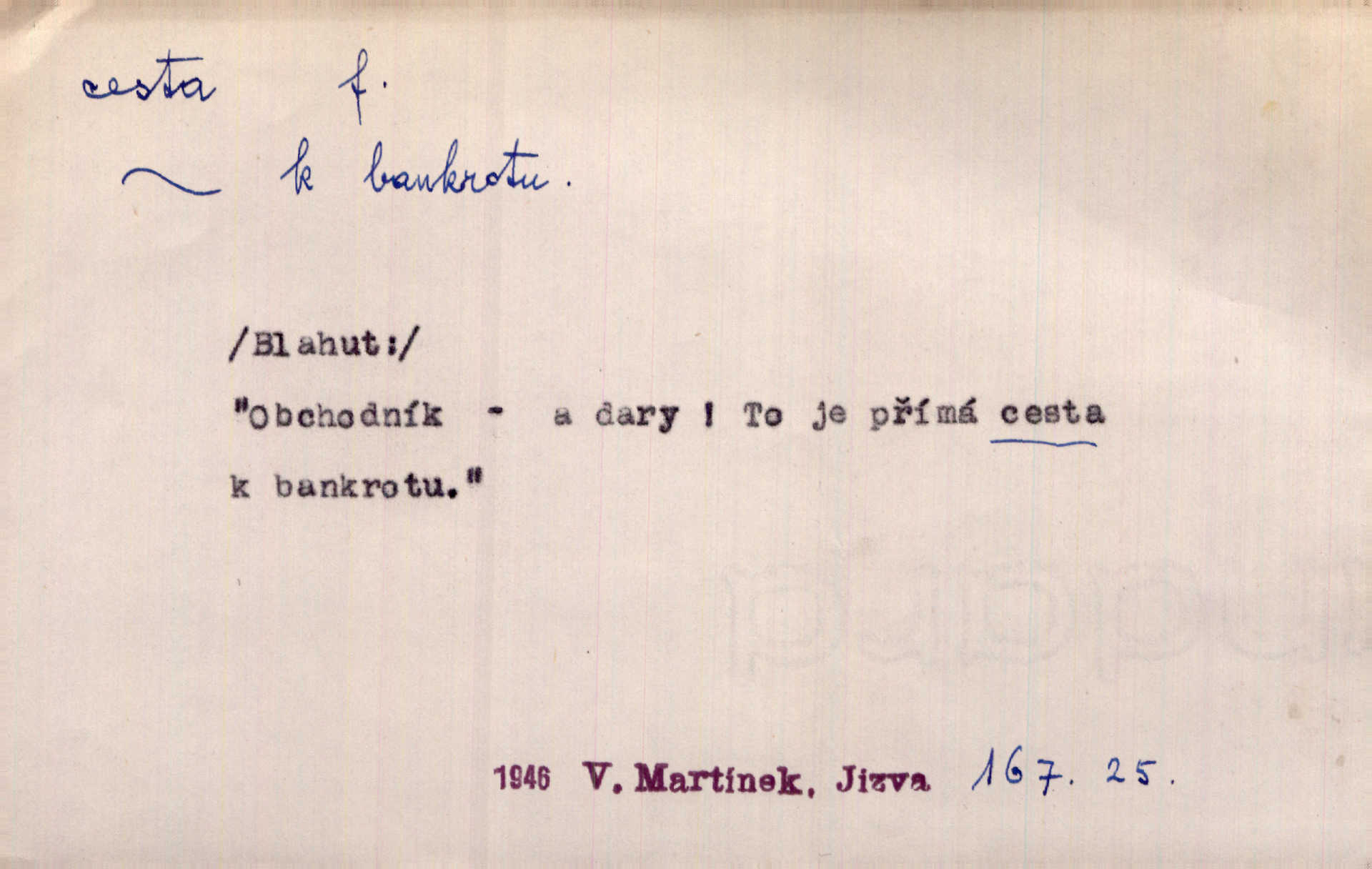 - cesta, -y f. pruh země upravený pro chůzi n. jízdu menšími povozy, pěšina, stezka a j. Ze silnice šla cesta do vsi. Šmil. Hrabě nejezdil nikdy cestami nebo silnicí. Herb. Cesty byly, jak když je utluče. Rais. Lesem běží cesta. Vozová, polní cesta. Círk. křížová cesta řada čtrnácti obrazů v kostele nebo čtrnácti kapliček s obrazy znázorňujícími jednotlivé výjevy z umučení Páně. Kostel, postavený nad cestou křížovou cestou s obrazy o umučení Páně. Svob. Modliti se křížovou cestu modlitby o umučení. Jir. Voditi křížovou cestu procesí. Prav. Přen. křížová cesta uměleckého zápasu. Mrš. Kráčeti křížovou cestou lásky. Svět. D jakákoliv dráha pro chůzi n. jízdu, průchod někam, přechod n. přístup. Řeky plynou po různých cestách. Hál. Vodní cesty uvnitř země. Ner. Měřil jsem tu cestu čtyřikrát denně. Jir. Cesta se lidem netrhne. Byl opilý a šněroval cestu. Maj. Voda si klestí cestu otvorem. Ner. Potok si prodral cestu skalami. Pfleg. Raziti si cestu spoustou prachu. Podl. Ukažte cestu vrahu vyžeňte jej! O. Červ. Měl bys mu pořádně posvítit na cestu vyhnati ho. Mlátí do všeho, co mu do cesty přijde. Vrch. Zastoupiti, zastaviti, zaskočiti komu cestu. Zameziti cestu ohni. Kram. Postaviti se do cesty, v cestu komu, čemu. Plésti se komu do cesty. Nejsem, nepřekážím nikomu v cestě. Ani stébla nepřeložiti (nepřehnouti, nepoložiti) přes cestu komu. Jíti kus cesty za vesnici. Ujíti tři hodiny cesty. Bylo to slyšet na několik mil cesty. Zastaviti se na poloviční cestě. Kam vás vede cesta kam jdete? Znám tudy dobře cestu do města. Cesta k chrámu vedla širokými ulicemi. Vrch. Měl jsem Nymburk na cestě. Jan. Zde je to s cesty odlehlé. Štěp. Dub byl příliš na cestě. Podl. Zblouditi s cesty. Přen. Nemocný mluví s cesty blouzní. Mluviti s cesty nesmyslně. Sejíti s cesty v řeči odbočiti. Rozbory psychologické jsou již poněkud z cesty stranou. Hostin. Přen. Klestiti cestu pravdě. Havlasa. Raziti si cestu k úspěchu. Cesta ke kariéře je mu otevřena. Láska si najde cestu do srdce. Klicp. Zatarasiti cestu k cíli. Svět. Zatrhnouti komu cestu k činu. Šmil. V cestu vývoji se hrne mnoho překážek. Stavěti se v cestu náruživosti. Bůh sází na cestu života ženy jako hvězdy na oblohu. Ner. Cesta do pekla je vydlážděna samými dobrými úmysly. Herb. Bás. Cesta slunce se sklání. Vrch. D chůze (jízda, plavba atd.), cestování. Lékař doporučoval cestu po moři. Cesta po Slovensku, Slovenskem. Památky z cest. Cesta zpáteční, pěší, svatební, studijní, obchodní, dobrodružná. Šťastnou cestu! Dáti se, vydati se, strojiti se, chystati se, vypraviti se na cestu. Nastoupiti zpáteční cestu. Podniknouti vědeckou cestu. Pokračovati v cestě. Býti na cestě, na cestách. Konati cestu (cesty) po evropských zemích. Tomek. Udělali jsme cestu Evropou. Mach. Krátiti si cestu zpěvem. Mám velkou cestu před sebou. Kram. Přen. Máš cestu před sebou převábivou o sňatku. Sab. První má cesta je k vám. Šim. Jsme ušlí po cestě. Erb. Darmo jste sem vážil cestu. Baar. Tu máte na cestu. Nezbylo mi na cestu. Ehrenb. Dáti, dostati co od cesty, nechati si co od cesty. Cestou po cestě, za cesty. Odkud cestou a kam? Stroup. A matka usedavě cestou plakala. Ner. Po cestě, na cestě, za cesty, cestou domů si zpívati. Za pět minut musíme být na cestě. Pfleg. Býti na cestě ke komu. Osm dní budete na cestě. Rais. Zásilka je už na cestě. A. Mrš. Přen. Veselka se odbývala na rychlo, neboť dítě bylo už na cestě. Vrba. Když zrána kýcháme, je rýma na cestě. Javor. Cesta ke hrobu je krátká. Voc. Nastoupiti cestu k věčnosti. Cesta věčného nenavrácení. Klicp. Odejíti cestou všelikého těla. Šmil. Vyzpovídati se před poslední cestou. Doprovázeti koho na poslední cestě. Pfleg. Ostříhati koho na všech cestách života. Octnouti se na špatných cestách. Obrátiti se na pravou cestu žíti ctnostně. Nastoupení cesty pravé k Bohu. Přivésti koho na cestu moudrosti. Spustiti se s pravé cesty. Cesta ke štěstí, za štěstím. D směr, postup, methoda, způsob n. prostředek nějakého jednání n. usilování. Vychování dítěte šlo křivými cestami. Svob. Aleš šel cestou Mánesovou. Jir. Hudba nechť si jde svou cestou. Ner. Jdu rovnou cestou řeknu vše upřímně. Hál. Nejkratší cesta, kterou lze dojíti slávy. V. Mrš. Dáti se na jiné cesty v své činnosti. Pal. Bráti se positivnější cestou. V. Mrš. Nastoupiti cestu smíření a pokoje. Pal. Cesta k zdokonalení jazyka. Krok. Naskýtá se cesta z nesnází. Herb. Snažiti se všemi prostředky a cestami. Her. Upřímnost zde bude nejlepší cesta. Bozd. Světélka nových směrů a cest ve zmatku duchů. Vrch. Věc se dostala na lepší cestu. Klost. Žádost je na dobré, nejlepší cestě. Jir. Jsi na dobré cestě státi se moudrým mužem. Šmil. Práv. Jíti ku předu cestou práva. Heyd. Nastoupiti cestu práva. Získati touto (jinou) cestou přízeň. Poslati co cestou úřední. Dosáhnouti čeho cestou právní. Dosáhnouti svobody cestou milosti. Cestou soudní přiměti koho k čemu. Cukrovar byl prodán cestou exekuční. Herb. Určiti co cestou nařizovací, administrativní; uplatňovati nárok cestou instanční. Tech. Cestou mechanickou, chemickou. Suchou cestou n. na suché cestě (op. mokrou cestou, na mokré cestě). Přen. polit. bolševisace suchou cestou bez zjevného revolučního násilí.