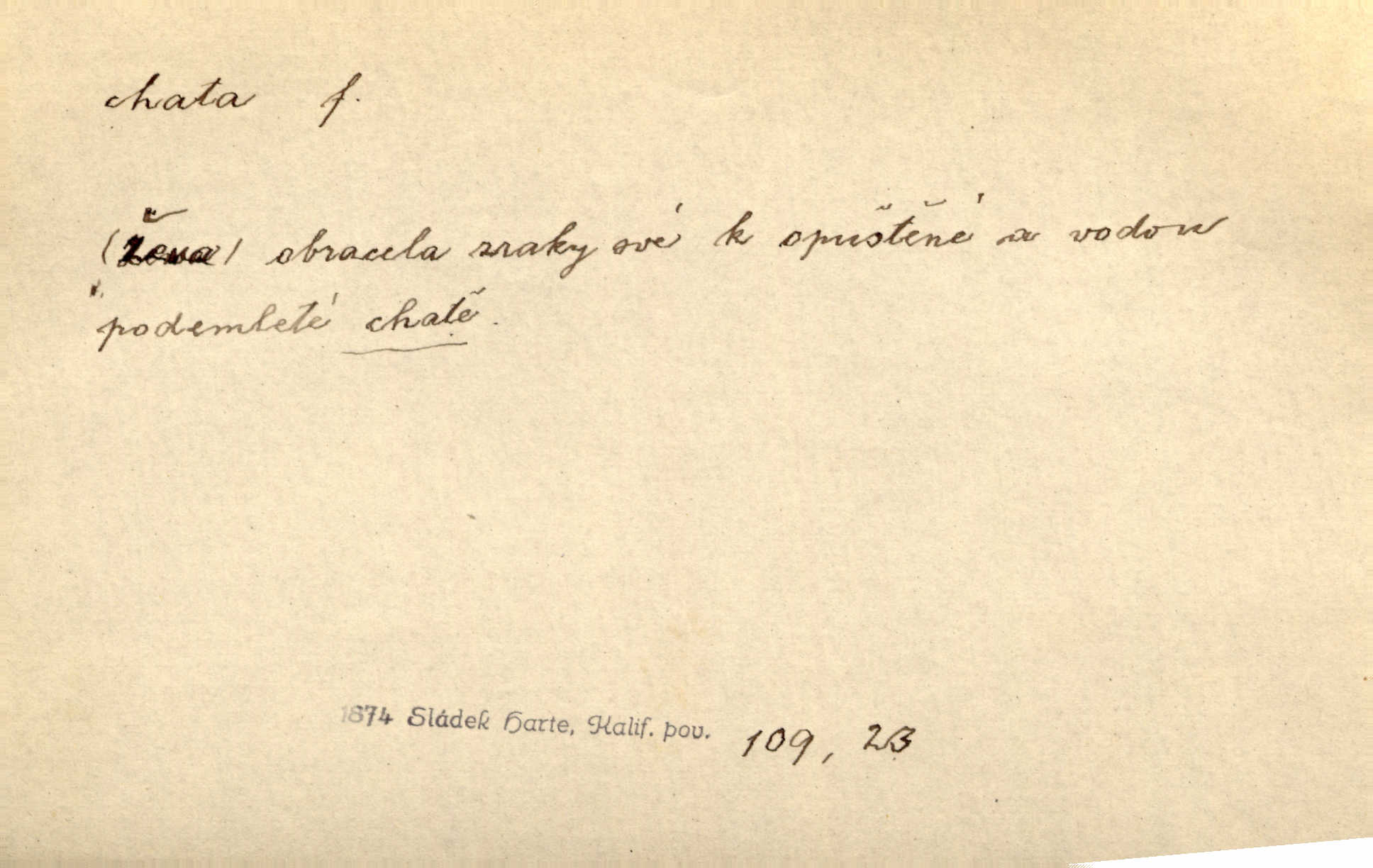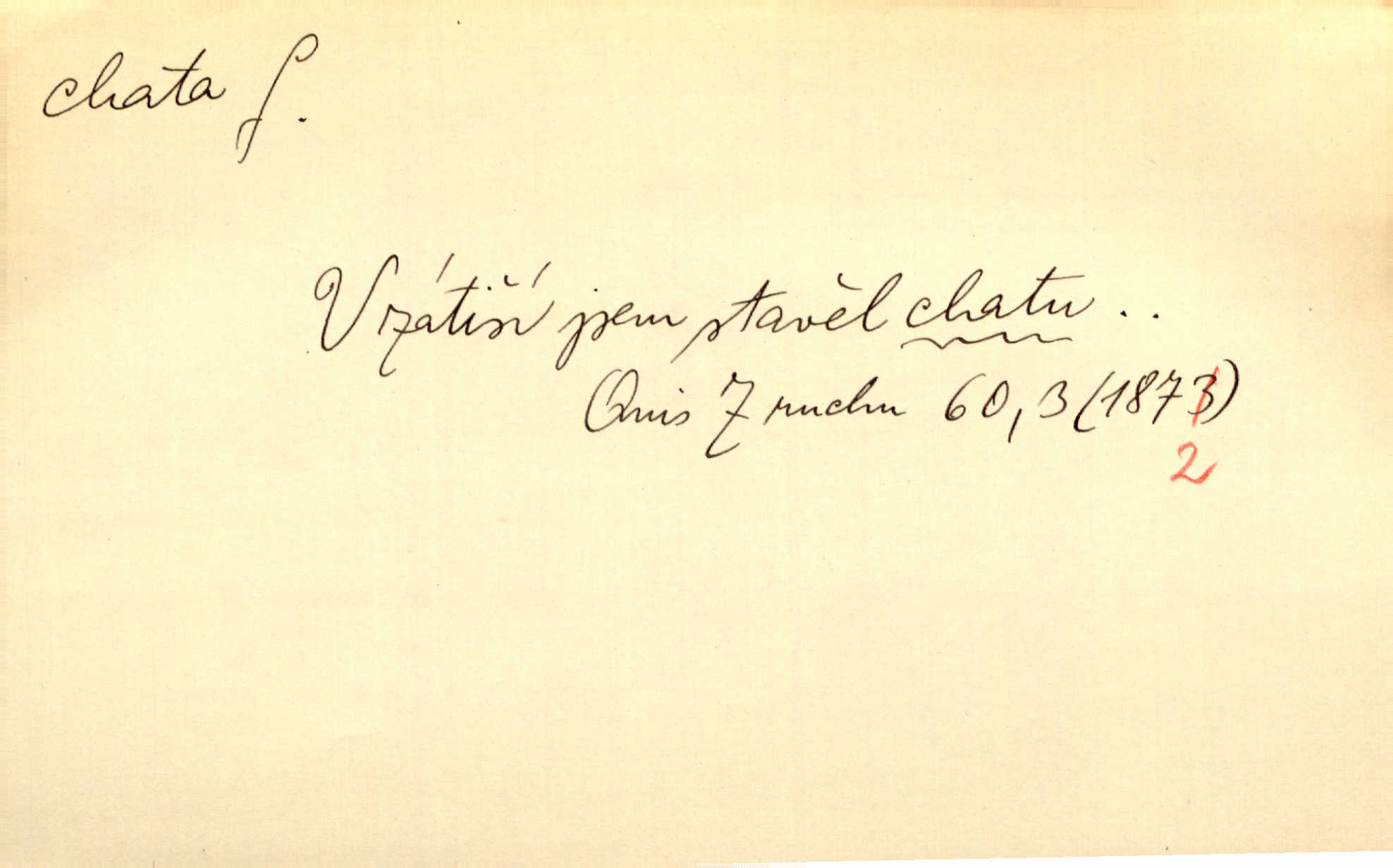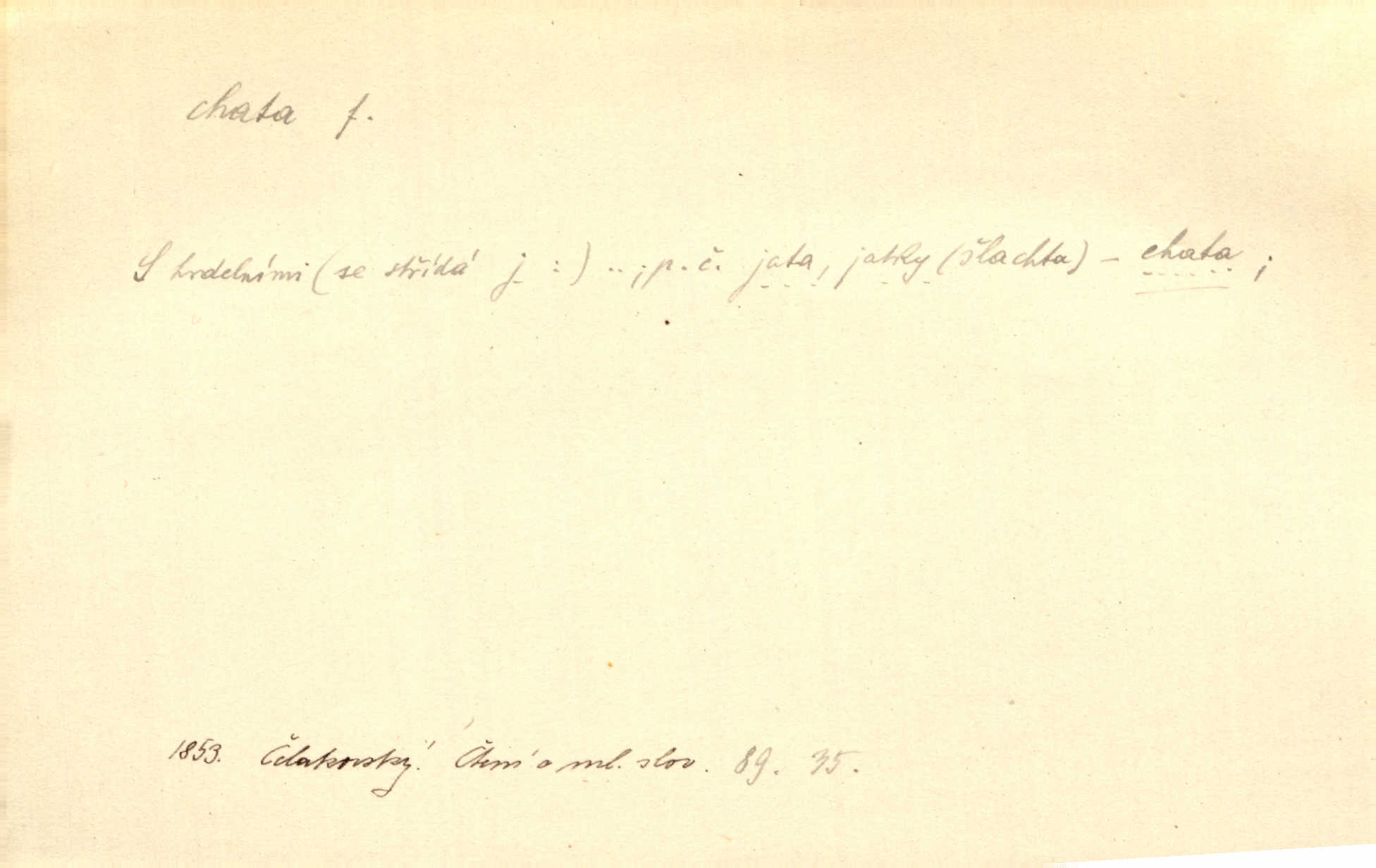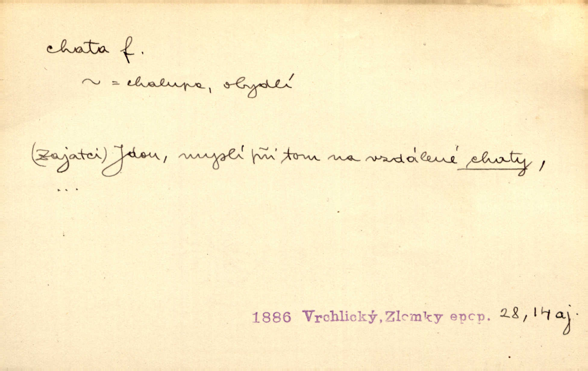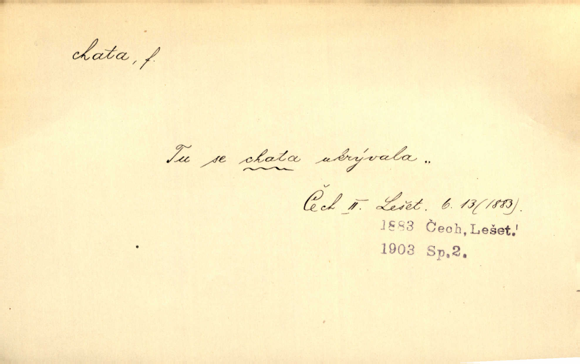 - chata, -y f. nuzná chaloupka, chatrč, chyše. Za ranního šera vycházel [Šimon] ze své chatrné roubené chaty pod došky. Jir. Tyto dělníky [šumavské] odsuzovaly sněhy k dlouhým zahálkám, k tuhému uvěznění ve chatách jejich. Klost. Sport. chata trampská, weekendová menší prostá stavba, obyčejně dřevěná, postavená v lesnaté krajině n. u vody. Turist. hotel pro turisty v horách. Chata Klubu československých turistů.