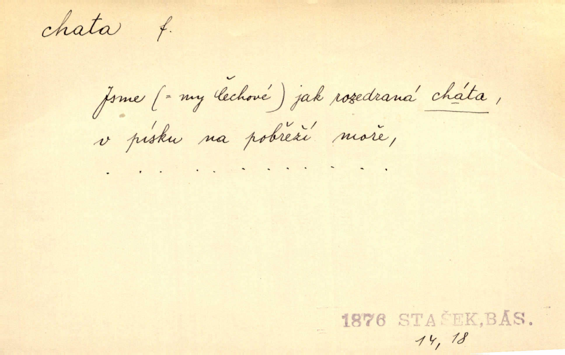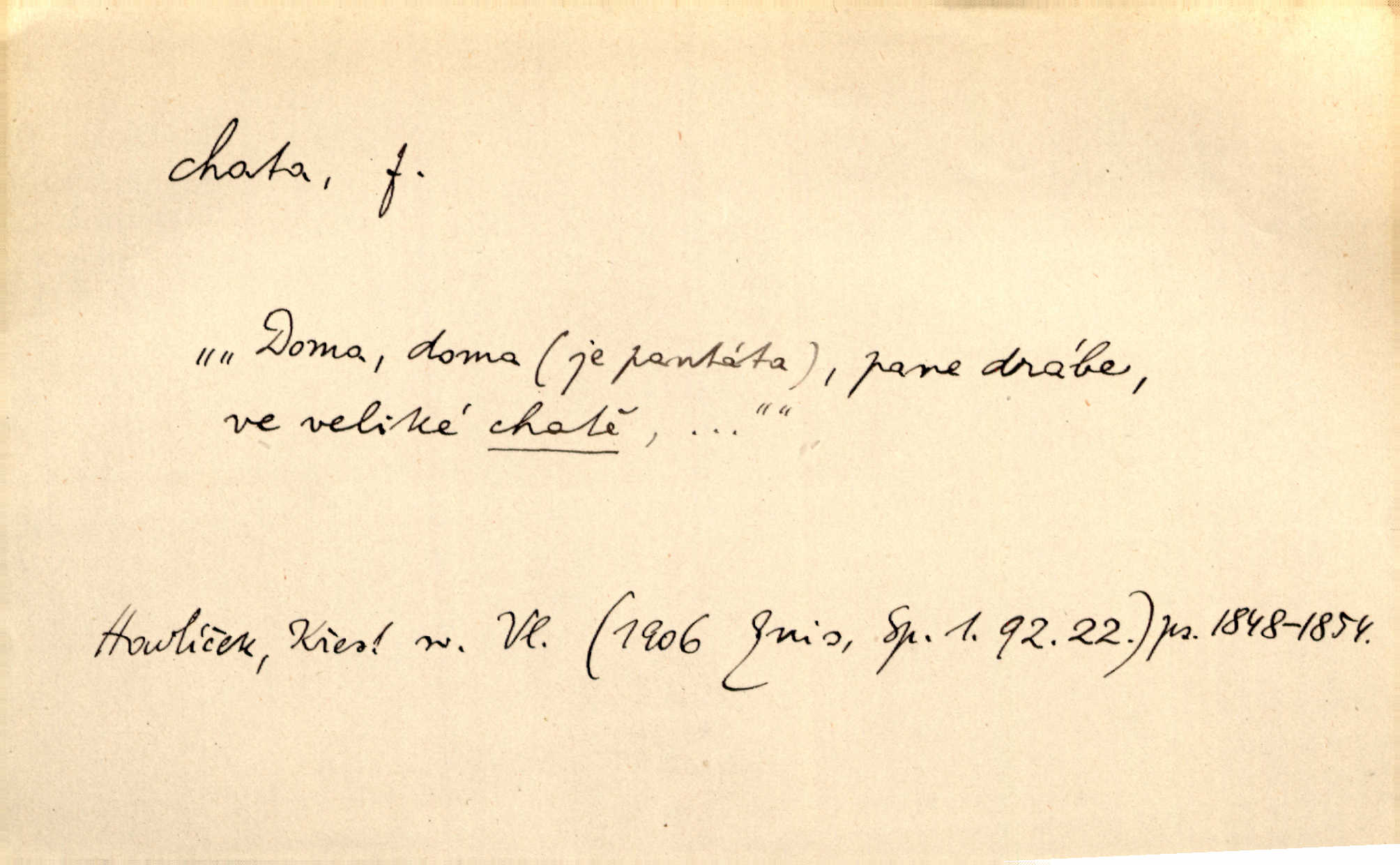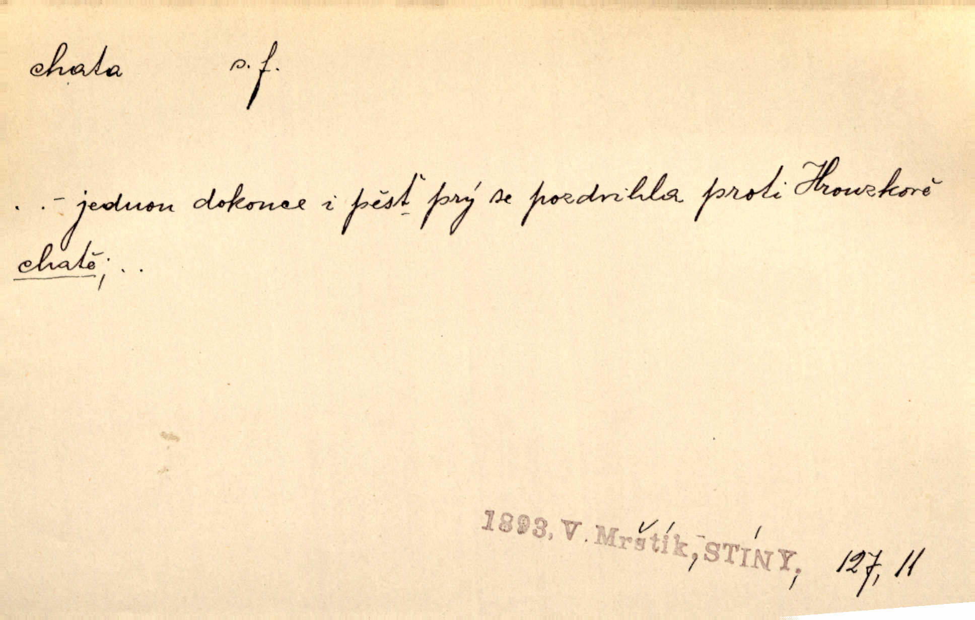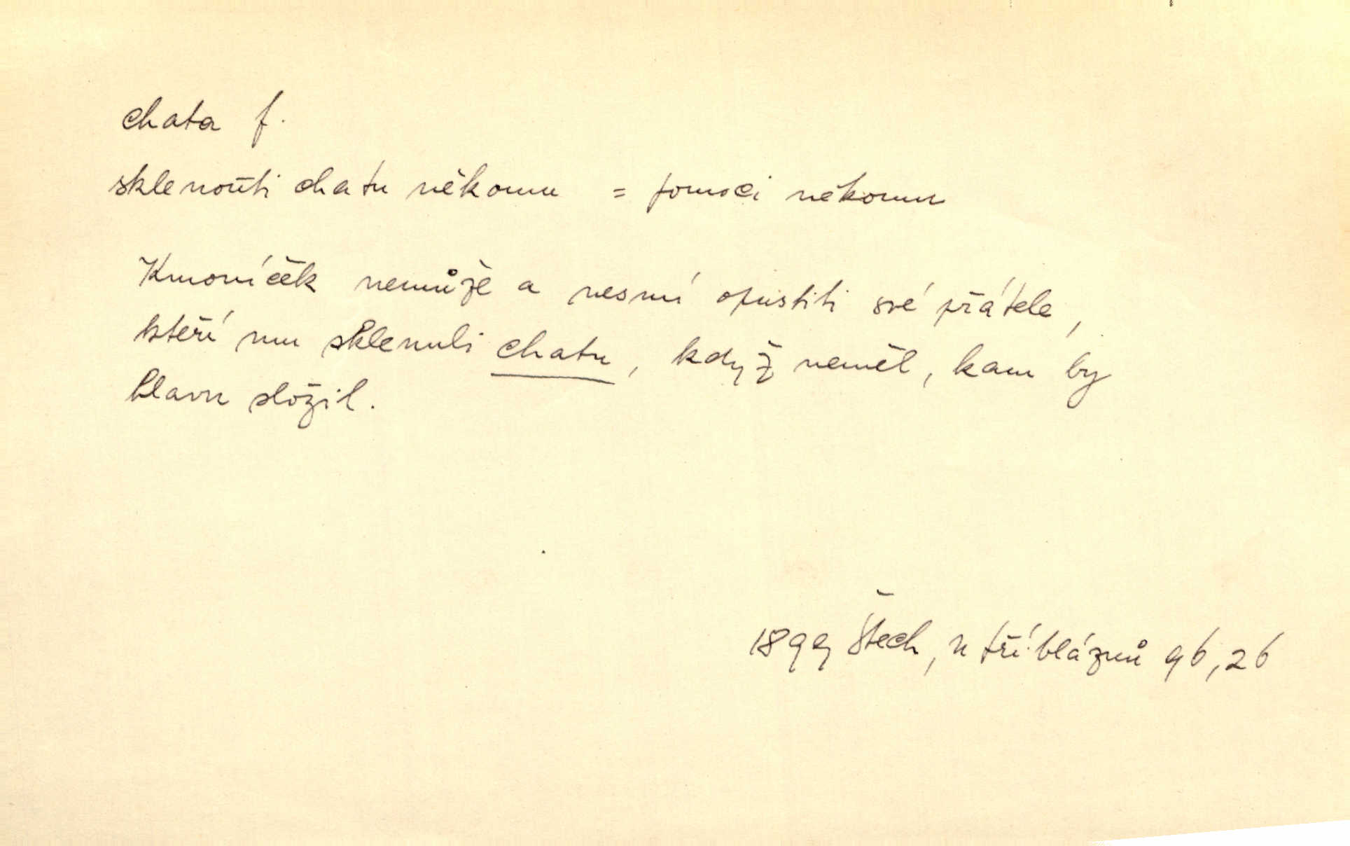 - chata, -y f. nuzná chaloupka, chatrč, chyše. Za ranního šera vycházel [Šimon] ze své chatrné roubené chaty pod došky. Jir. Tyto dělníky [šumavské] odsuzovaly sněhy k dlouhým zahálkám, k tuhému uvěznění ve chatách jejich. Klost. Sport. chata trampská, weekendová menší prostá stavba, obyčejně dřevěná, postavená v lesnaté krajině n. u vody. Turist. hotel pro turisty v horách. Chata Klubu československých turistů.