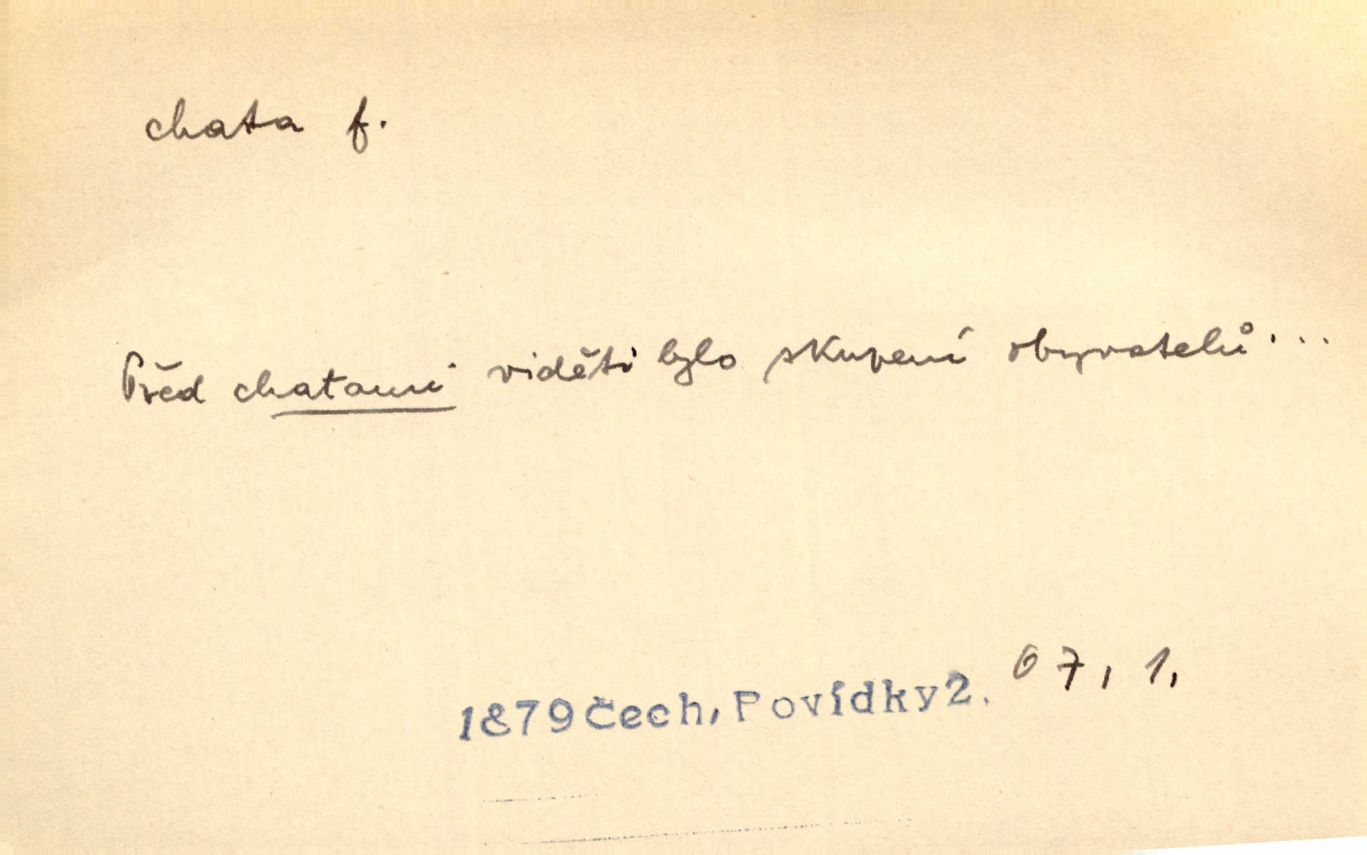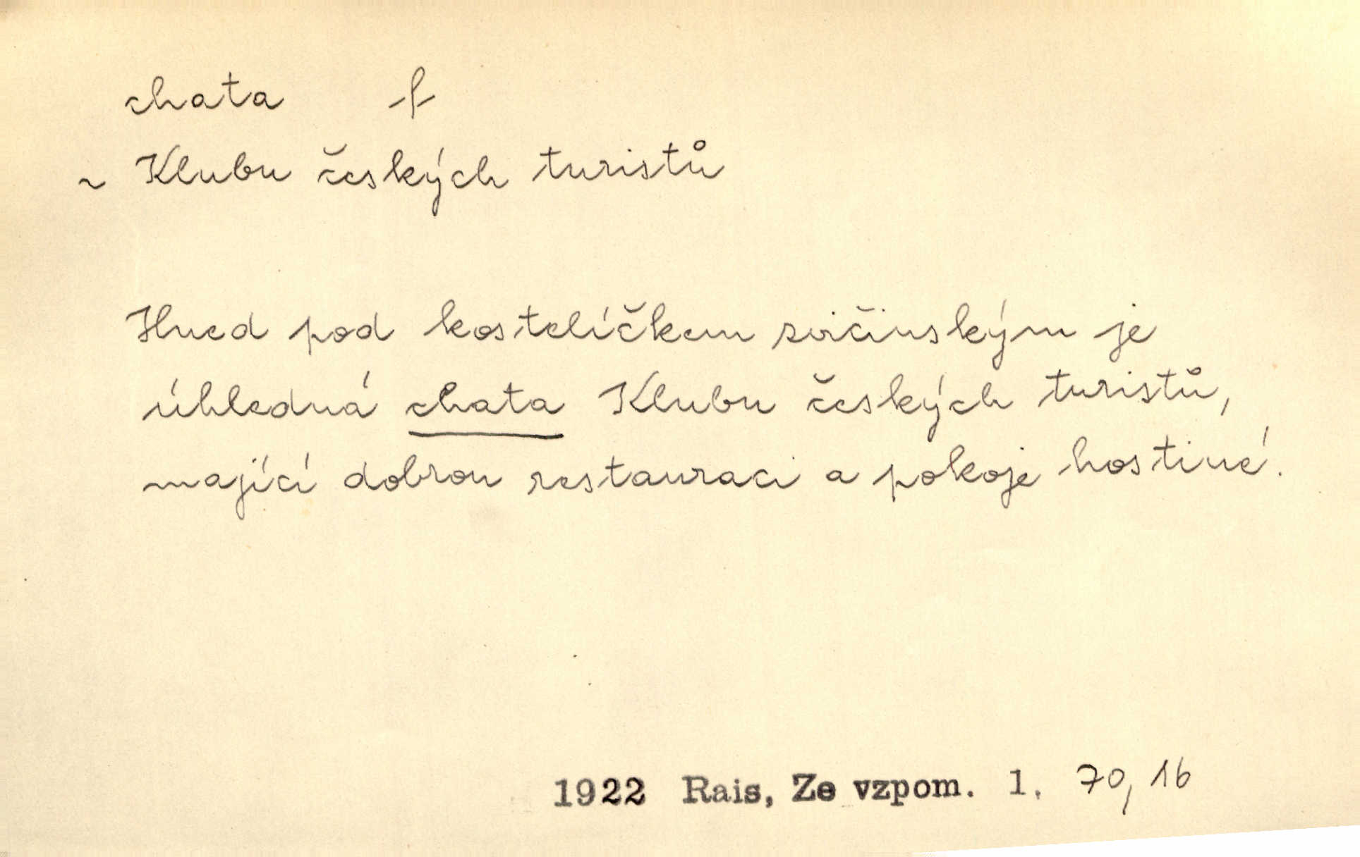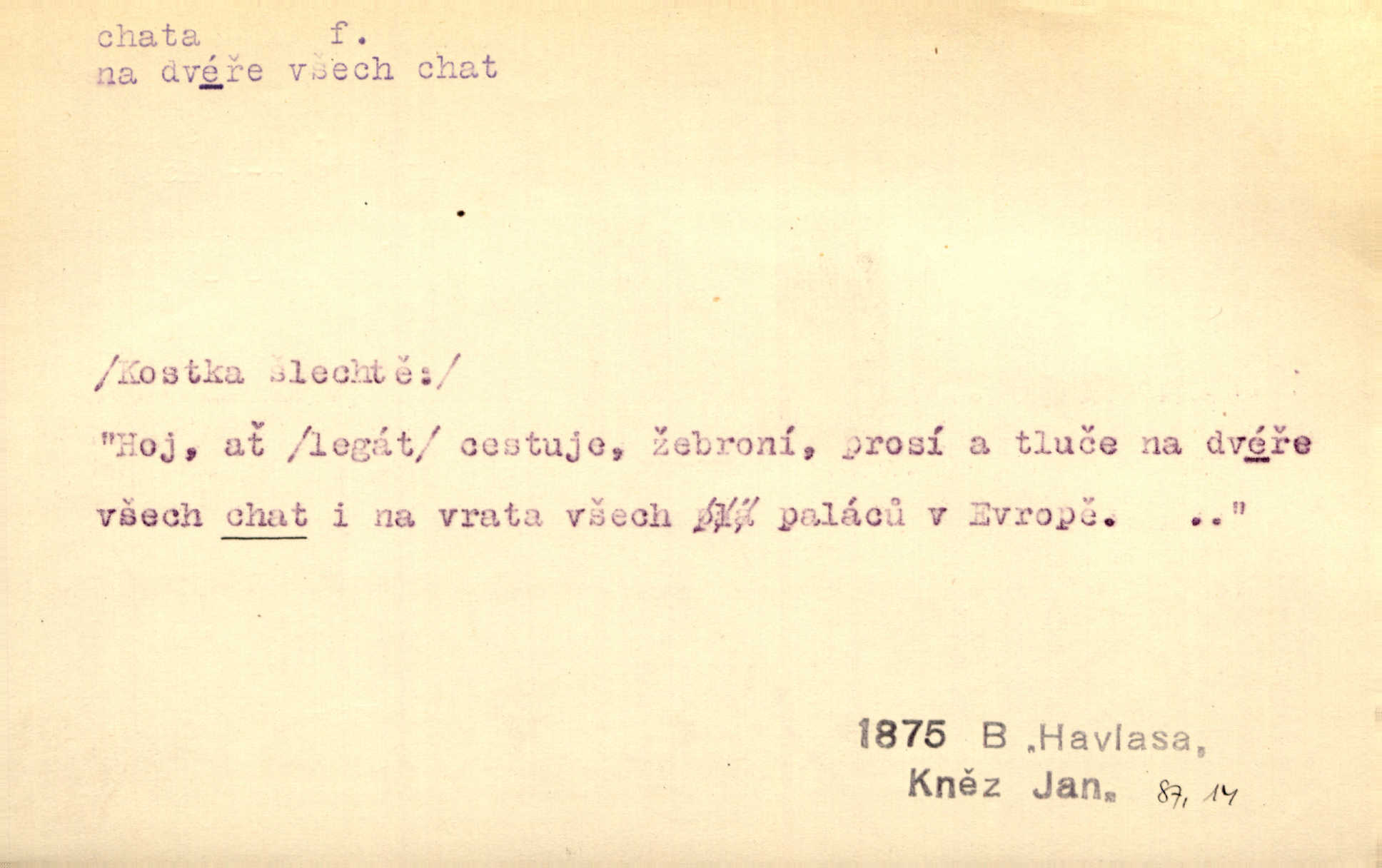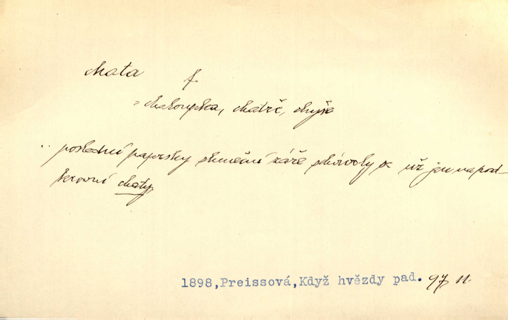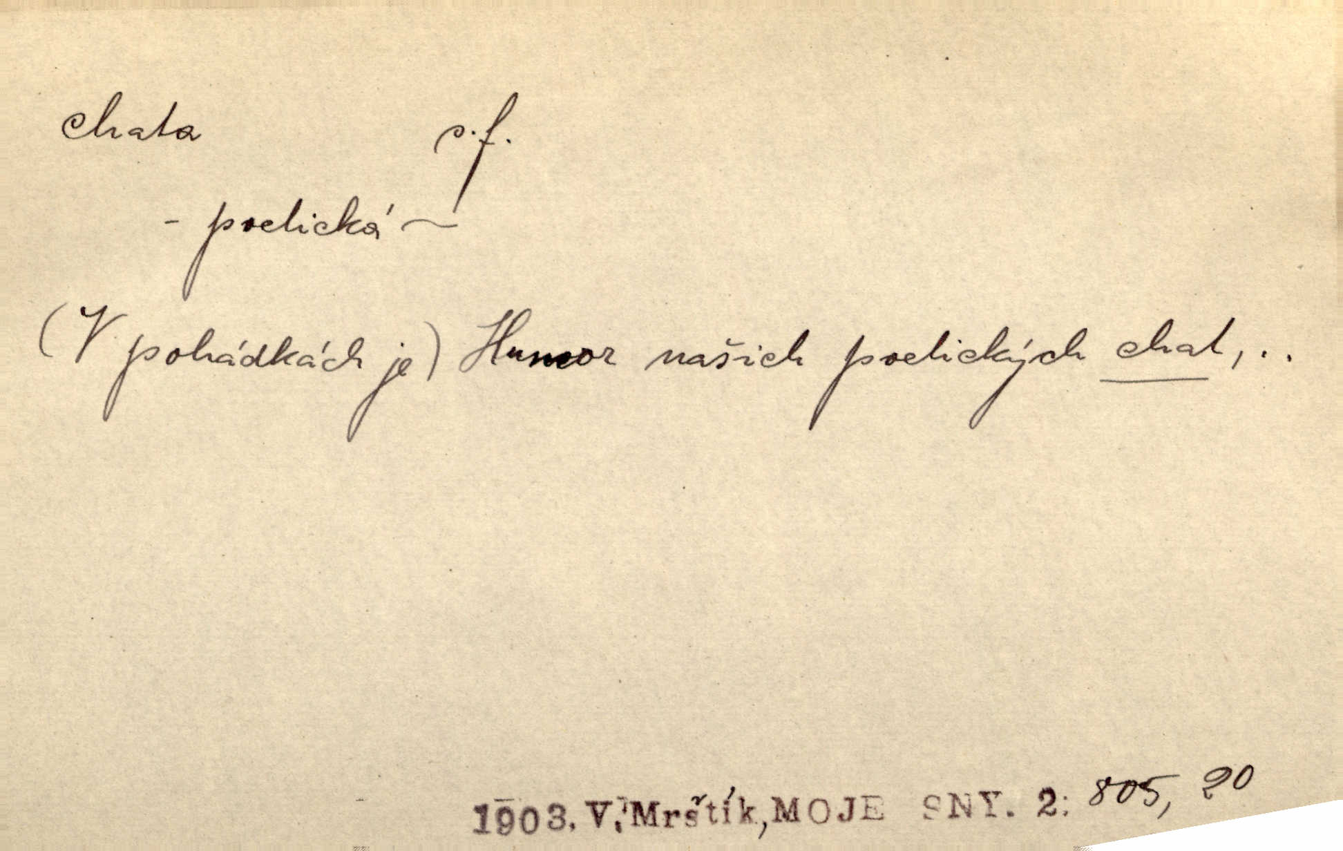 - chata, -y f. nuzná chaloupka, chatrč, chyše. Za ranního šera vycházel [Šimon] ze své chatrné roubené chaty pod došky. Jir. Tyto dělníky [šumavské] odsuzovaly sněhy k dlouhým zahálkám, k tuhému uvěznění ve chatách jejich. Klost. Sport. chata trampská, weekendová menší prostá stavba, obyčejně dřevěná, postavená v lesnaté krajině n. u vody. Turist. hotel pro turisty v horách. Chata Klubu československých turistů.