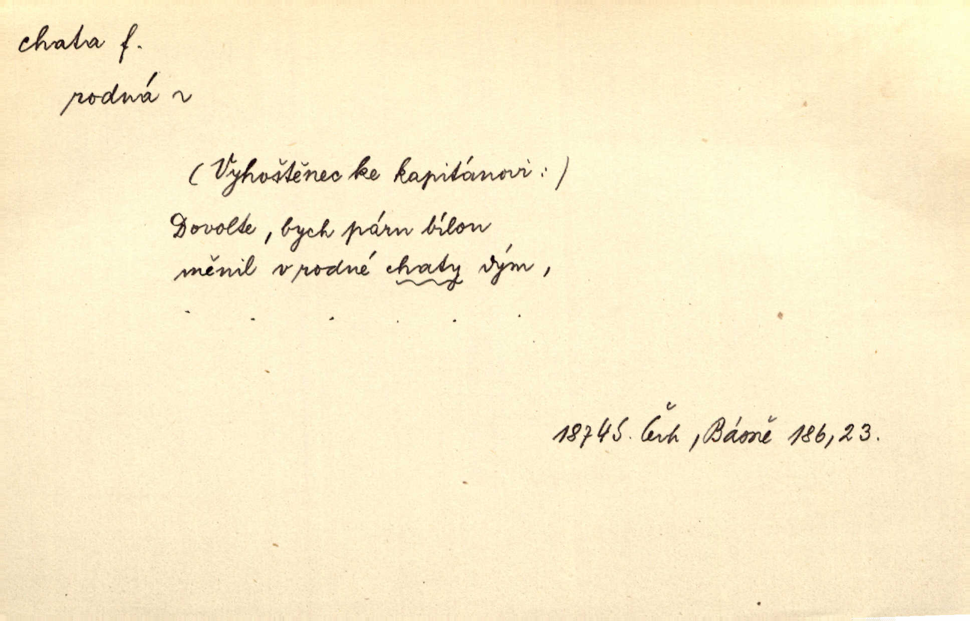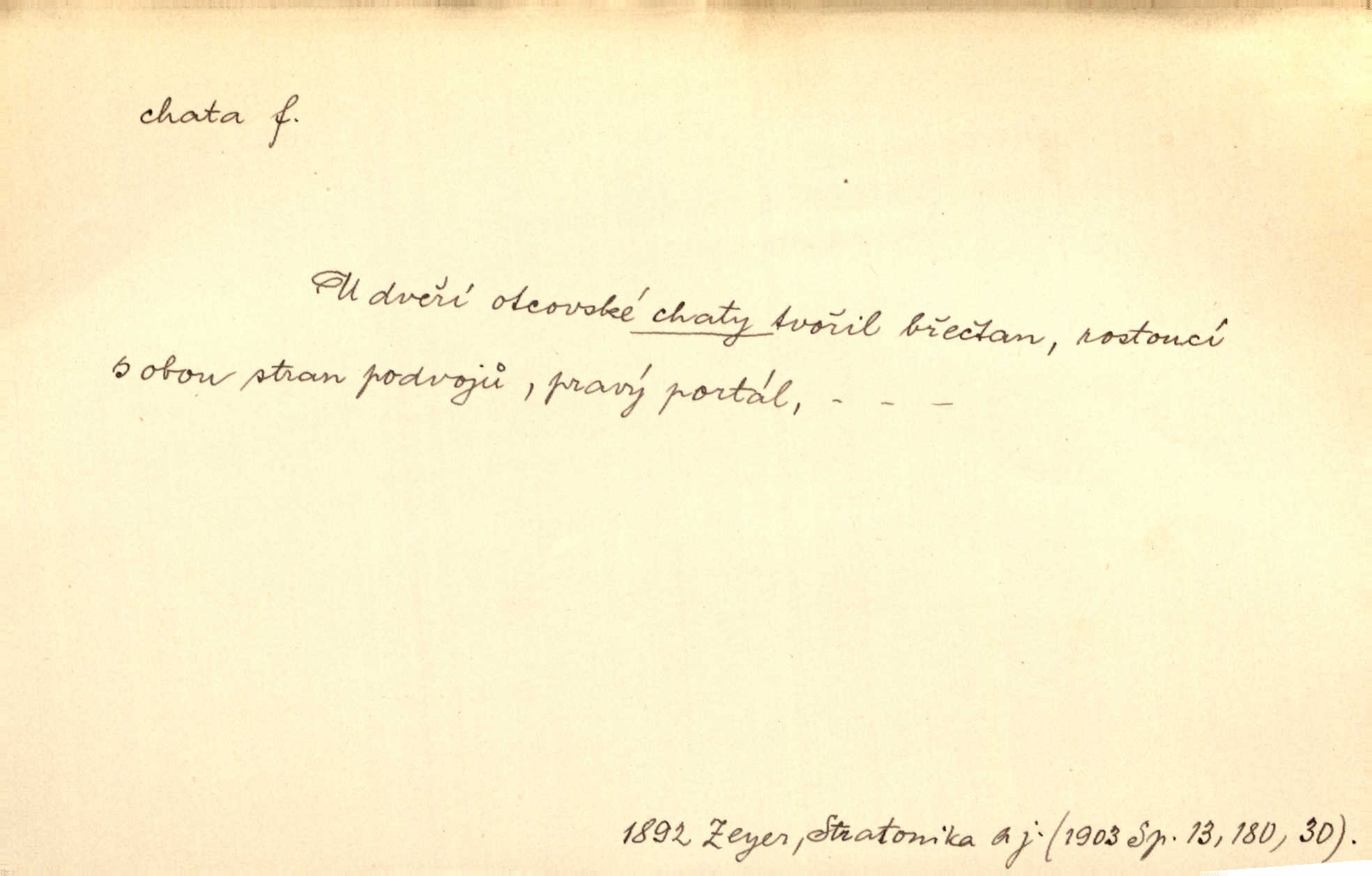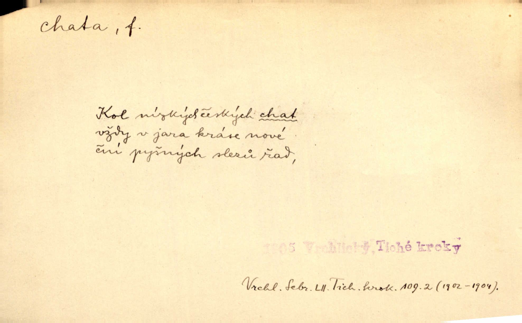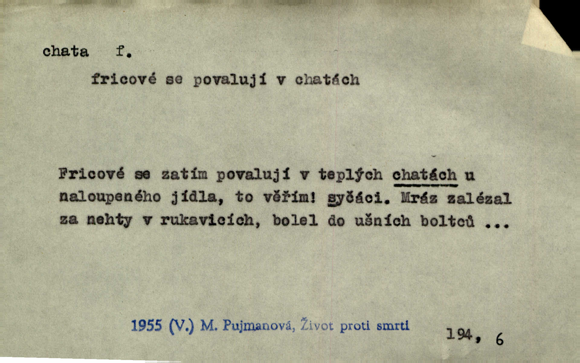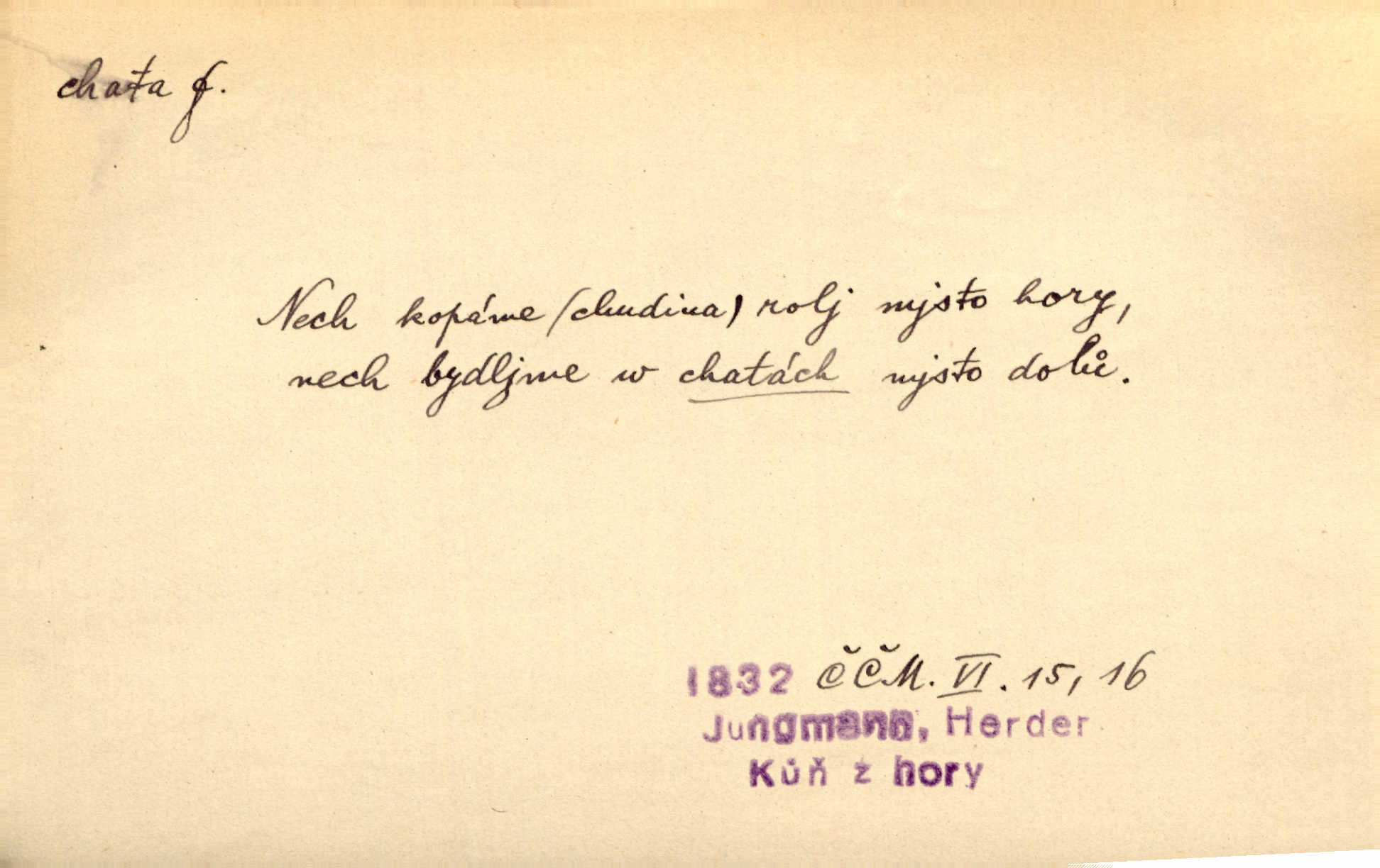 - chata, -y f. nuzná chaloupka, chatrč, chyše. Za ranního šera vycházel [Šimon] ze své chatrné roubené chaty pod došky. Jir. Tyto dělníky [šumavské] odsuzovaly sněhy k dlouhým zahálkám, k tuhému uvěznění ve chatách jejich. Klost. Sport. chata trampská, weekendová menší prostá stavba, obyčejně dřevěná, postavená v lesnaté krajině n. u vody. Turist. hotel pro turisty v horách. Chata Klubu československých turistů.