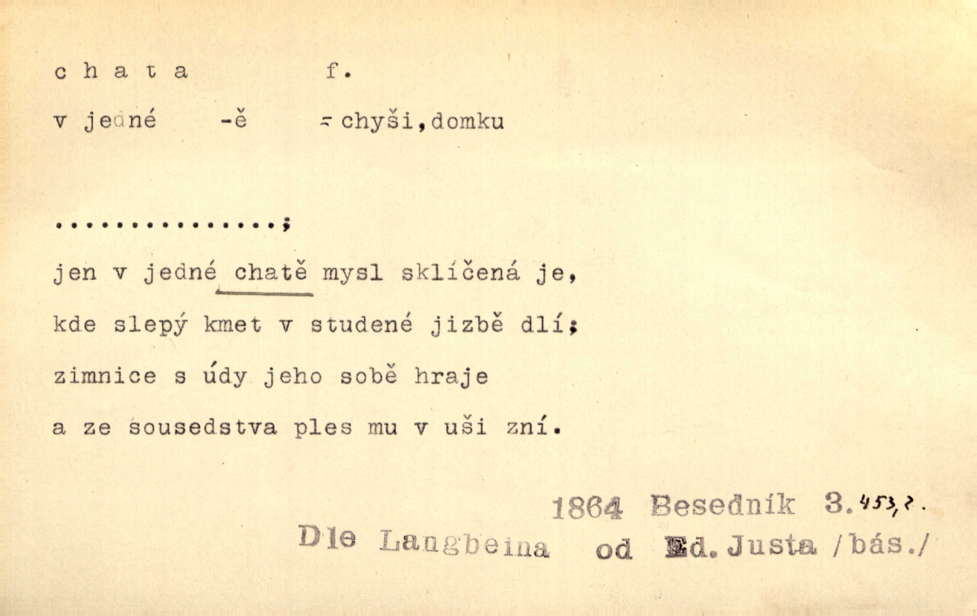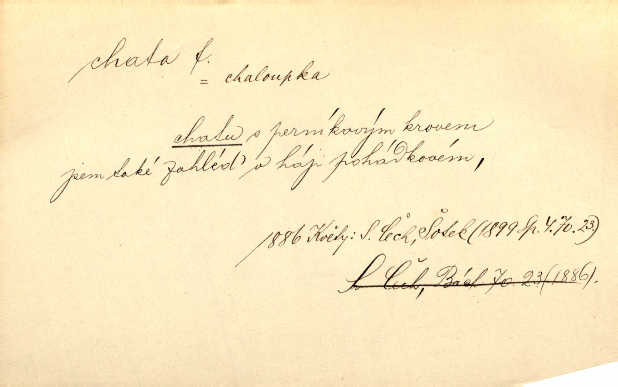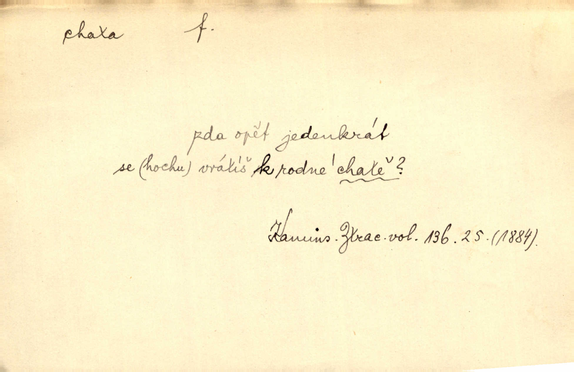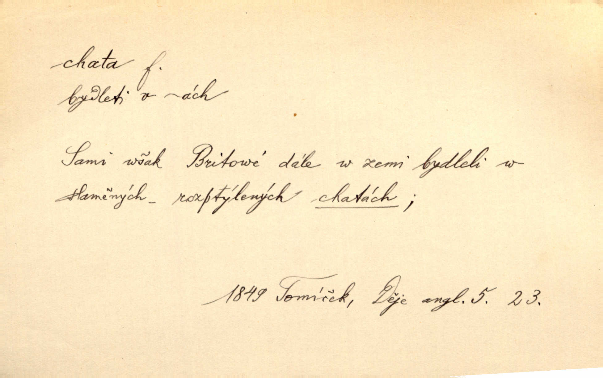 - chata, -y f. nuzná chaloupka, chatrč, chyše. Za ranního šera vycházel [Šimon] ze své chatrné roubené chaty pod došky. Jir. Tyto dělníky [šumavské] odsuzovaly sněhy k dlouhým zahálkám, k tuhému uvěznění ve chatách jejich. Klost. Sport. chata trampská, weekendová menší prostá stavba, obyčejně dřevěná, postavená v lesnaté krajině n. u vody. Turist. hotel pro turisty v horách. Chata Klubu československých turistů.