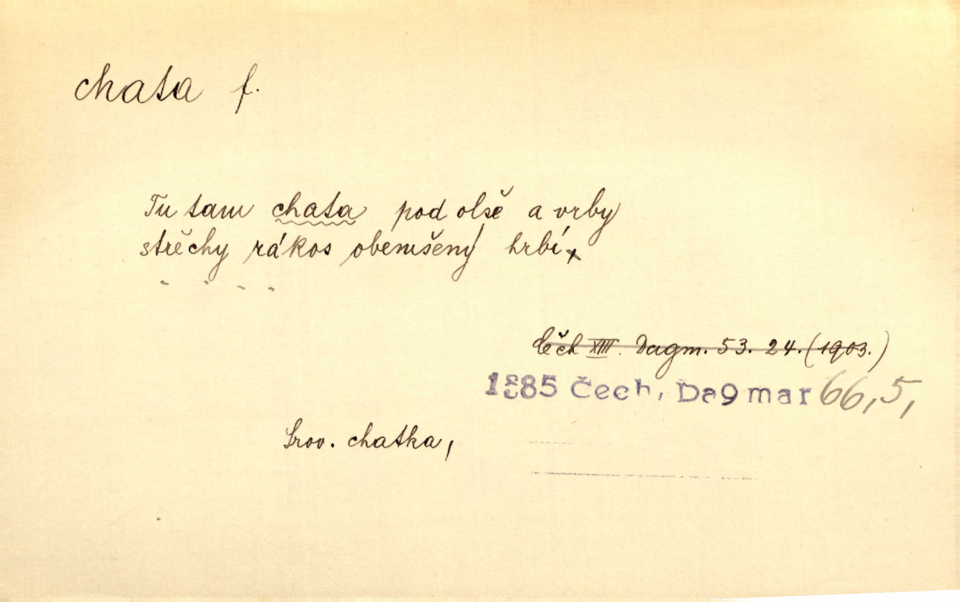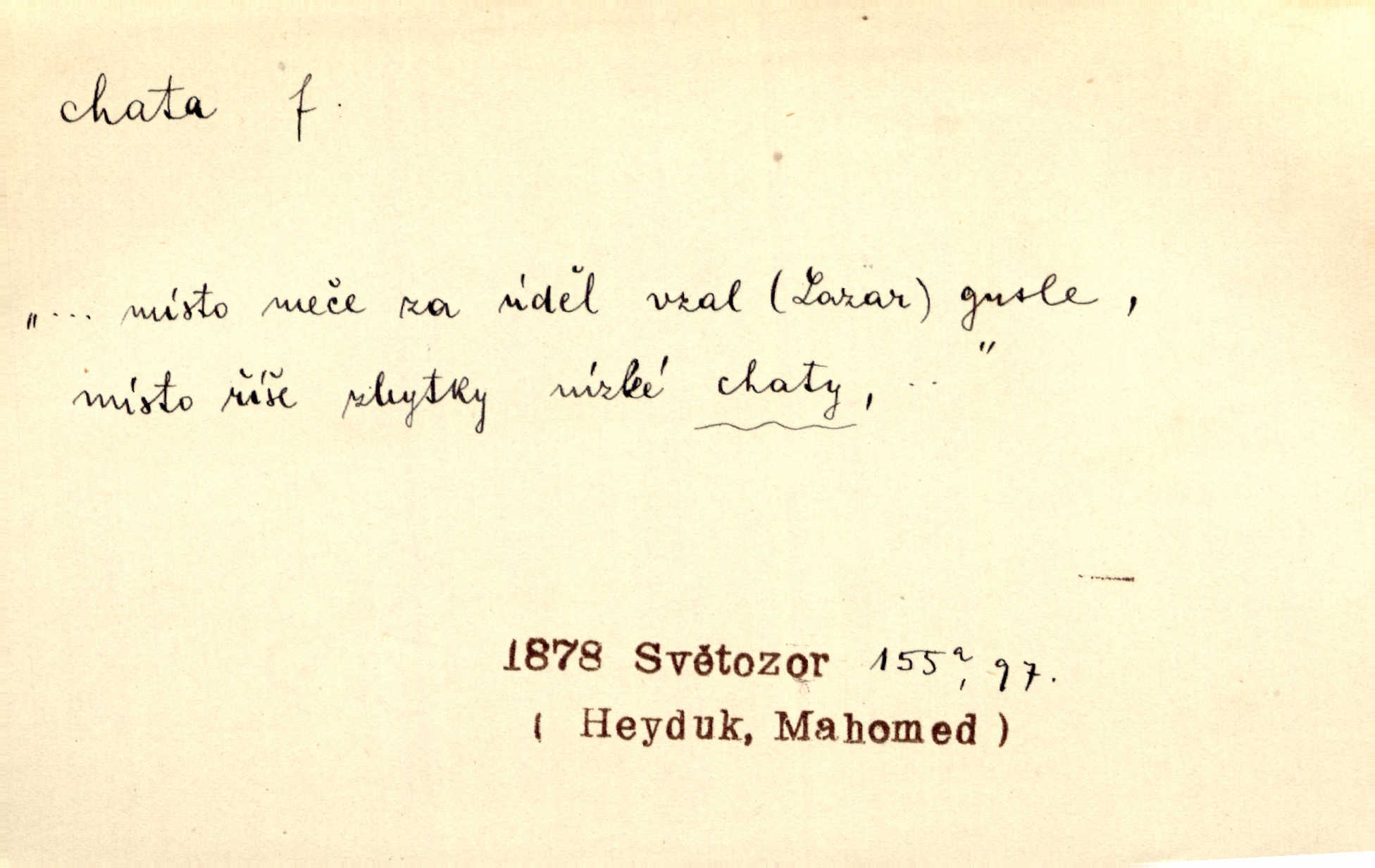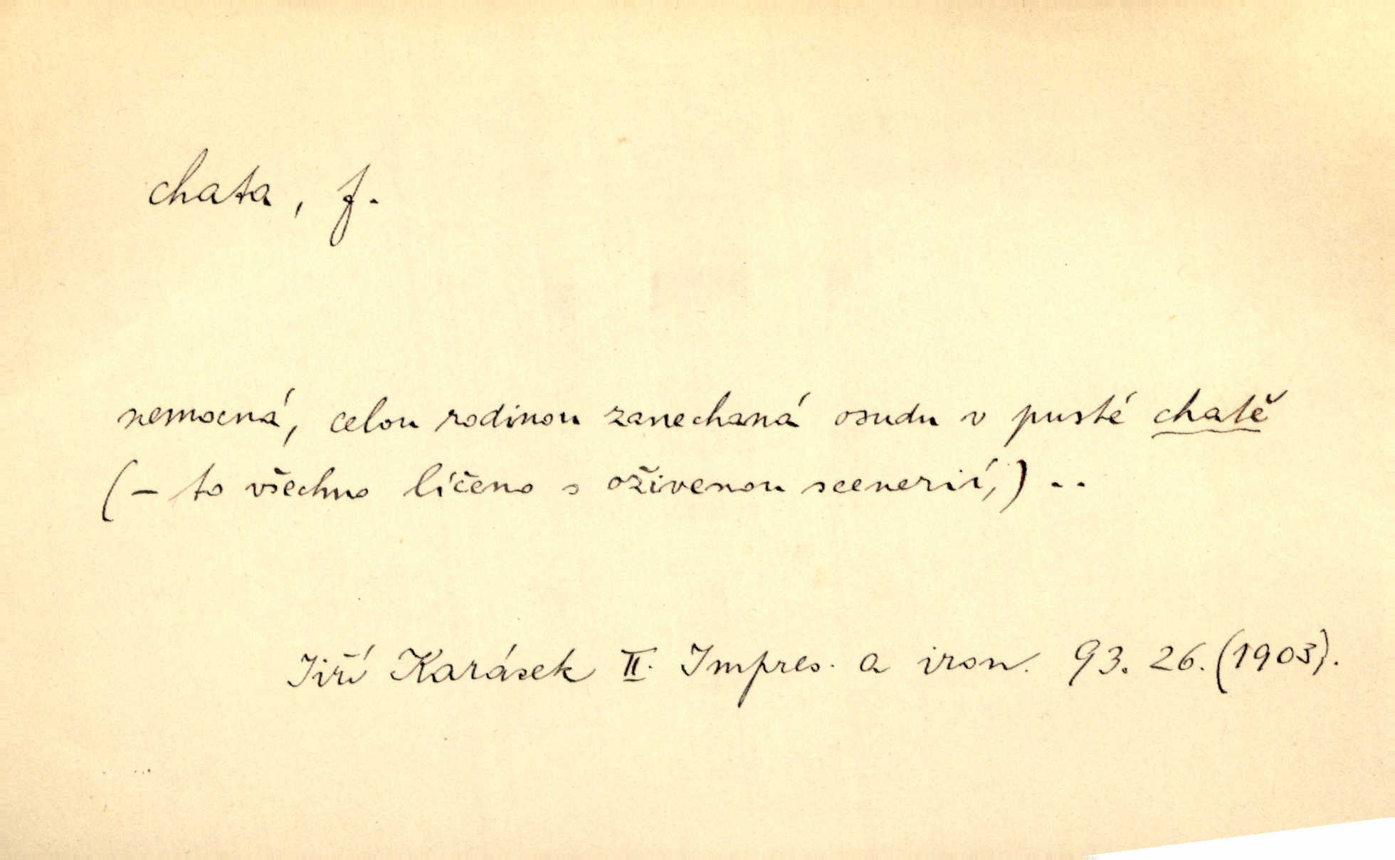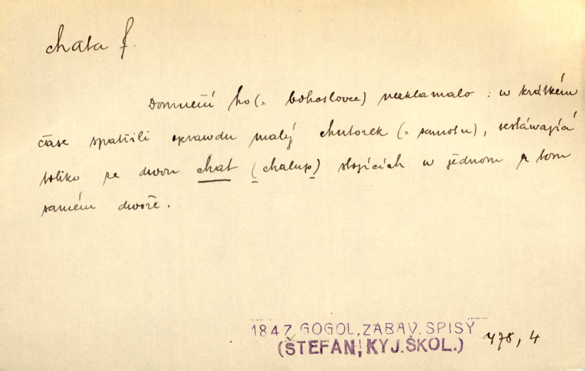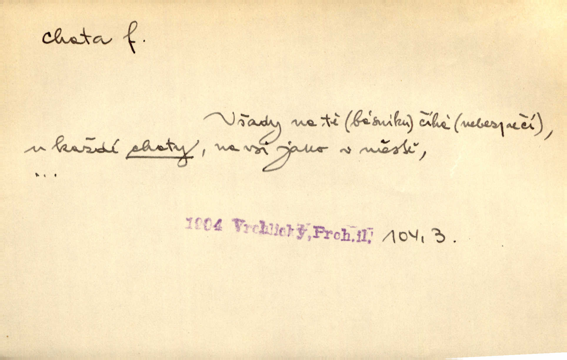 - chata, -y f. nuzná chaloupka, chatrč, chyše. Za ranního šera vycházel [Šimon] ze své chatrné roubené chaty pod došky. Jir. Tyto dělníky [šumavské] odsuzovaly sněhy k dlouhým zahálkám, k tuhému uvěznění ve chatách jejich. Klost. Sport. chata trampská, weekendová menší prostá stavba, obyčejně dřevěná, postavená v lesnaté krajině n. u vody. Turist. hotel pro turisty v horách. Chata Klubu československých turistů.