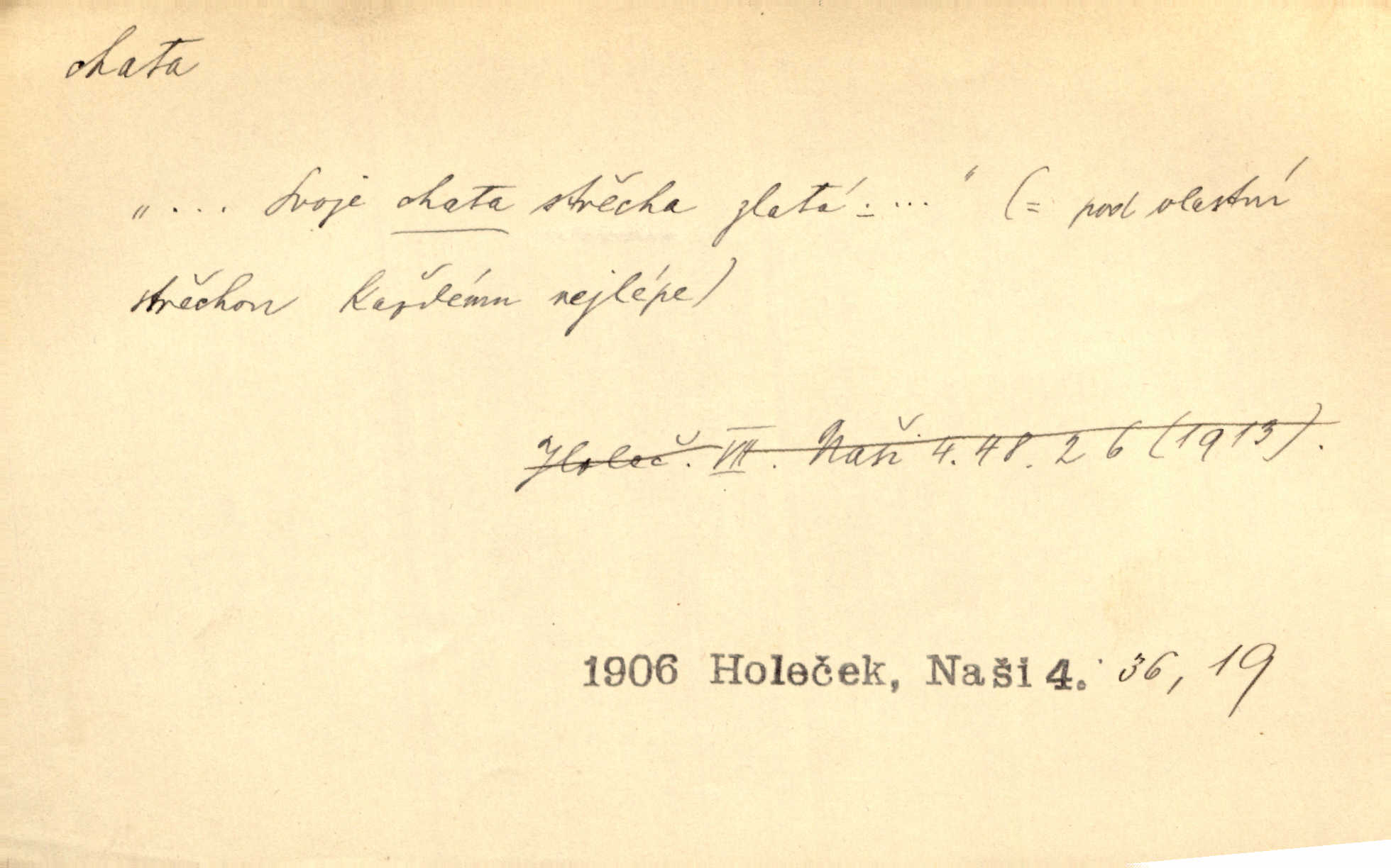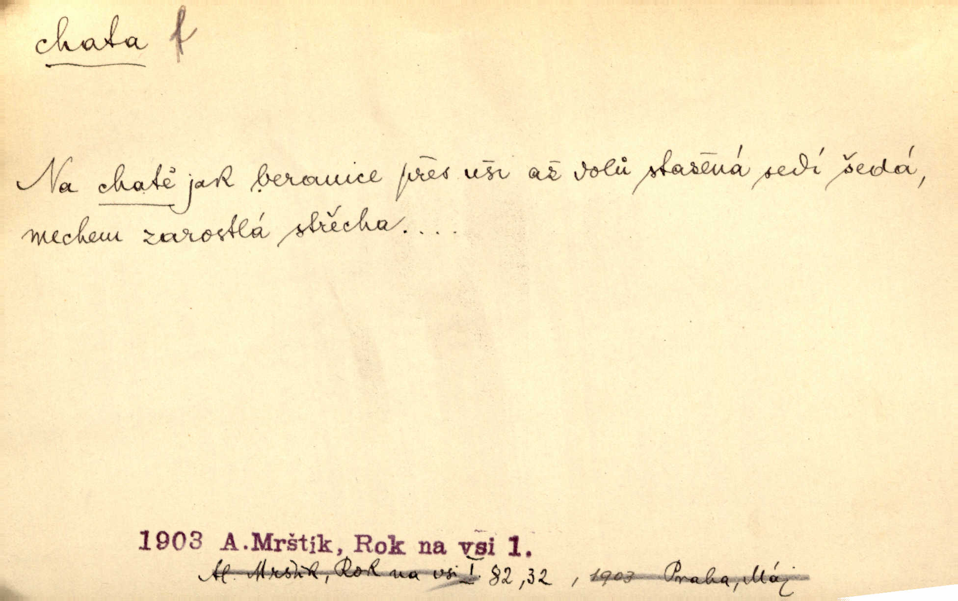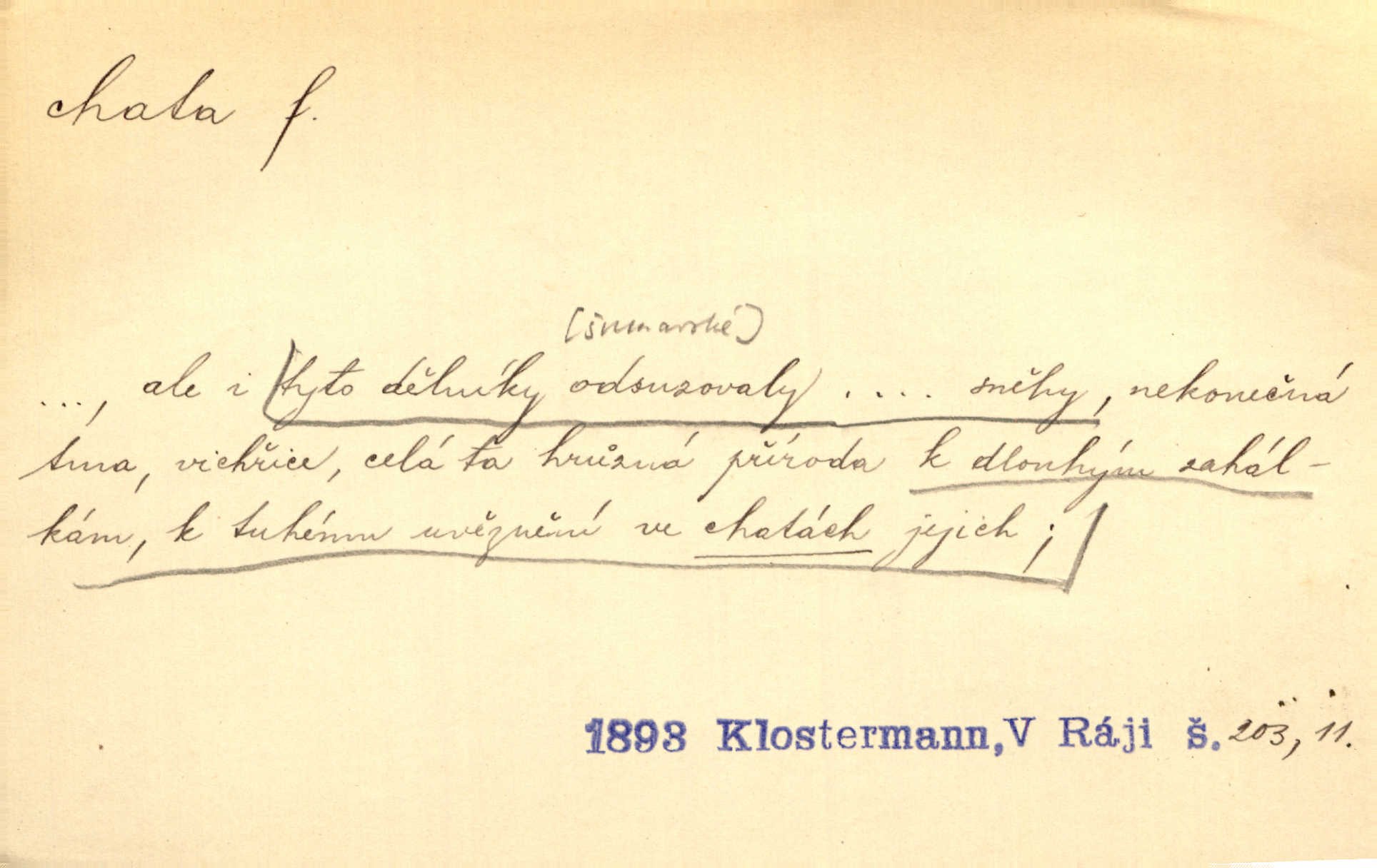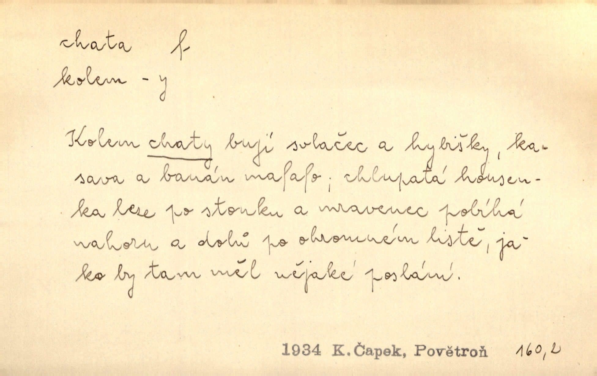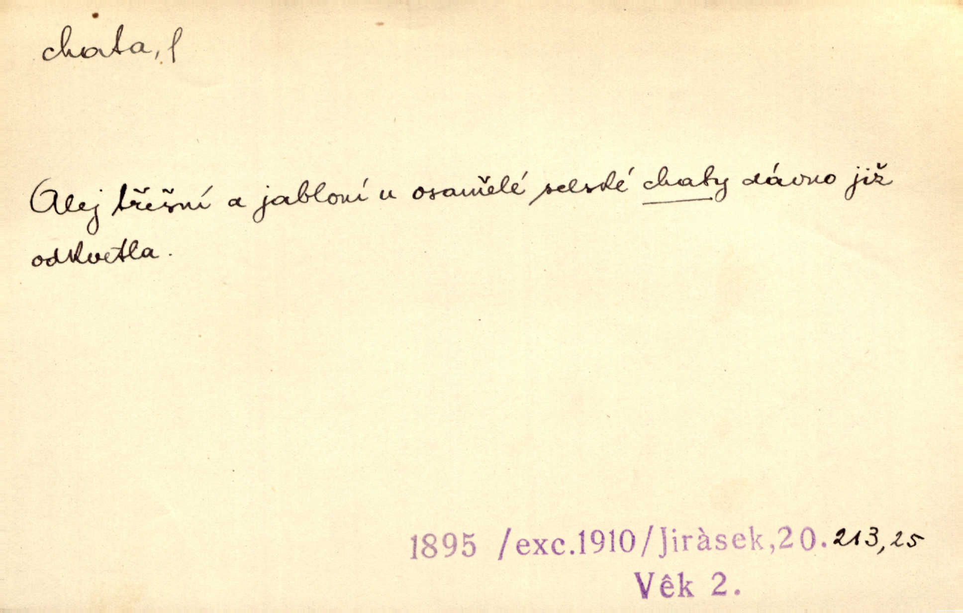- chata, -y f. nuzná chaloupka, chatrč, chyše. Za ranního šera vycházel [Šimon] ze své chatrné roubené chaty pod došky. Jir. Tyto dělníky [šumavské] odsuzovaly sněhy k dlouhým zahálkám, k tuhému uvěznění ve chatách jejich. Klost. Sport. chata trampská, weekendová menší prostá stavba, obyčejně dřevěná, postavená v lesnaté krajině n. u vody. Turist. hotel pro turisty v horách. Chata Klubu československých turistů.