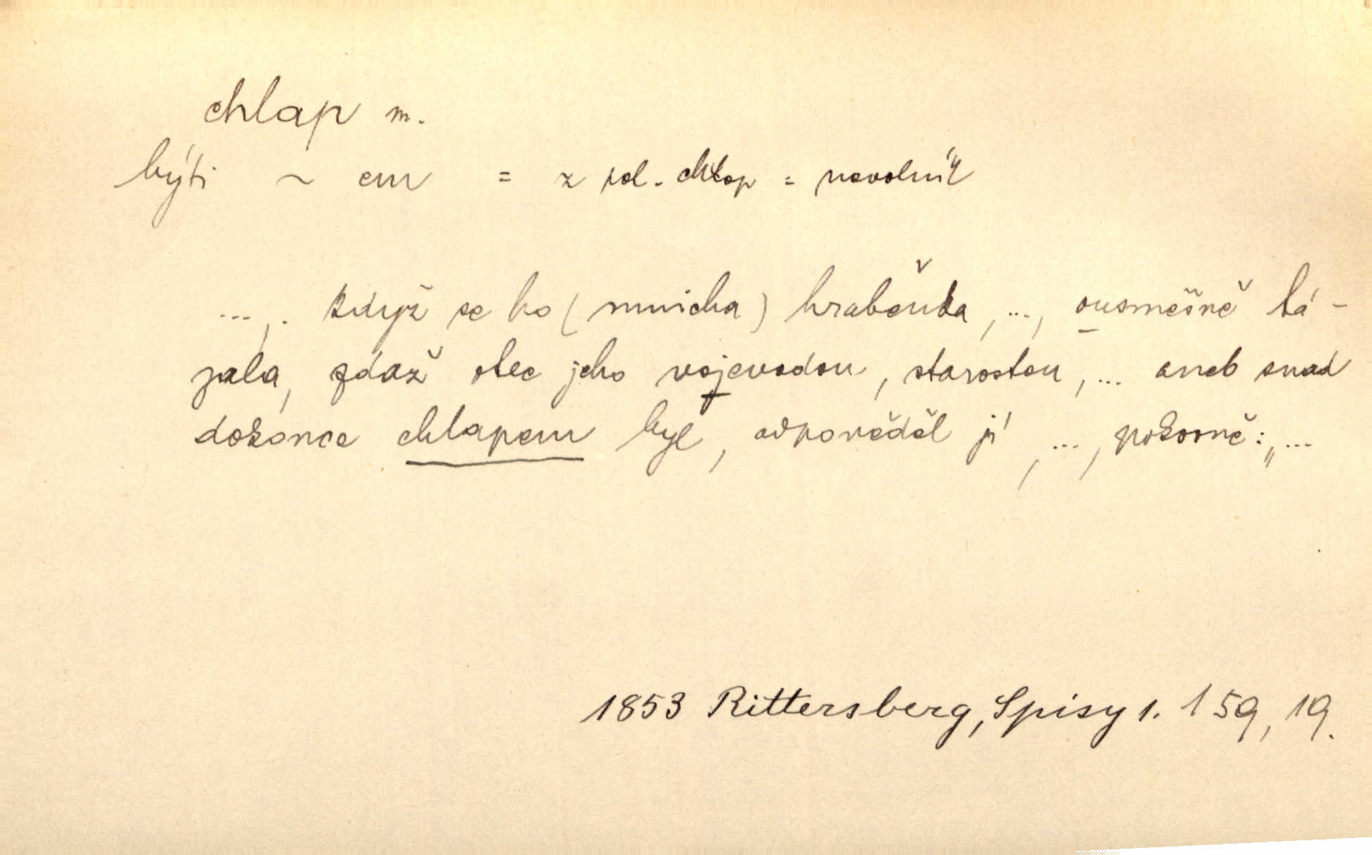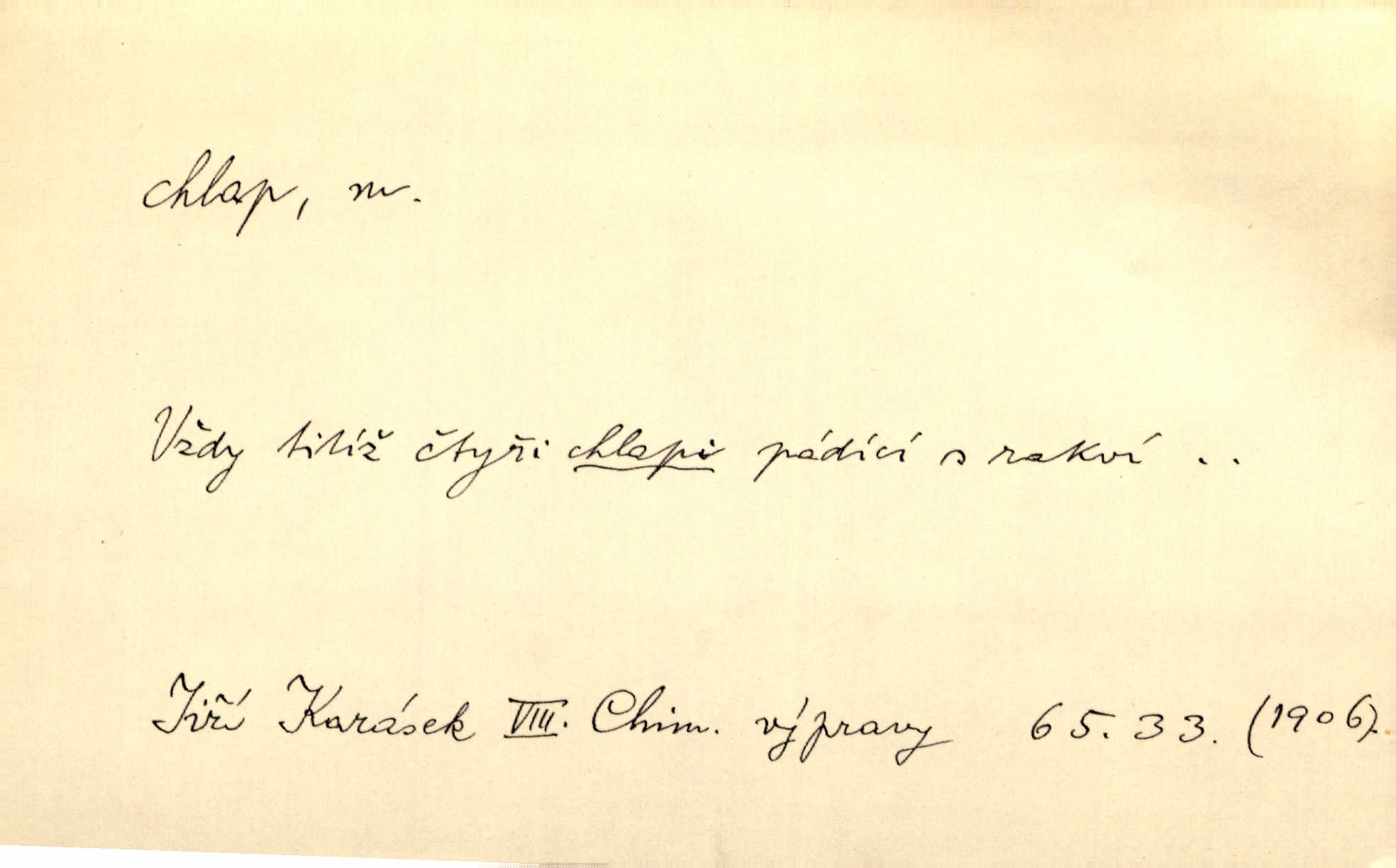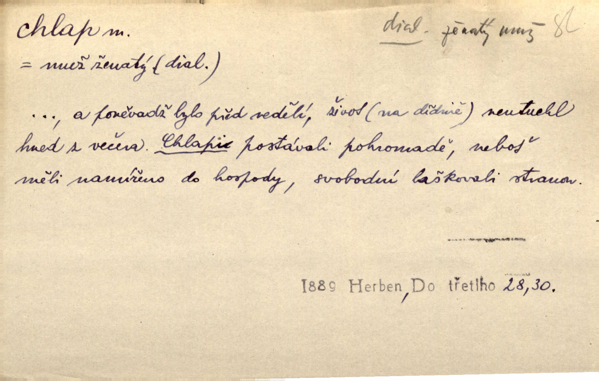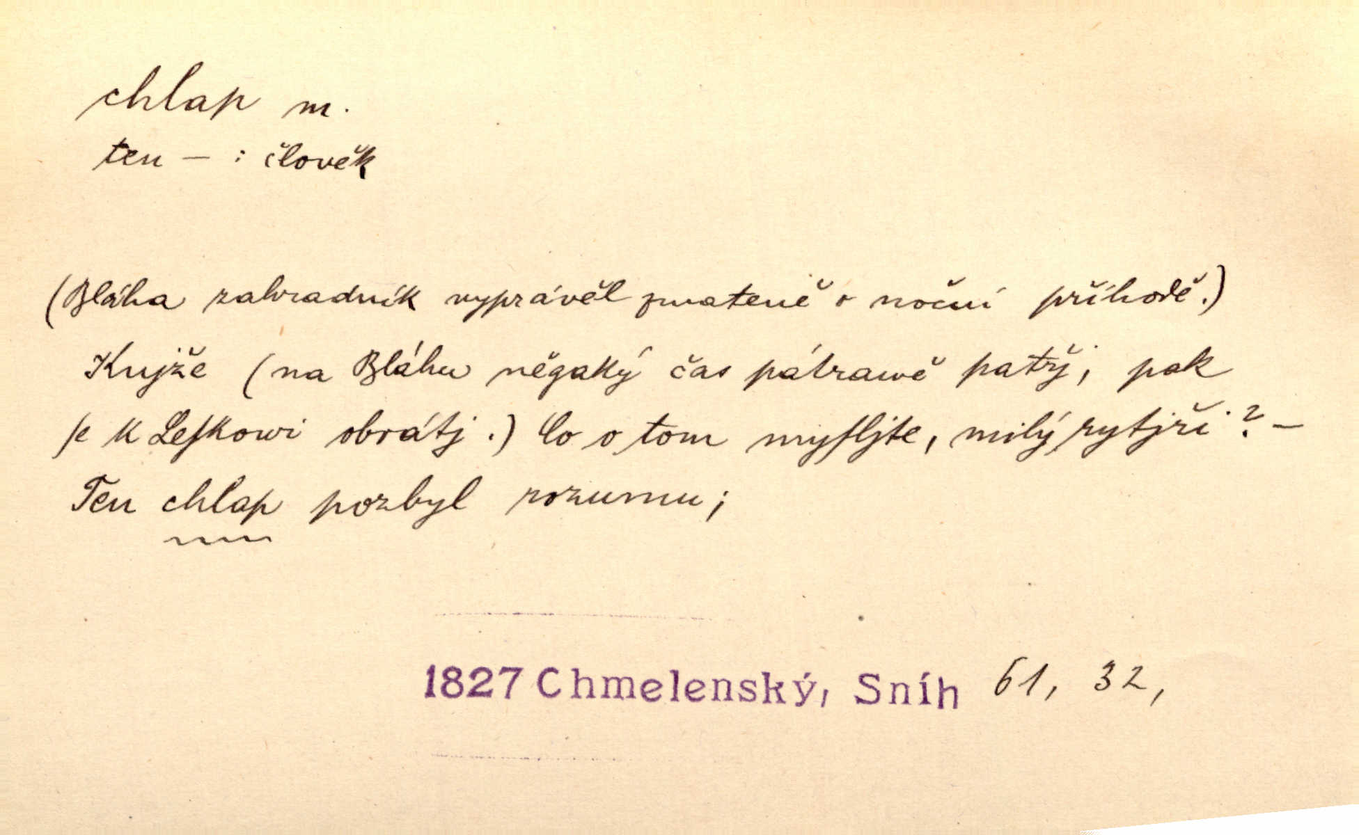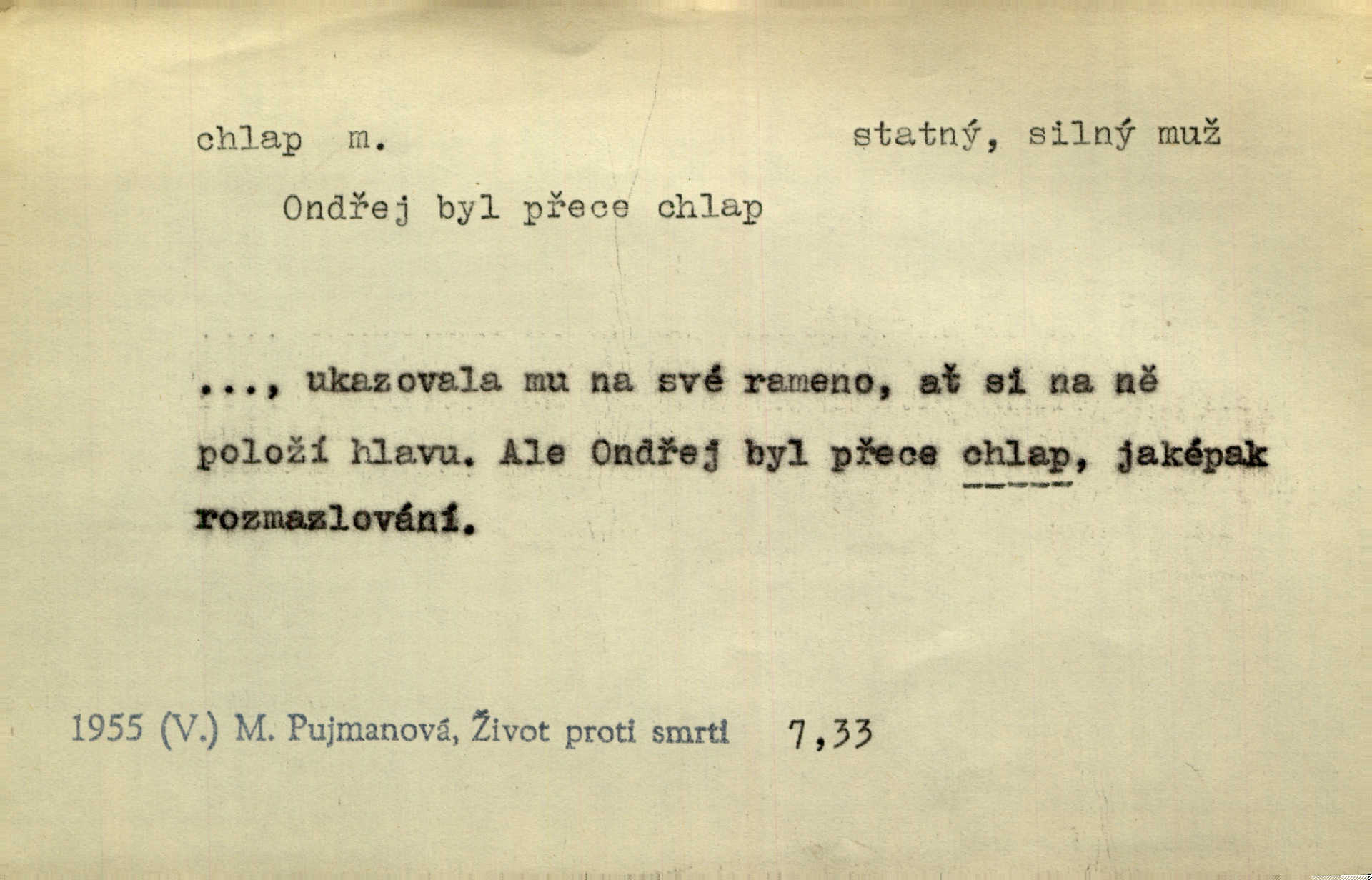 - chlap, -a m. lid. dospělý muž. Dívám se na tebe [Janošík na Ilčíka] a vidím, že už nejsi chlapec, ale chlap. Mah. „Za chlapa má síly,“ říkali o ní, když viděli, jak do vozů zvedá těžké kostky kamenné. Baar. Do světnice přihnala se bosá děvečka velká jako chlap. Jir. D Expr. buď pejor. (dareba, ničema a p.) n. hypok. (statný, velký n. řádný, hodný člověk; žert. i o zvířatech). Vem čert už trochu toho paše, ale to mě zlobí, jak ten chlap [pašerák] moh’ zmizet. Jir. Aspoň mně k vůli měl bys, pane nadporučíku, tohohle chlapa [neposlušného vojáka] jednou přivázat. Šrám. Kdopak by byl takový dareba chlap! Hál. Thámová pořád ještě má v hlavě toho panáka, Amlinga, slabého herce, mizerného chlapa. Jir. Truhlář stavby a nábytku, chlap jako hora a při tom cvičitel „Sokola“. Kam. Není už zrovna hošek [ženich], ale fešák, dobrý chlap. Já jsem chlap dobrá, ale umím bejt taky neřád. Čap. Ch. To mne těší, že někomu se po mně, starém chlapu, stýská! Šmil. Chlap je to řádný [chycený sumec] — do centnýře nebude mnoho scházet. Leg. Ten [špaček] je pitvora, ale jináč dobrý chlap, nasměju se mu. D Expr. mužský. Do kavárny jsi chodila tančit, jen aby ses tam mohla slízat s chlapy. Nor. D Dial. ženatý muž. Chlapi postávali pohromadě, neboť měli namířeno do hospody, svobodní laškovali stranou. Herb. D Arch. poddaný, nevolník. Národ dělil se vůbec na svobody a chlapy, čili pány a parobky. Pal. Blýská po jhu zašlém oko chtivé zpět, po nevolné zemi s pány, chlapy. Čech.