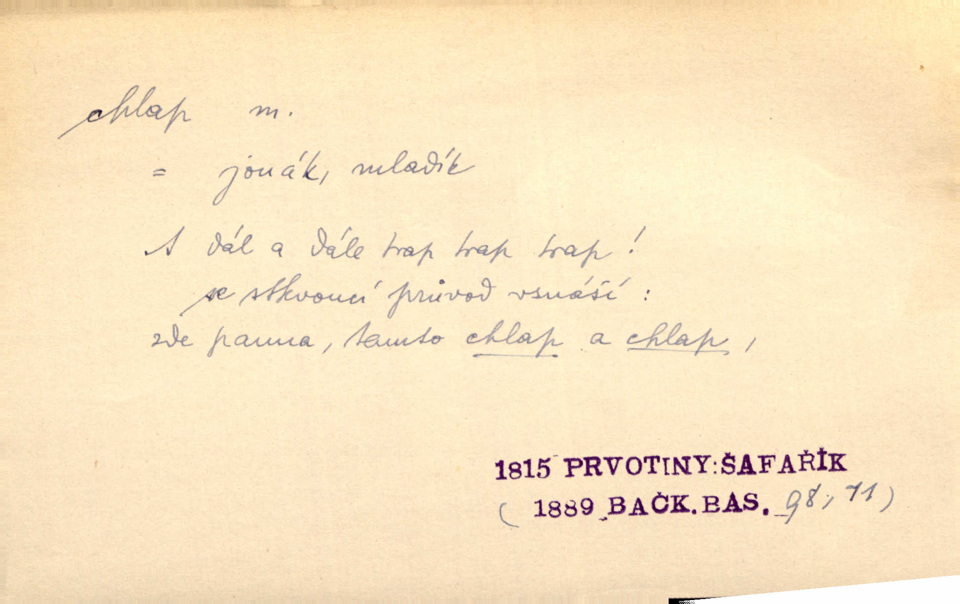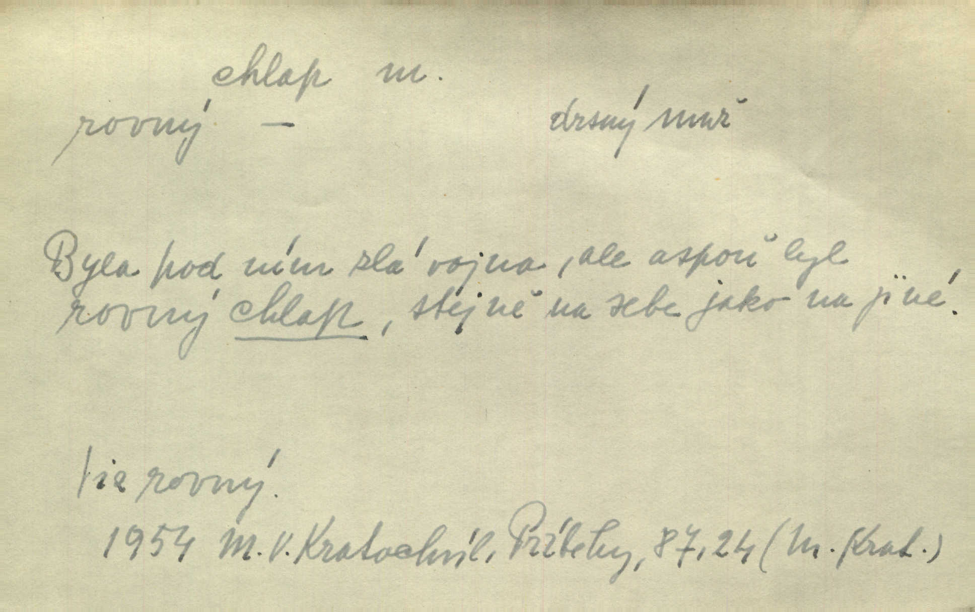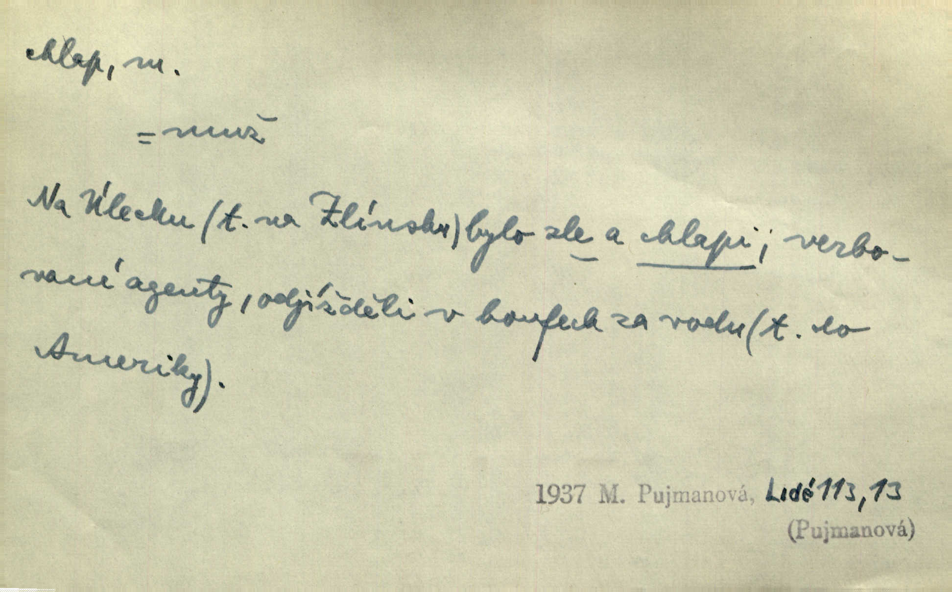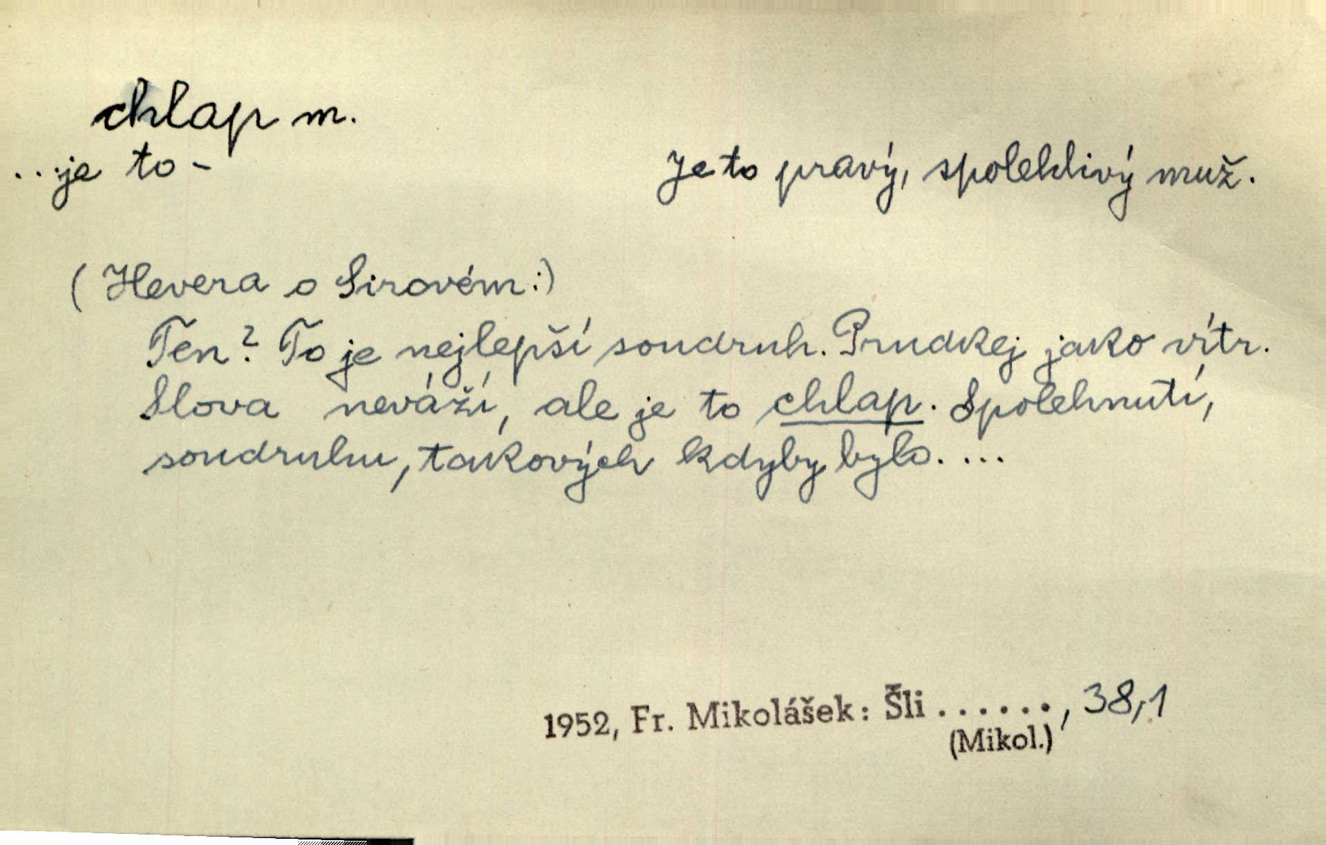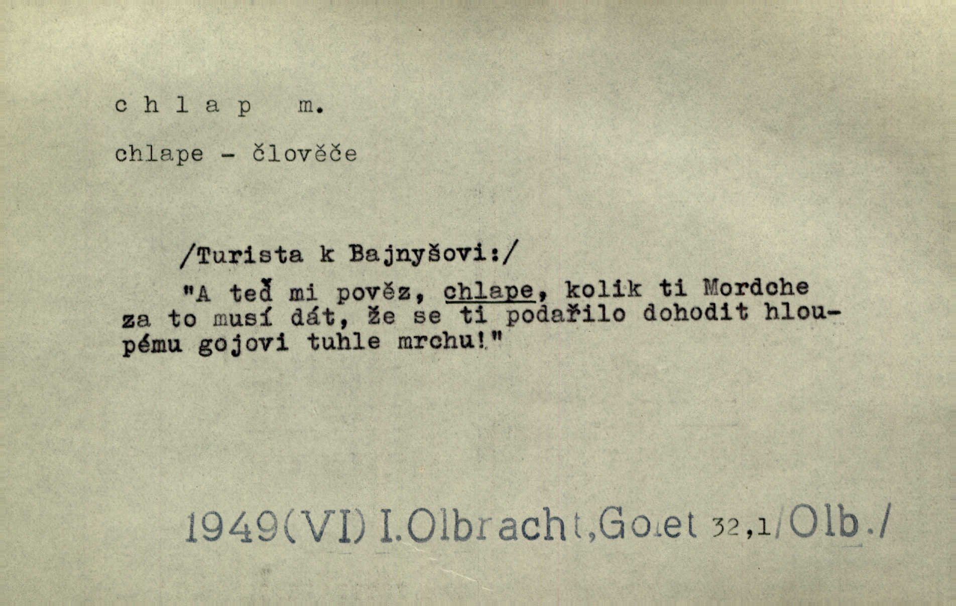 - chlap, -a m. lid. dospělý muž. Dívám se na tebe [Janošík na Ilčíka] a vidím, že už nejsi chlapec, ale chlap. Mah. „Za chlapa má síly,“ říkali o ní, když viděli, jak do vozů zvedá těžké kostky kamenné. Baar. Do světnice přihnala se bosá děvečka velká jako chlap. Jir. D Expr. buď pejor. (dareba, ničema a p.) n. hypok. (statný, velký n. řádný, hodný člověk; žert. i o zvířatech). Vem čert už trochu toho paše, ale to mě zlobí, jak ten chlap [pašerák] moh’ zmizet. Jir. Aspoň mně k vůli měl bys, pane nadporučíku, tohohle chlapa [neposlušného vojáka] jednou přivázat. Šrám. Kdopak by byl takový dareba chlap! Hál. Thámová pořád ještě má v hlavě toho panáka, Amlinga, slabého herce, mizerného chlapa. Jir. Truhlář stavby a nábytku, chlap jako hora a při tom cvičitel „Sokola“. Kam. Není už zrovna hošek [ženich], ale fešák, dobrý chlap. Já jsem chlap dobrá, ale umím bejt taky neřád. Čap. Ch. To mne těší, že někomu se po mně, starém chlapu, stýská! Šmil. Chlap je to řádný [chycený sumec] — do centnýře nebude mnoho scházet. Leg. Ten [špaček] je pitvora, ale jináč dobrý chlap, nasměju se mu. D Expr. mužský. Do kavárny jsi chodila tančit, jen aby ses tam mohla slízat s chlapy. Nor. D Dial. ženatý muž. Chlapi postávali pohromadě, neboť měli namířeno do hospody, svobodní laškovali stranou. Herb. D Arch. poddaný, nevolník. Národ dělil se vůbec na svobody a chlapy, čili pány a parobky. Pal. Blýská po jhu zašlém oko chtivé zpět, po nevolné zemi s pány, chlapy. Čech.