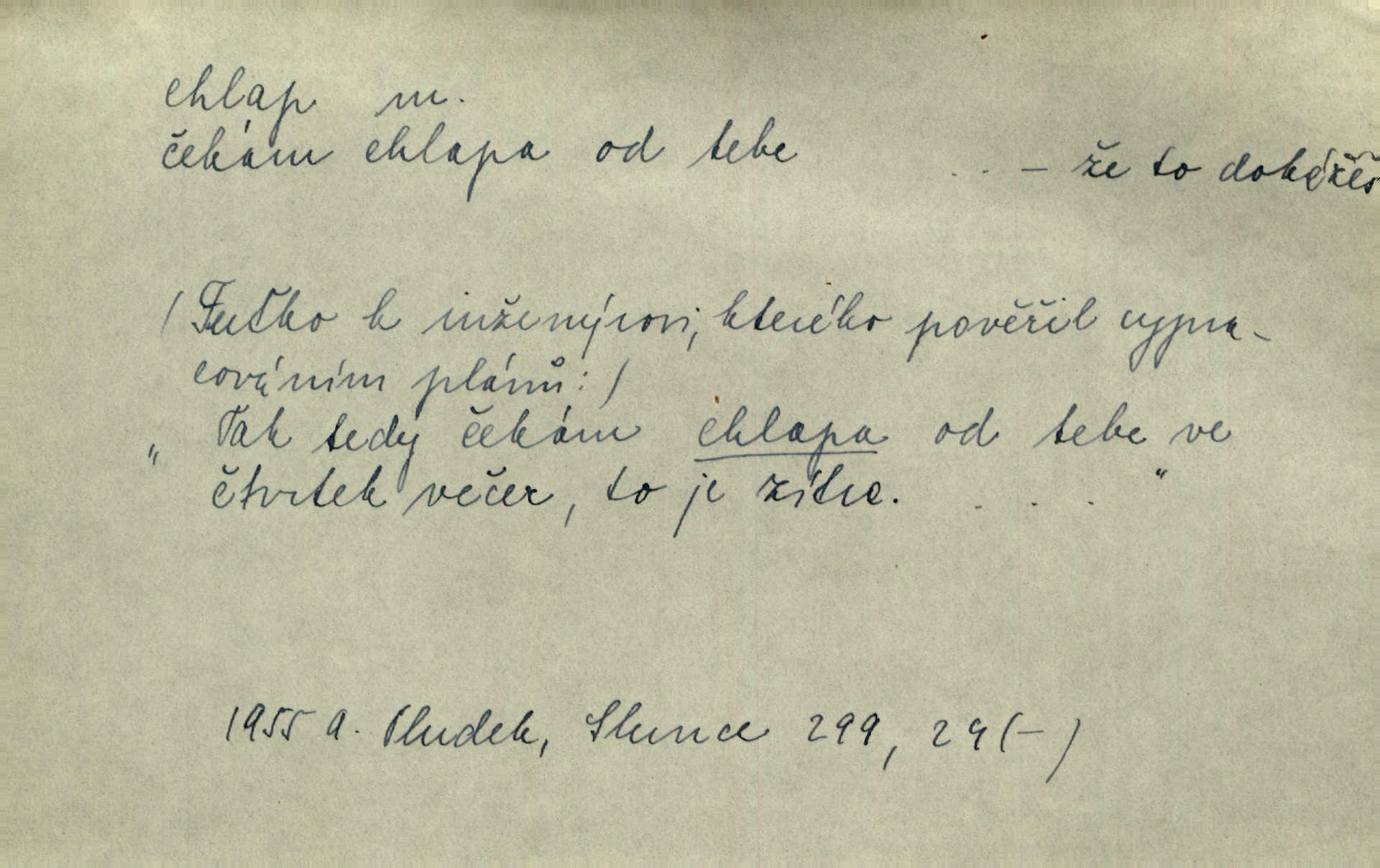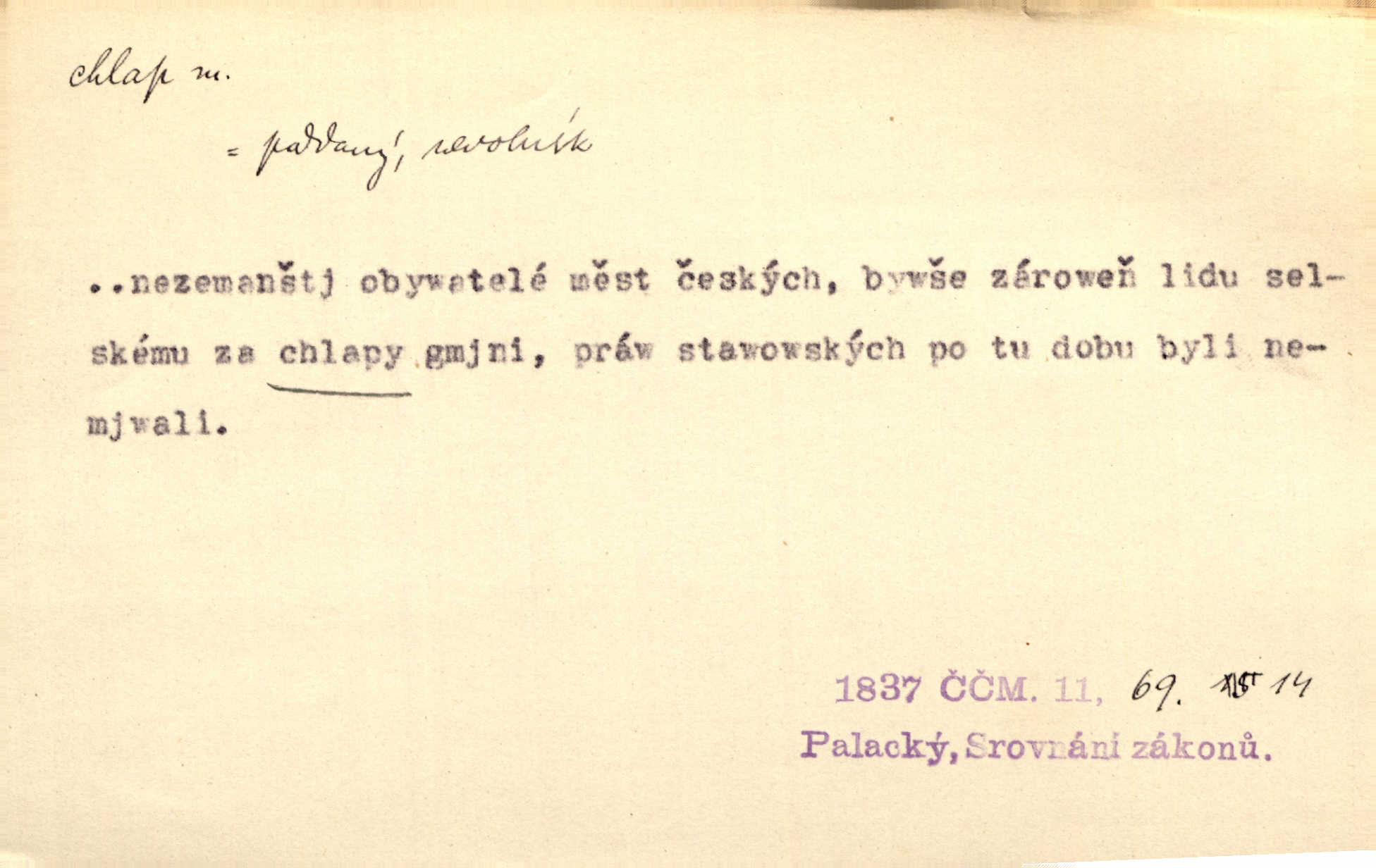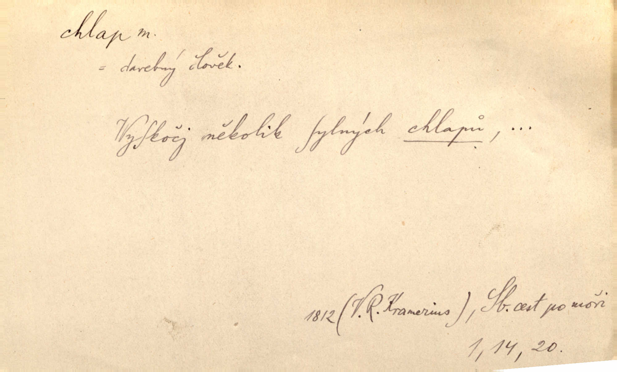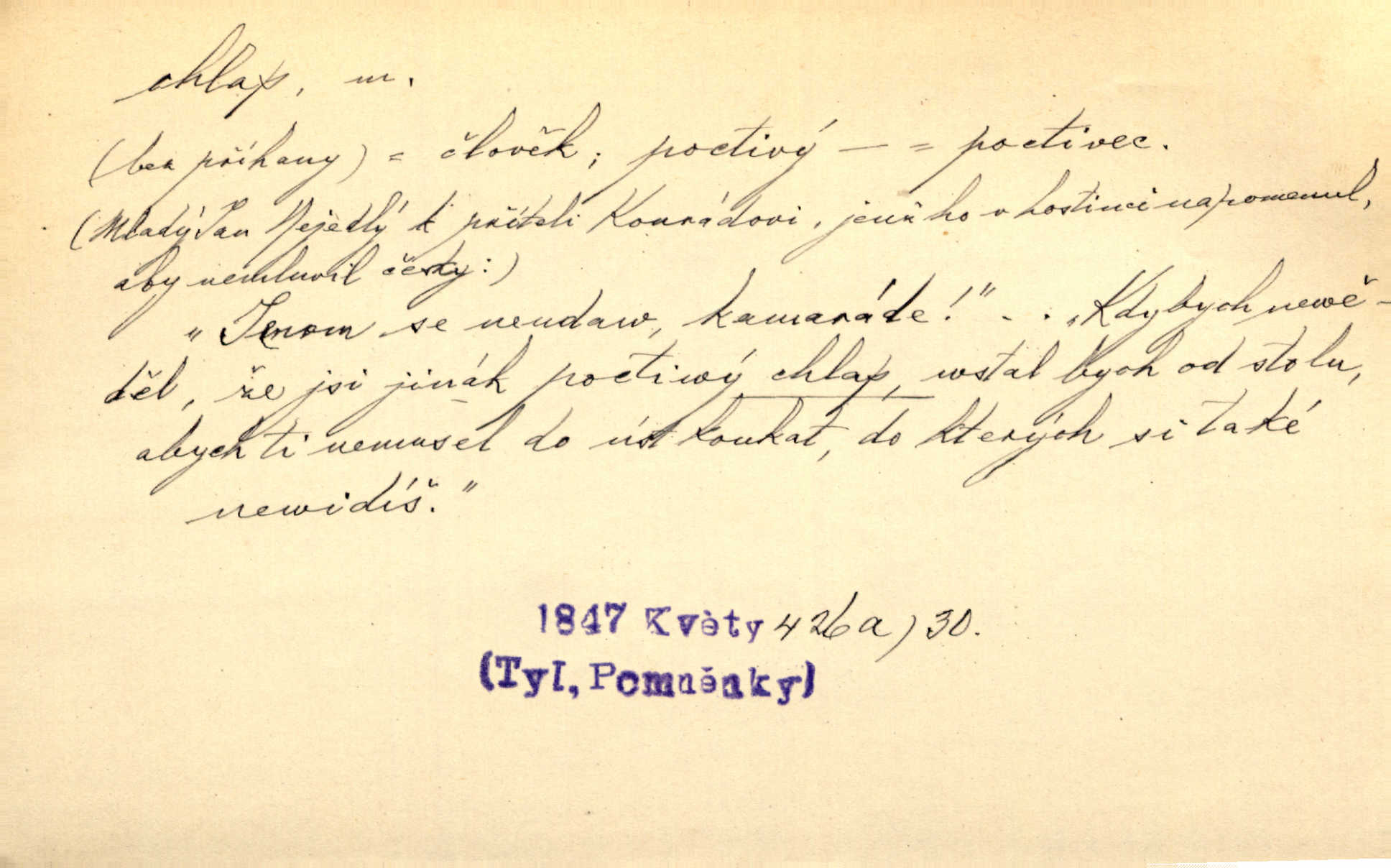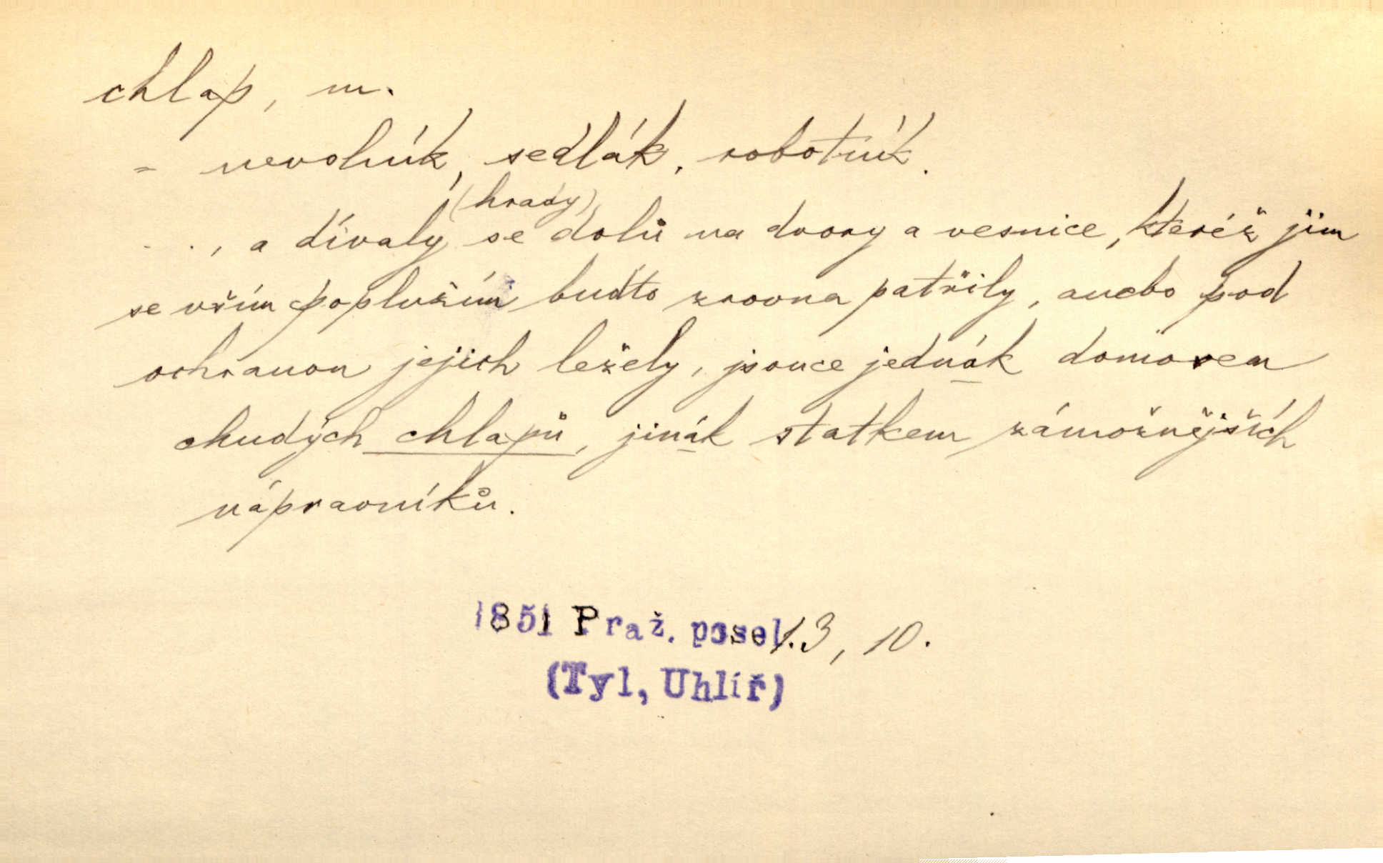 - chlap, -a m. lid. dospělý muž. Dívám se na tebe [Janošík na Ilčíka] a vidím, že už nejsi chlapec, ale chlap. Mah. „Za chlapa má síly,“ říkali o ní, když viděli, jak do vozů zvedá těžké kostky kamenné. Baar. Do světnice přihnala se bosá děvečka velká jako chlap. Jir. D Expr. buď pejor. (dareba, ničema a p.) n. hypok. (statný, velký n. řádný, hodný člověk; žert. i o zvířatech). Vem čert už trochu toho paše, ale to mě zlobí, jak ten chlap [pašerák] moh’ zmizet. Jir. Aspoň mně k vůli měl bys, pane nadporučíku, tohohle chlapa [neposlušného vojáka] jednou přivázat. Šrám. Kdopak by byl takový dareba chlap! Hál. Thámová pořád ještě má v hlavě toho panáka, Amlinga, slabého herce, mizerného chlapa. Jir. Truhlář stavby a nábytku, chlap jako hora a při tom cvičitel „Sokola“. Kam. Není už zrovna hošek [ženich], ale fešák, dobrý chlap. Já jsem chlap dobrá, ale umím bejt taky neřád. Čap. Ch. To mne těší, že někomu se po mně, starém chlapu, stýská! Šmil. Chlap je to řádný [chycený sumec] — do centnýře nebude mnoho scházet. Leg. Ten [špaček] je pitvora, ale jináč dobrý chlap, nasměju se mu. D Expr. mužský. Do kavárny jsi chodila tančit, jen aby ses tam mohla slízat s chlapy. Nor. D Dial. ženatý muž. Chlapi postávali pohromadě, neboť měli namířeno do hospody, svobodní laškovali stranou. Herb. D Arch. poddaný, nevolník. Národ dělil se vůbec na svobody a chlapy, čili pány a parobky. Pal. Blýská po jhu zašlém oko chtivé zpět, po nevolné zemi s pány, chlapy. Čech.