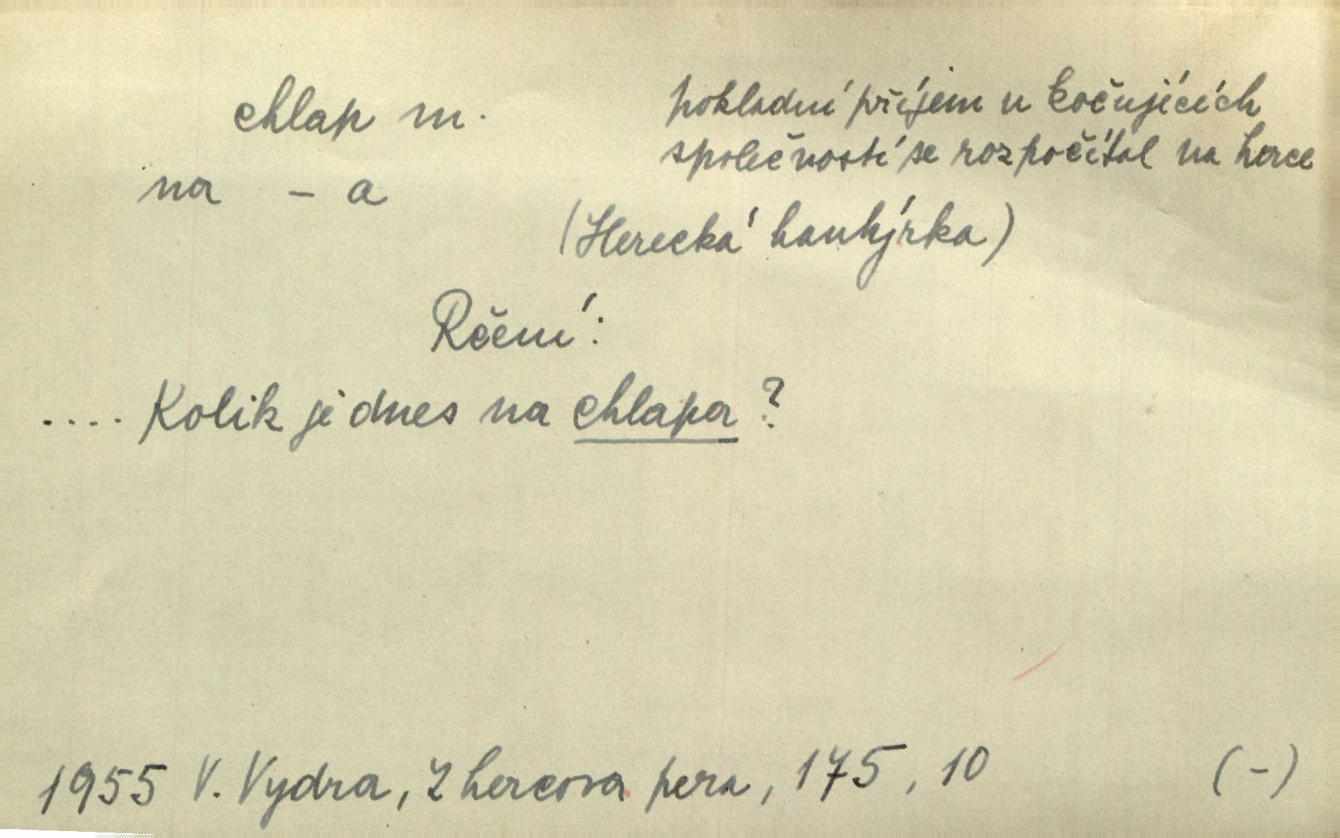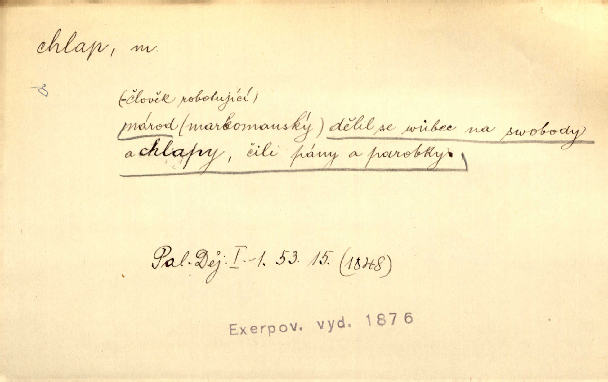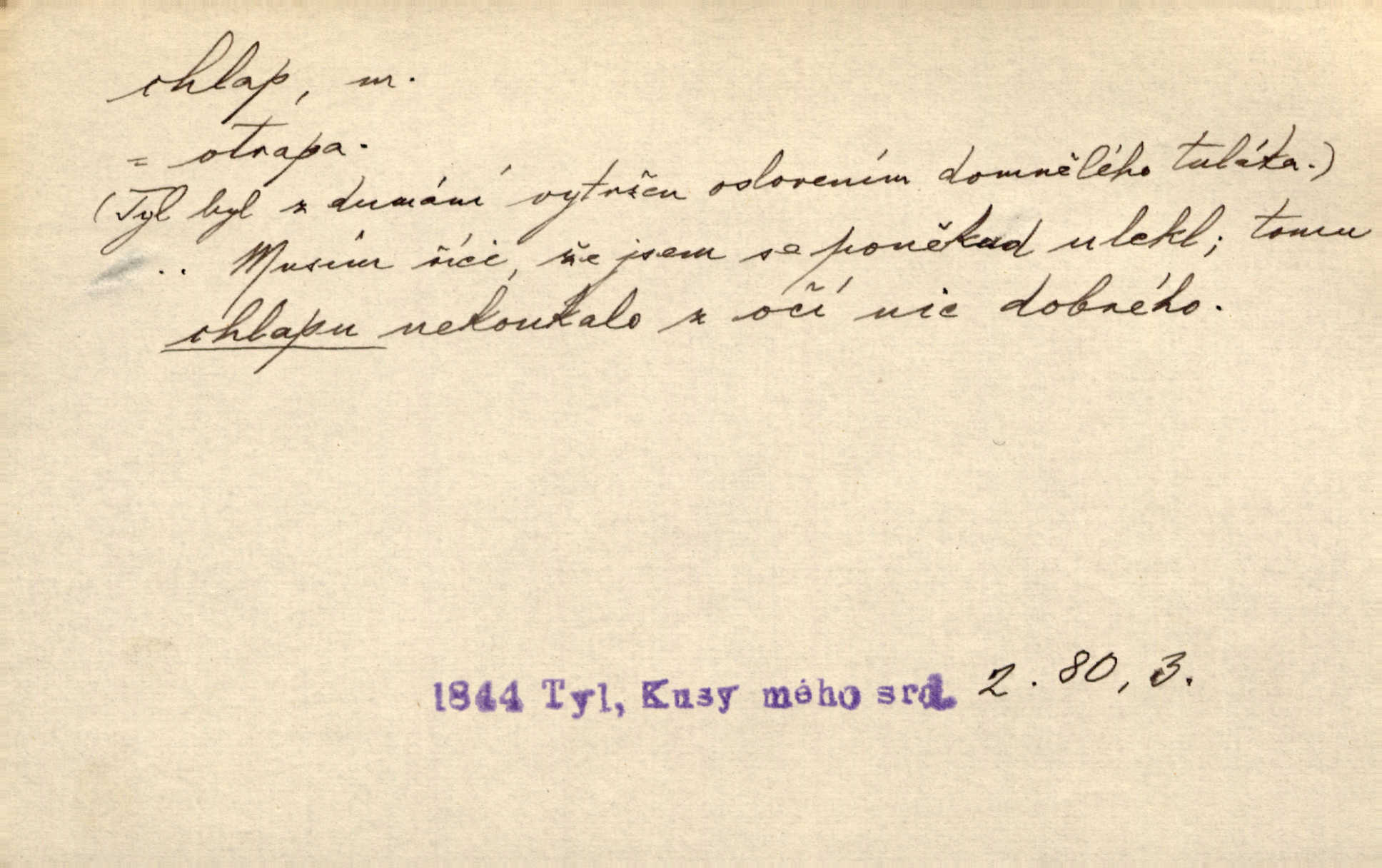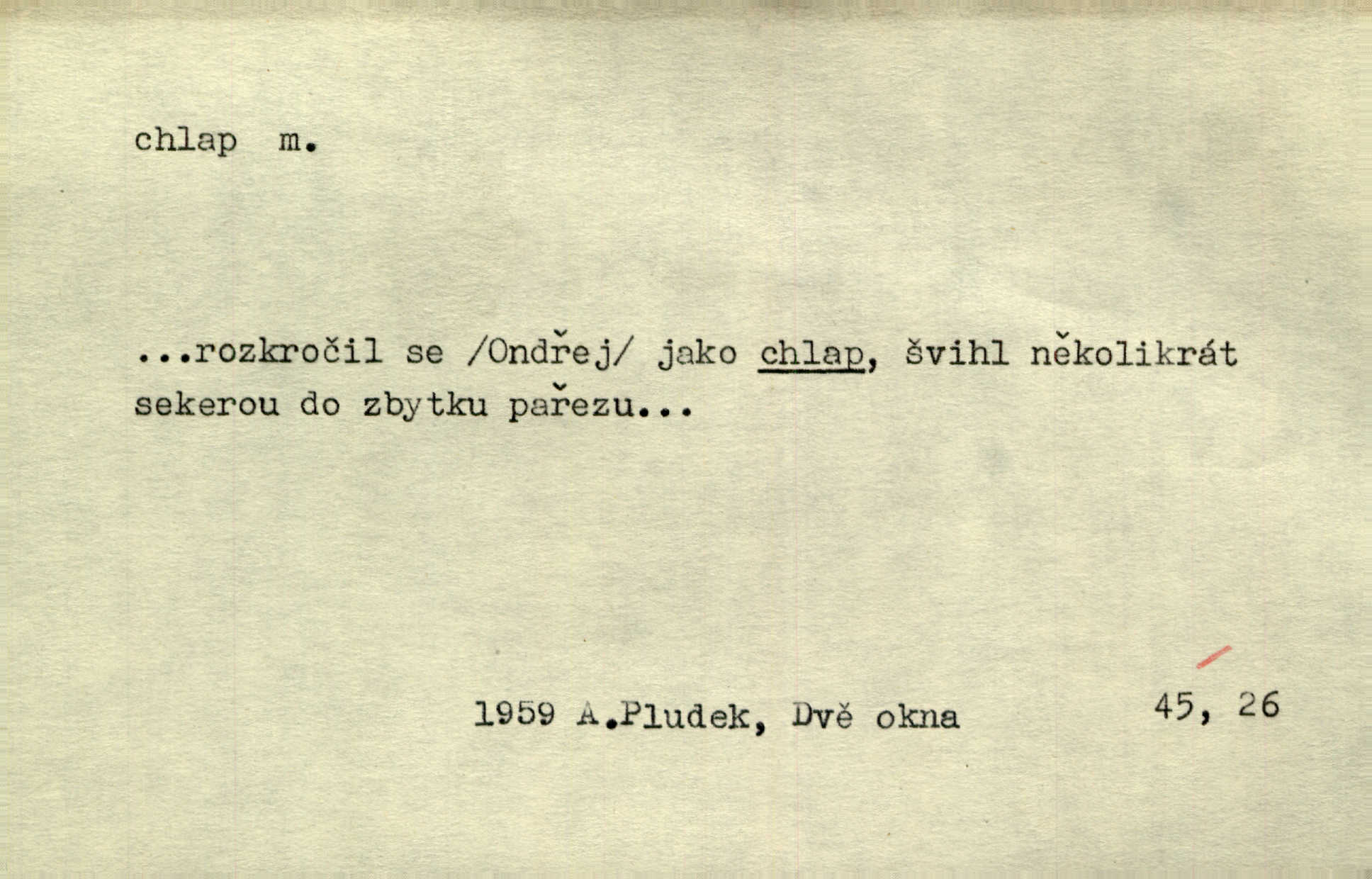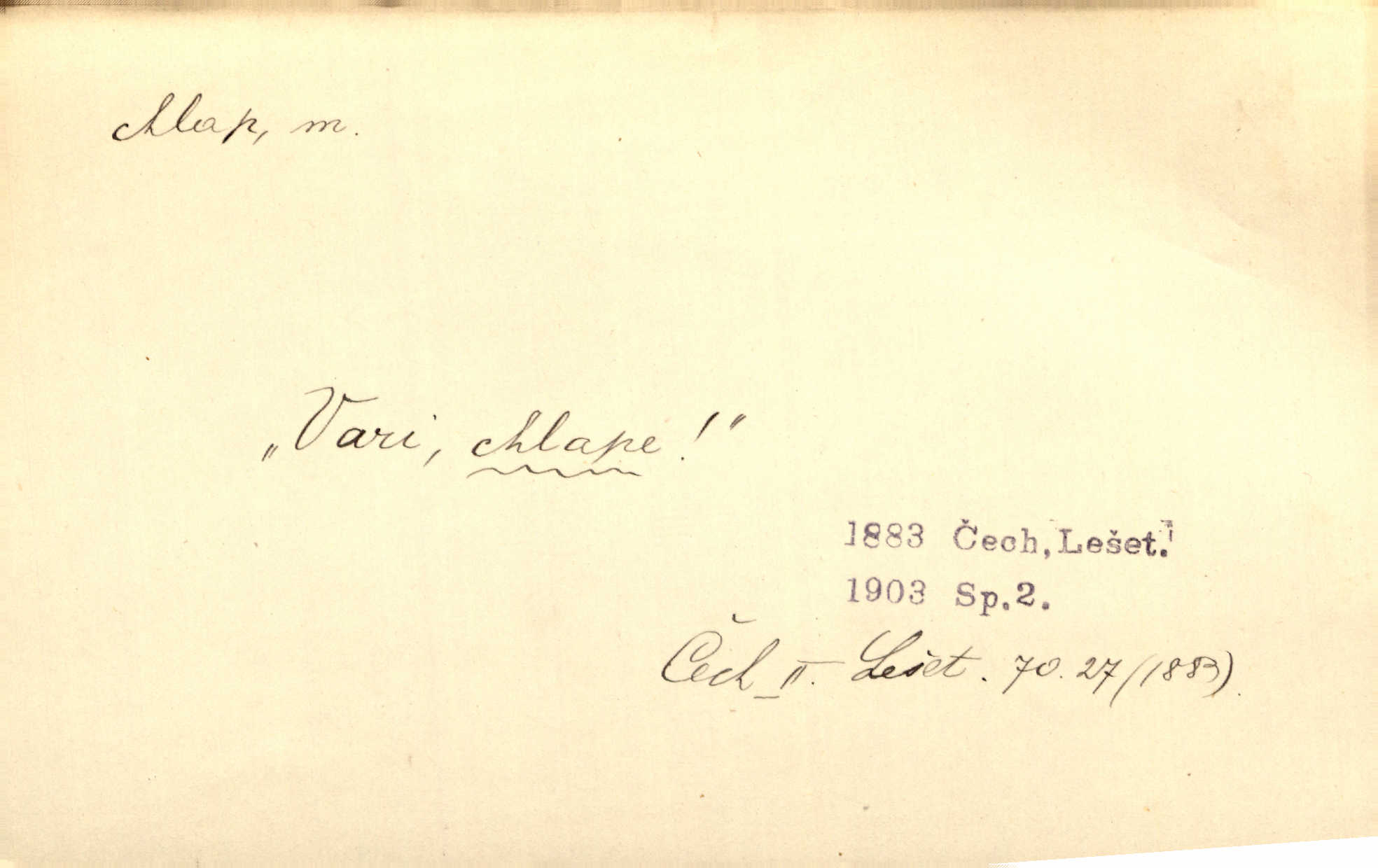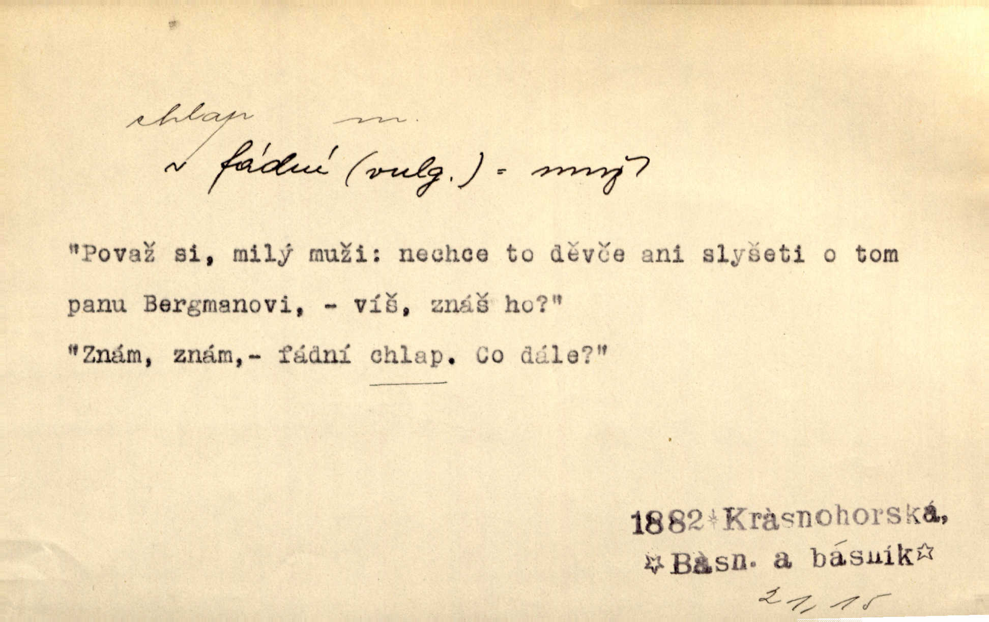 - chlap, -a m. lid. dospělý muž. Dívám se na tebe [Janošík na Ilčíka] a vidím, že už nejsi chlapec, ale chlap. Mah. „Za chlapa má síly,“ říkali o ní, když viděli, jak do vozů zvedá těžké kostky kamenné. Baar. Do světnice přihnala se bosá děvečka velká jako chlap. Jir. D Expr. buď pejor. (dareba, ničema a p.) n. hypok. (statný, velký n. řádný, hodný člověk; žert. i o zvířatech). Vem čert už trochu toho paše, ale to mě zlobí, jak ten chlap [pašerák] moh’ zmizet. Jir. Aspoň mně k vůli měl bys, pane nadporučíku, tohohle chlapa [neposlušného vojáka] jednou přivázat. Šrám. Kdopak by byl takový dareba chlap! Hál. Thámová pořád ještě má v hlavě toho panáka, Amlinga, slabého herce, mizerného chlapa. Jir. Truhlář stavby a nábytku, chlap jako hora a při tom cvičitel „Sokola“. Kam. Není už zrovna hošek [ženich], ale fešák, dobrý chlap. Já jsem chlap dobrá, ale umím bejt taky neřád. Čap. Ch. To mne těší, že někomu se po mně, starém chlapu, stýská! Šmil. Chlap je to řádný [chycený sumec] — do centnýře nebude mnoho scházet. Leg. Ten [špaček] je pitvora, ale jináč dobrý chlap, nasměju se mu. D Expr. mužský. Do kavárny jsi chodila tančit, jen aby ses tam mohla slízat s chlapy. Nor. D Dial. ženatý muž. Chlapi postávali pohromadě, neboť měli namířeno do hospody, svobodní laškovali stranou. Herb. D Arch. poddaný, nevolník. Národ dělil se vůbec na svobody a chlapy, čili pány a parobky. Pal. Blýská po jhu zašlém oko chtivé zpět, po nevolné zemi s pány, chlapy. Čech.