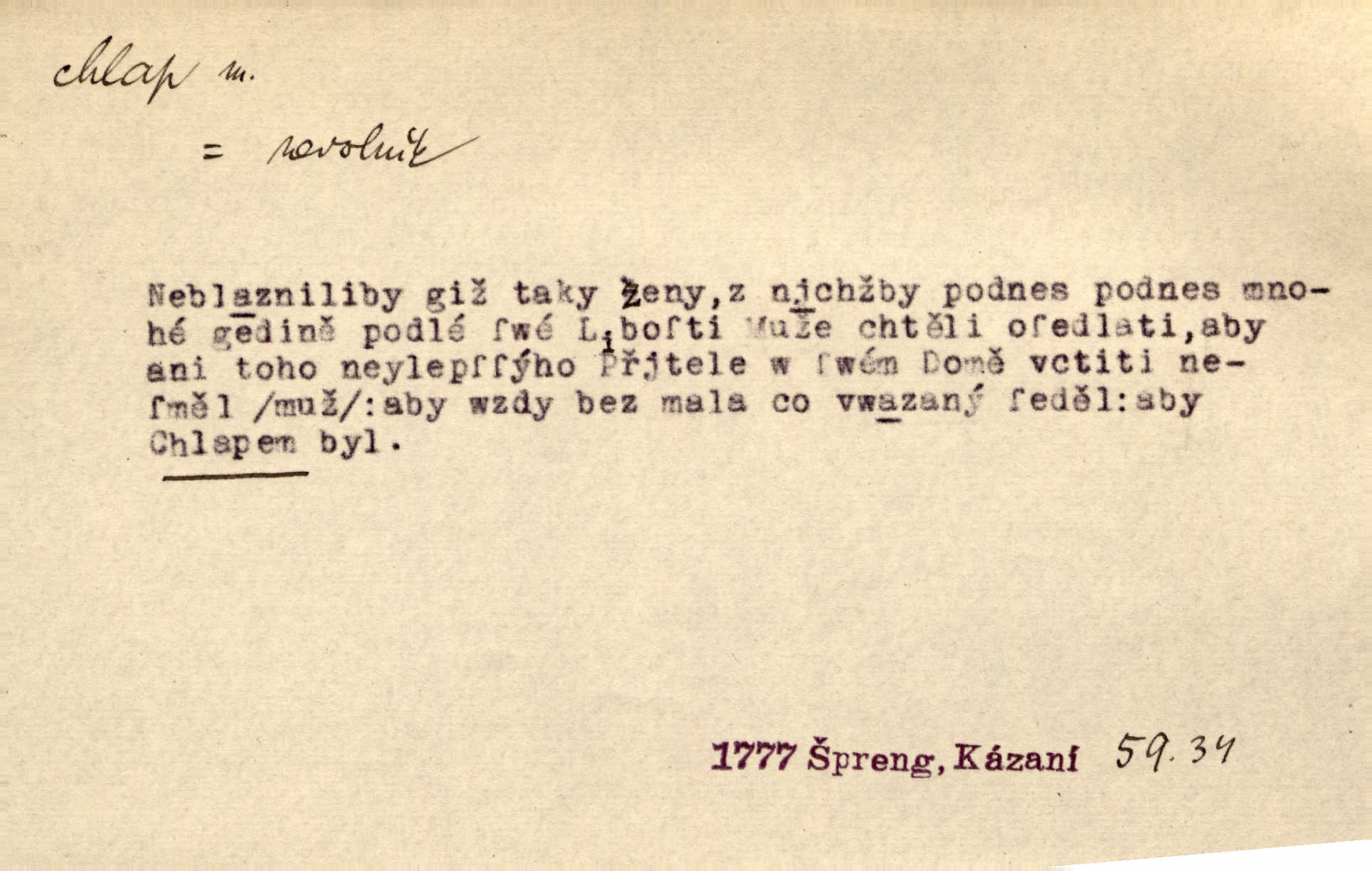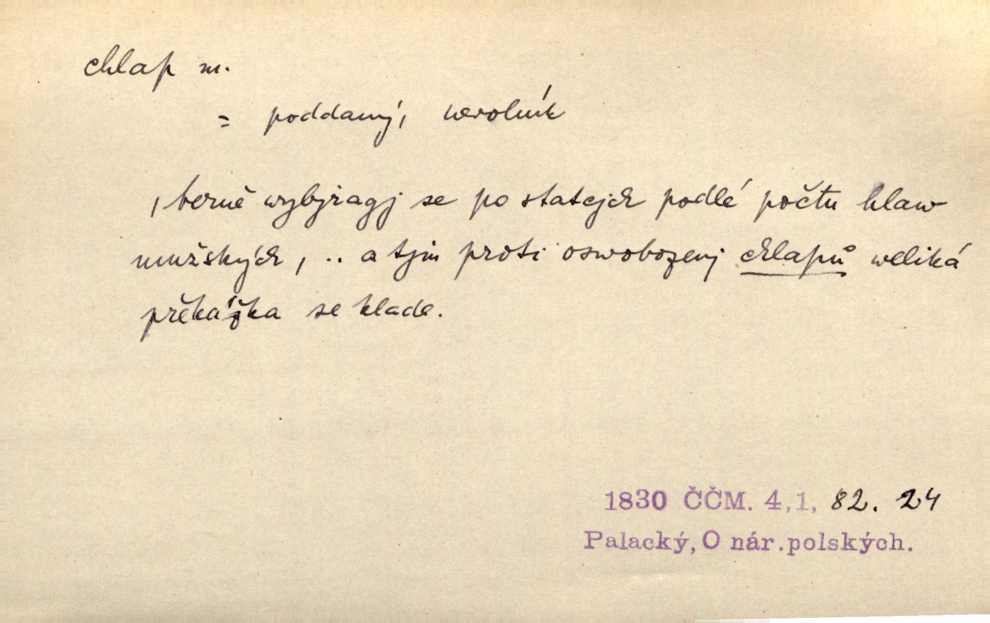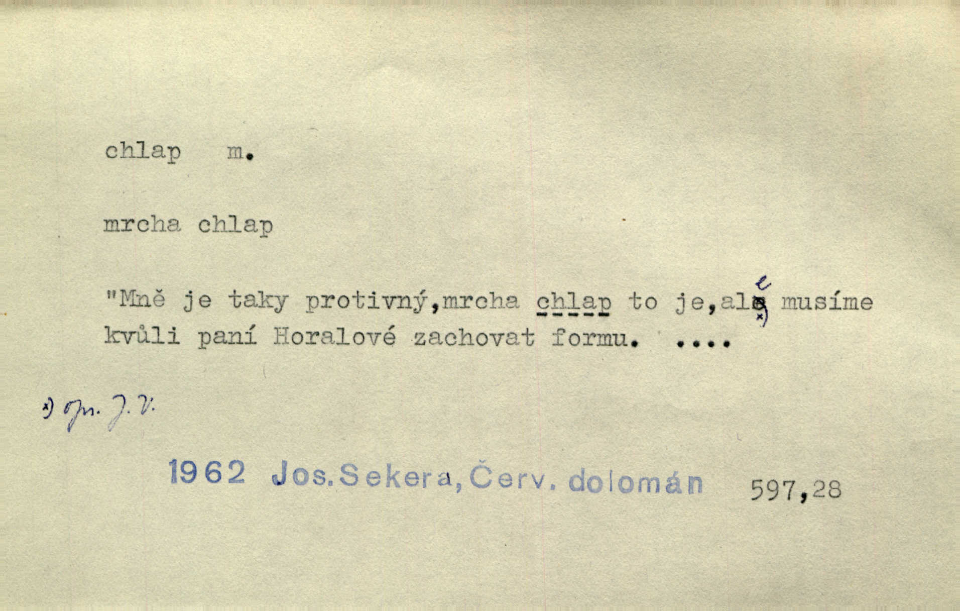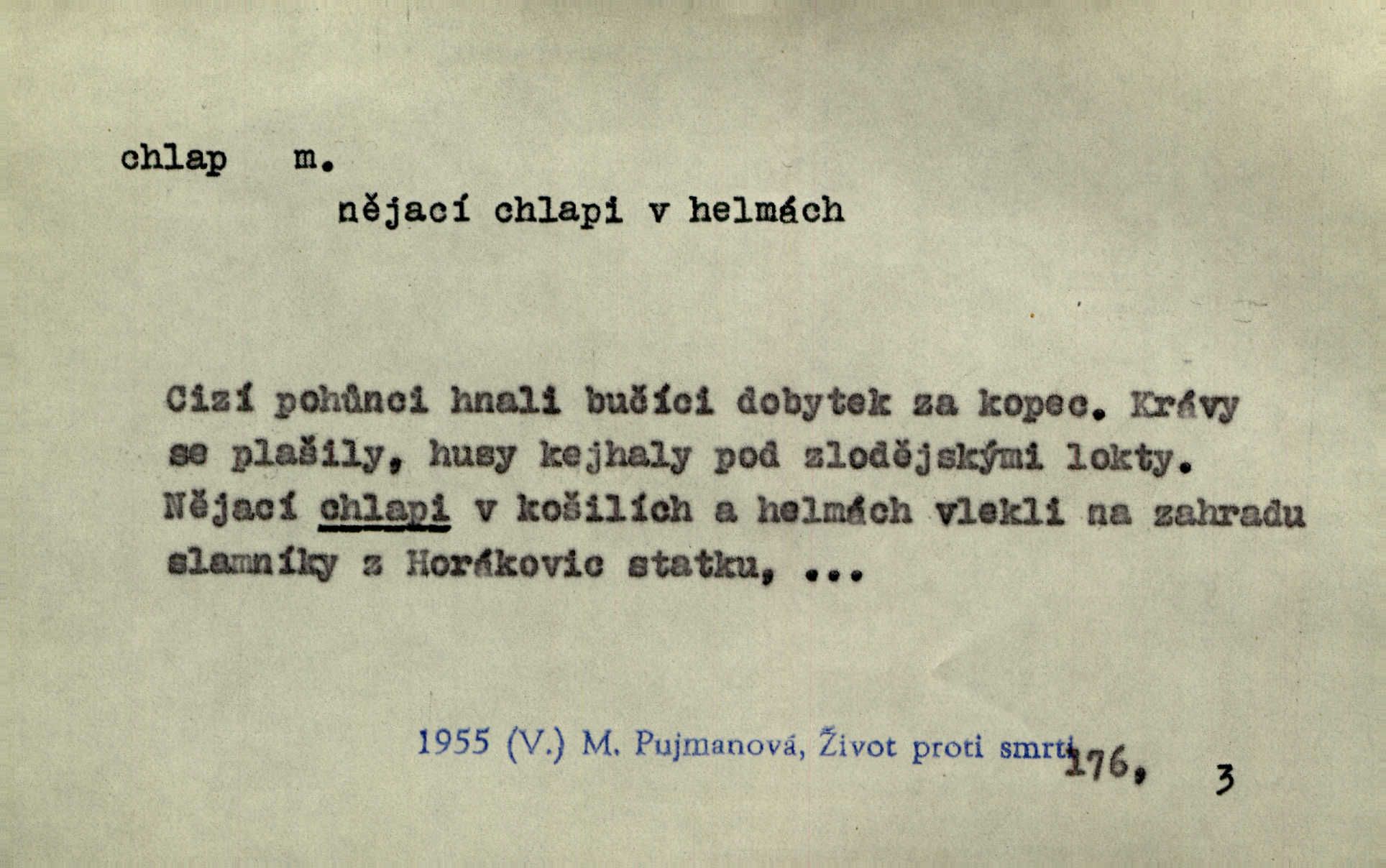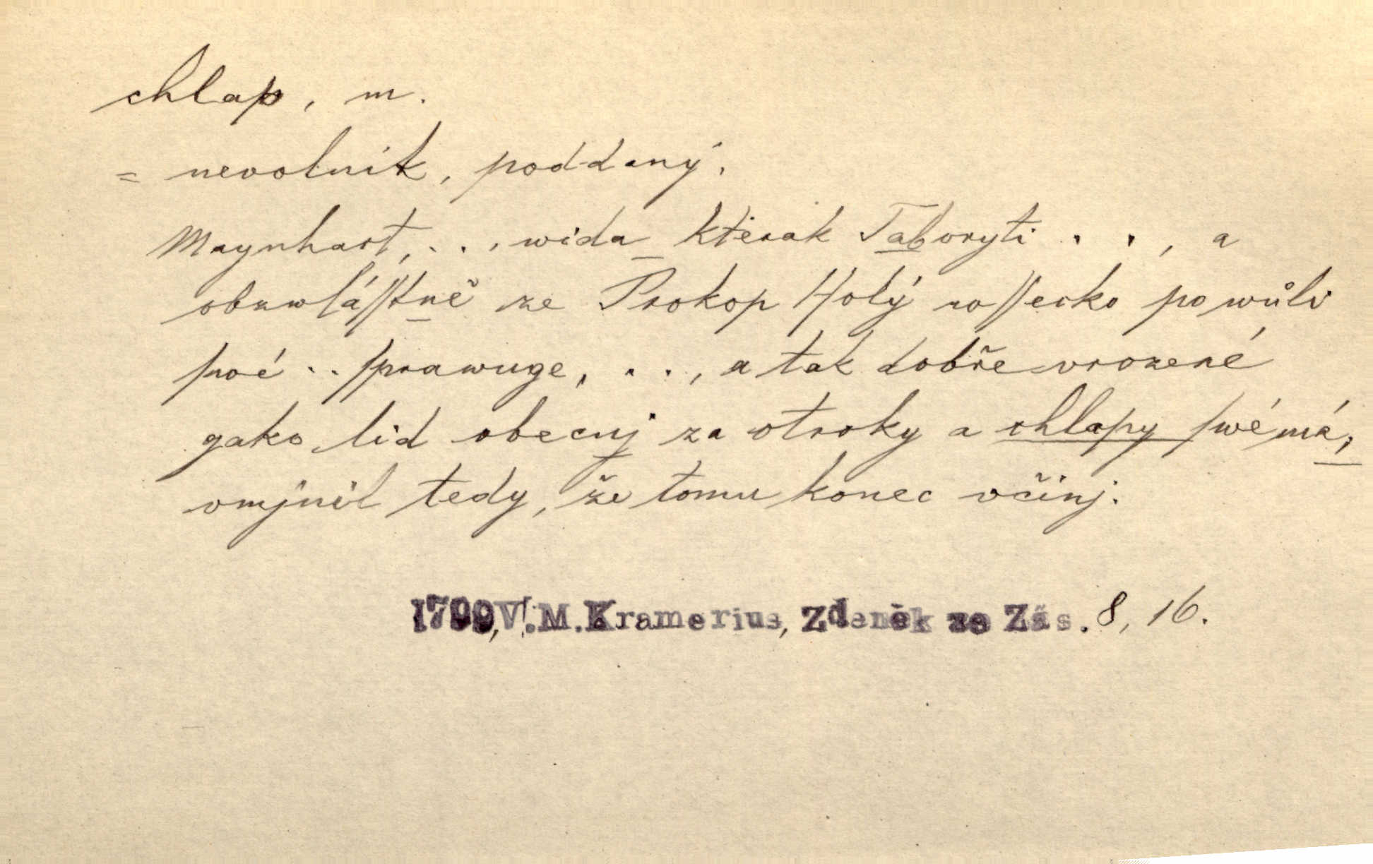 - chlap, -a m. lid. dospělý muž. Dívám se na tebe [Janošík na Ilčíka] a vidím, že už nejsi chlapec, ale chlap. Mah. „Za chlapa má síly,“ říkali o ní, když viděli, jak do vozů zvedá těžké kostky kamenné. Baar. Do světnice přihnala se bosá děvečka velká jako chlap. Jir. D Expr. buď pejor. (dareba, ničema a p.) n. hypok. (statný, velký n. řádný, hodný člověk; žert. i o zvířatech). Vem čert už trochu toho paše, ale to mě zlobí, jak ten chlap [pašerák] moh’ zmizet. Jir. Aspoň mně k vůli měl bys, pane nadporučíku, tohohle chlapa [neposlušného vojáka] jednou přivázat. Šrám. Kdopak by byl takový dareba chlap! Hál. Thámová pořád ještě má v hlavě toho panáka, Amlinga, slabého herce, mizerného chlapa. Jir. Truhlář stavby a nábytku, chlap jako hora a při tom cvičitel „Sokola“. Kam. Není už zrovna hošek [ženich], ale fešák, dobrý chlap. Já jsem chlap dobrá, ale umím bejt taky neřád. Čap. Ch. To mne těší, že někomu se po mně, starém chlapu, stýská! Šmil. Chlap je to řádný [chycený sumec] — do centnýře nebude mnoho scházet. Leg. Ten [špaček] je pitvora, ale jináč dobrý chlap, nasměju se mu. D Expr. mužský. Do kavárny jsi chodila tančit, jen aby ses tam mohla slízat s chlapy. Nor. D Dial. ženatý muž. Chlapi postávali pohromadě, neboť měli namířeno do hospody, svobodní laškovali stranou. Herb. D Arch. poddaný, nevolník. Národ dělil se vůbec na svobody a chlapy, čili pány a parobky. Pal. Blýská po jhu zašlém oko chtivé zpět, po nevolné zemi s pány, chlapy. Čech.