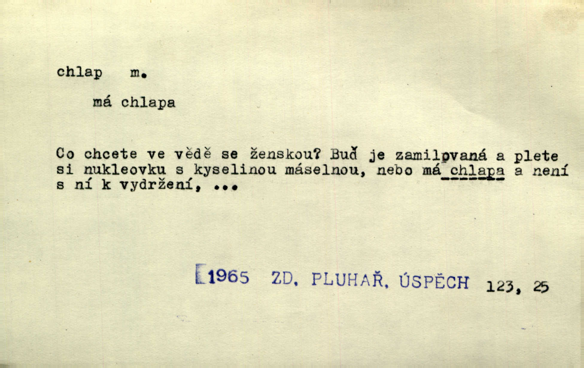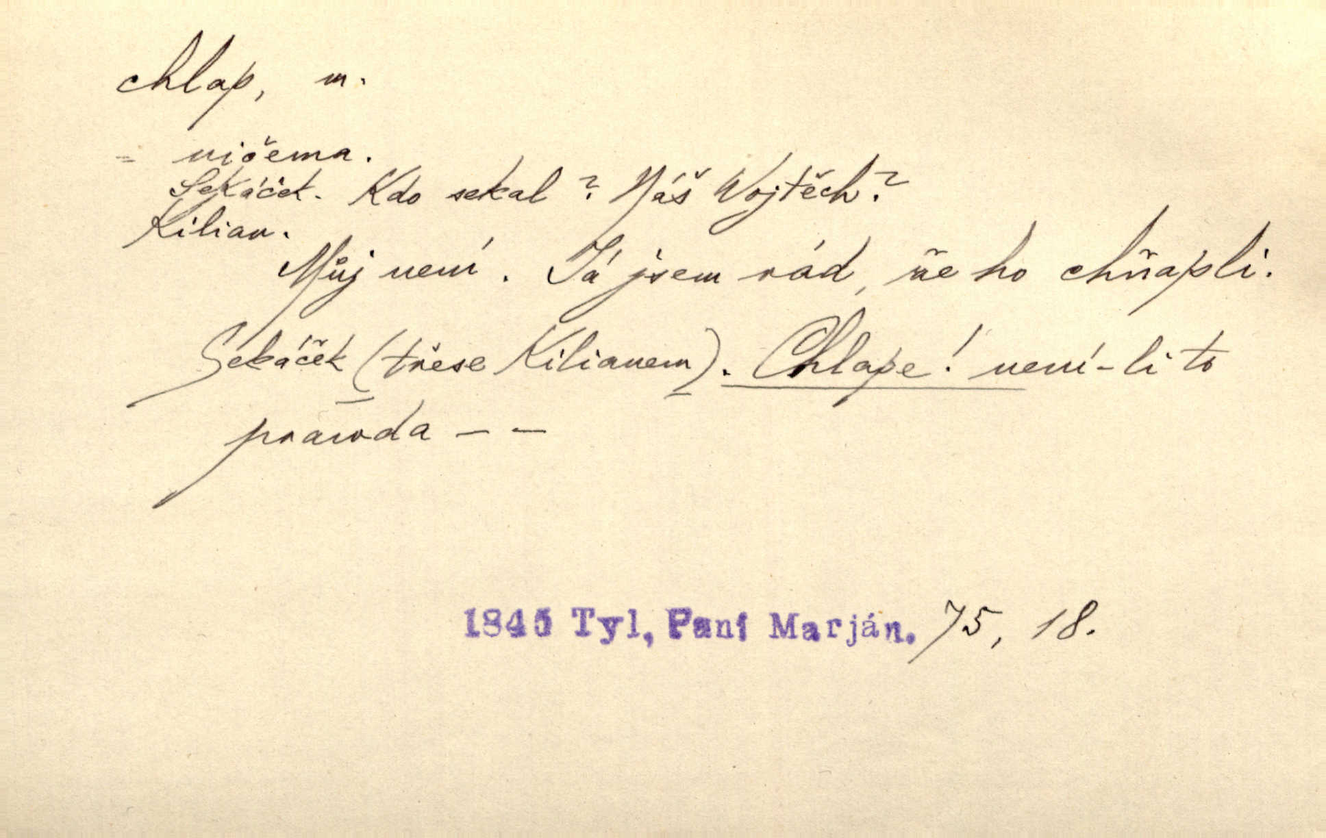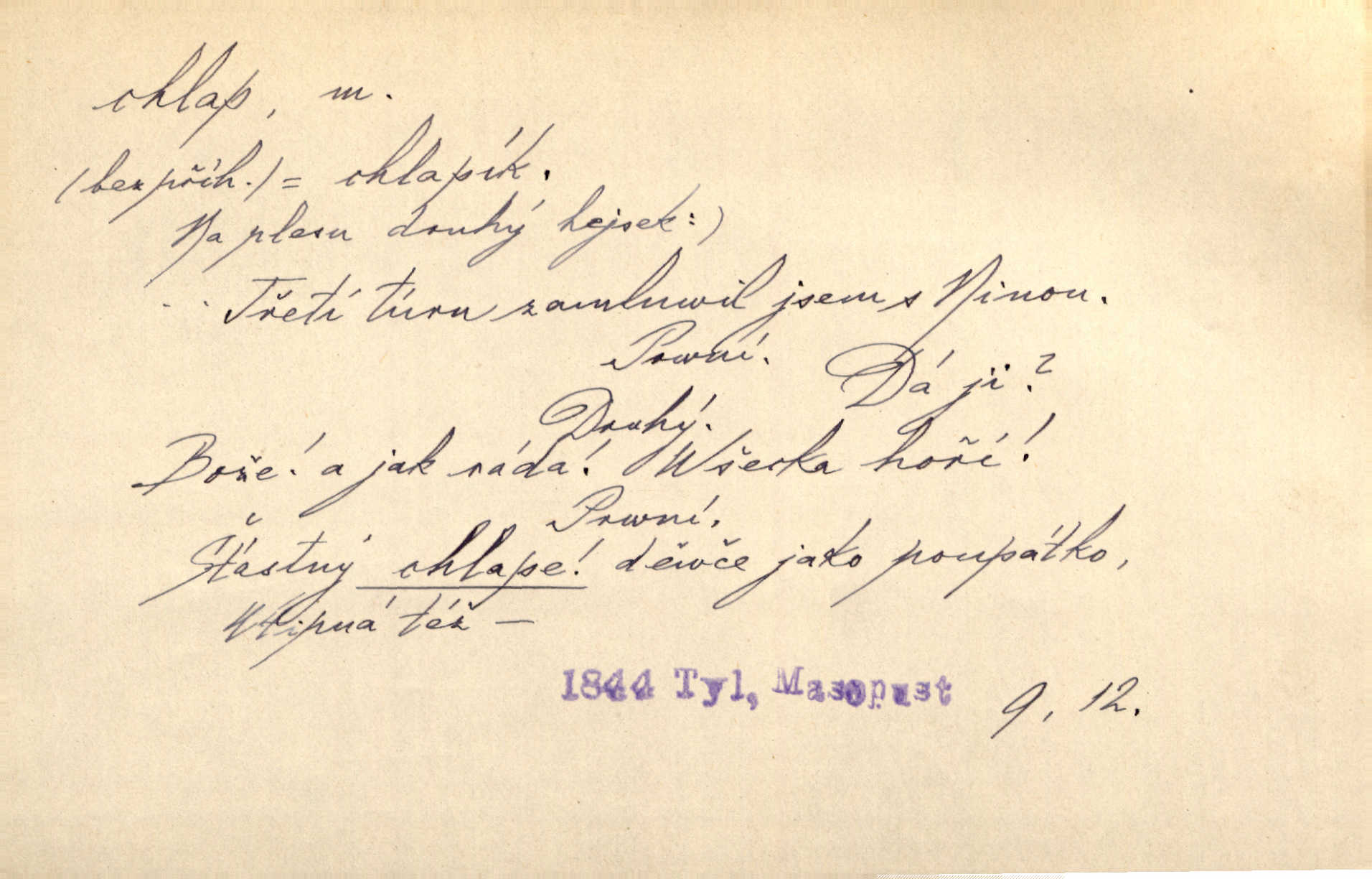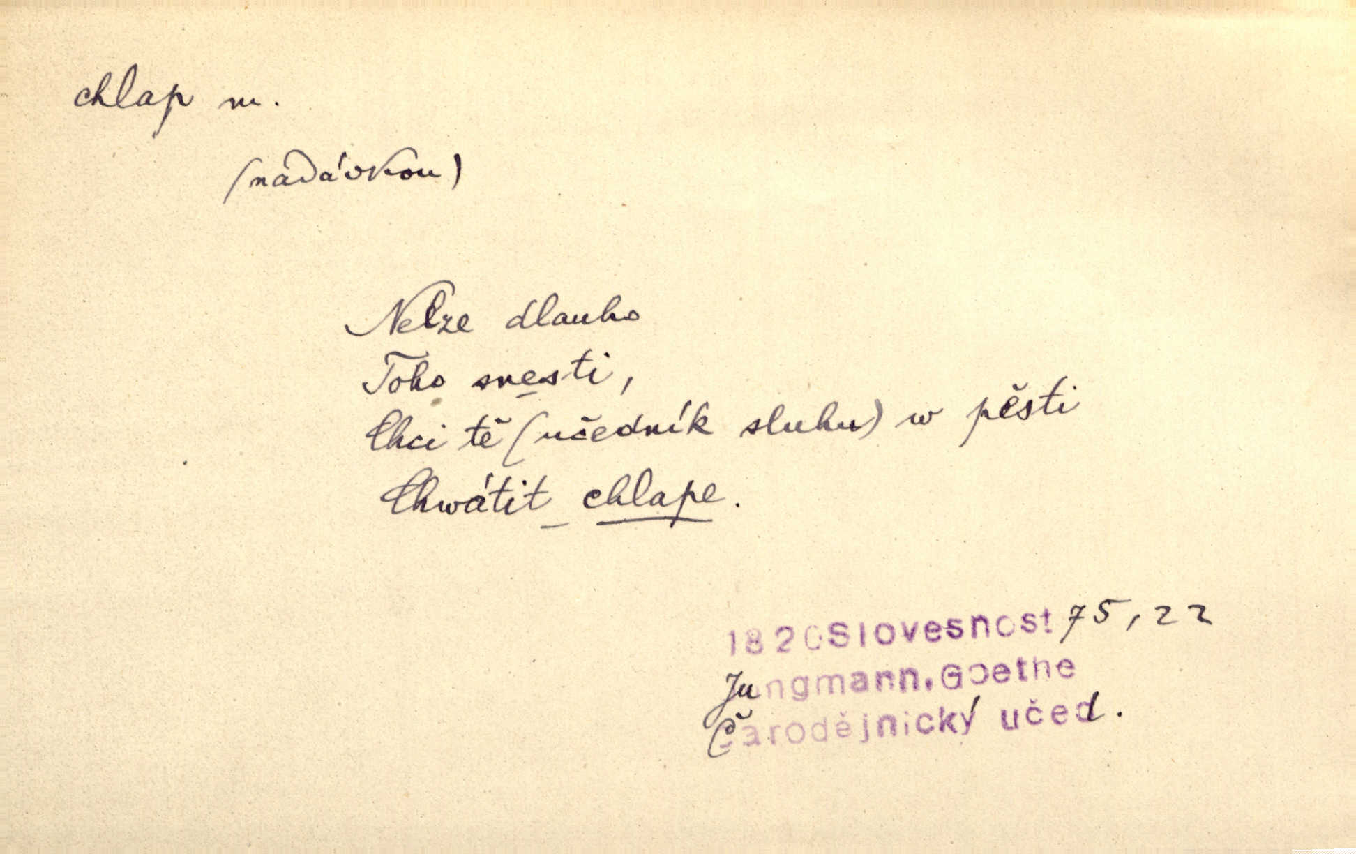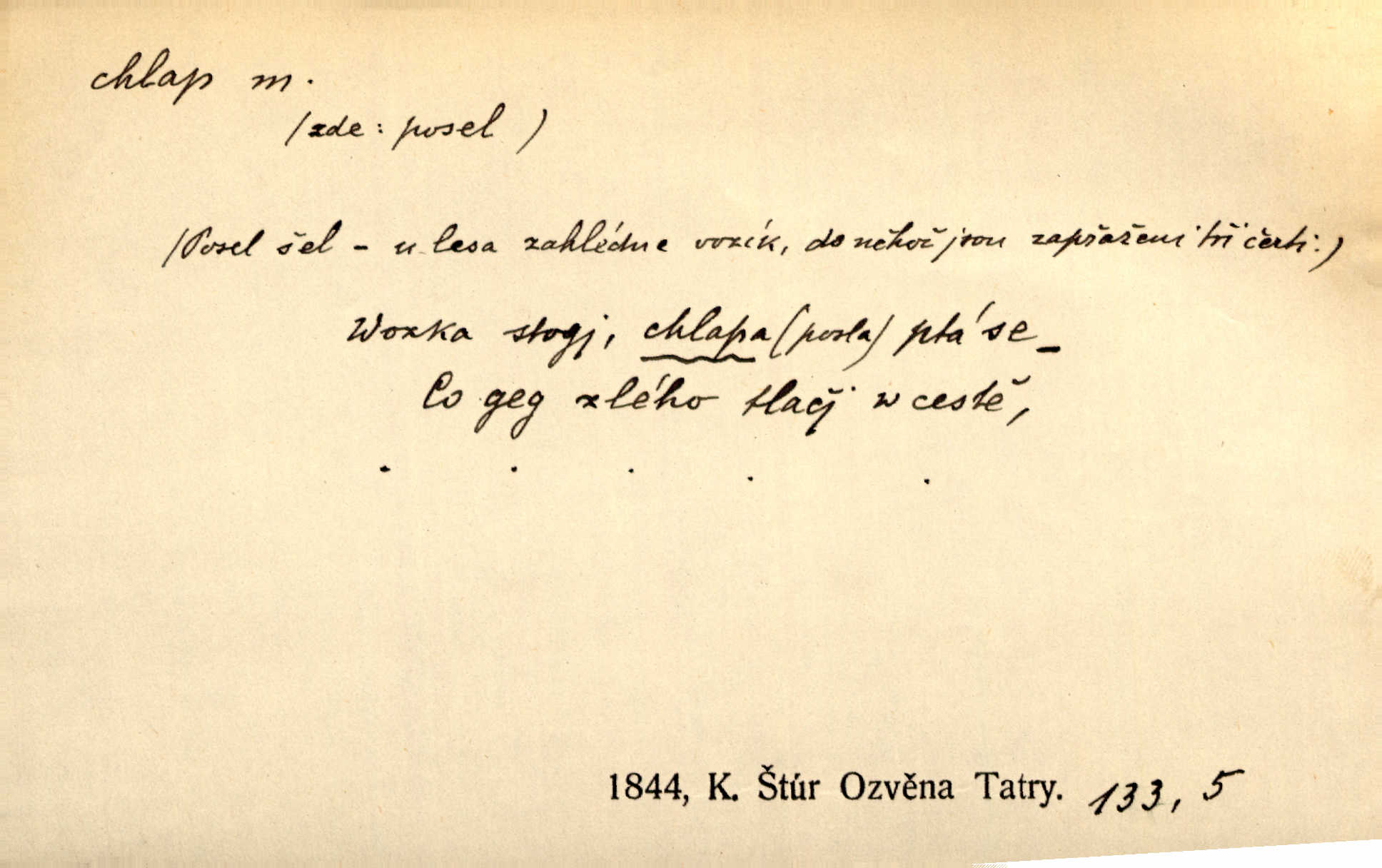 - chlap, -a m. lid. dospělý muž. Dívám se na tebe [Janošík na Ilčíka] a vidím, že už nejsi chlapec, ale chlap. Mah. „Za chlapa má síly,“ říkali o ní, když viděli, jak do vozů zvedá těžké kostky kamenné. Baar. Do světnice přihnala se bosá děvečka velká jako chlap. Jir. D Expr. buď pejor. (dareba, ničema a p.) n. hypok. (statný, velký n. řádný, hodný člověk; žert. i o zvířatech). Vem čert už trochu toho paše, ale to mě zlobí, jak ten chlap [pašerák] moh’ zmizet. Jir. Aspoň mně k vůli měl bys, pane nadporučíku, tohohle chlapa [neposlušného vojáka] jednou přivázat. Šrám. Kdopak by byl takový dareba chlap! Hál. Thámová pořád ještě má v hlavě toho panáka, Amlinga, slabého herce, mizerného chlapa. Jir. Truhlář stavby a nábytku, chlap jako hora a při tom cvičitel „Sokola“. Kam. Není už zrovna hošek [ženich], ale fešák, dobrý chlap. Já jsem chlap dobrá, ale umím bejt taky neřád. Čap. Ch. To mne těší, že někomu se po mně, starém chlapu, stýská! Šmil. Chlap je to řádný [chycený sumec] — do centnýře nebude mnoho scházet. Leg. Ten [špaček] je pitvora, ale jináč dobrý chlap, nasměju se mu. D Expr. mužský. Do kavárny jsi chodila tančit, jen aby ses tam mohla slízat s chlapy. Nor. D Dial. ženatý muž. Chlapi postávali pohromadě, neboť měli namířeno do hospody, svobodní laškovali stranou. Herb. D Arch. poddaný, nevolník. Národ dělil se vůbec na svobody a chlapy, čili pány a parobky. Pal. Blýská po jhu zašlém oko chtivé zpět, po nevolné zemi s pány, chlapy. Čech.